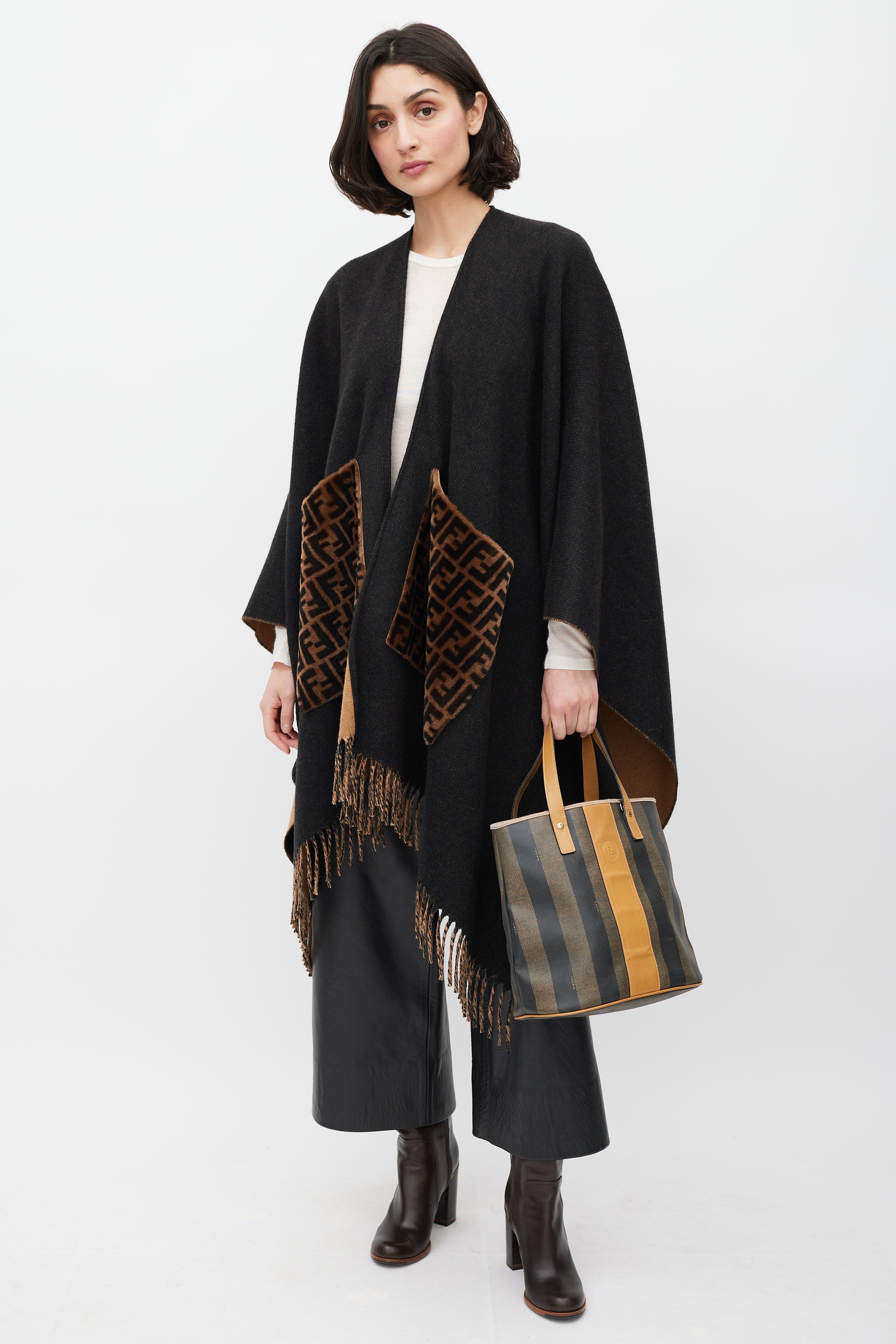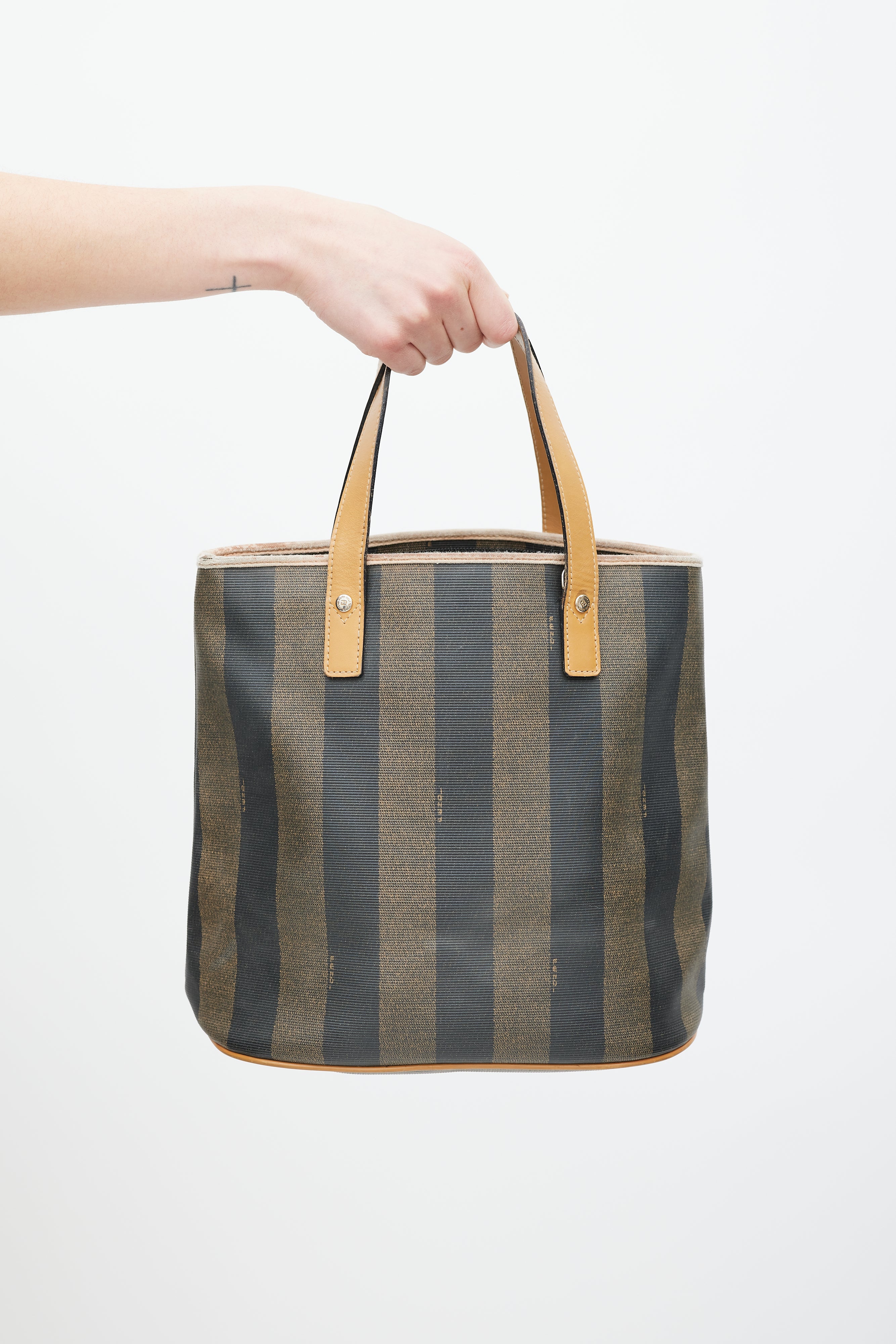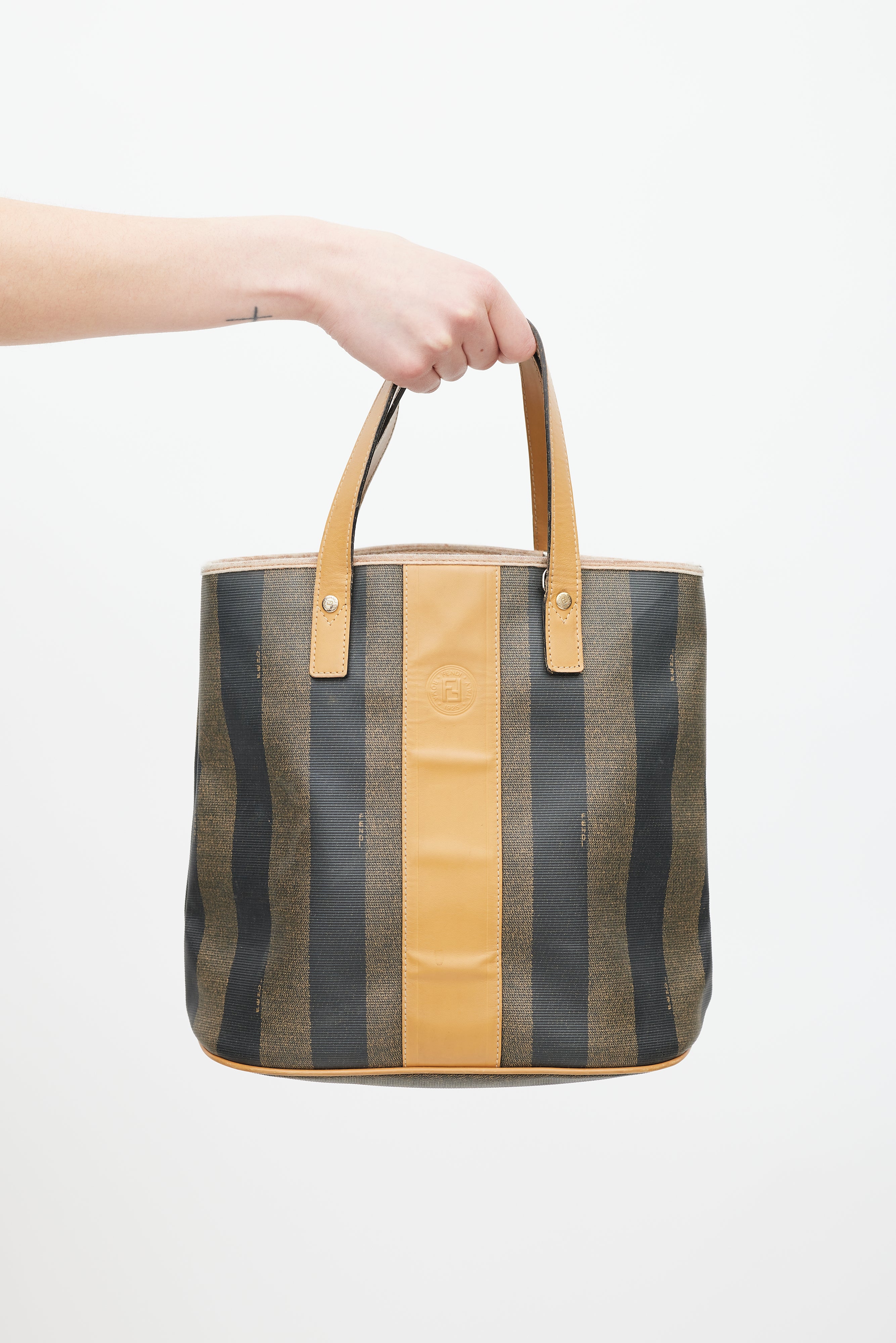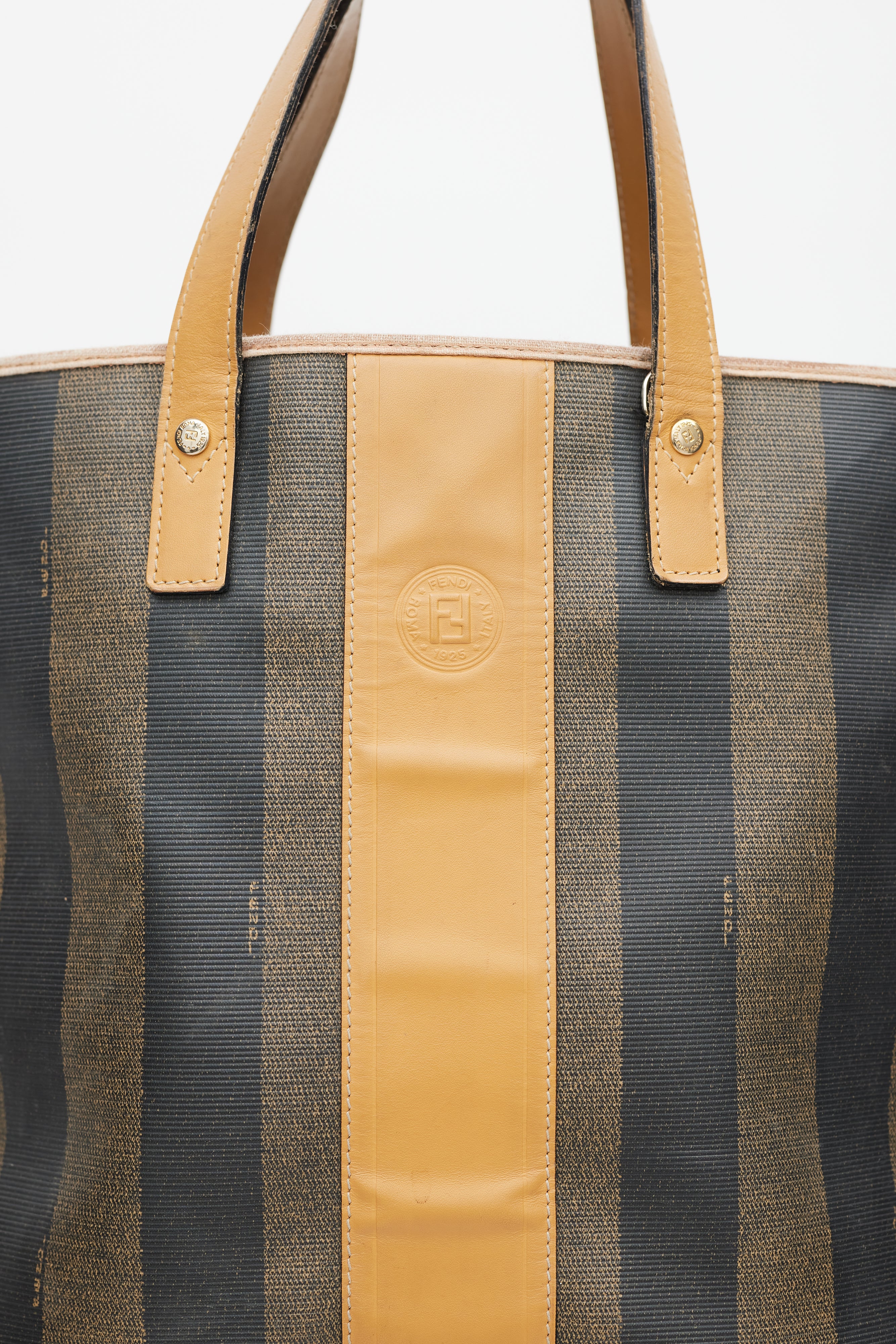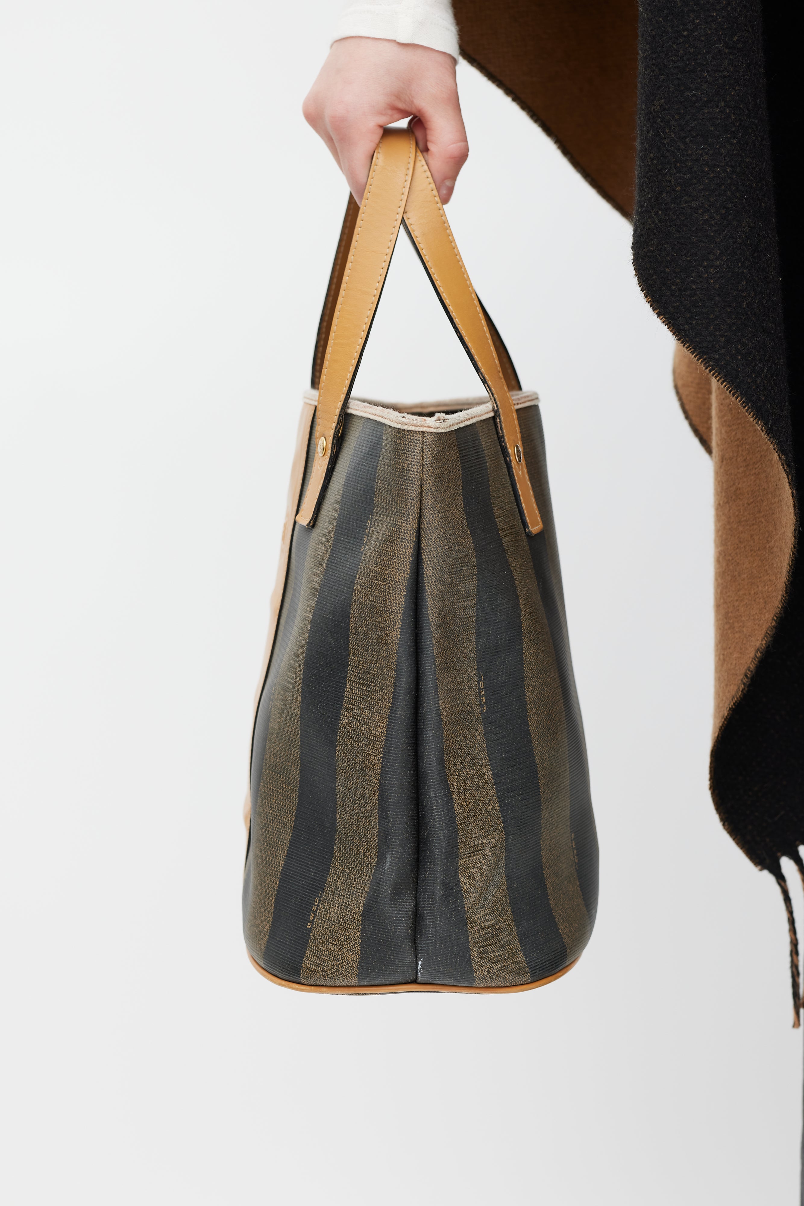 Pre-owned Fendi brown Pequin tote in coated striped canvas featuring an embossed logo at front, two top handles, one main compartment with one zip pocket, removable shoulder strap, and top zip closure.