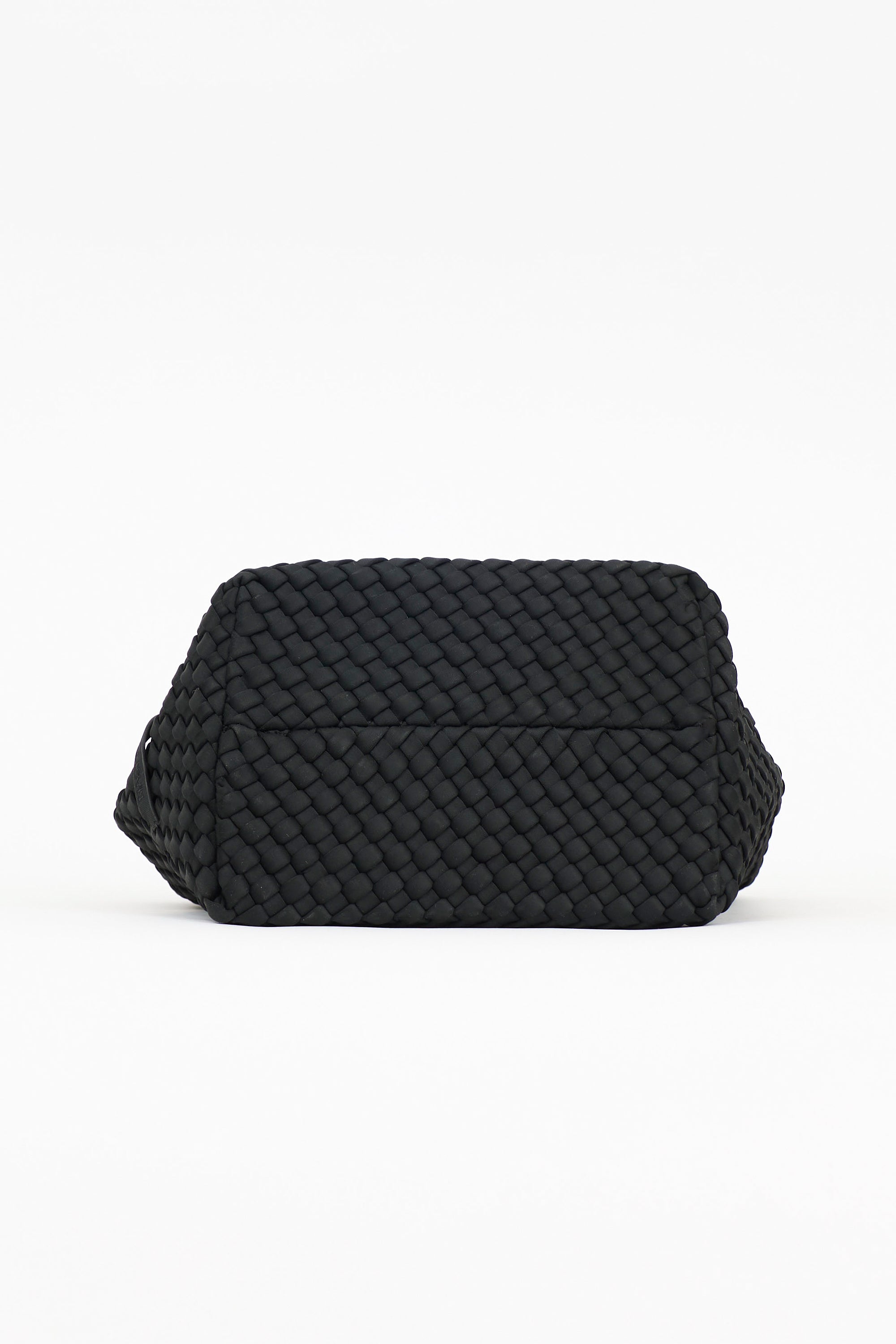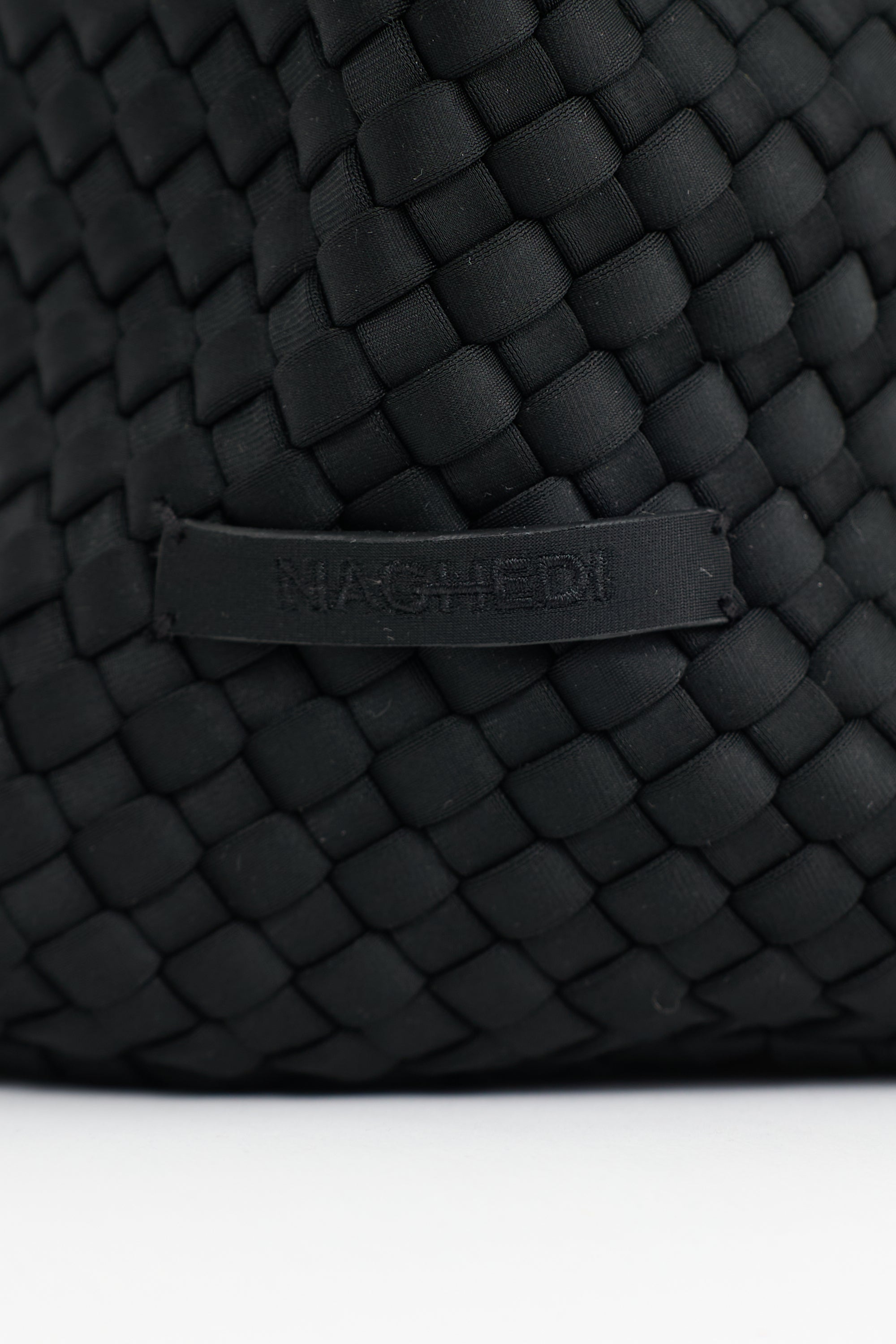 Naghedi black St. Barths Petit tote bag featuring woven body, dual top handles, detachable and adjustable crossbody strap, and one main compartment with detachable pouch. Includes original dust bag.