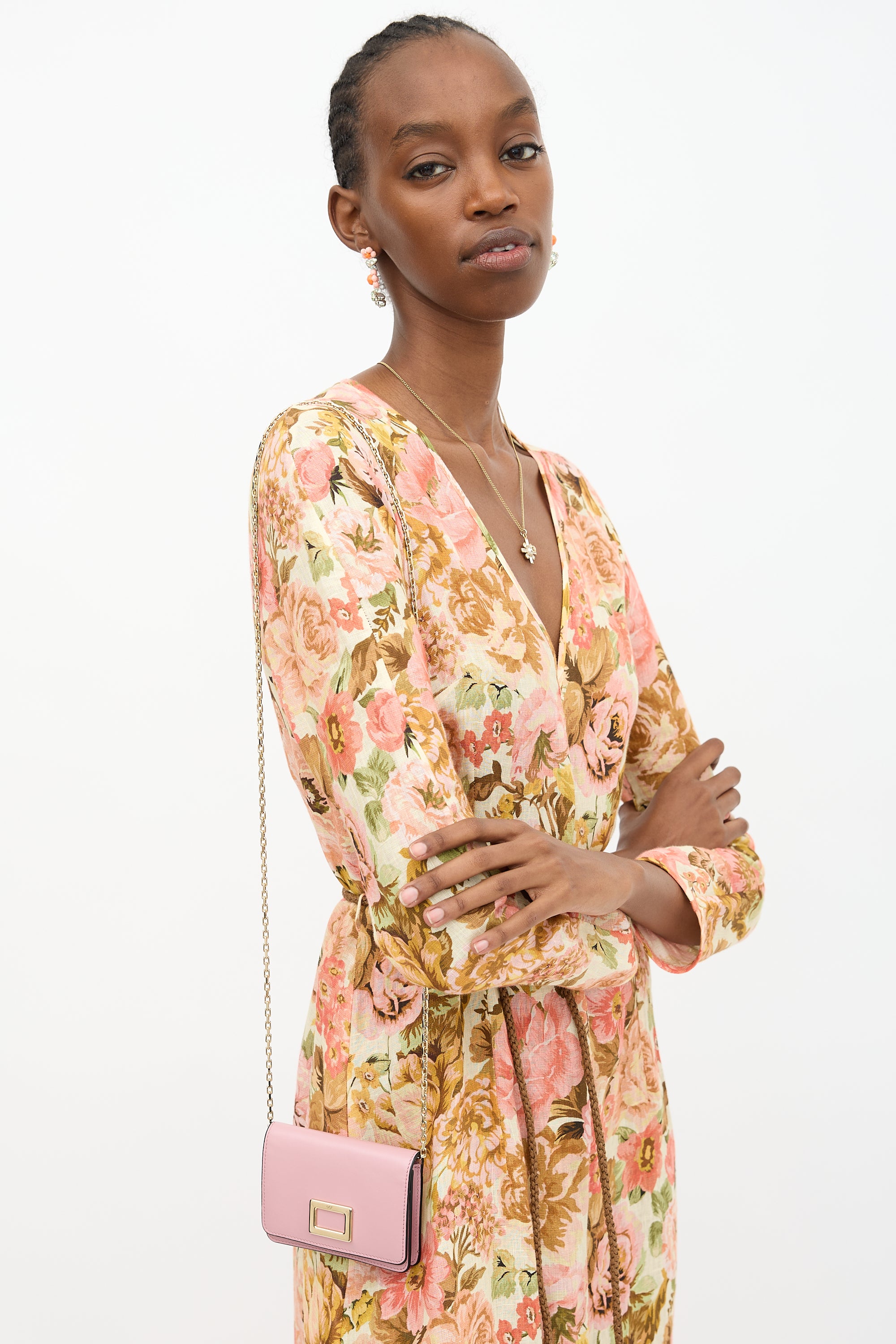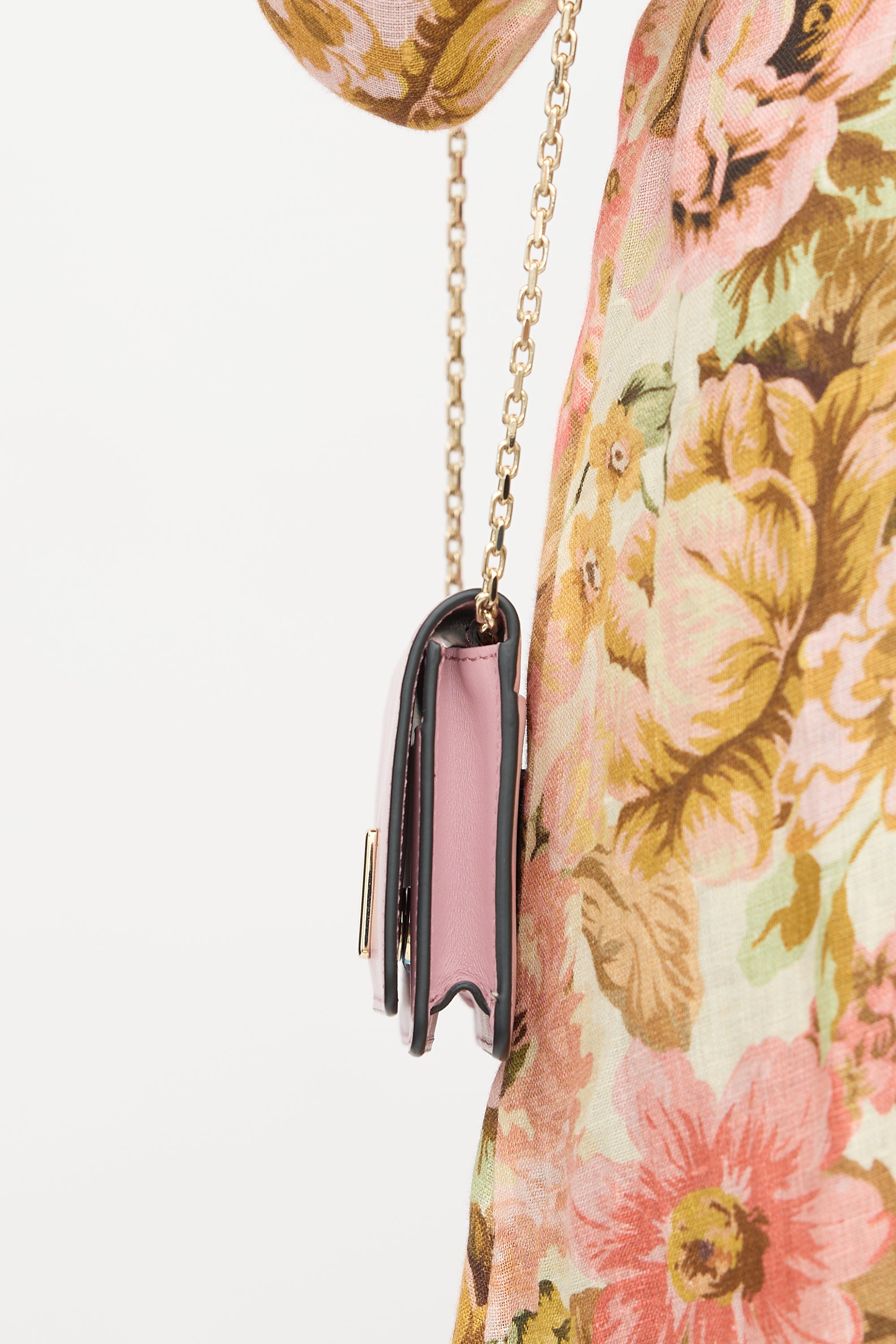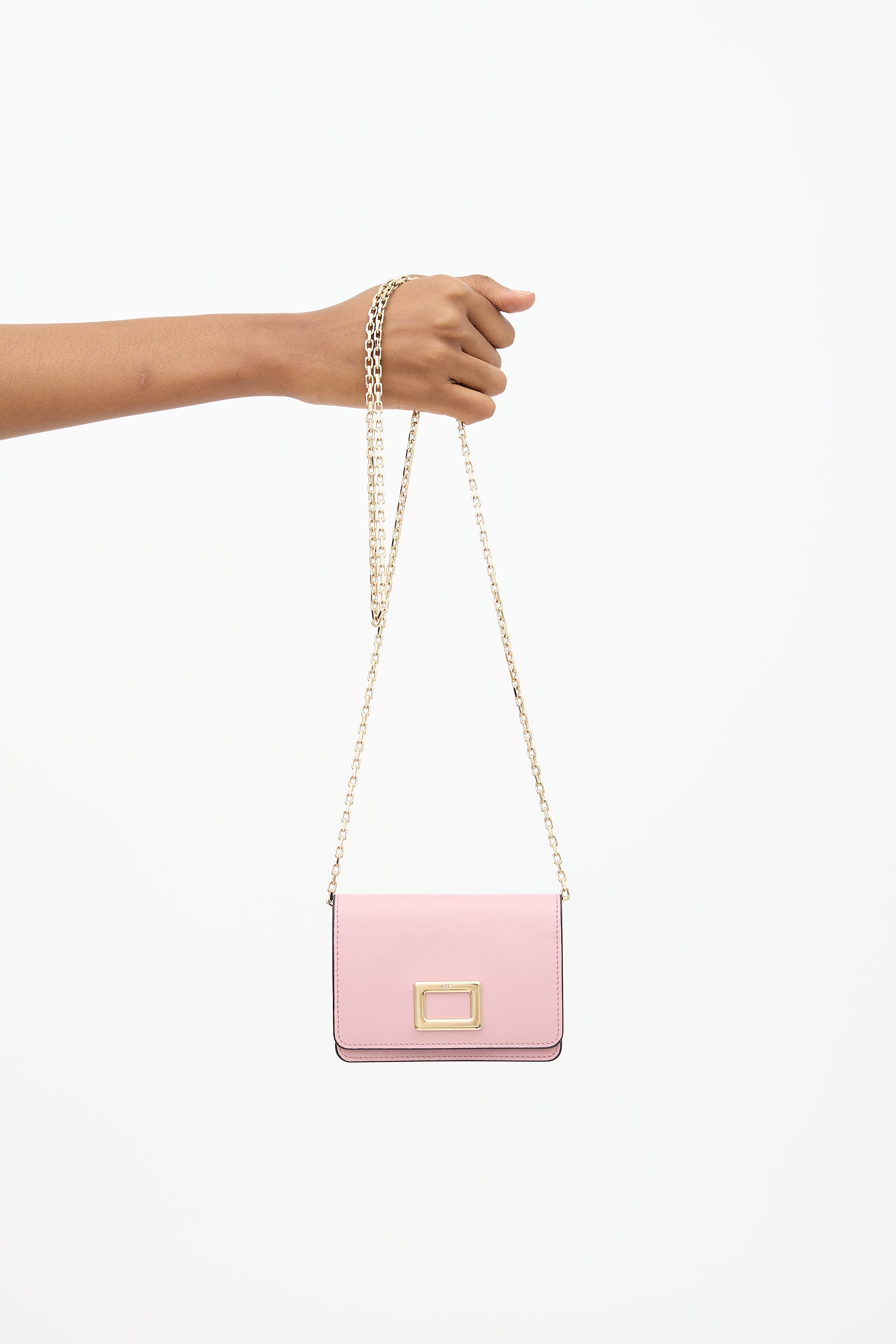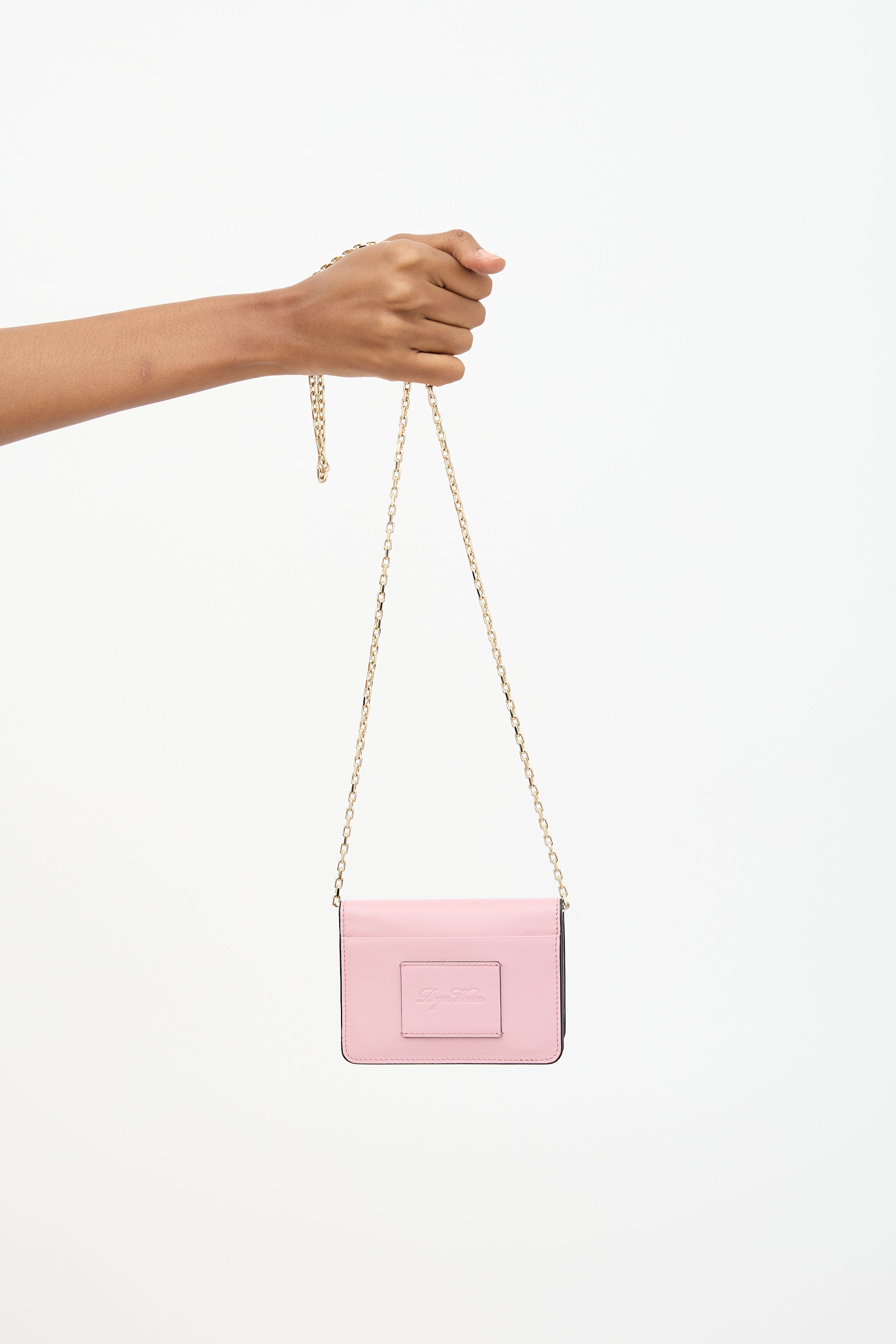 Pre-owned Roger Vivier pink leather crossbody bag featuring gold tone hardware, chain shoulder strap, top flap, front slip pocket, debossed logo panel at back, and one satin lined main compartment. Comes with original dust bag.