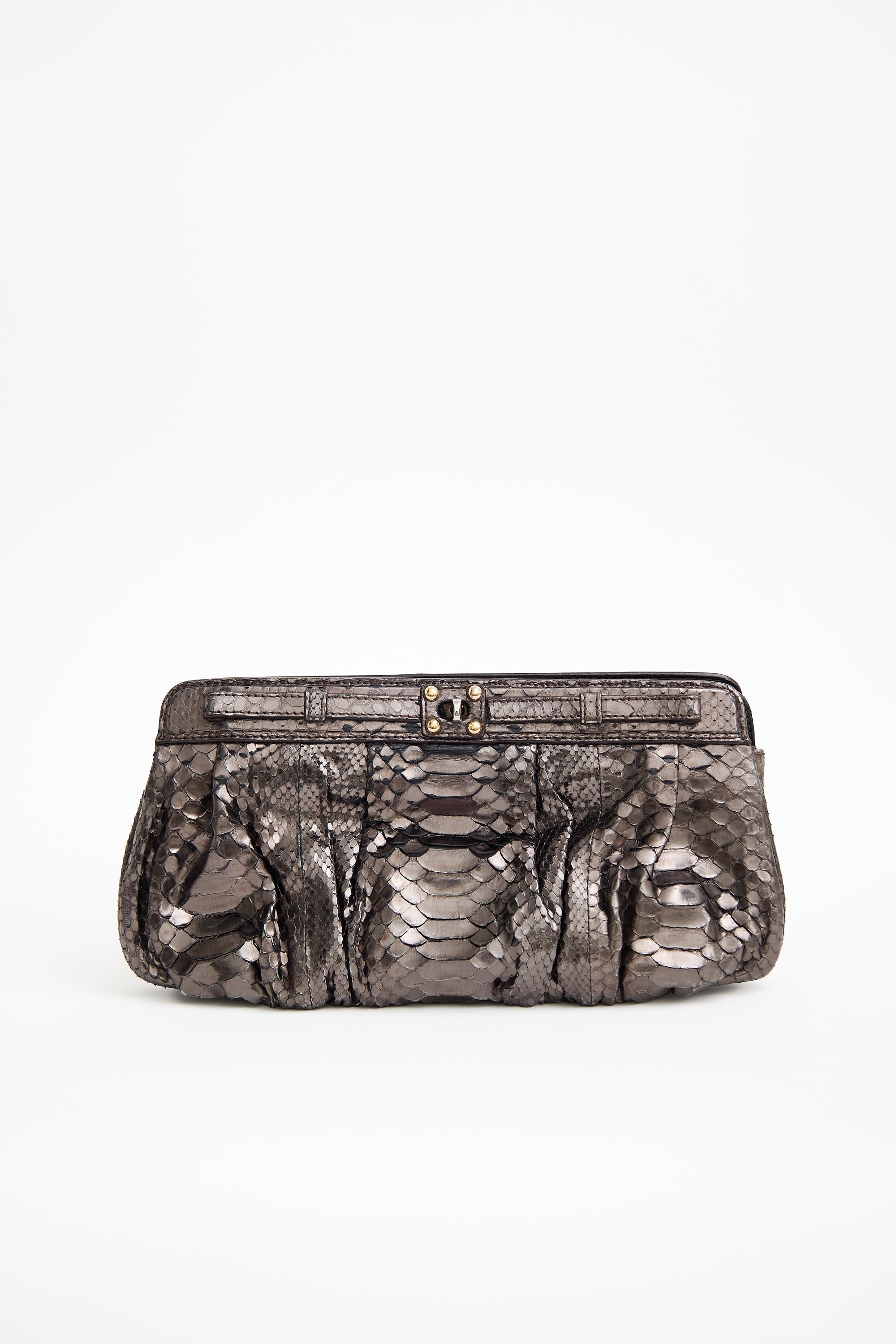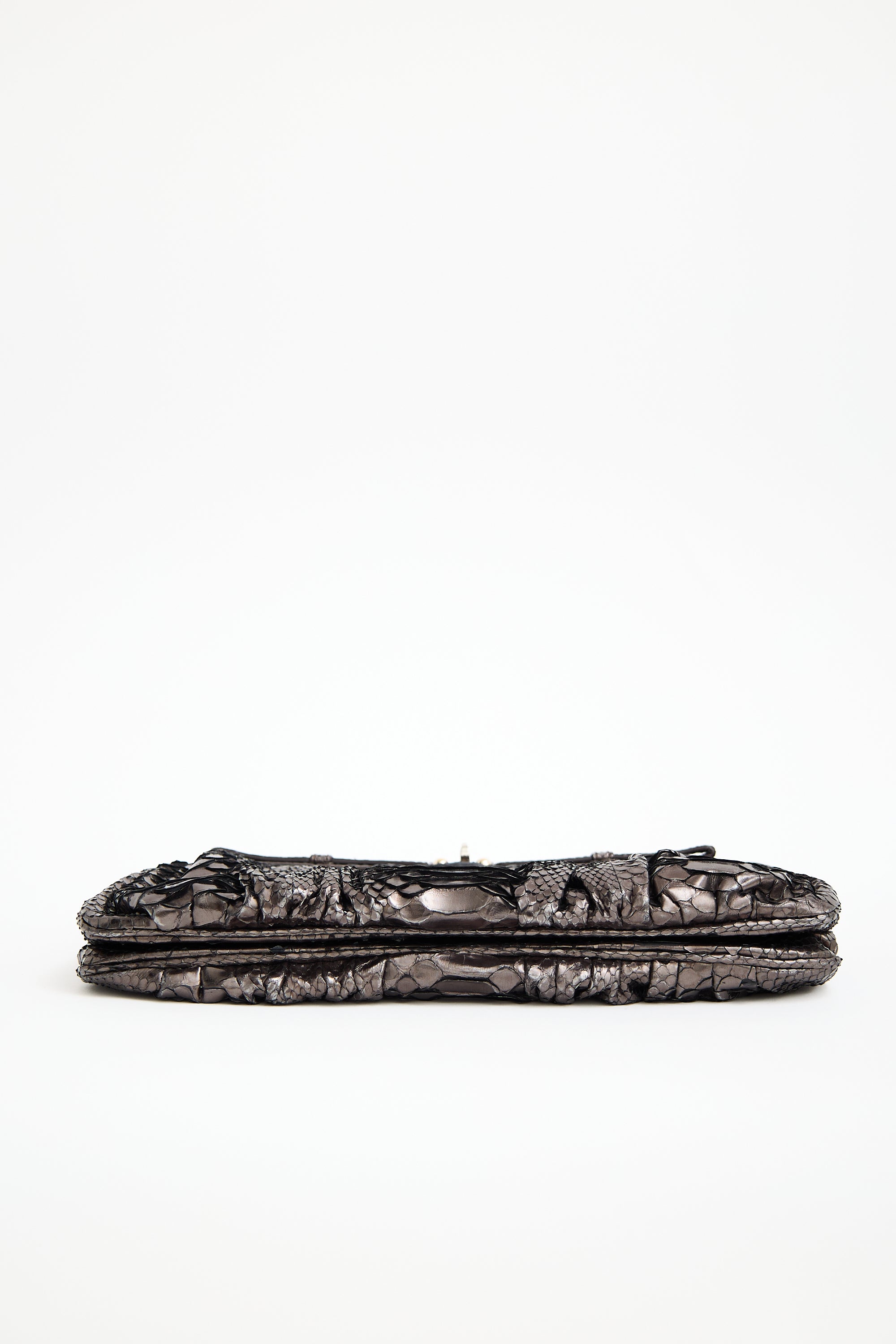 Pre-owned Zagliani grey metallic exotic leather clutch featuring twist lock closure and three main compartments. Includes original dust bag.