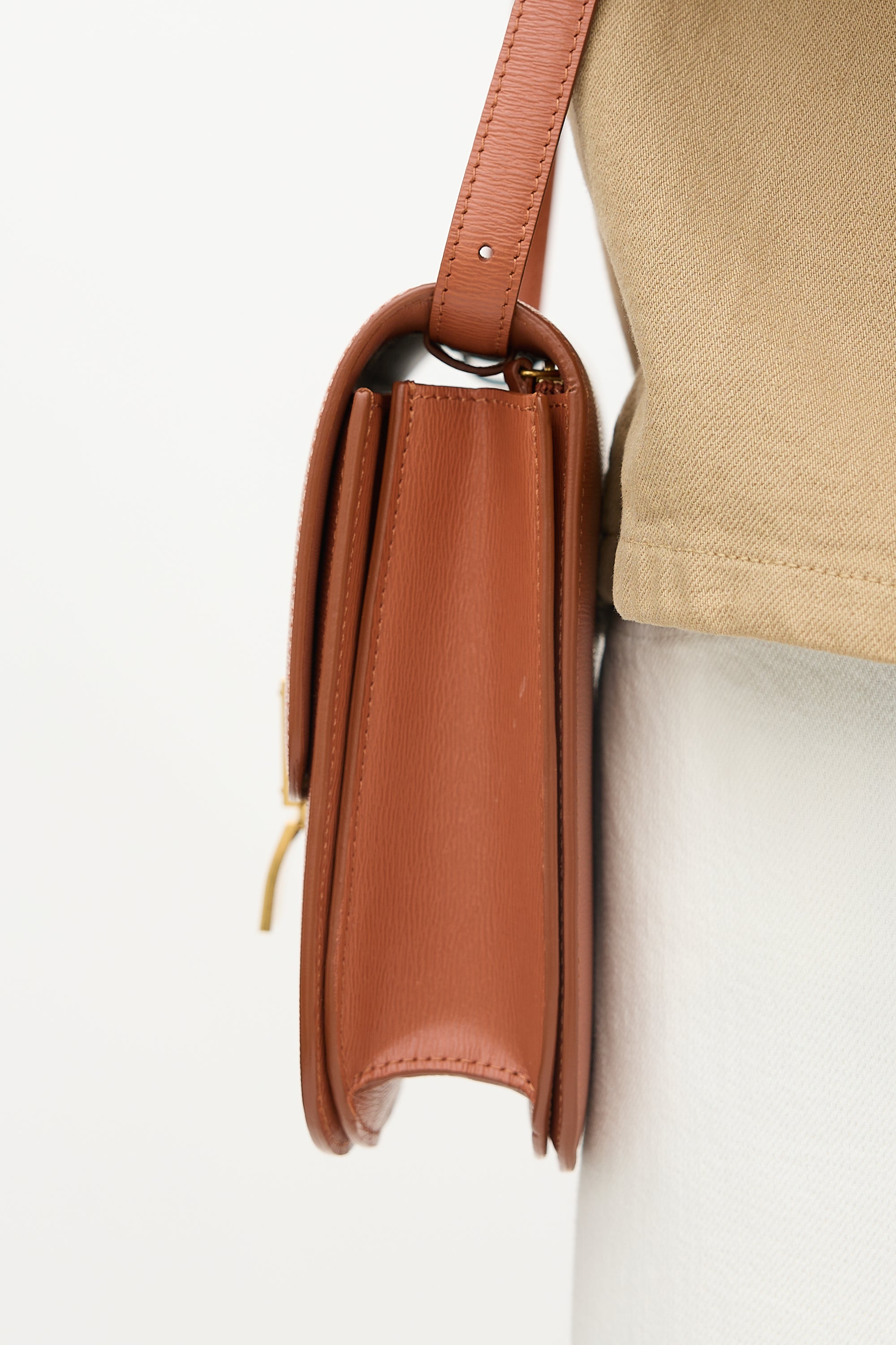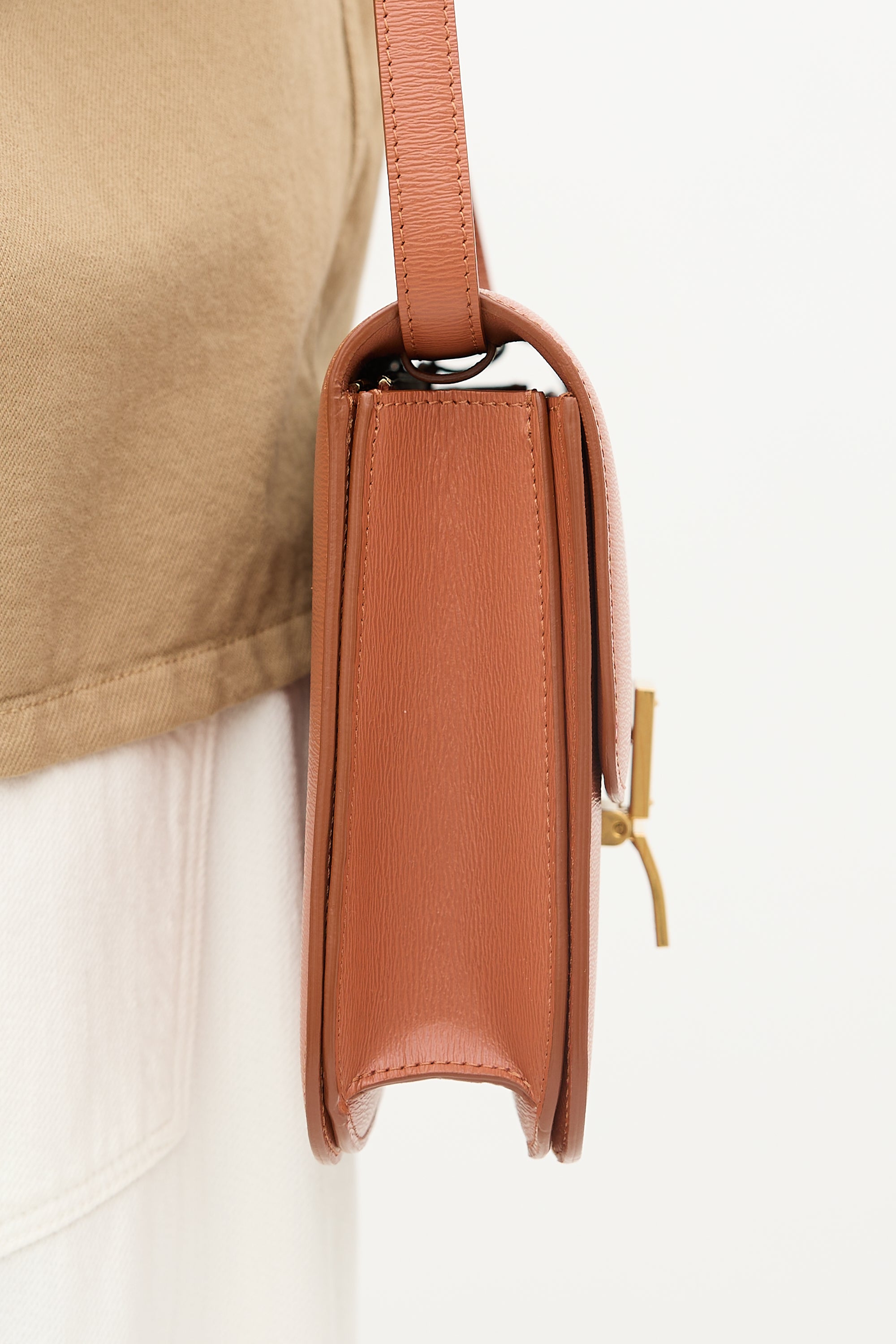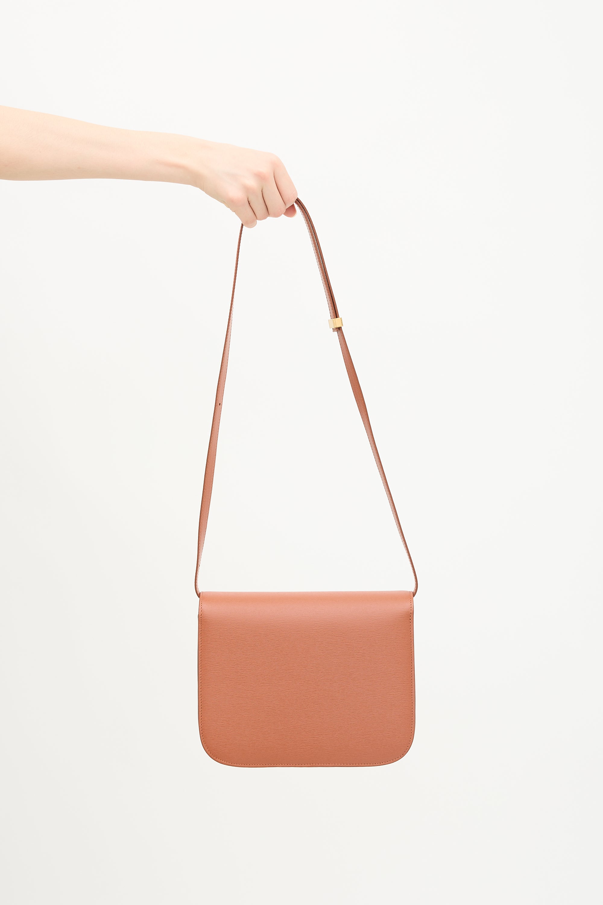 Pre-owned Celine 2019 terracotta leather medium Classic Box bag featuring adjustable crossbody strap, gold tone hardware, top flap with clip closure, two main compartments, two interior slip pockets, and one interior zip pocket. Comes with original dust bag.