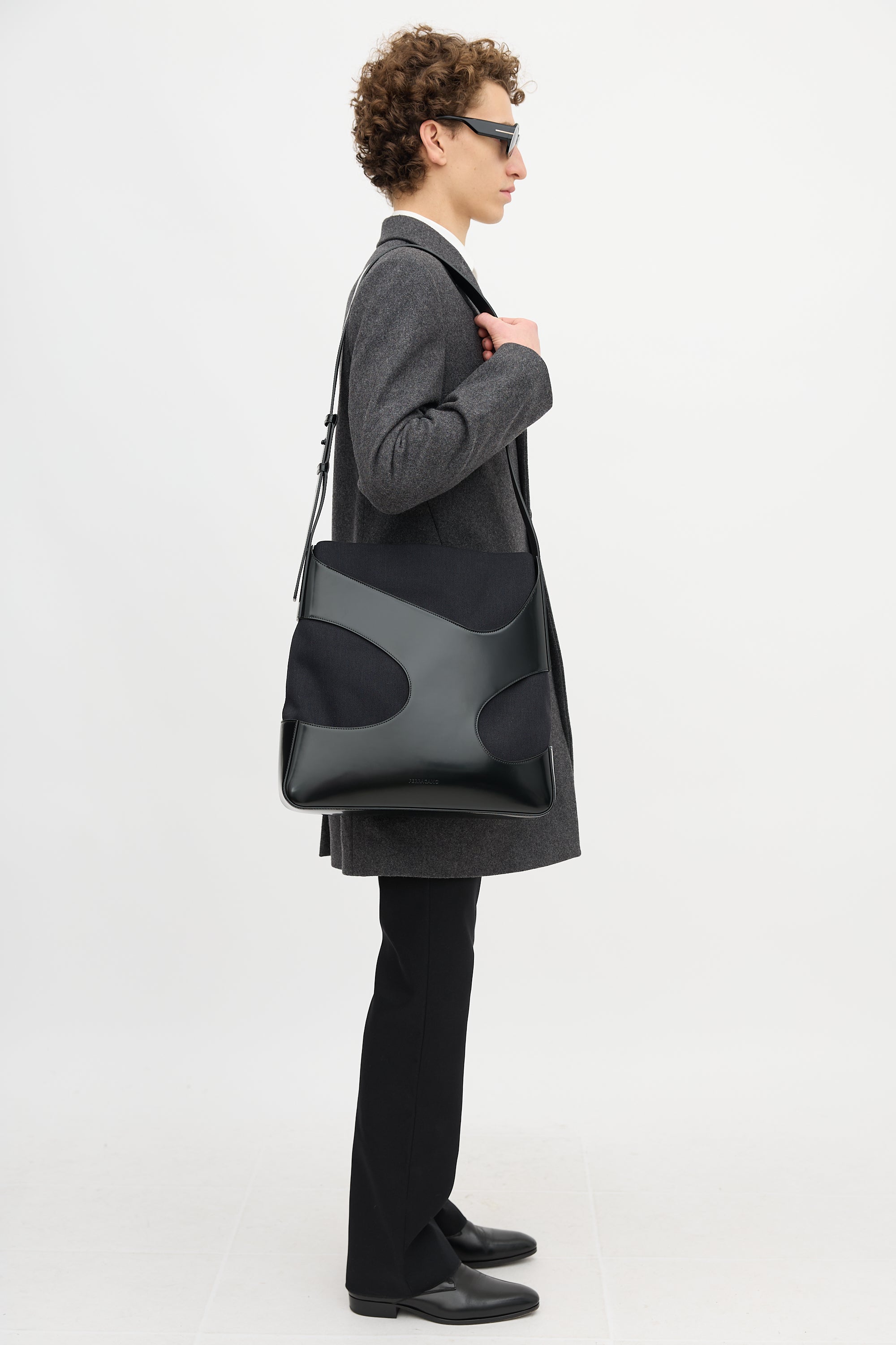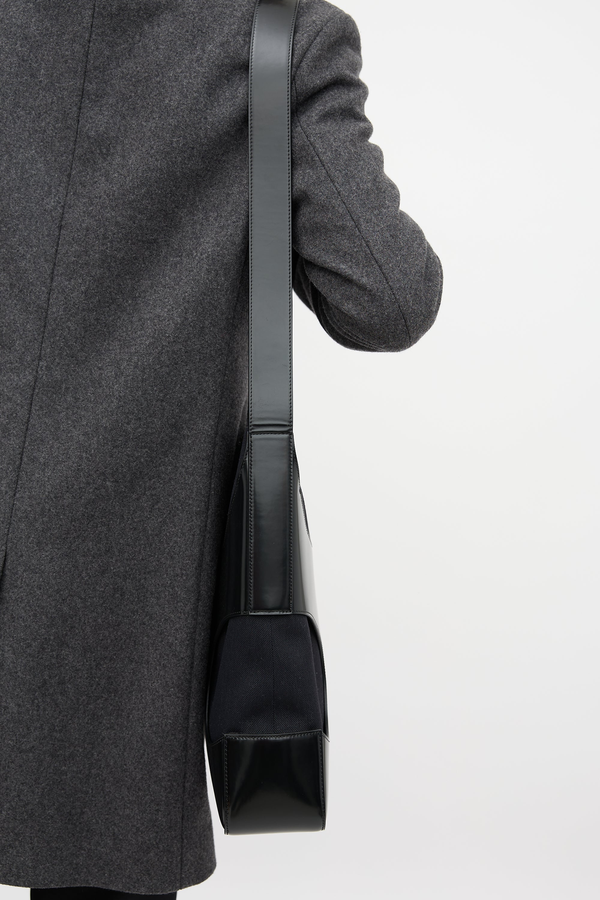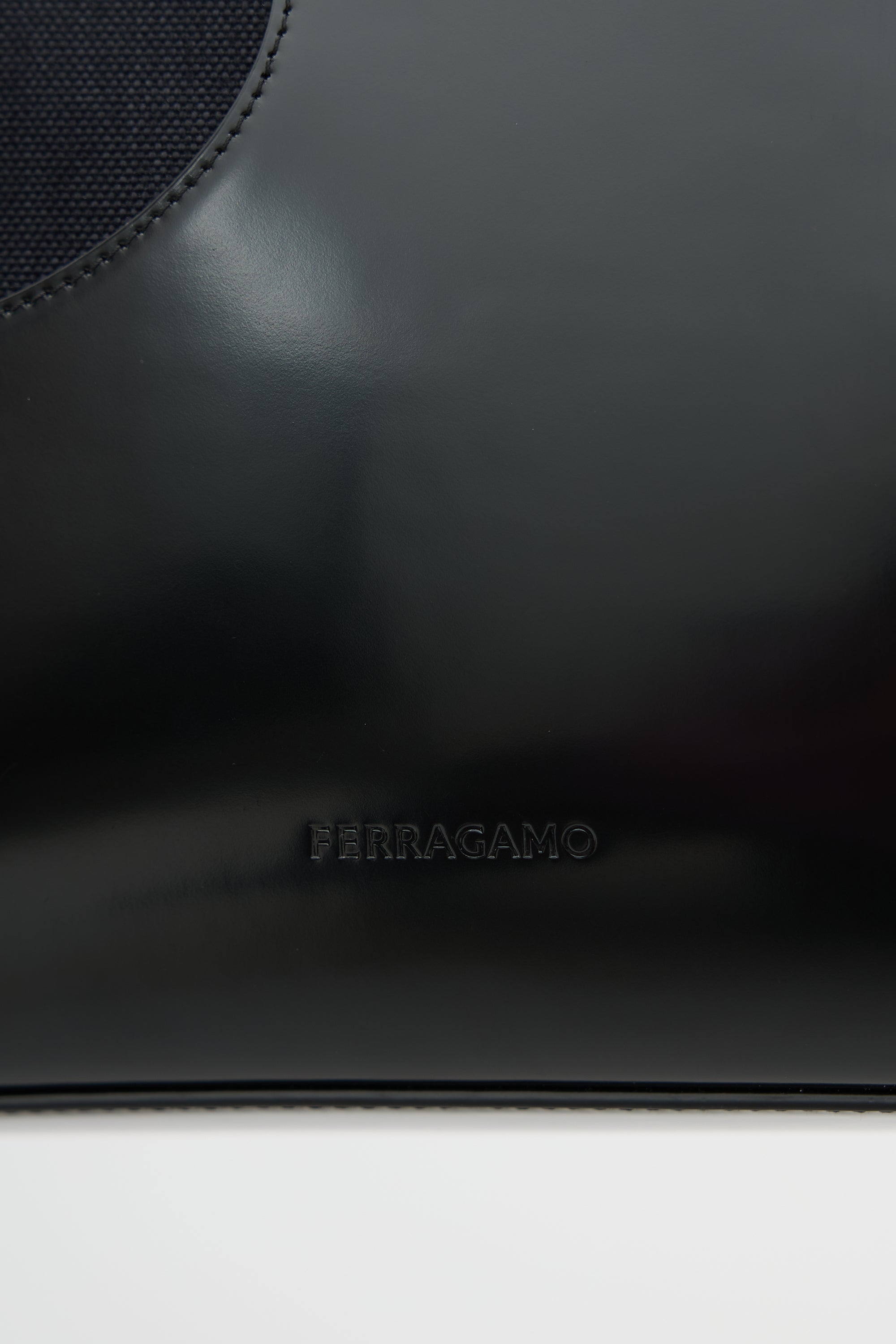 Pre-owned Ferragamo black leather and canvas shoulder bag featuring tonal stitching, cut out design, stamped logo at bottom centre front, adjustable shoulder strap, magnetic top closure, and one lined main compartment with one zip pocket and two slip pockets. Comes with original dust bag.