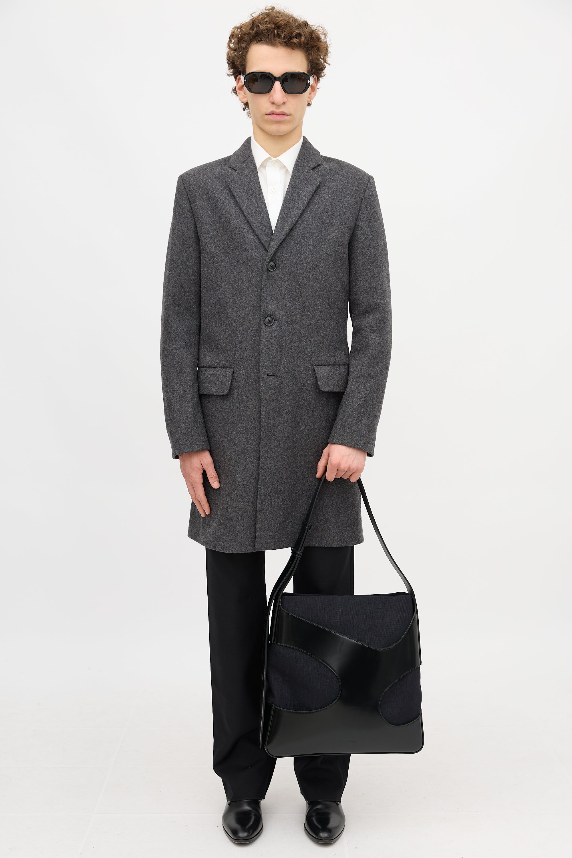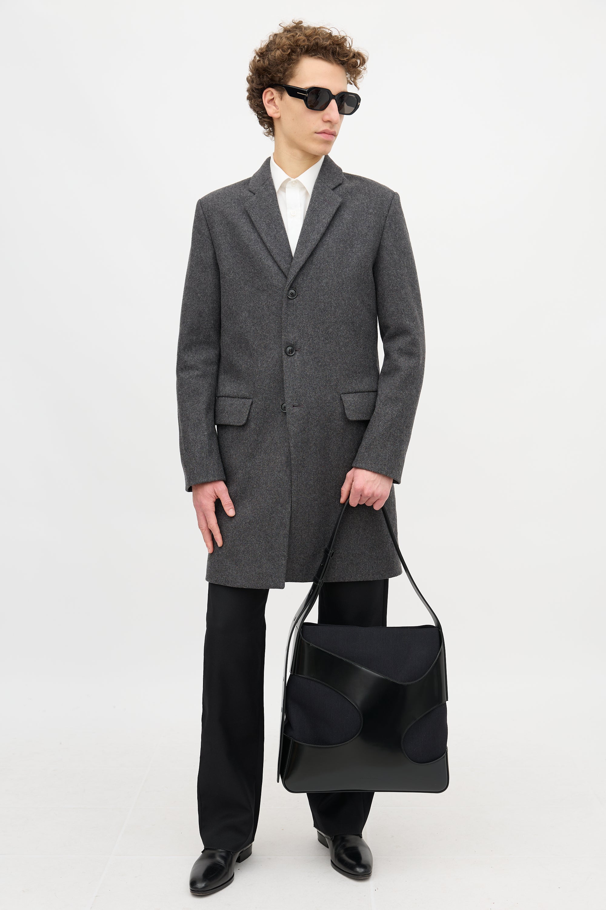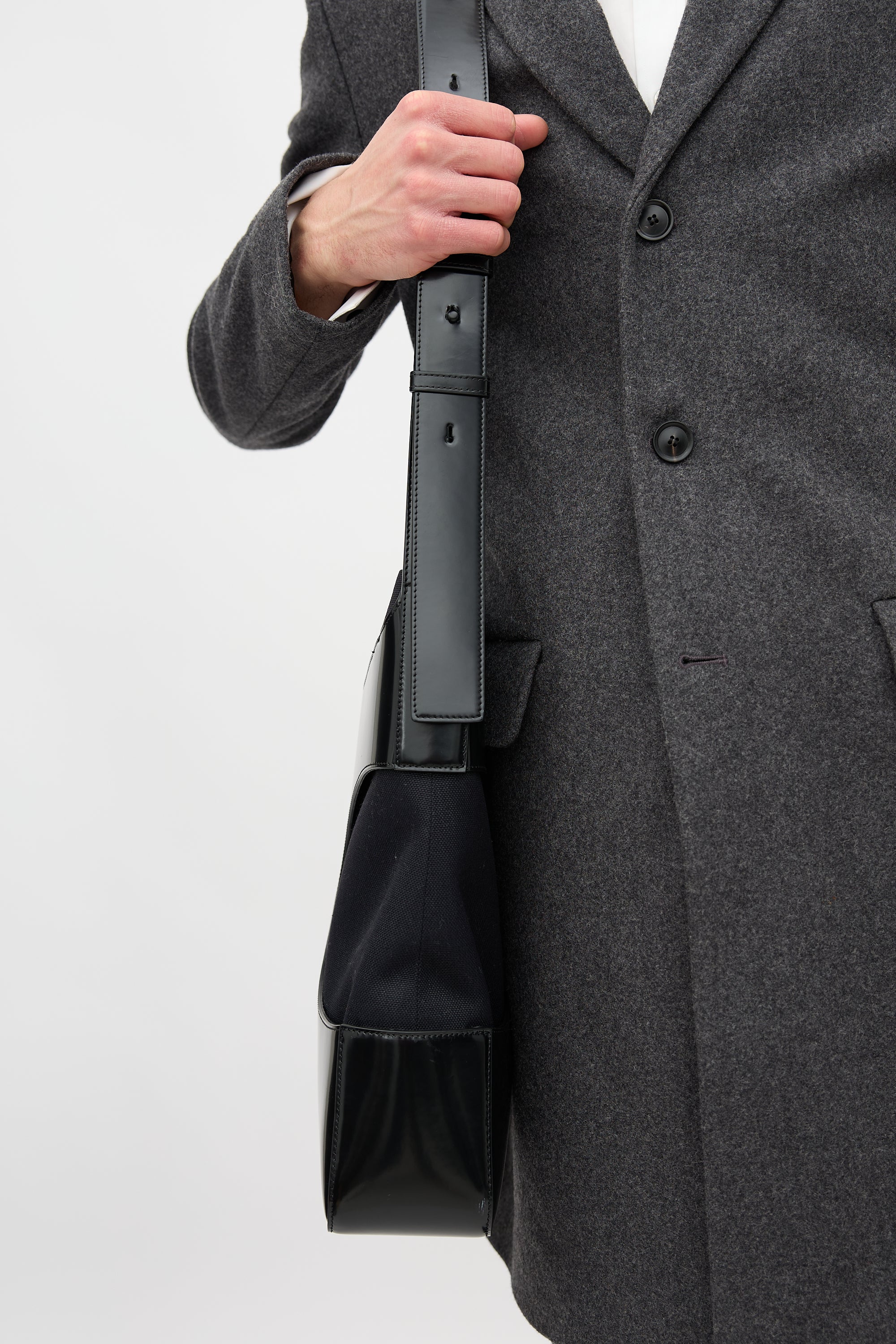 Pre-owned Ferragamo black leather and canvas shoulder bag featuring tonal stitching, cut out design, stamped logo at bottom centre front, adjustable shoulder strap, magnetic top closure, and one lined main compartment with one zip pocket and two slip pockets. Comes with original dust bag.