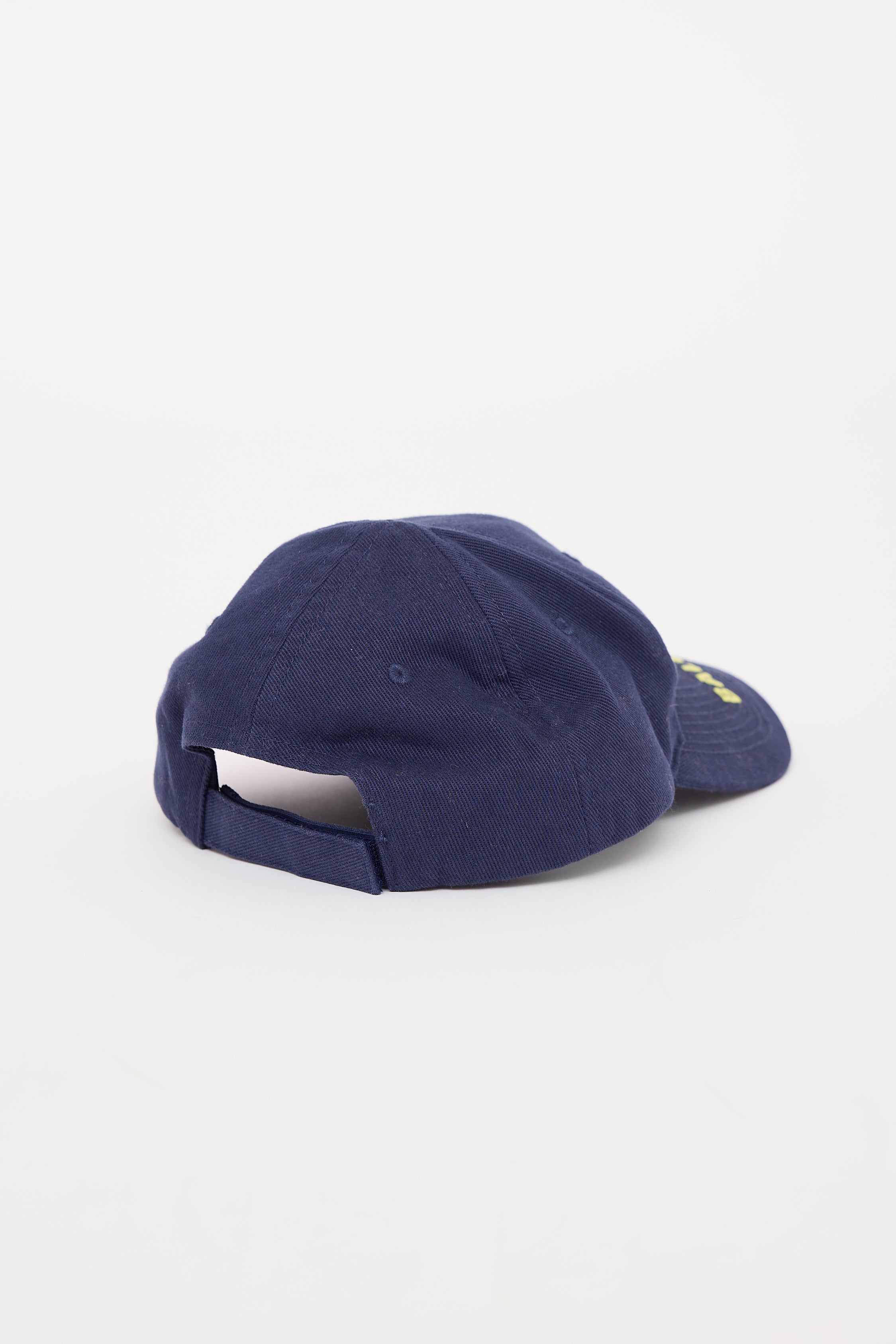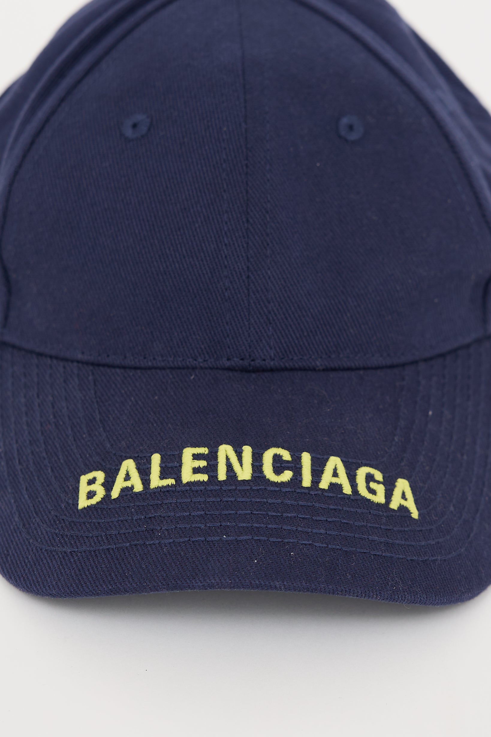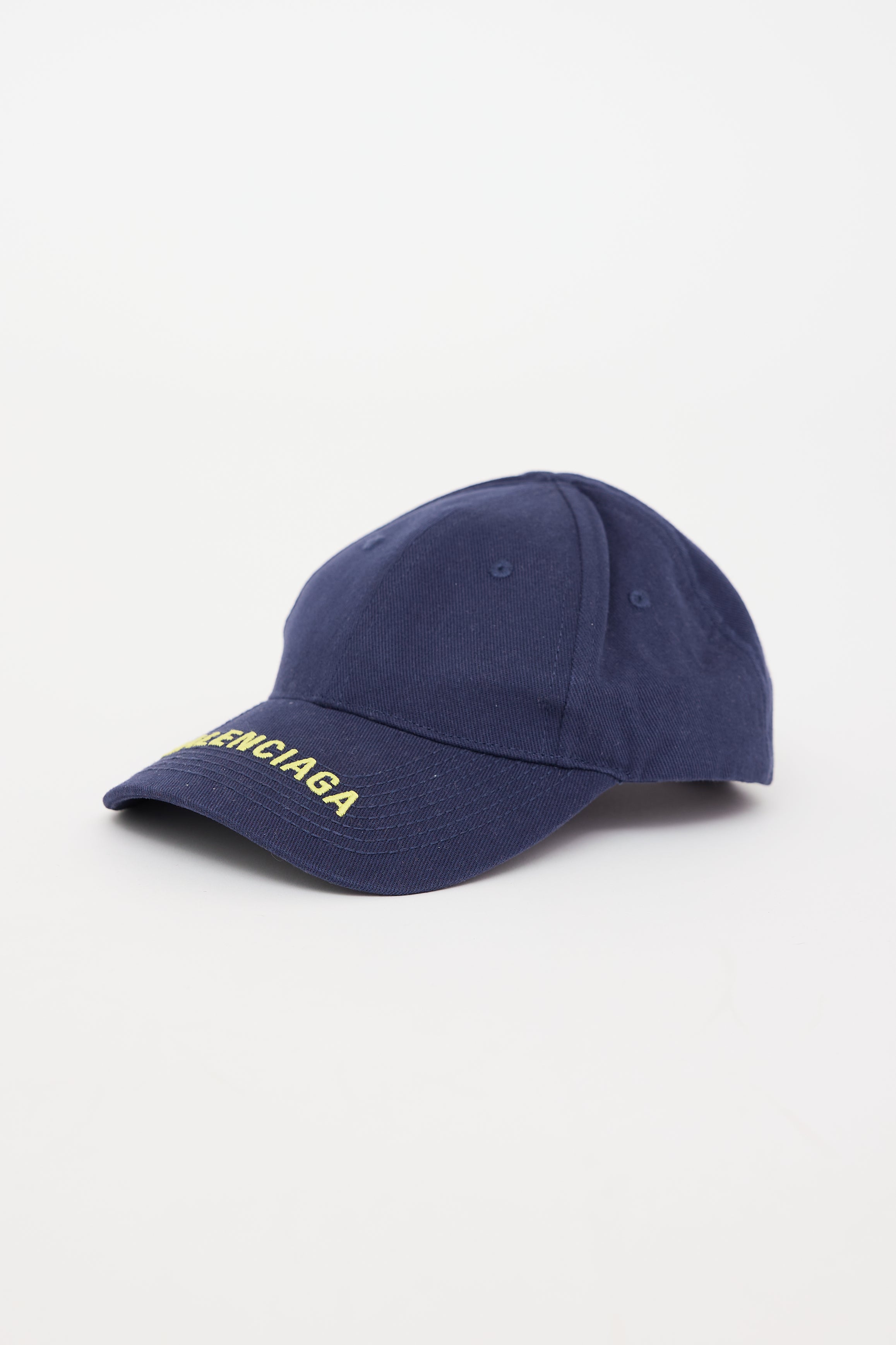Pre-owned Balenciaga navy and yellow baseball cap featuring embroidered logo at front and adjustable velcro strap at back.