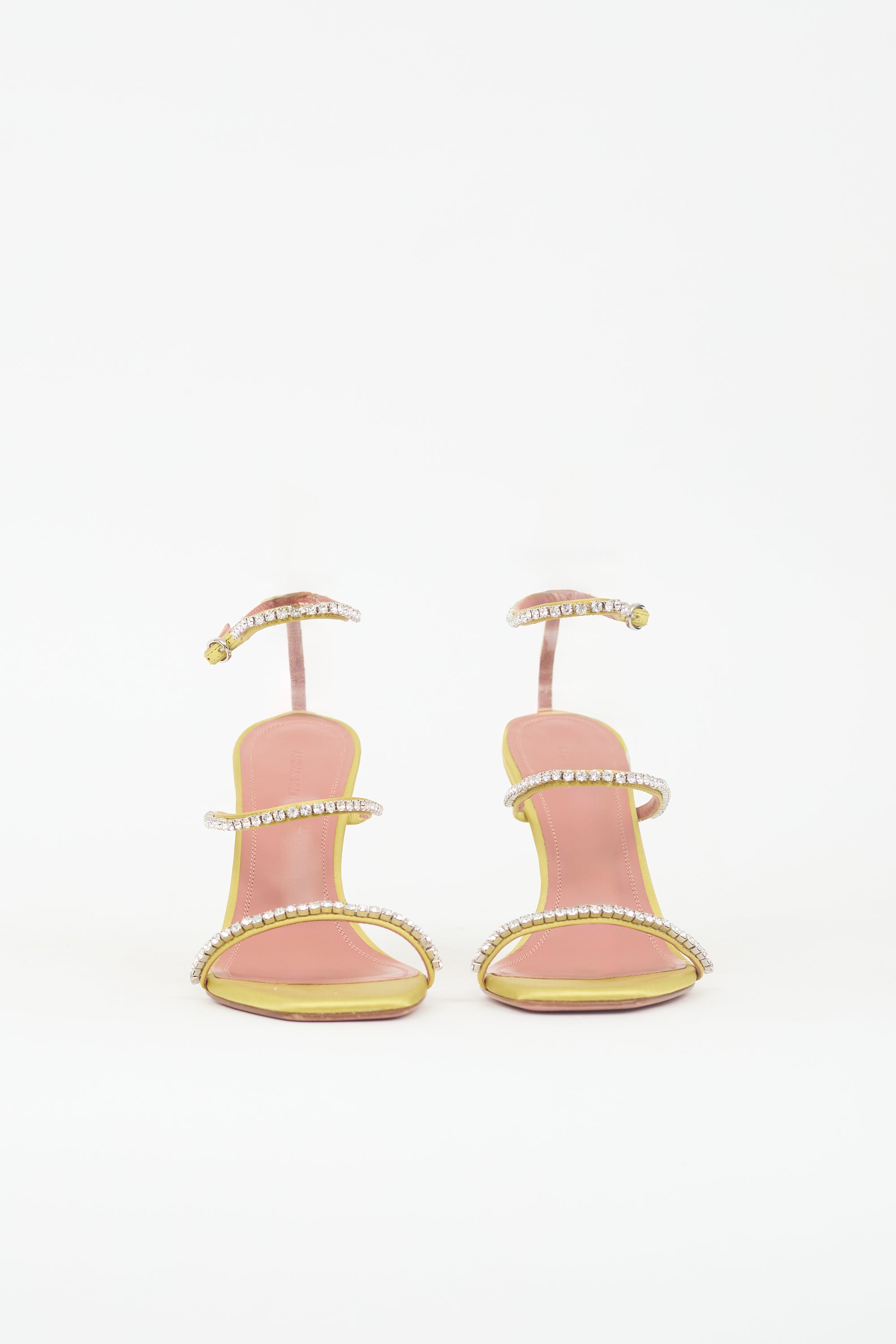 Pre-owned Amina Muaddi green satin Gilda heels featuring an open square toe, crystal embellished straps, adjustable ankle straps, and covered spool heel.
