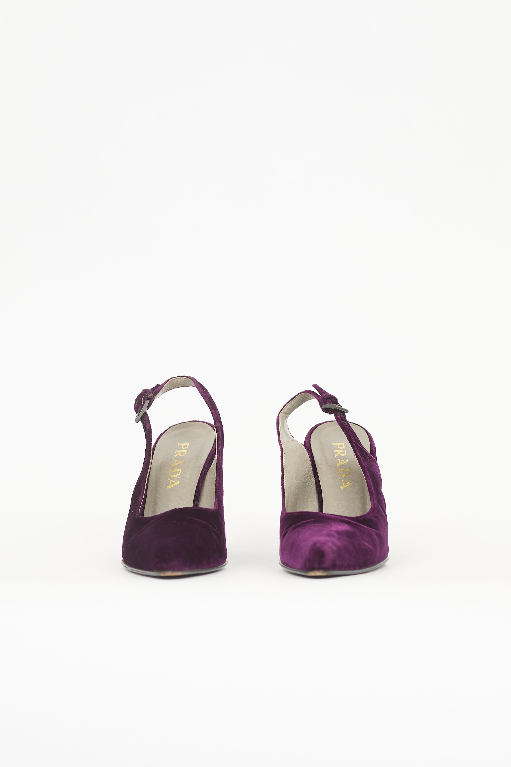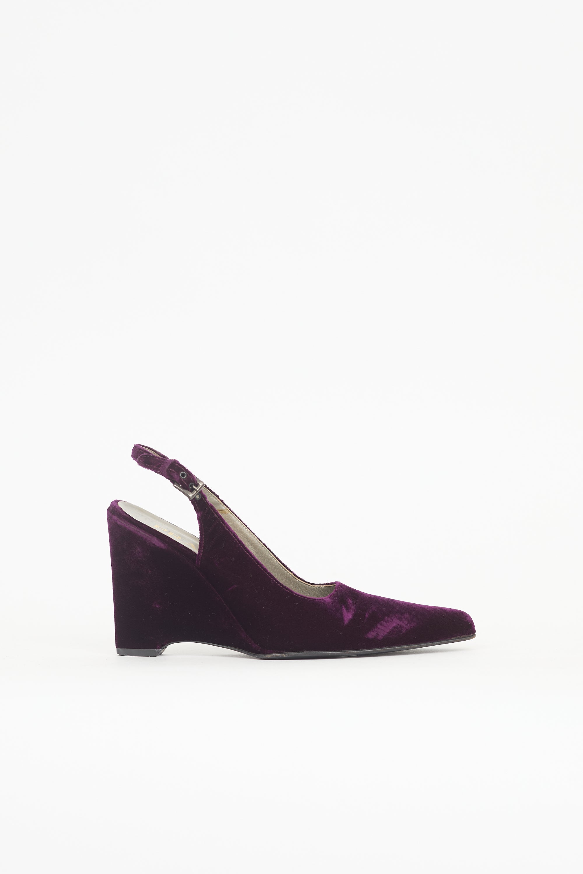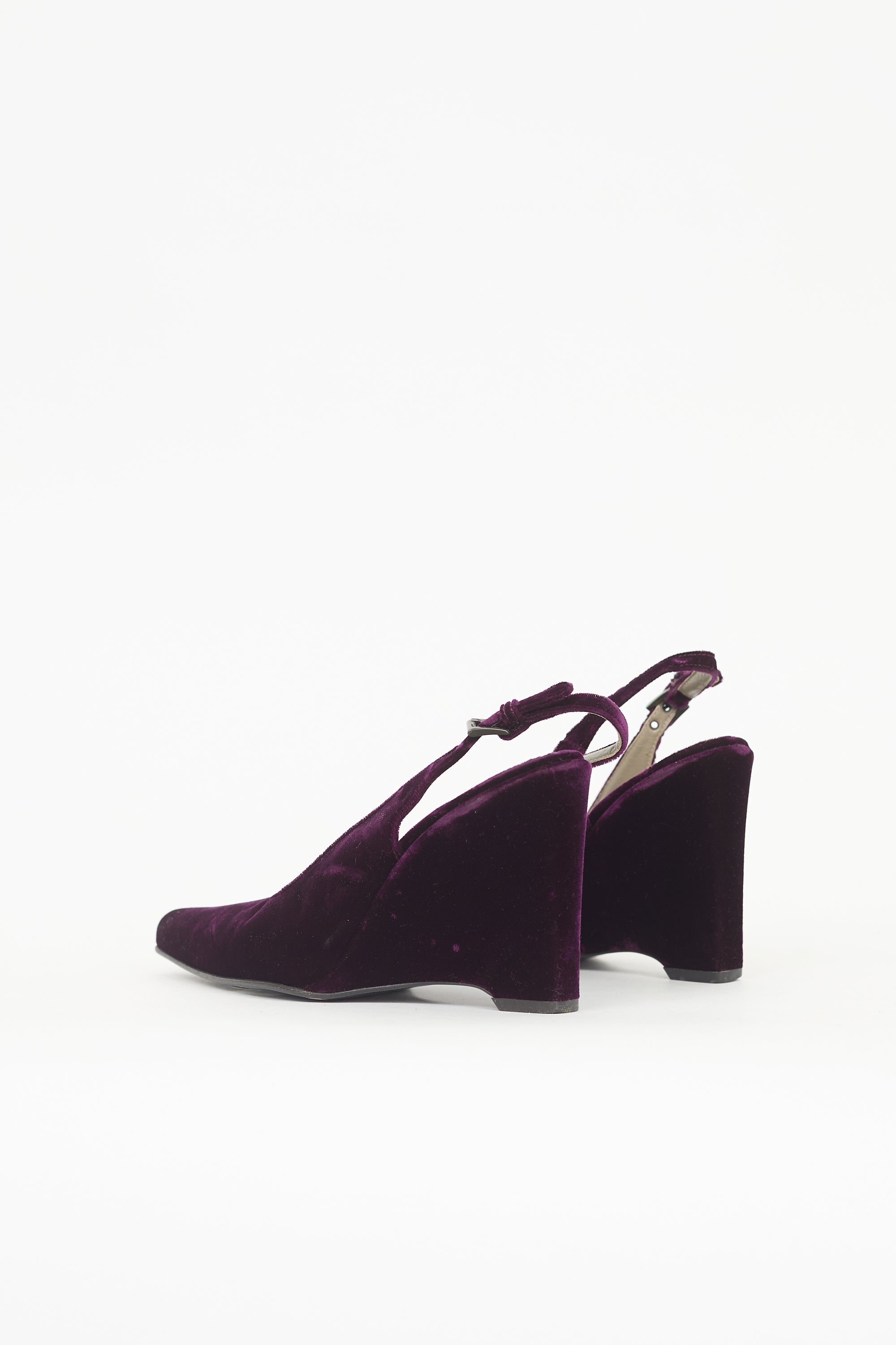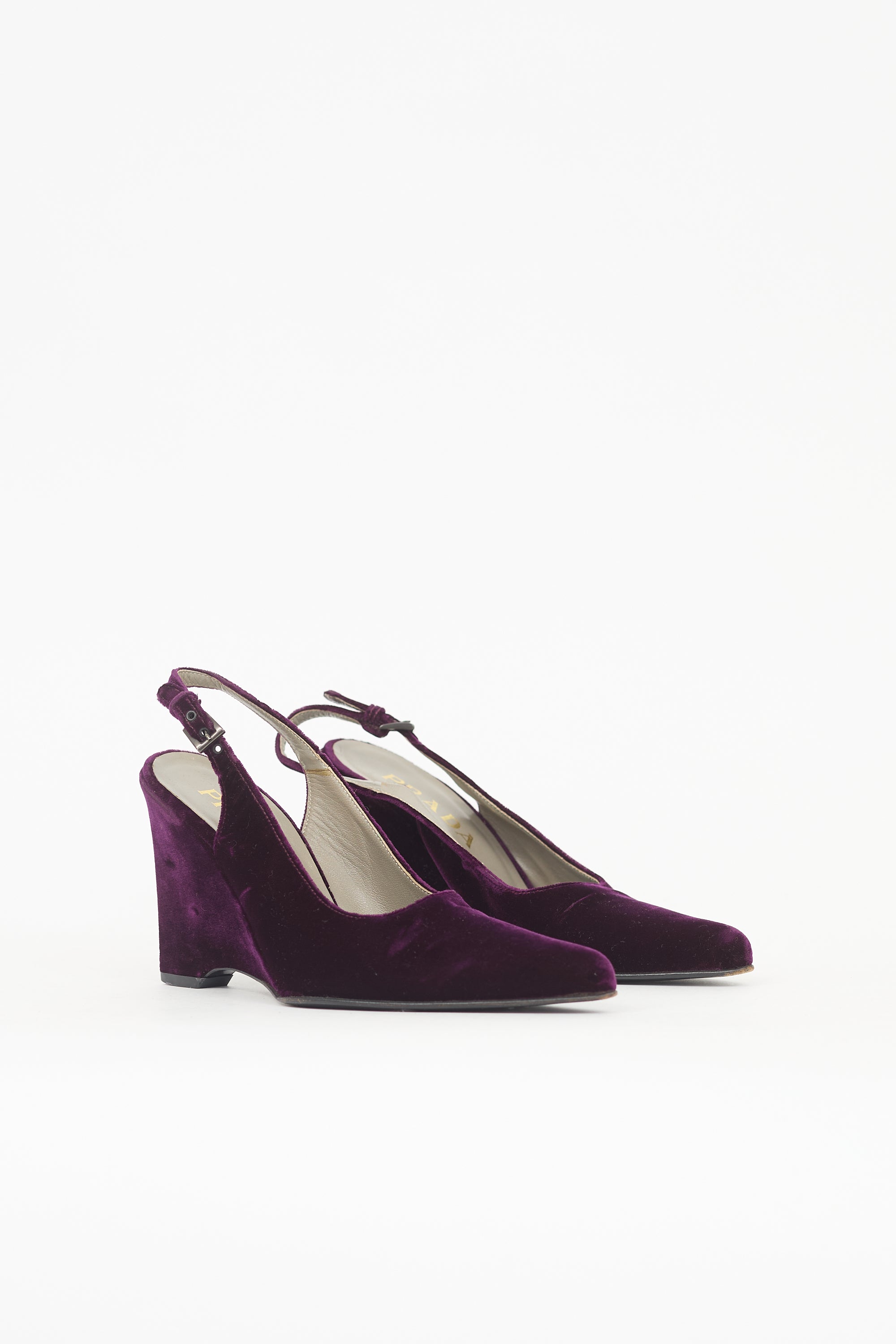 Pre-owned Prada 1997 purple velvet heels featuring pointed toe, adjustable slingback strap, and covered wedge heel.