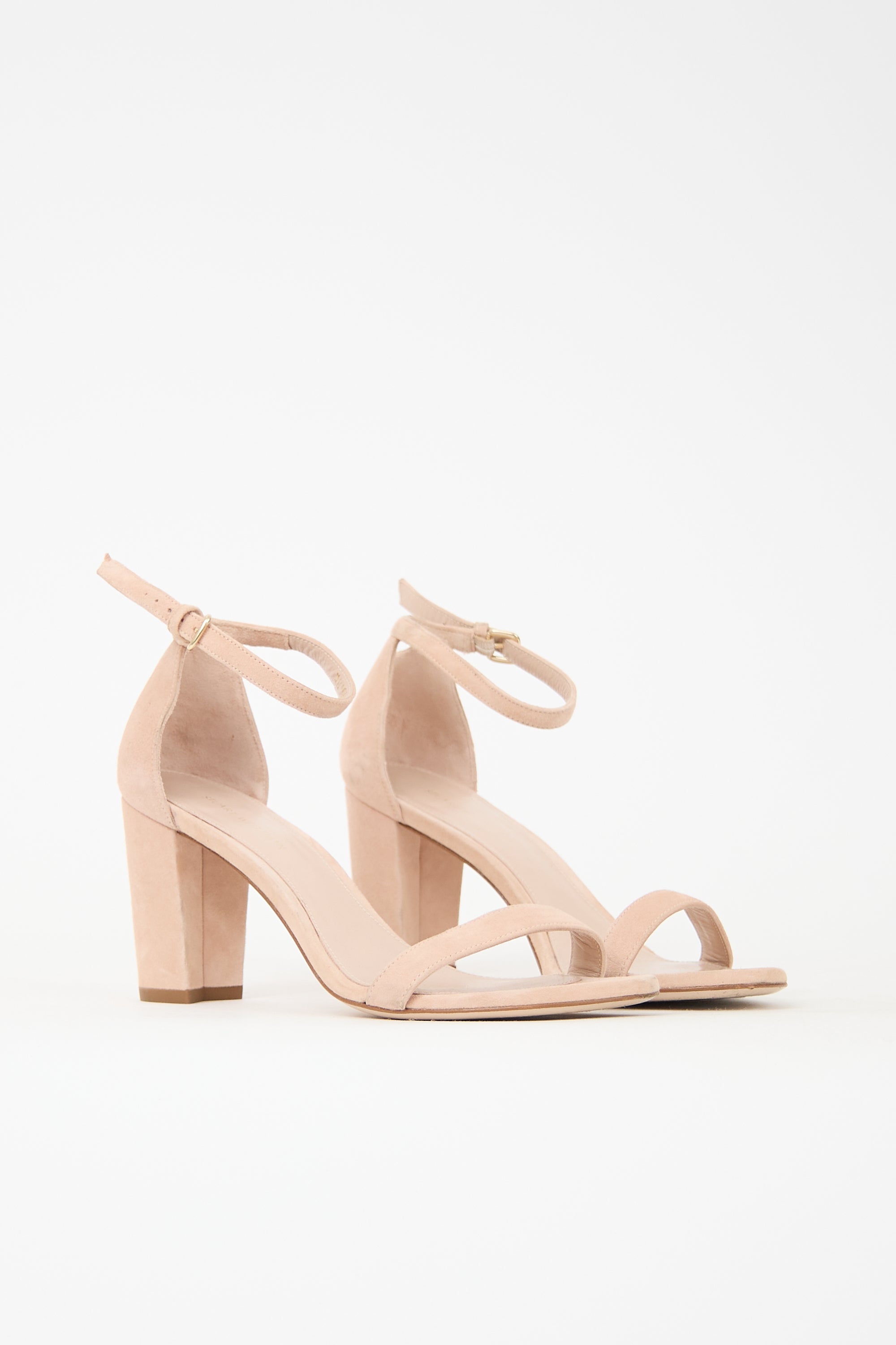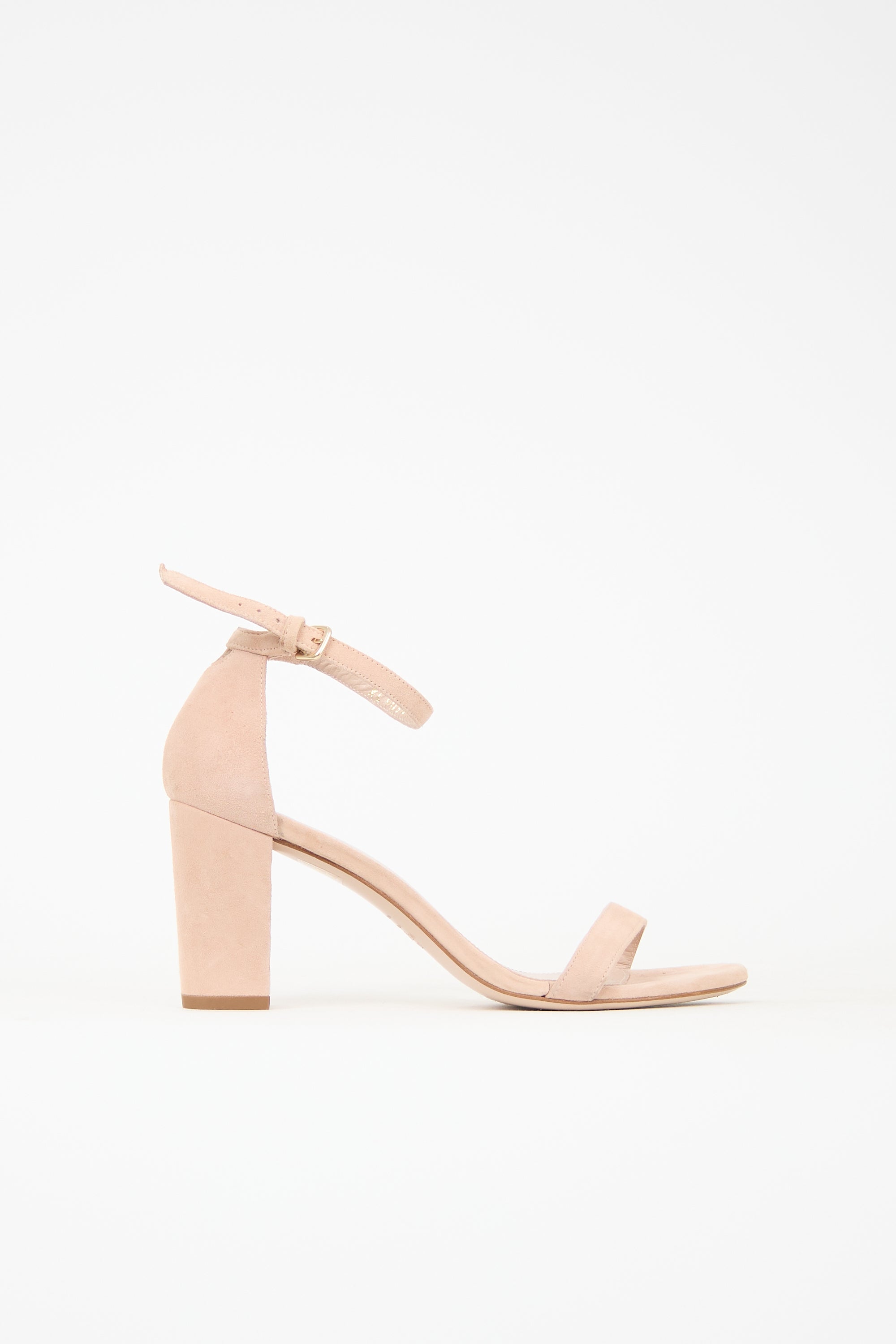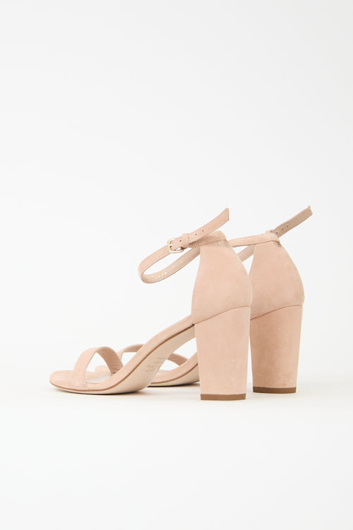 Pre-owned Stuart Weitzman pink suede Nearlynude heels featuring open rounded toe, adjustable ankle strap, and covered block heel.