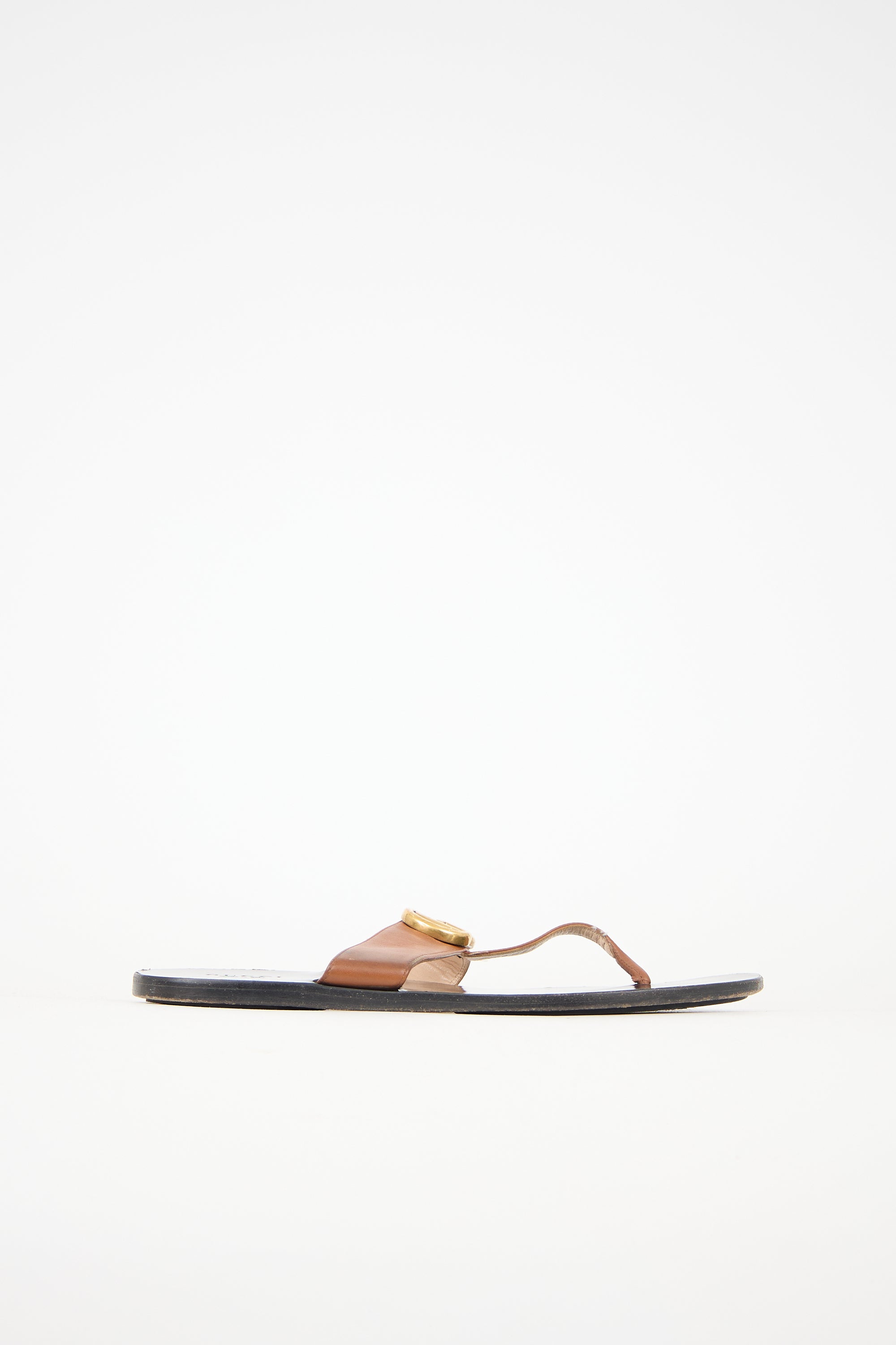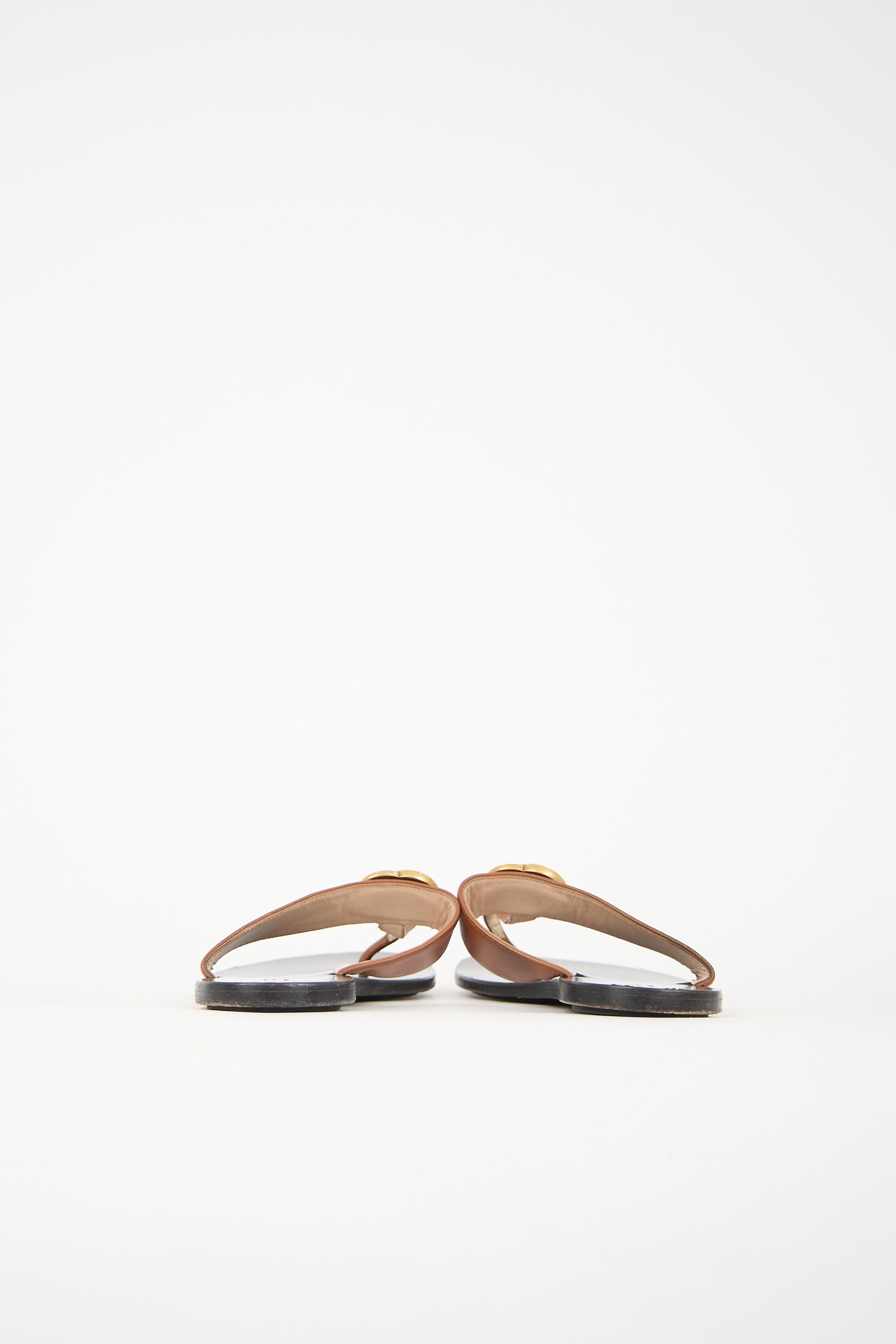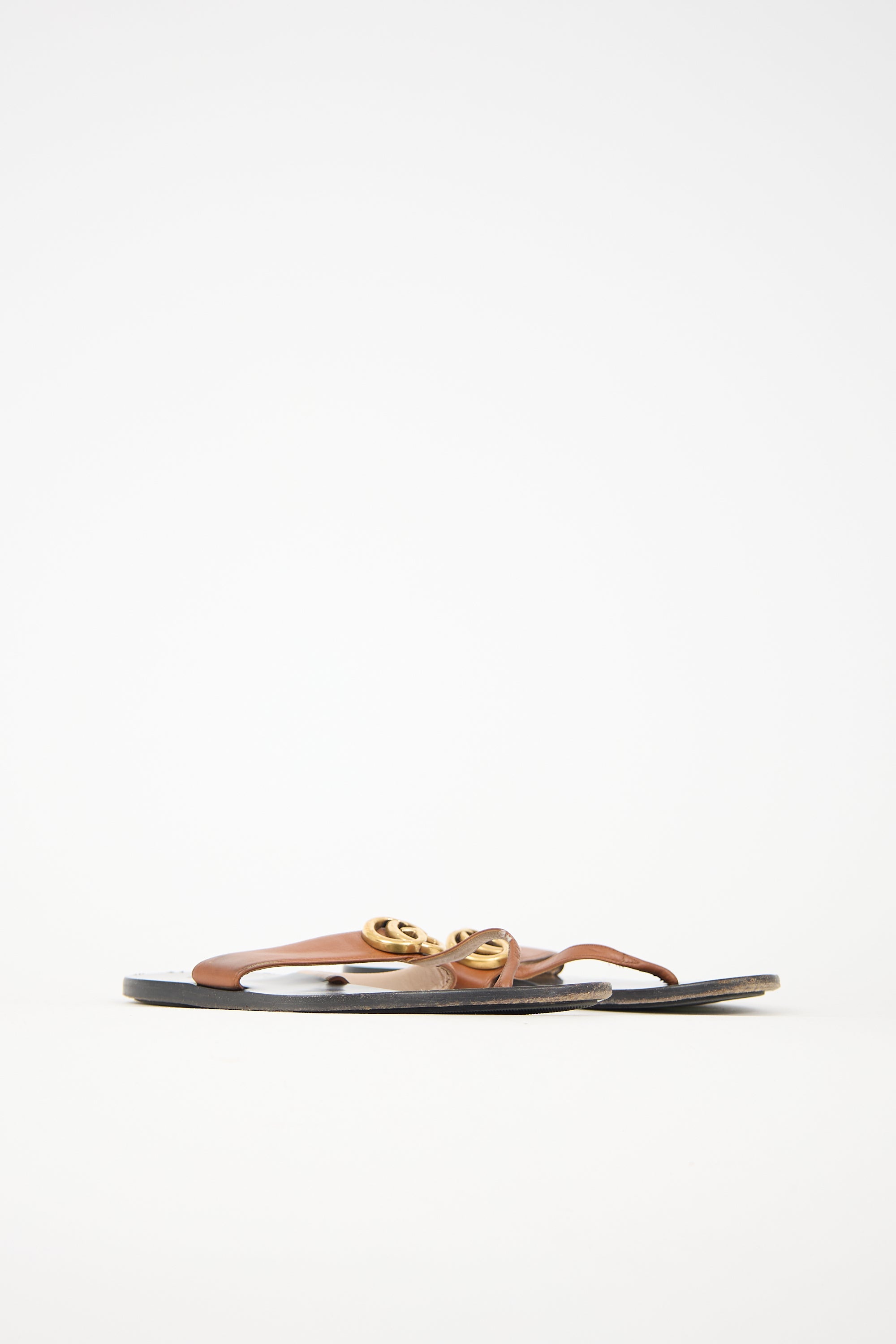 Pre-owned Gucci brown leather Marmont sandals featuring open almond toe, T-strap upper with gold tone GG logo hardware, and slip on entry. Comes with original dust bag.