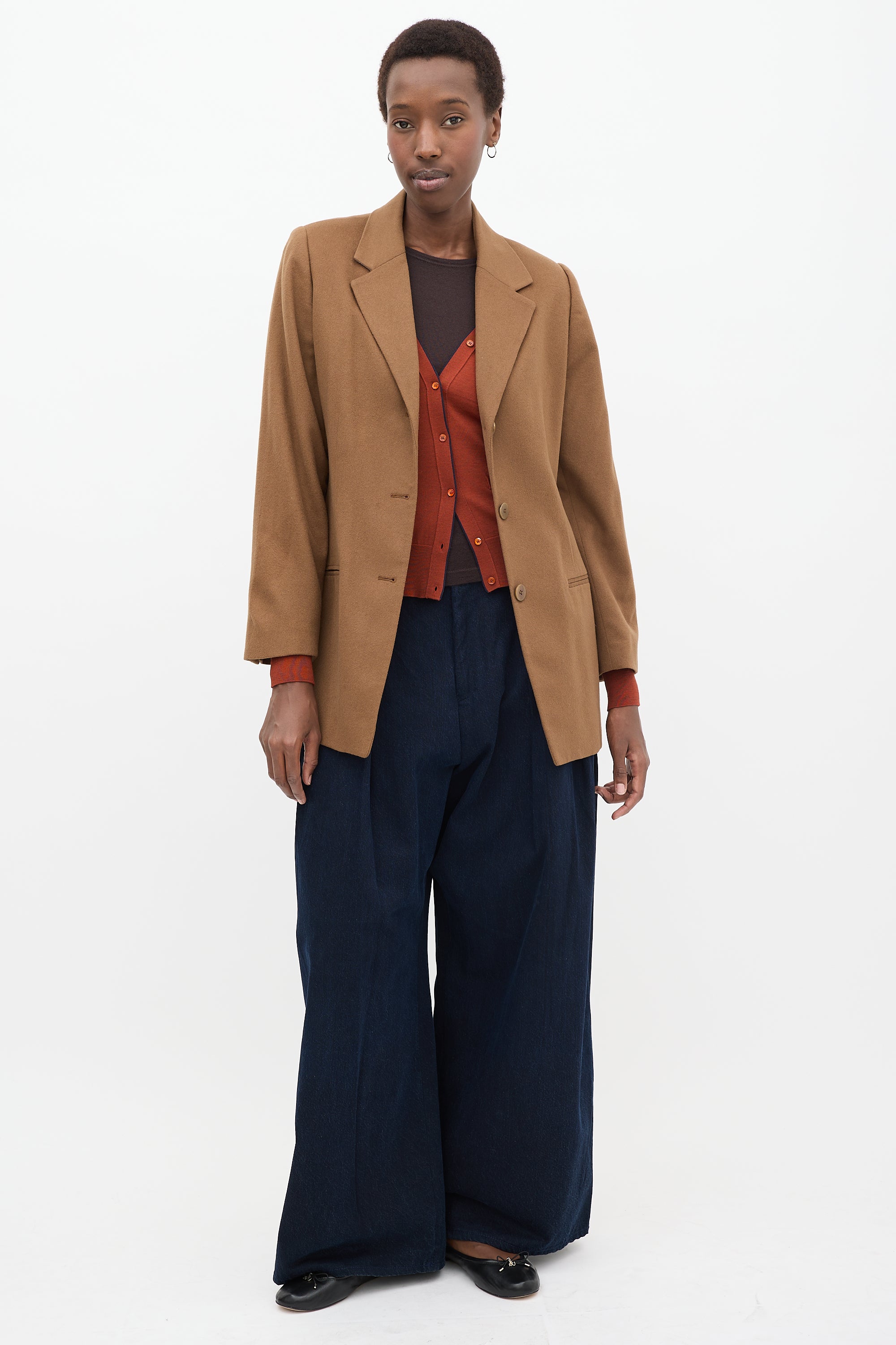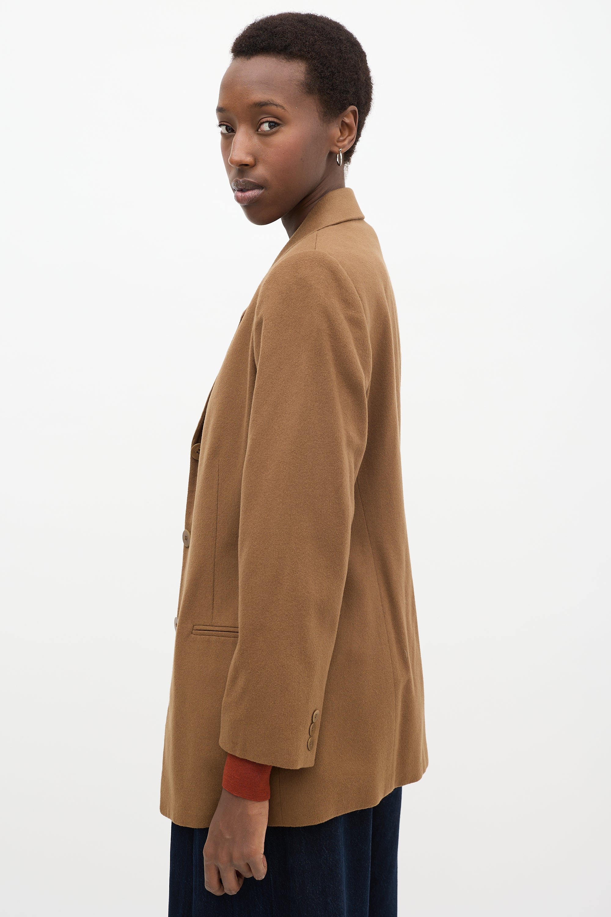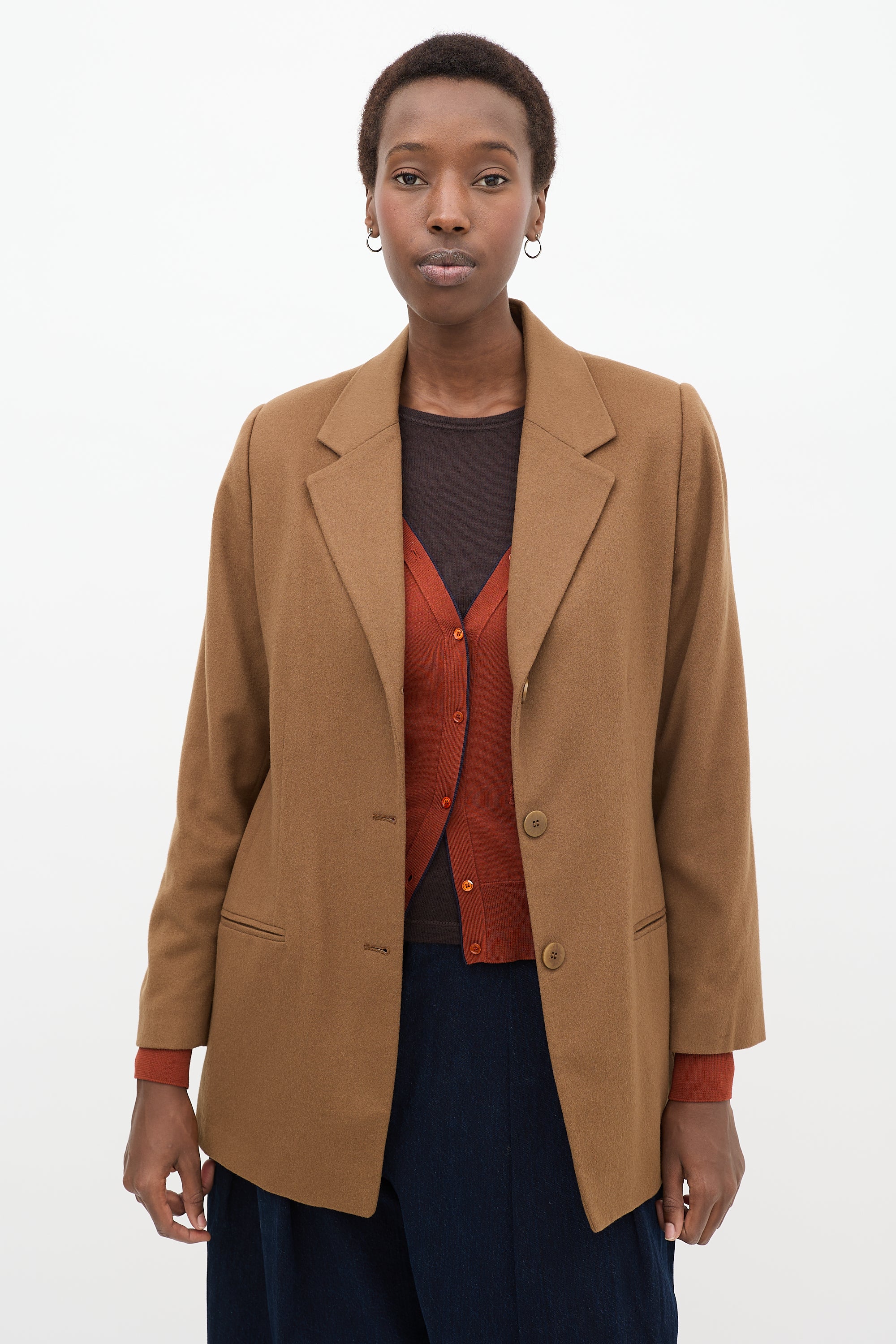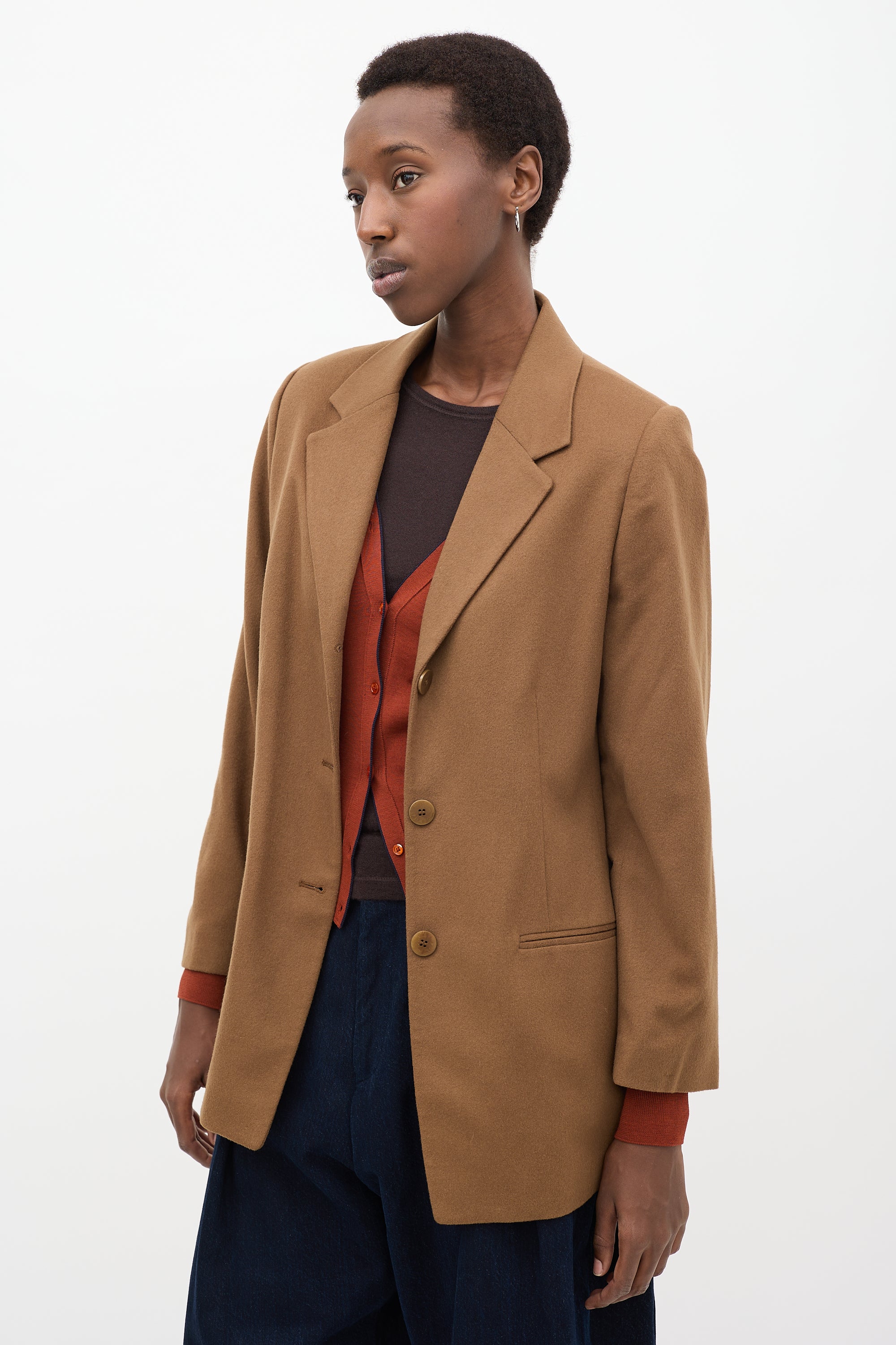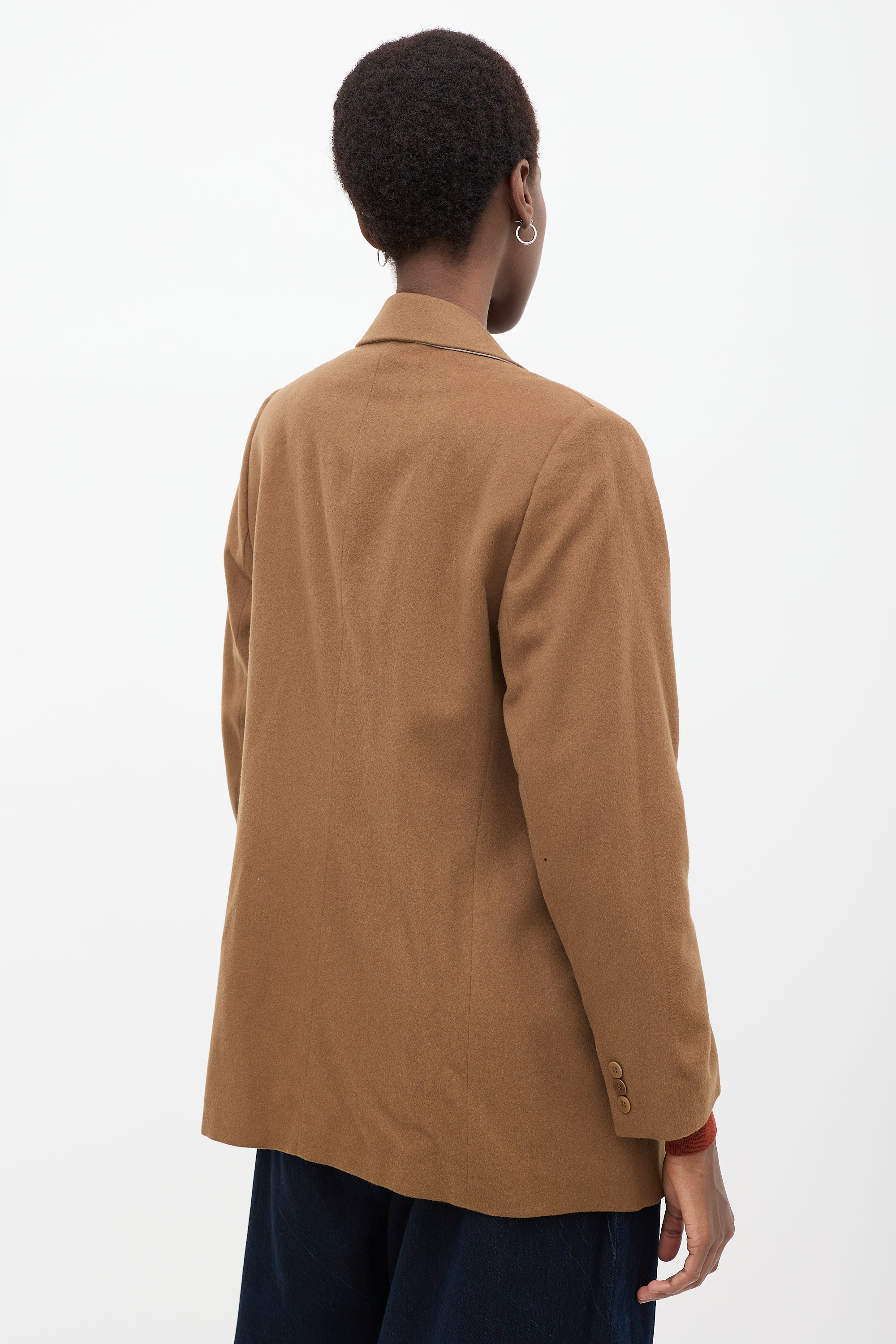 Pre-owned Loro Piana brown wool blazer featuring a notched collar, long sleeves with buttoned cuffs, two welt pockets at hip, and button up closure. Lined.