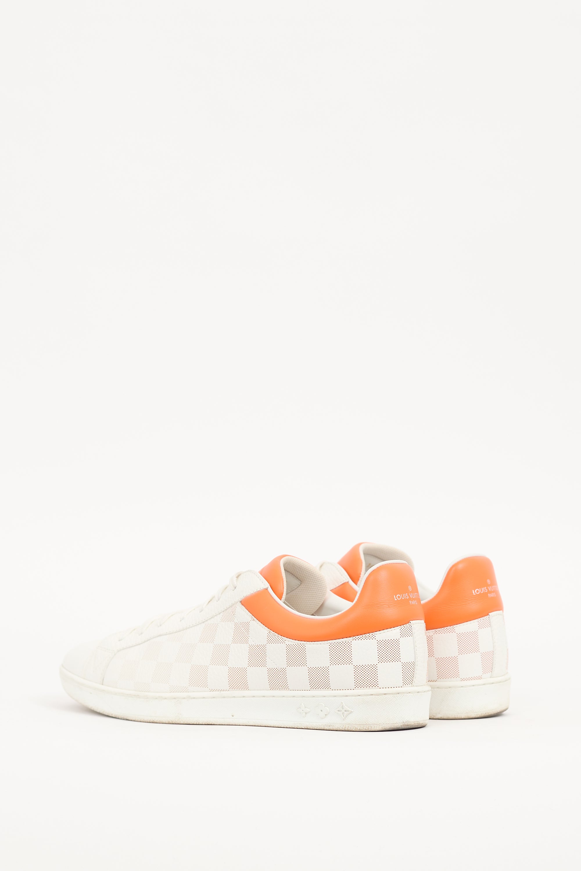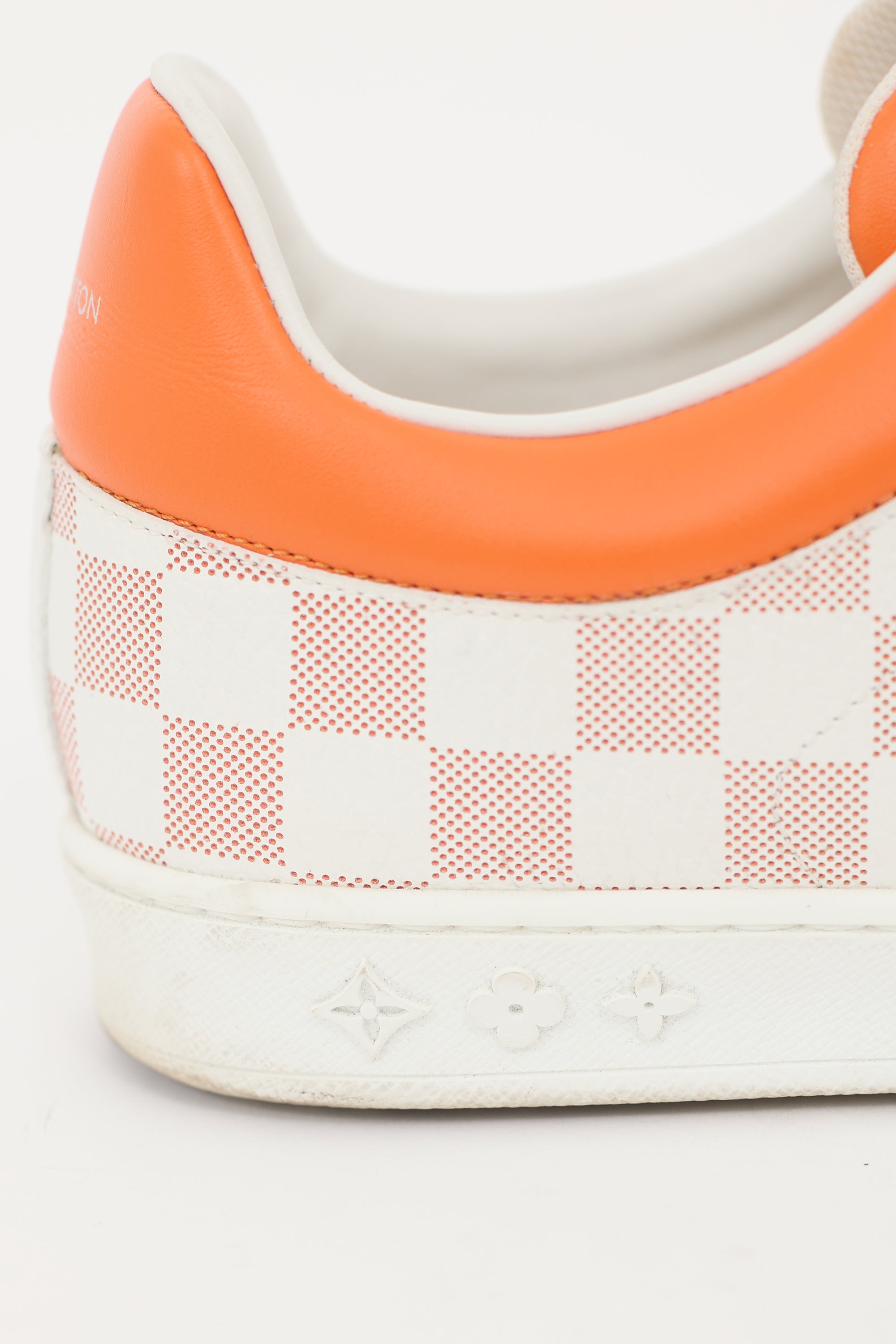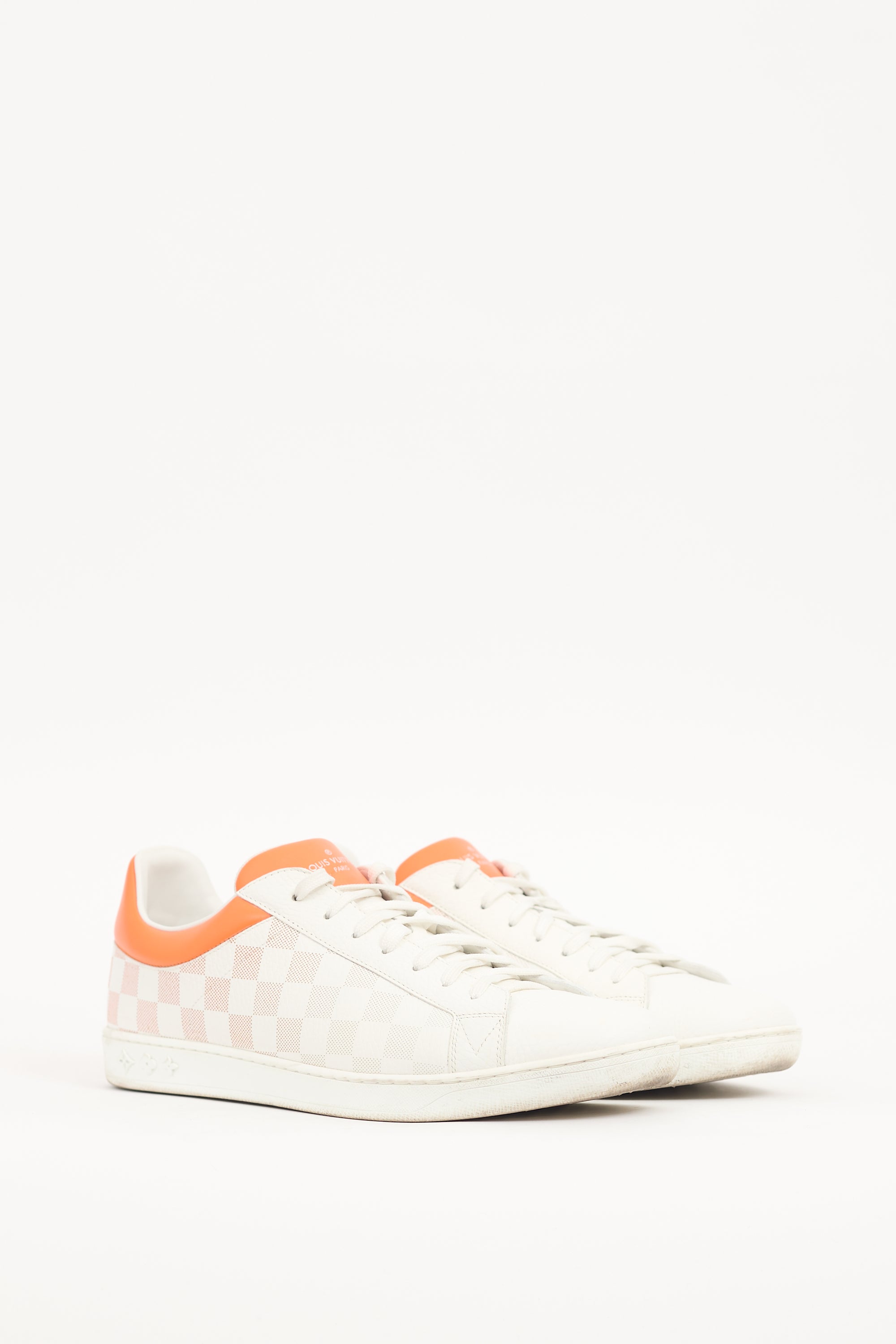 Pre-owned Louis Vuitton white and orange leather Luxembourg sneakers featuring gradient damier print throughout upper, lace up vamp, solid orange leather collar padding, printed logo at tongue and counter, and white rubber sole with embossed logos at outer counter. Comes with original dust bags.