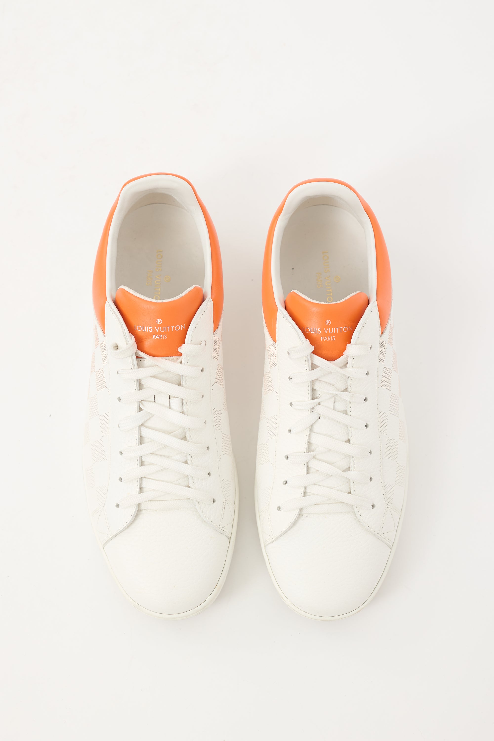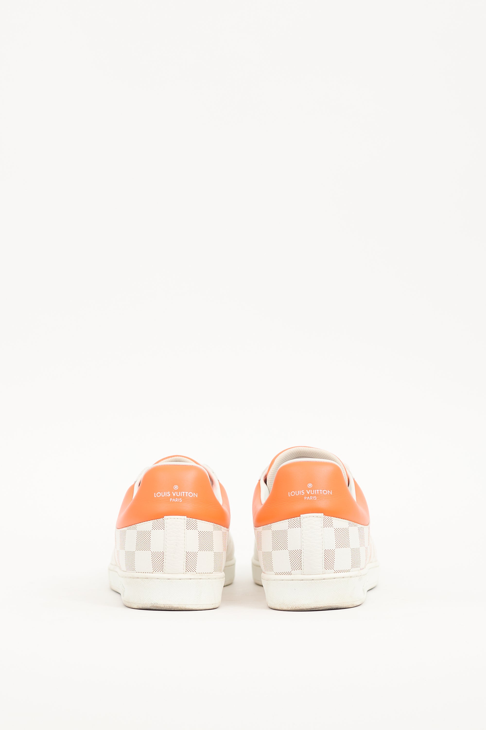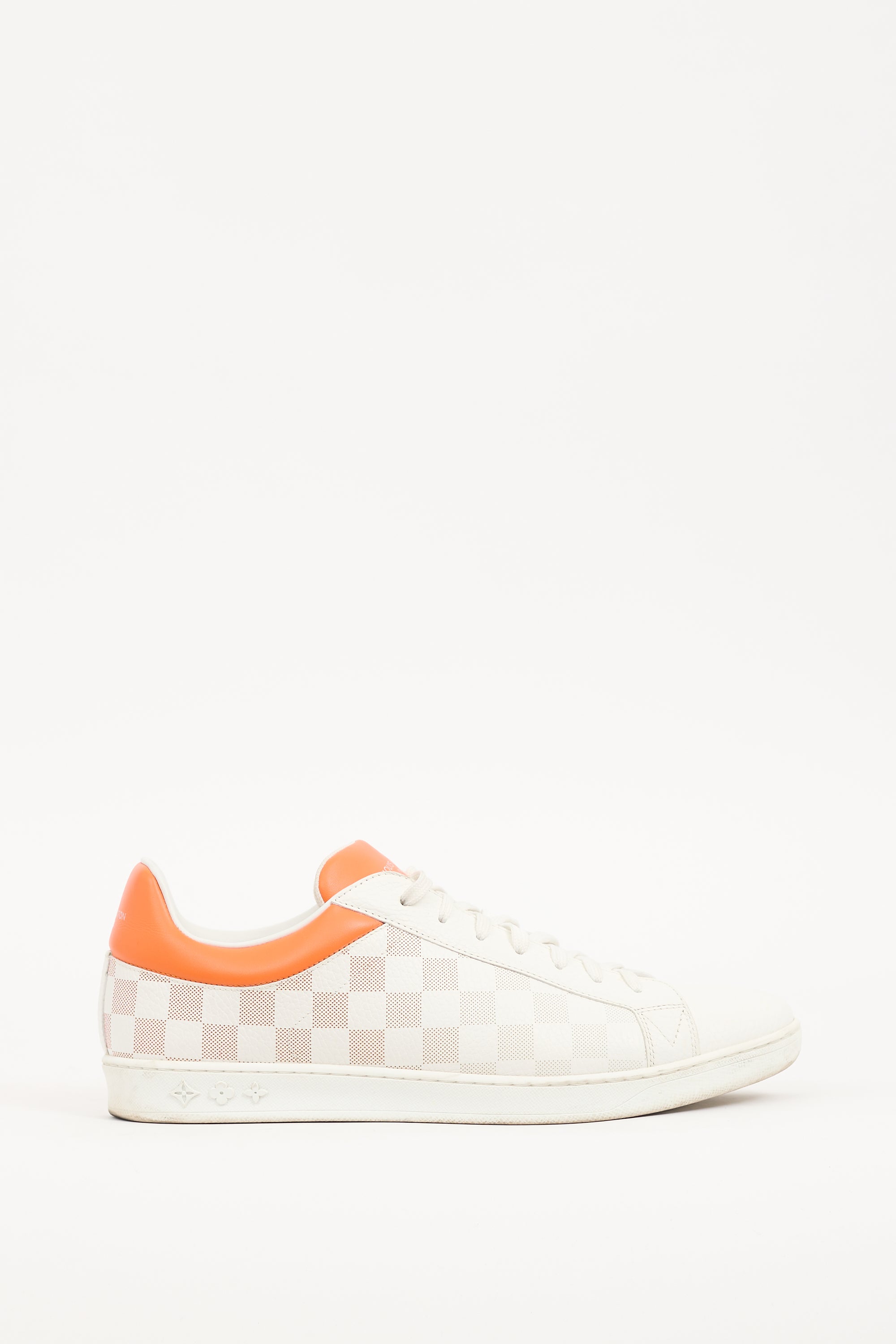 Pre-owned Louis Vuitton white and orange leather Luxembourg sneakers featuring gradient damier print throughout upper, lace up vamp, solid orange leather collar padding, printed logo at tongue and counter, and white rubber sole with embossed logos at outer counter. Comes with original dust bags.