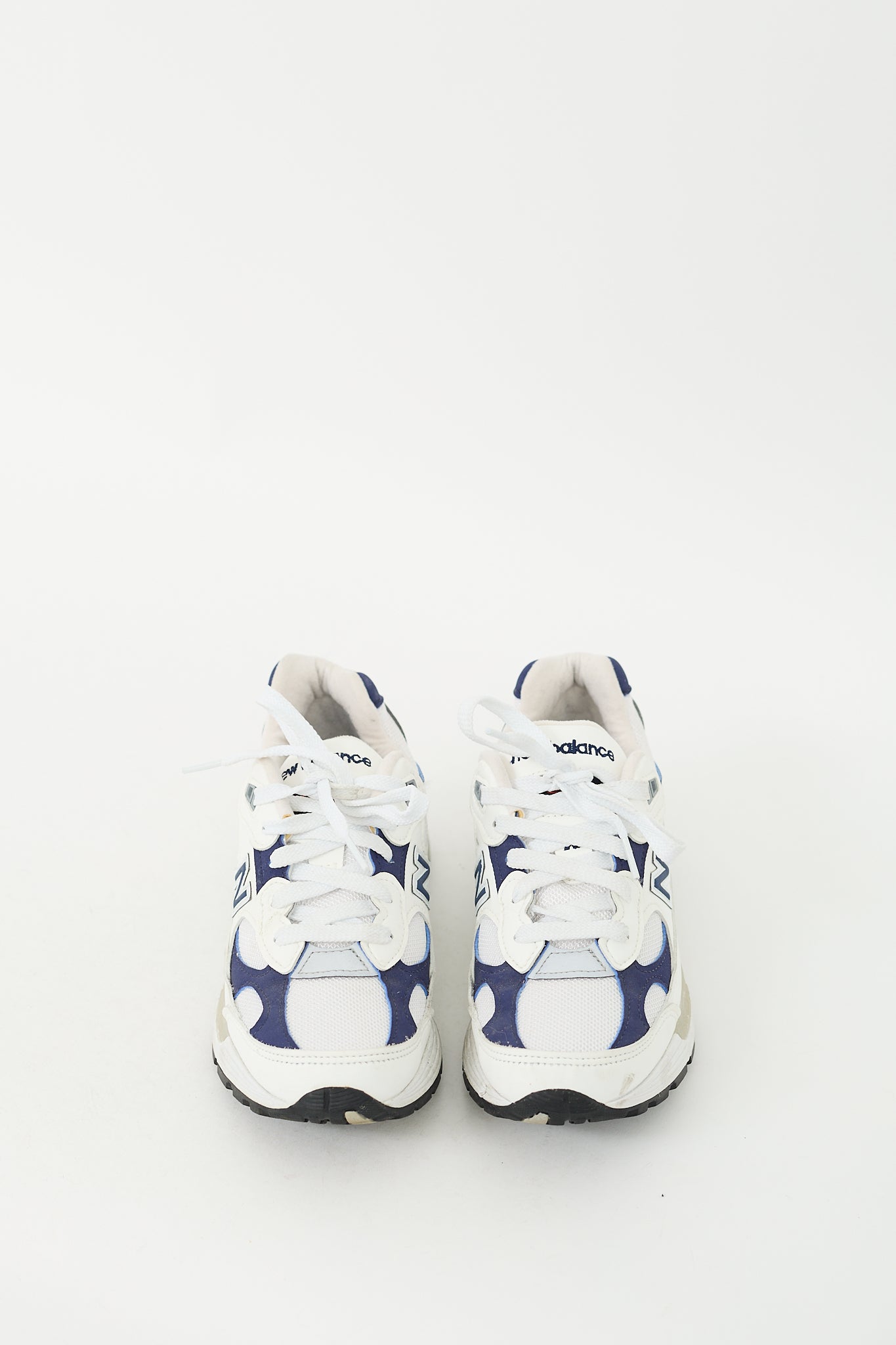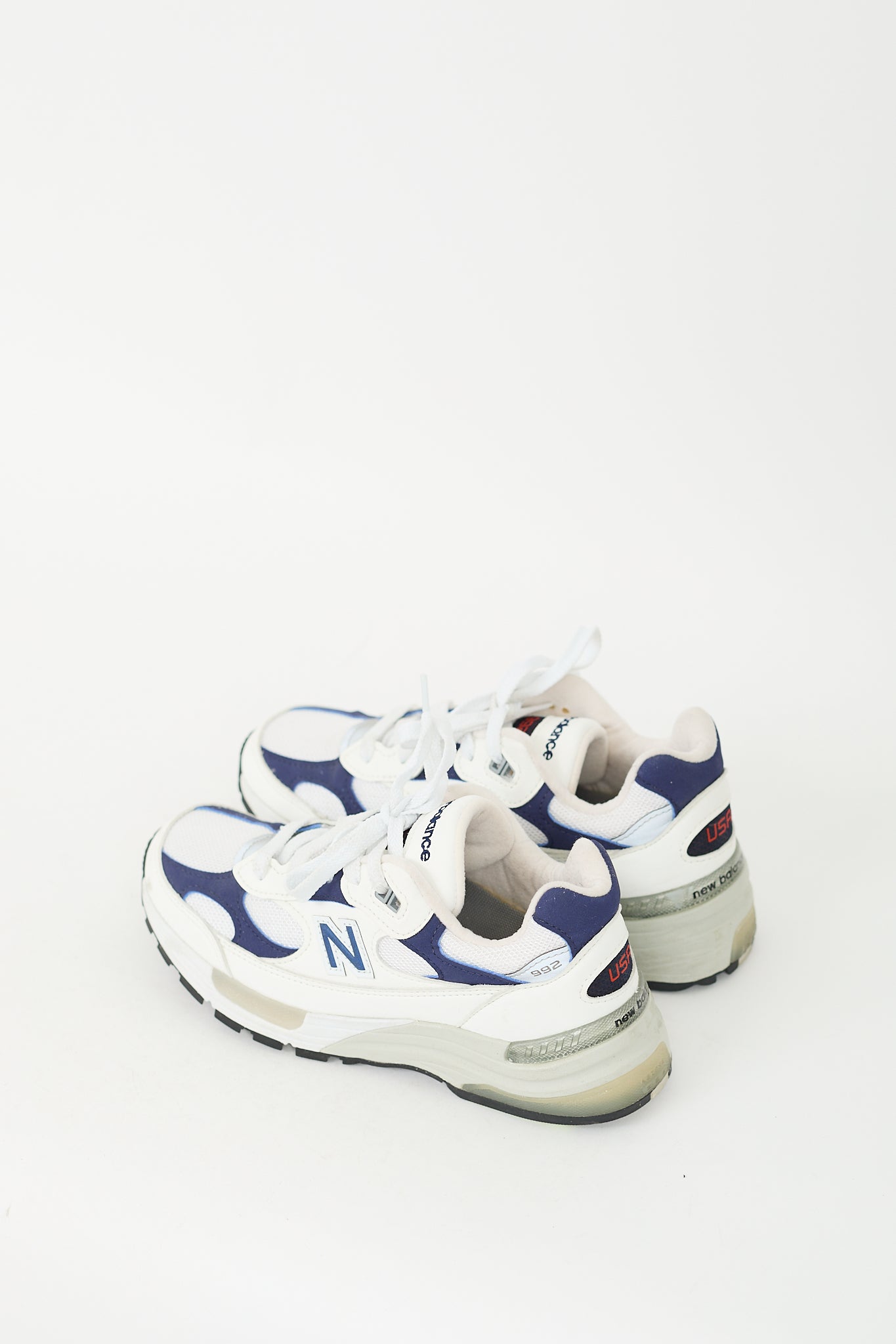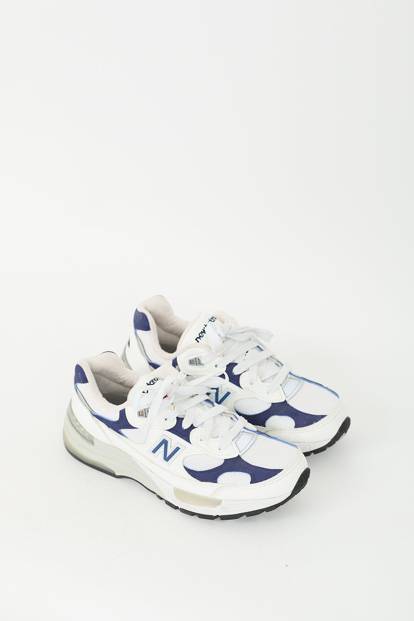 Pre-owned New Balance white 992 suede sneakers featuring rounded toe, lace up front, navy leather panelled upper, logo at sides, and rubber sole.