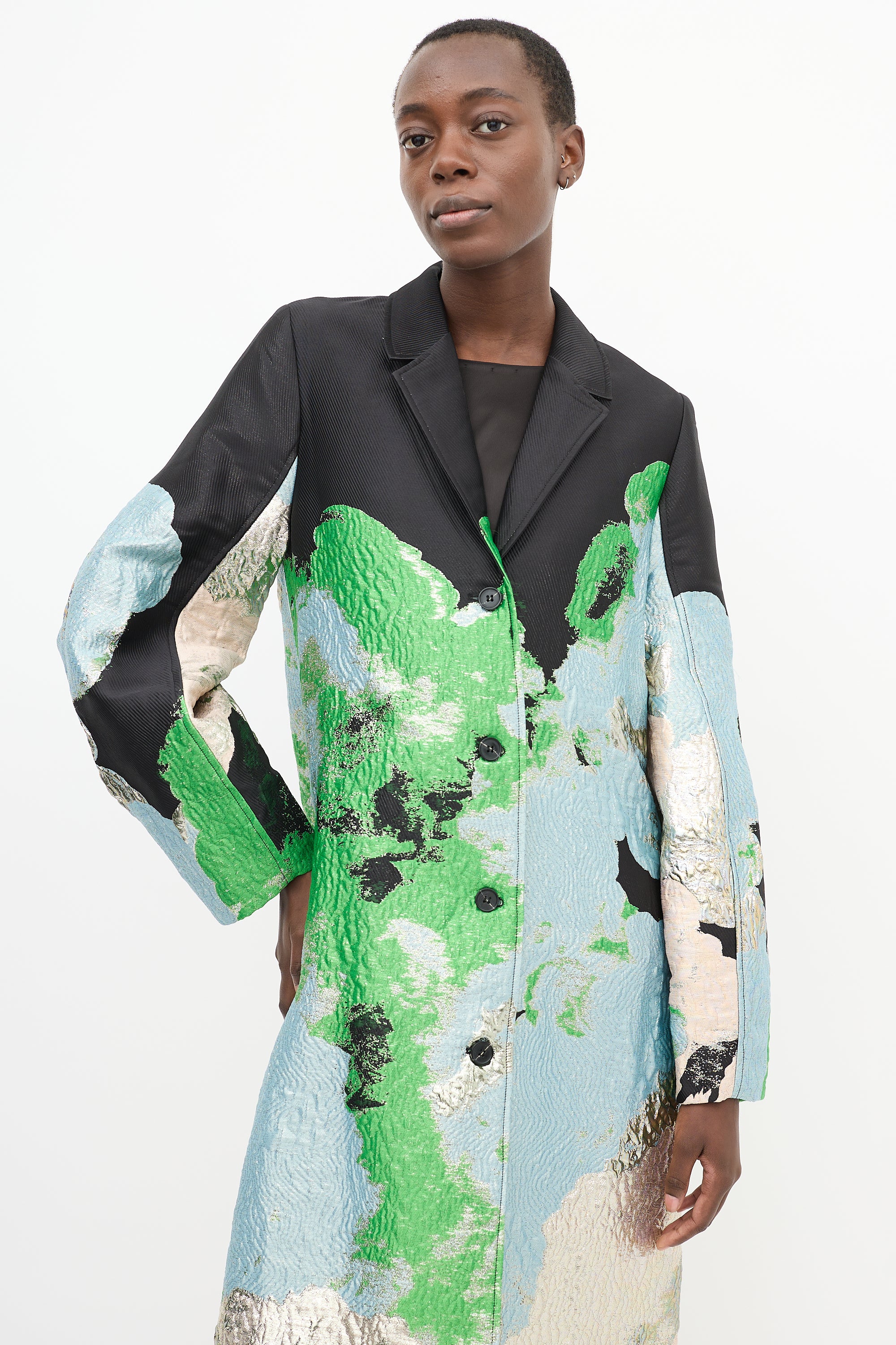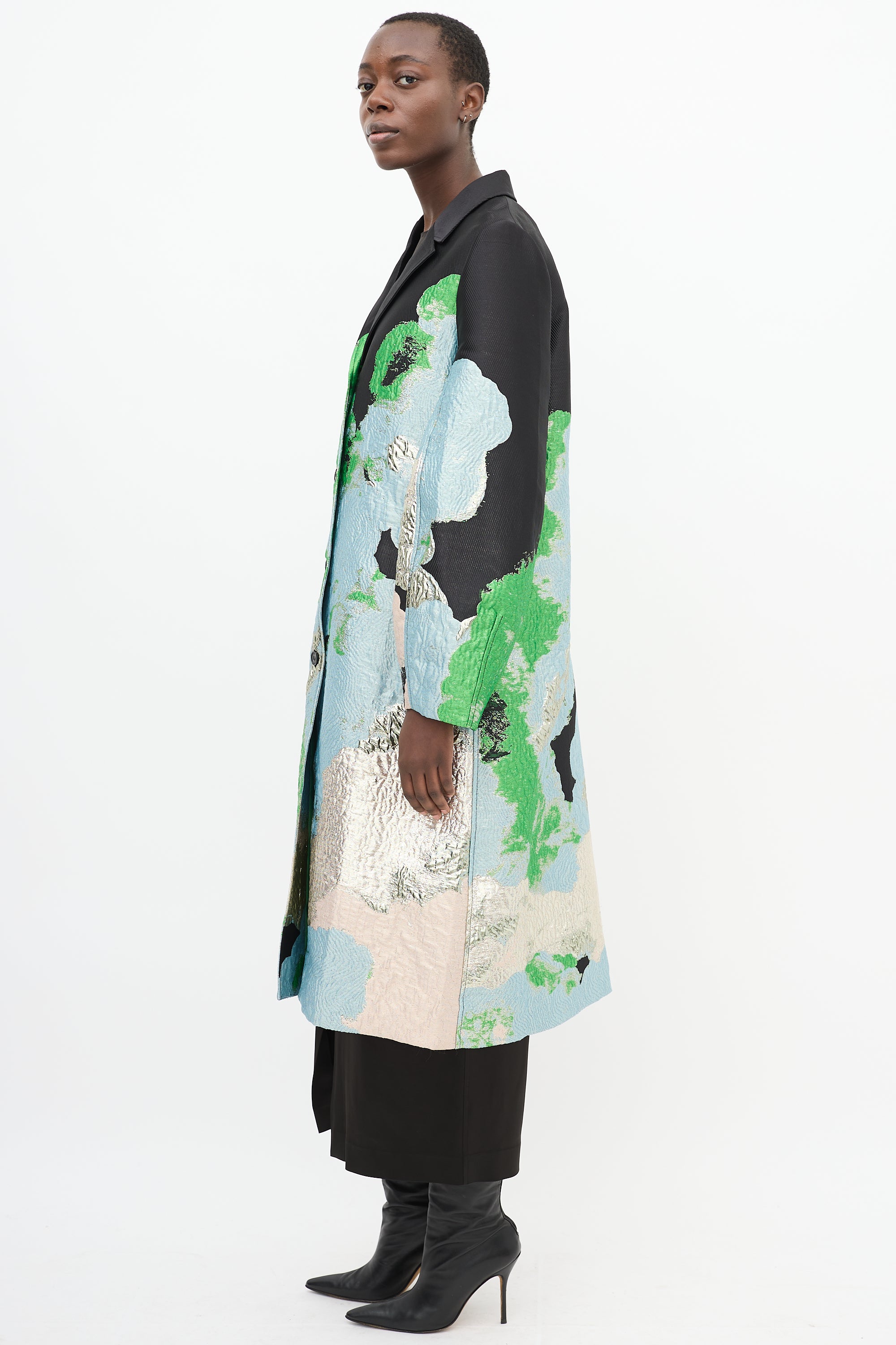 Pre-owned Stine Goya black and multicolour Cornelia long coat featuring a notched collar, button up front closure, abstract jacquard with silver tone metallic threading throughout, in seam pockets, back vent, and long balloon sleeves. Lined.