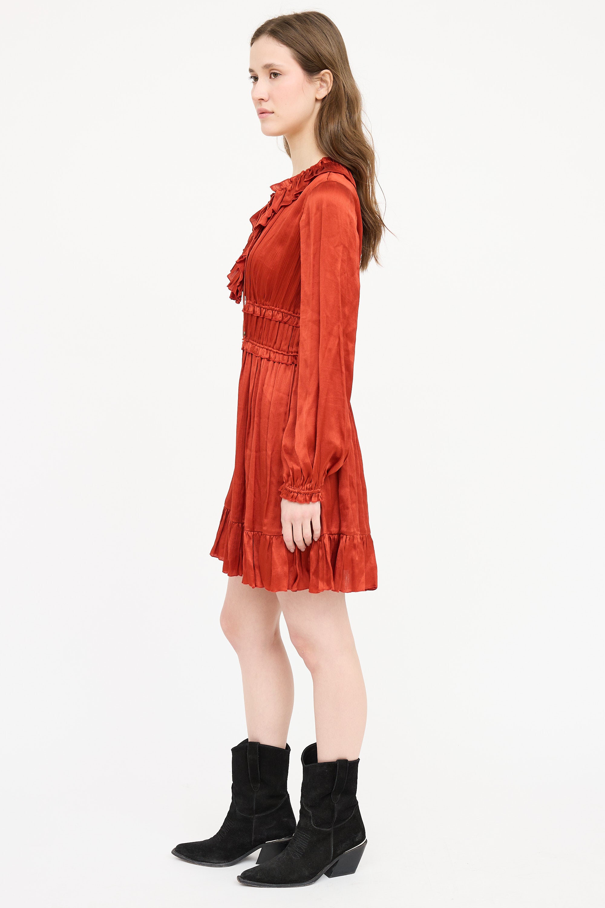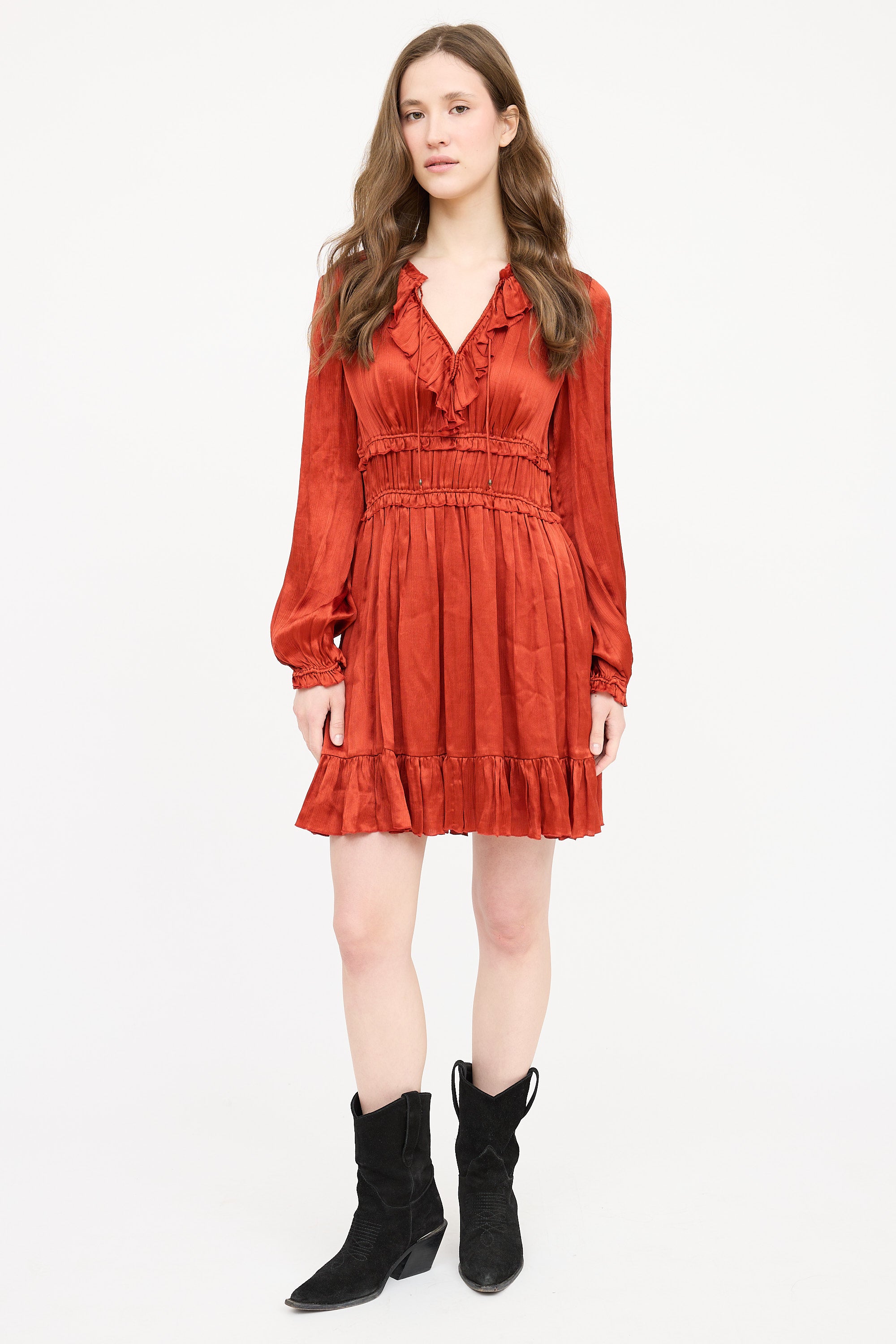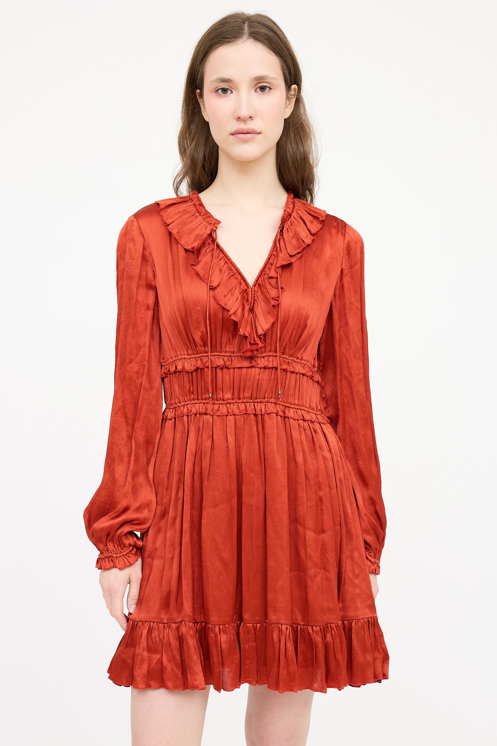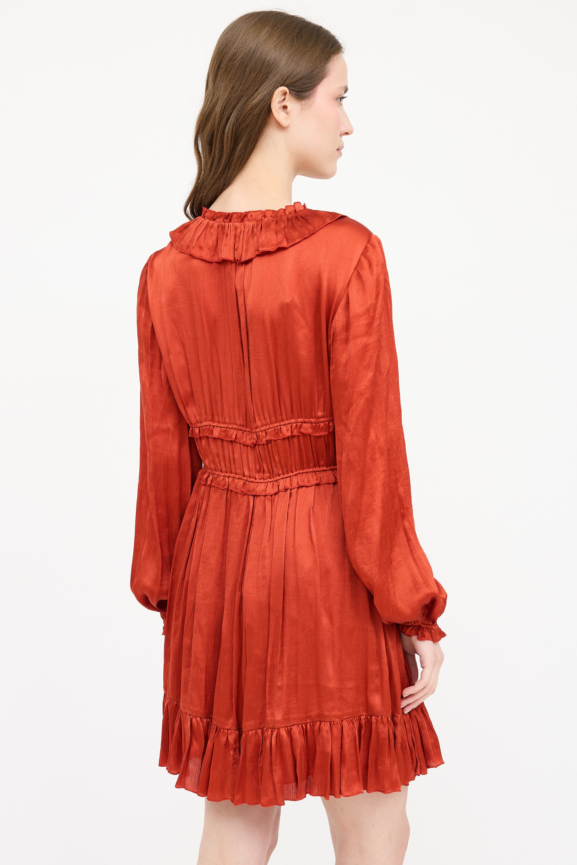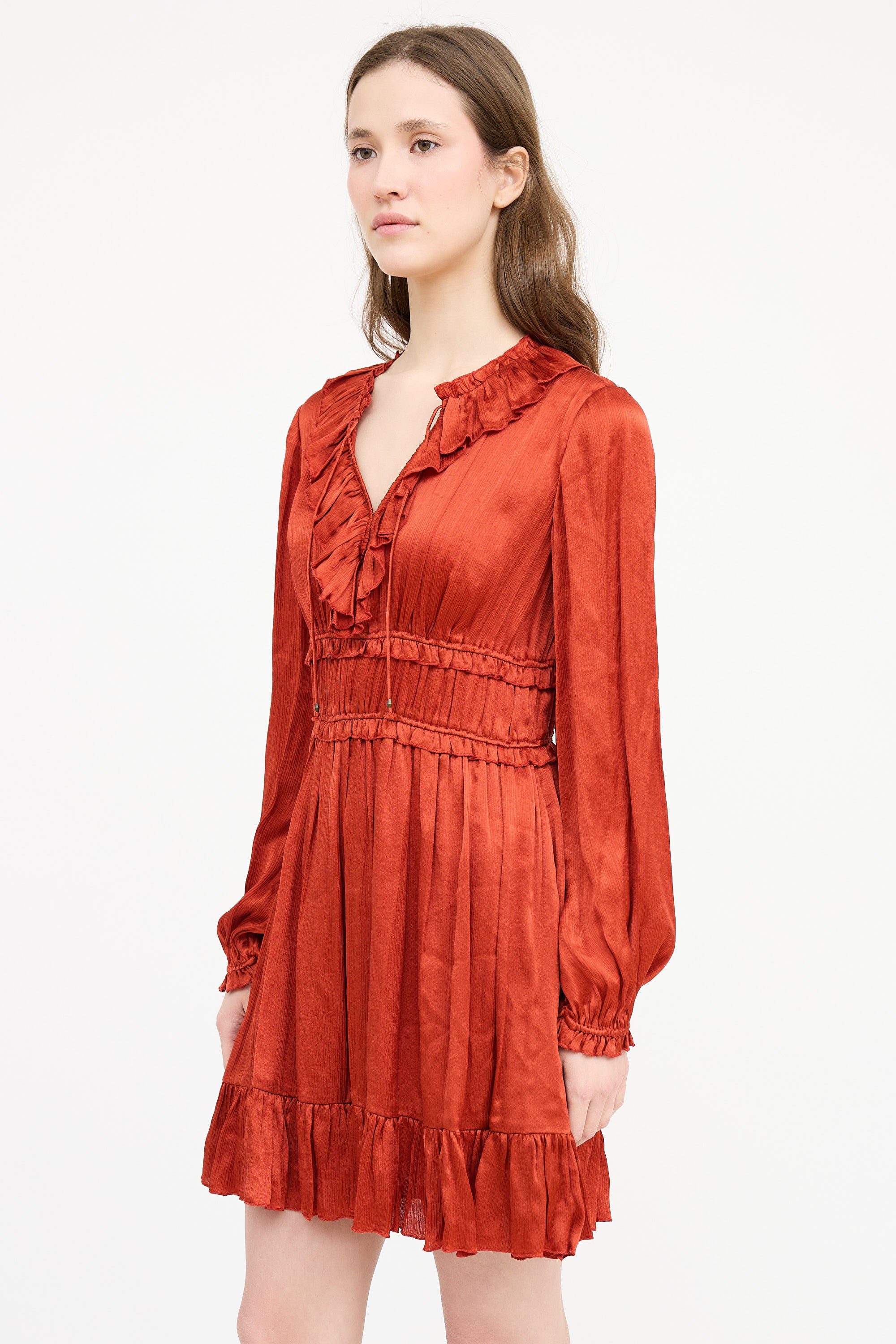 Pre-owned Ulla Johnson red silk long sleeve mini dress featuring V neck with tassle details, ribbed texture through out, ruffled trims and elastic cuff on arms. Lined at skirt.