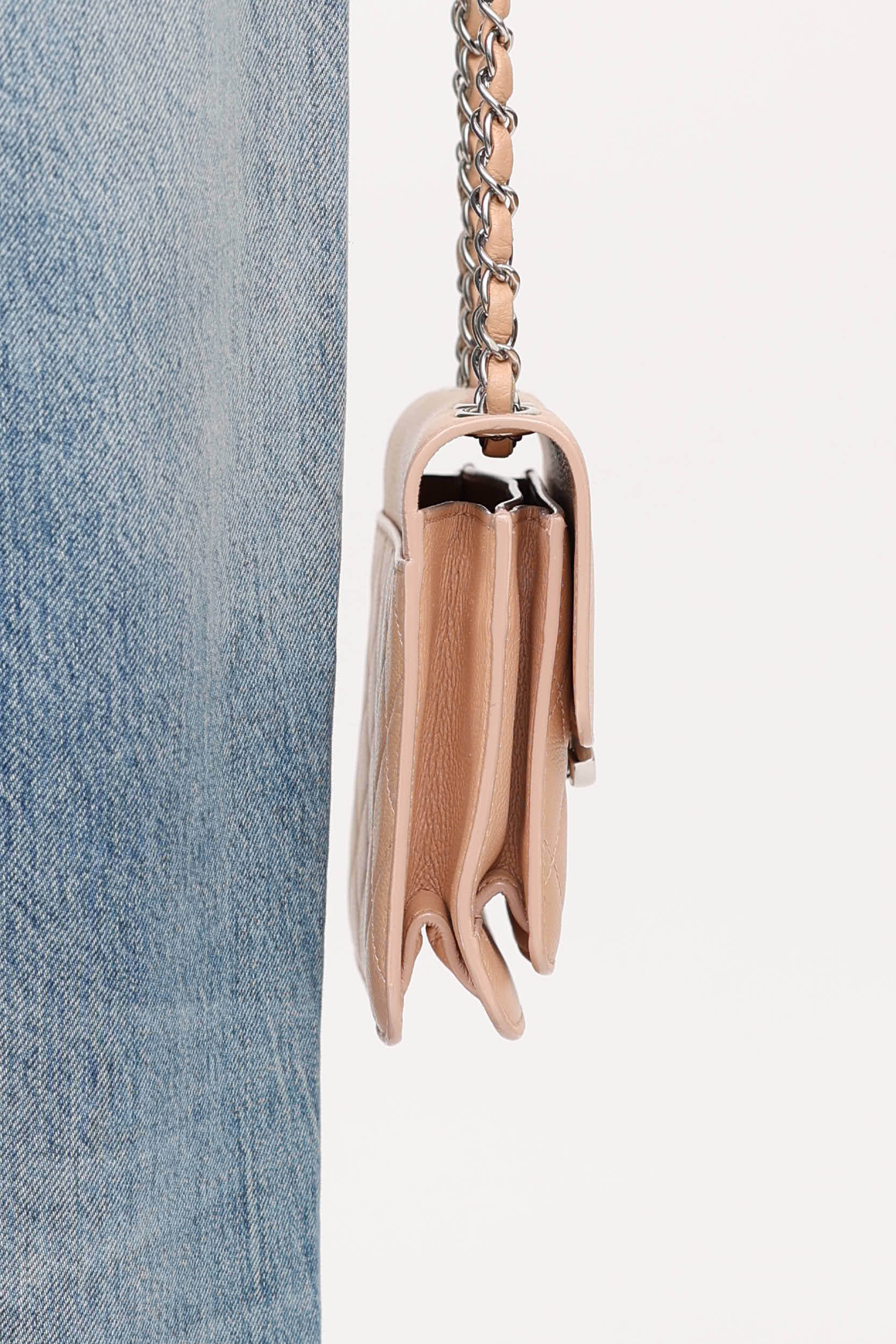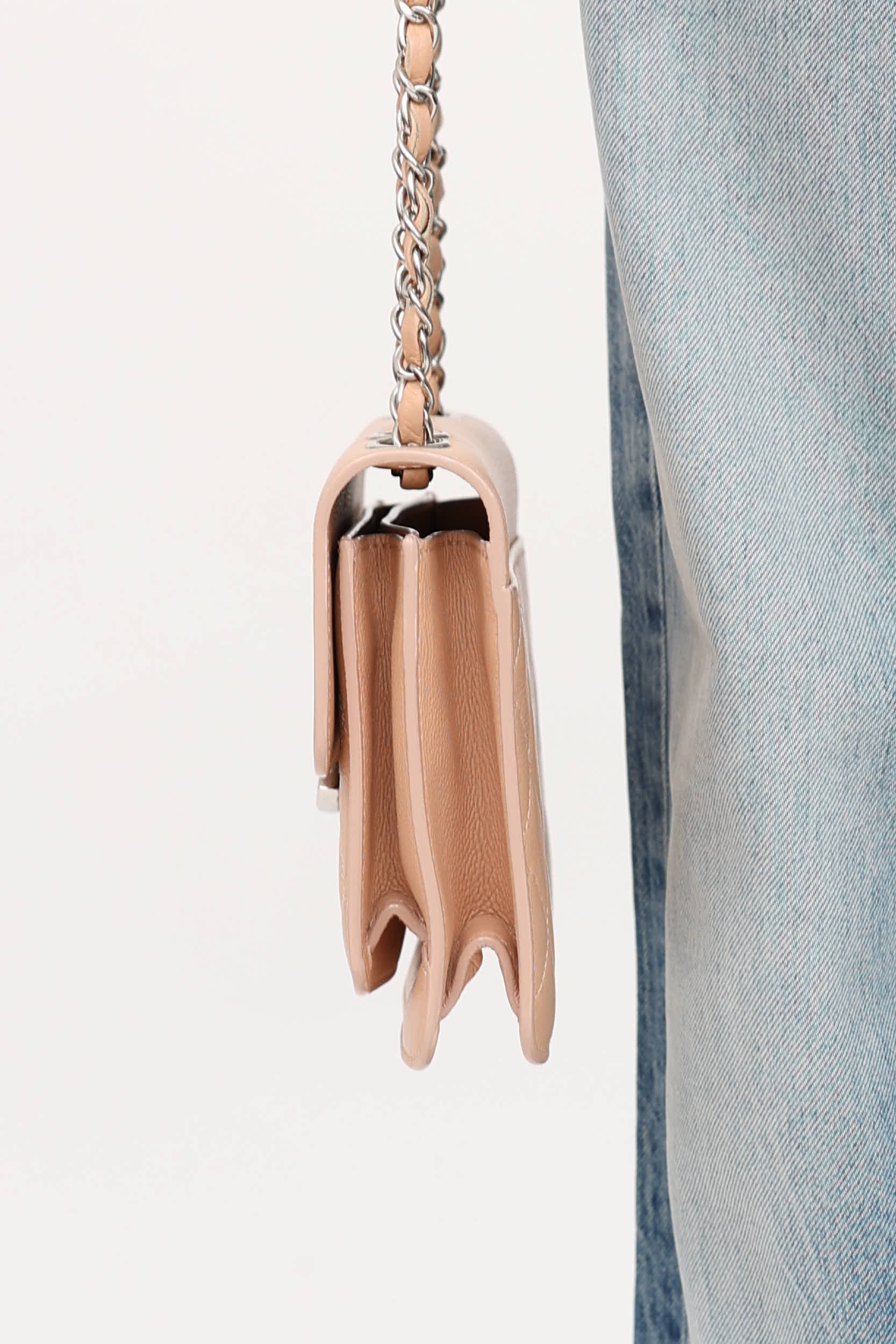 Pre-owned Chanel 24 series beige mini Caviar box top flap bag featuring dual sliding braided leather and chain shoulder strap, quilted upper, silver tone hardware, top flap with CC push lock closure, two main compartments, and one slip pocket. From the 2017-2018 Collection by Karl Lagerfeld.