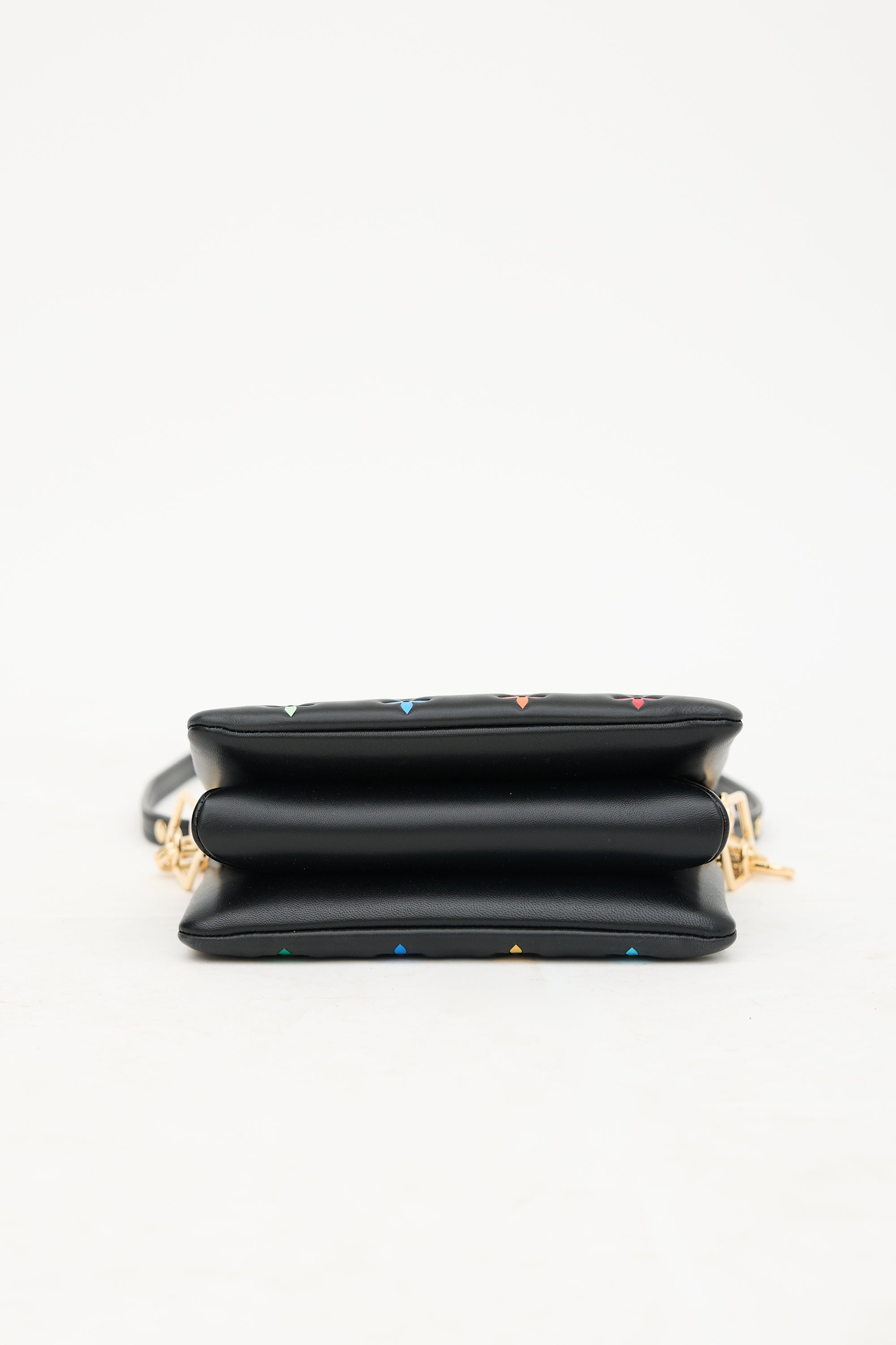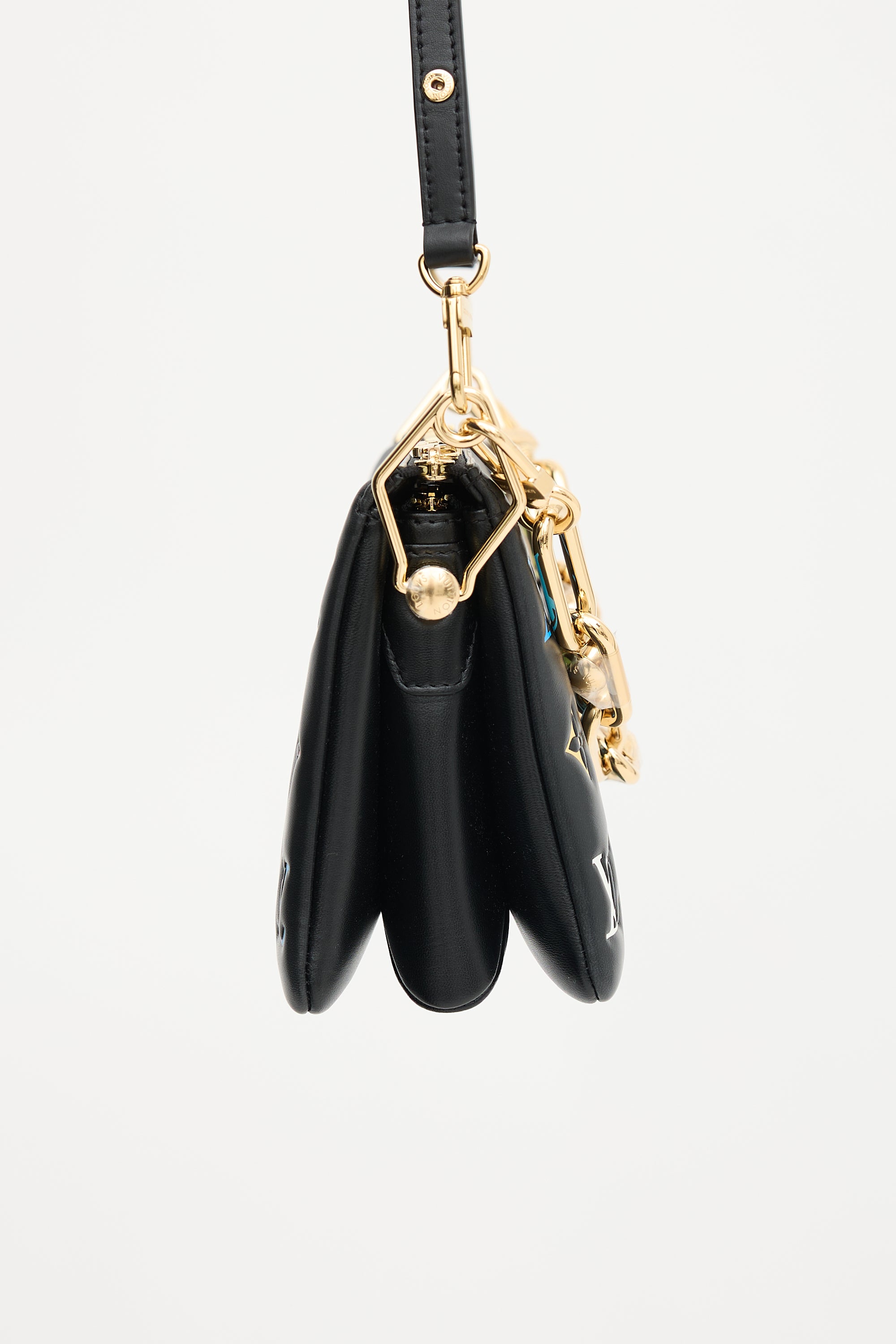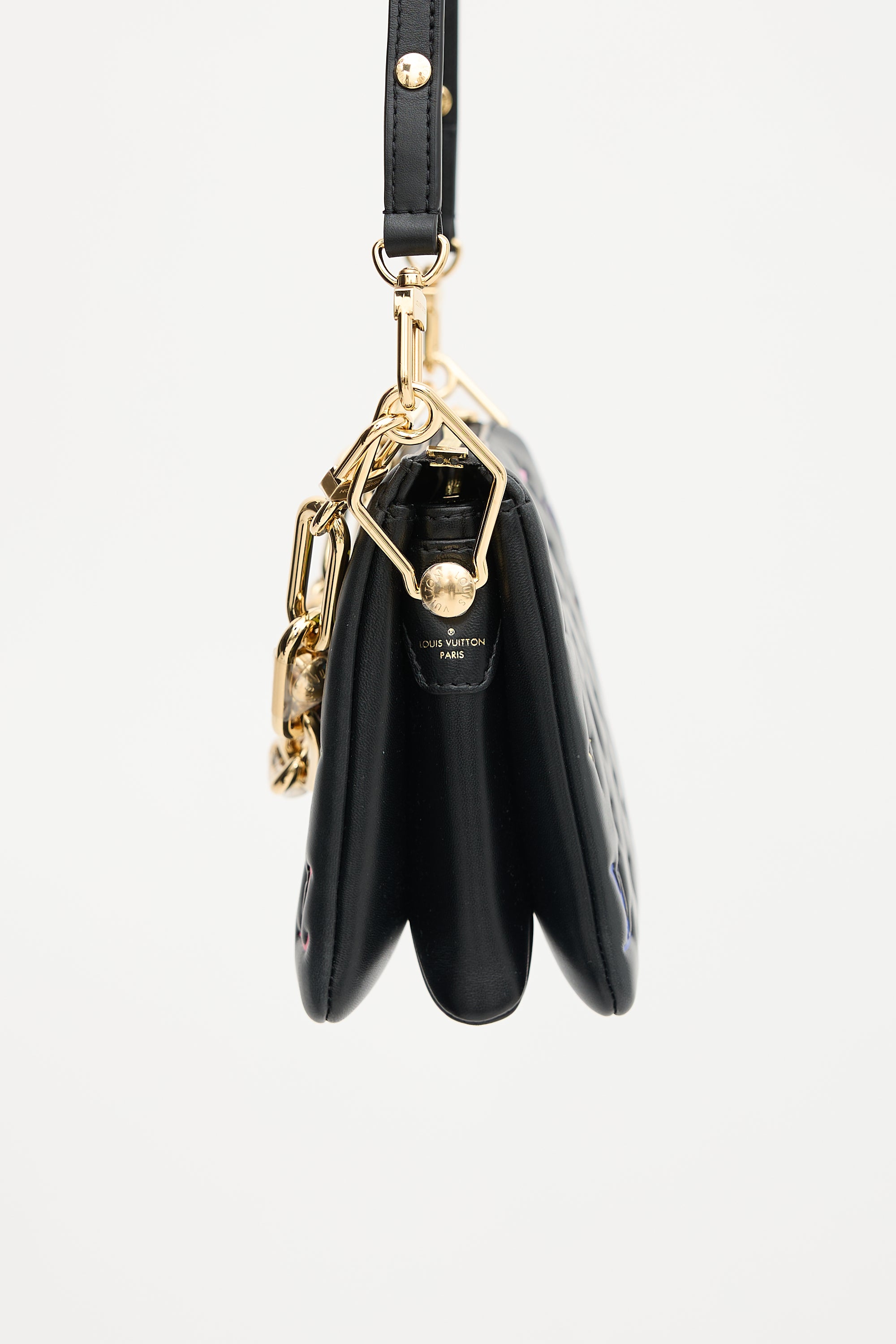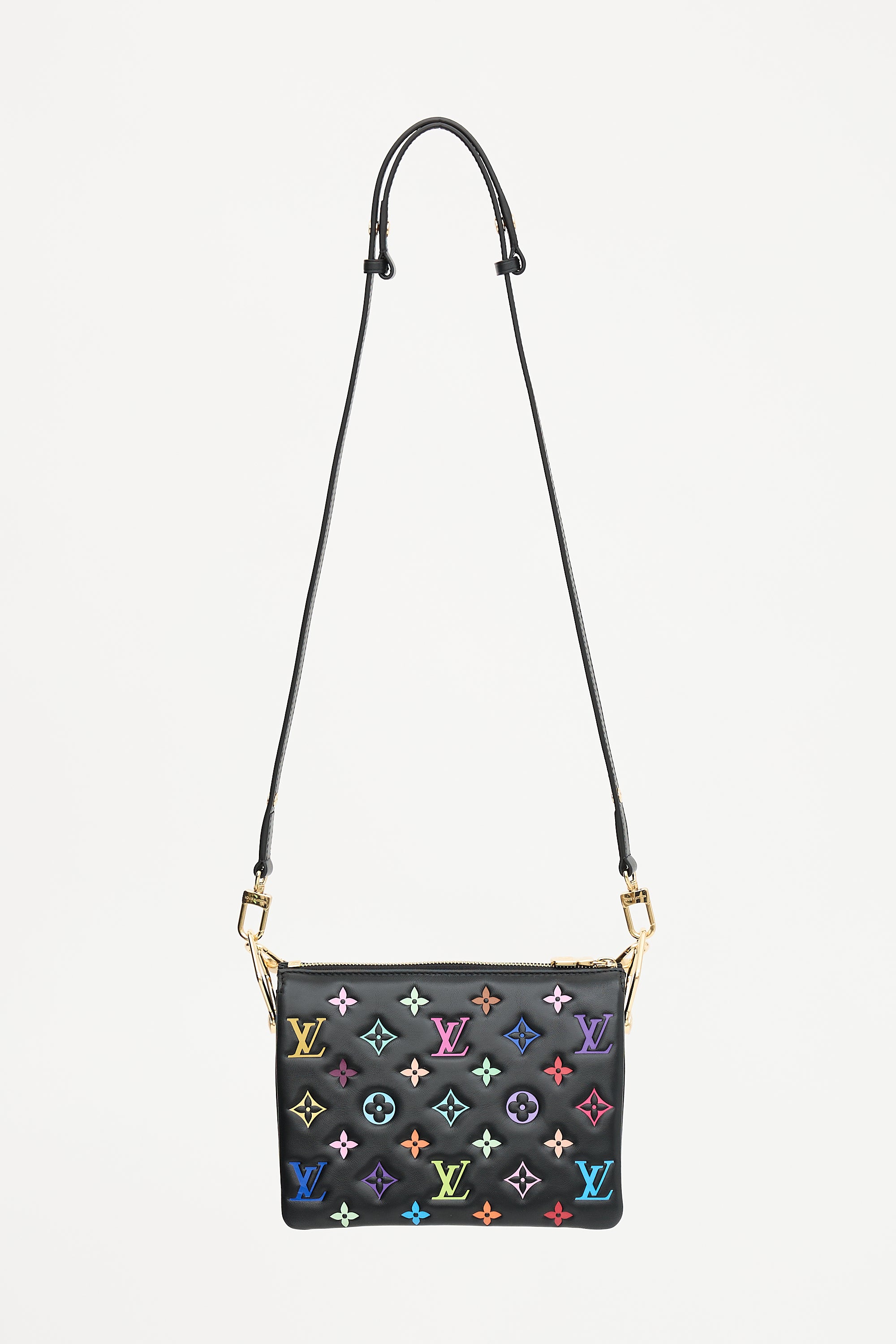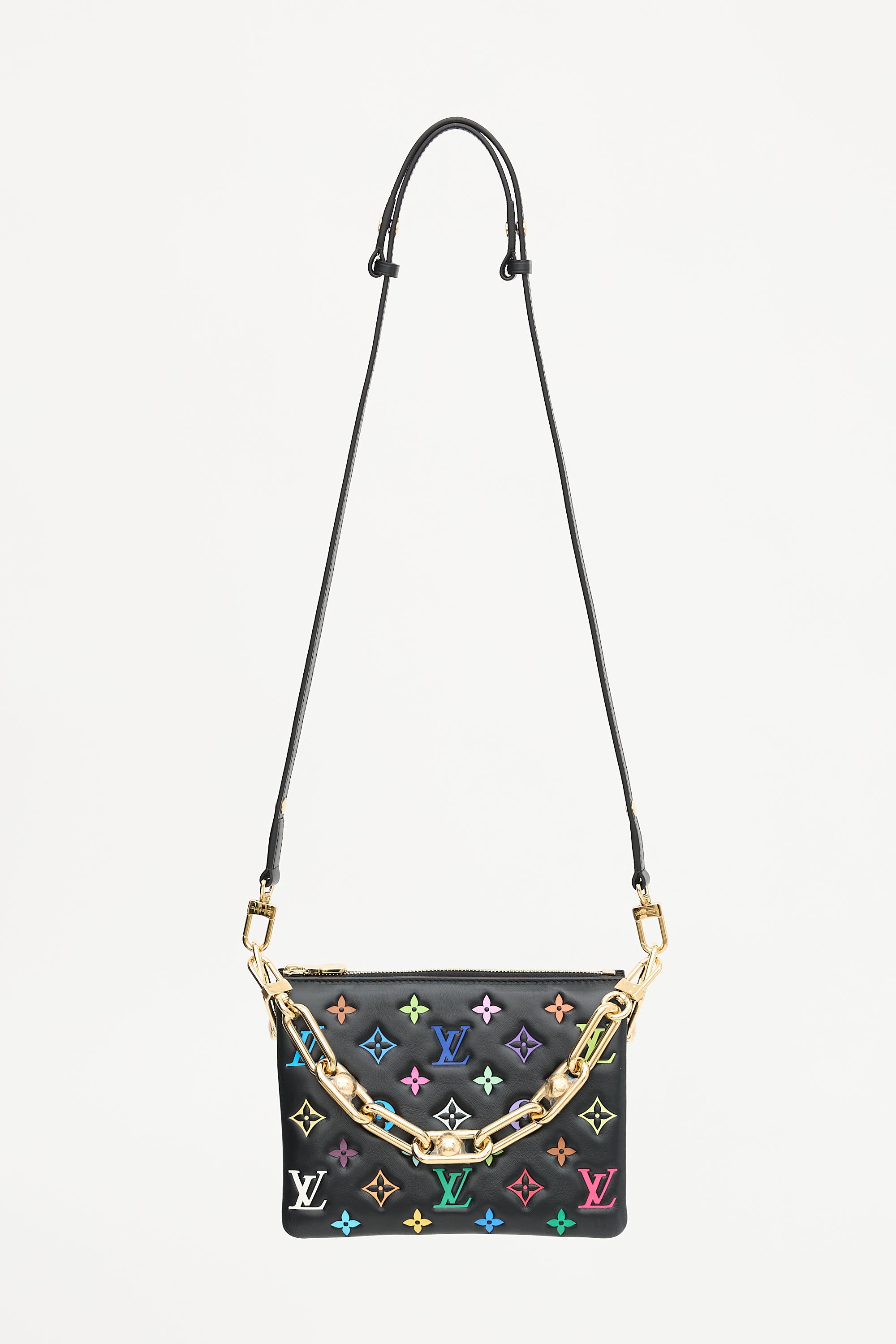 Pre-owned Louis Vuitton X Takashi Murakami 20th Anniversary Celebration black and multicolour leather Coussin BB shoulder bag featuring stamped monogram, gold tone hardware, removable shoulder strap, removable chain strap, top zip closure, and three lined main compartments with zipped middle compartment. Comes with original box, dust bag, and five stickers.