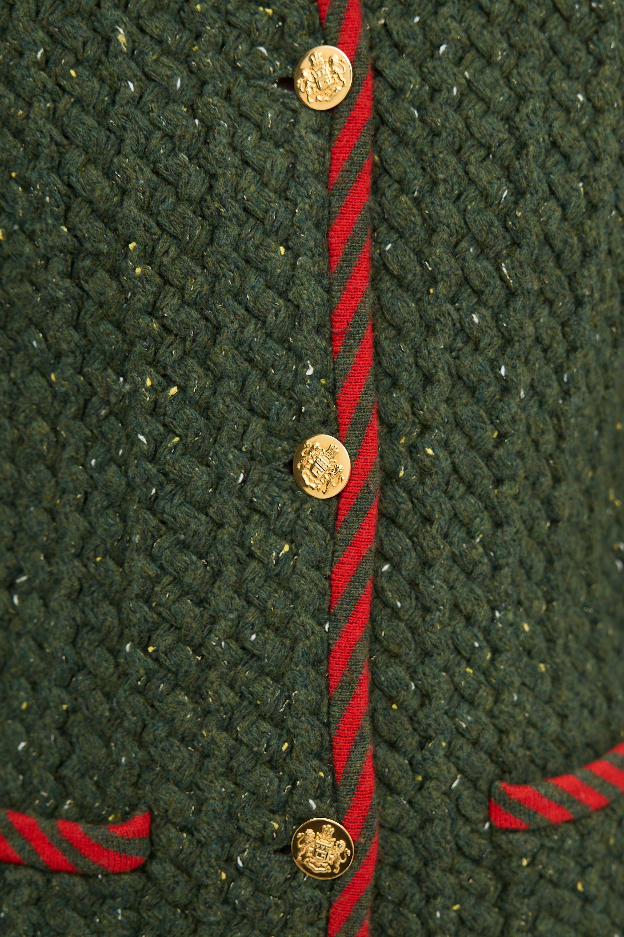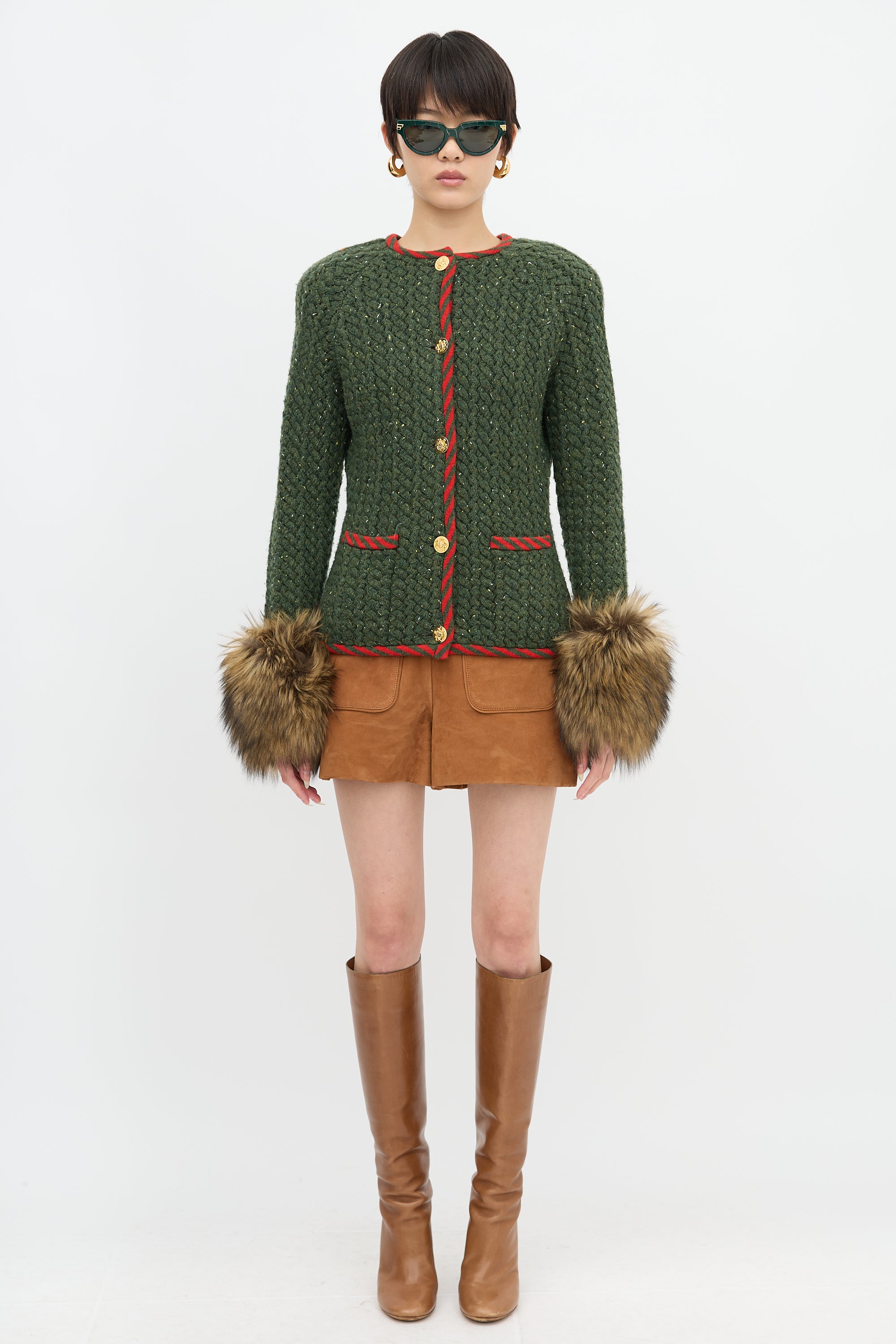Pre-owned Gucci green knit jacket featuring round neckline, gold tone front buttons with crest motif, two front patch pockets, padded shoulders, removable fur cuffs, and red striped trim at collar, placket, pocket edges, and hem.