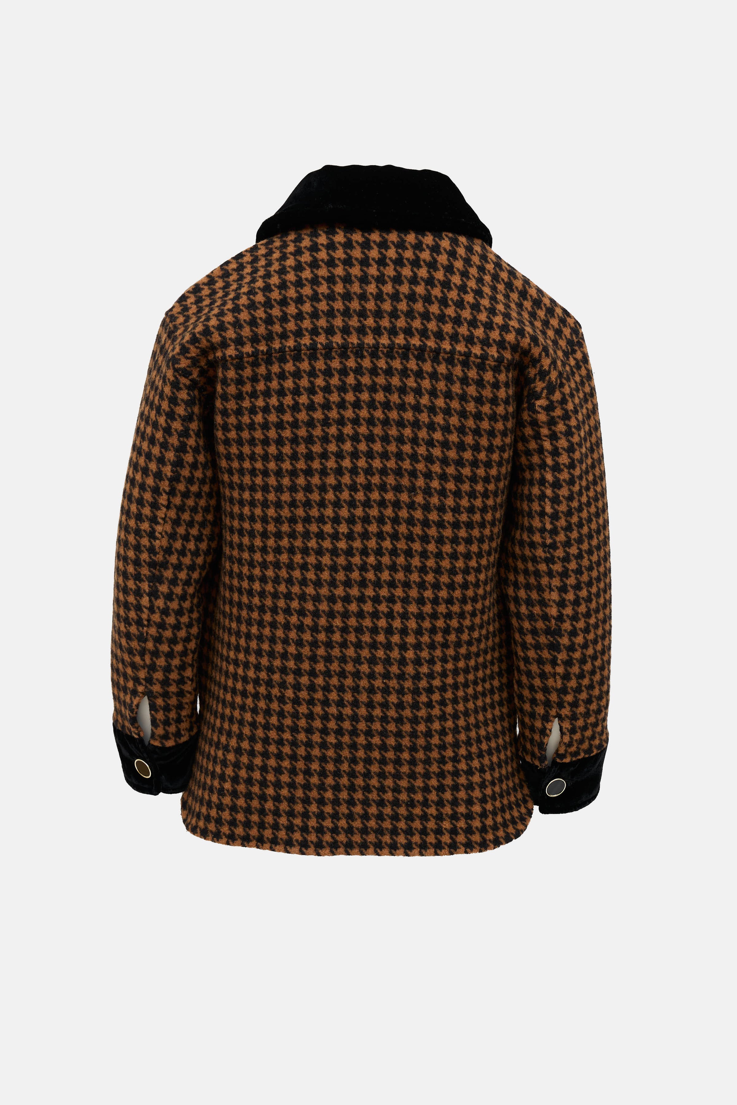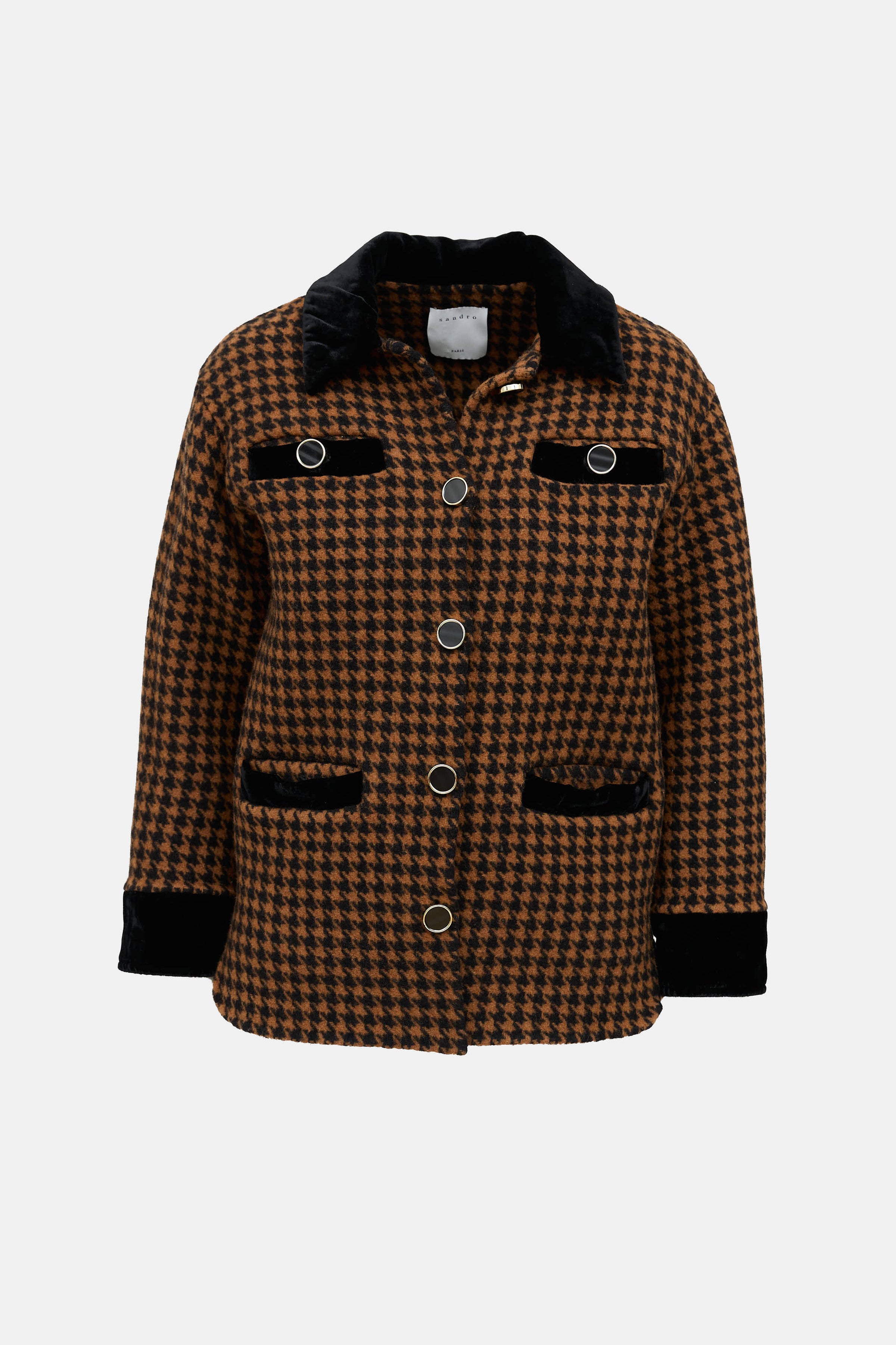 Pre-owned Sandro brown and black long sleeve jacket featuring pointed collar, welt pocket at chest, slit pockets at front, button front, buttoned cuffs, and velvet trim.