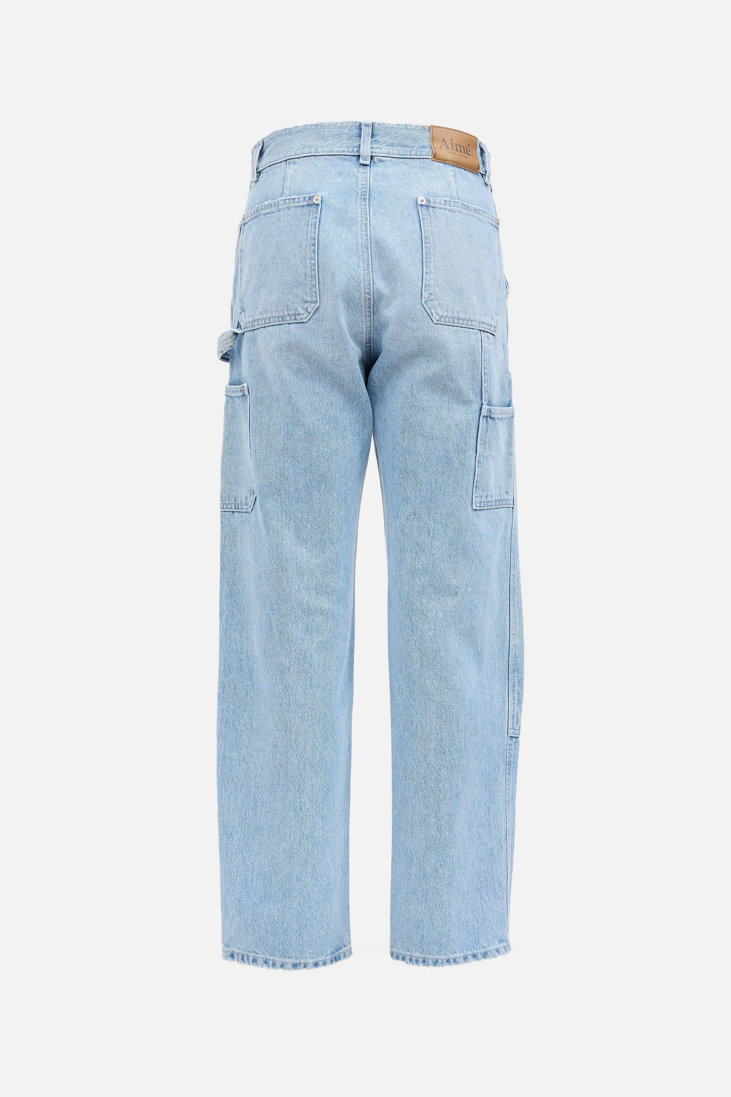 Pre-owned Aimé Leon Dore light wash carpenter jeans featuring belt loops, button fly, five pocket styling, slip pockets and loop at out seam, and leather logo patch at back.