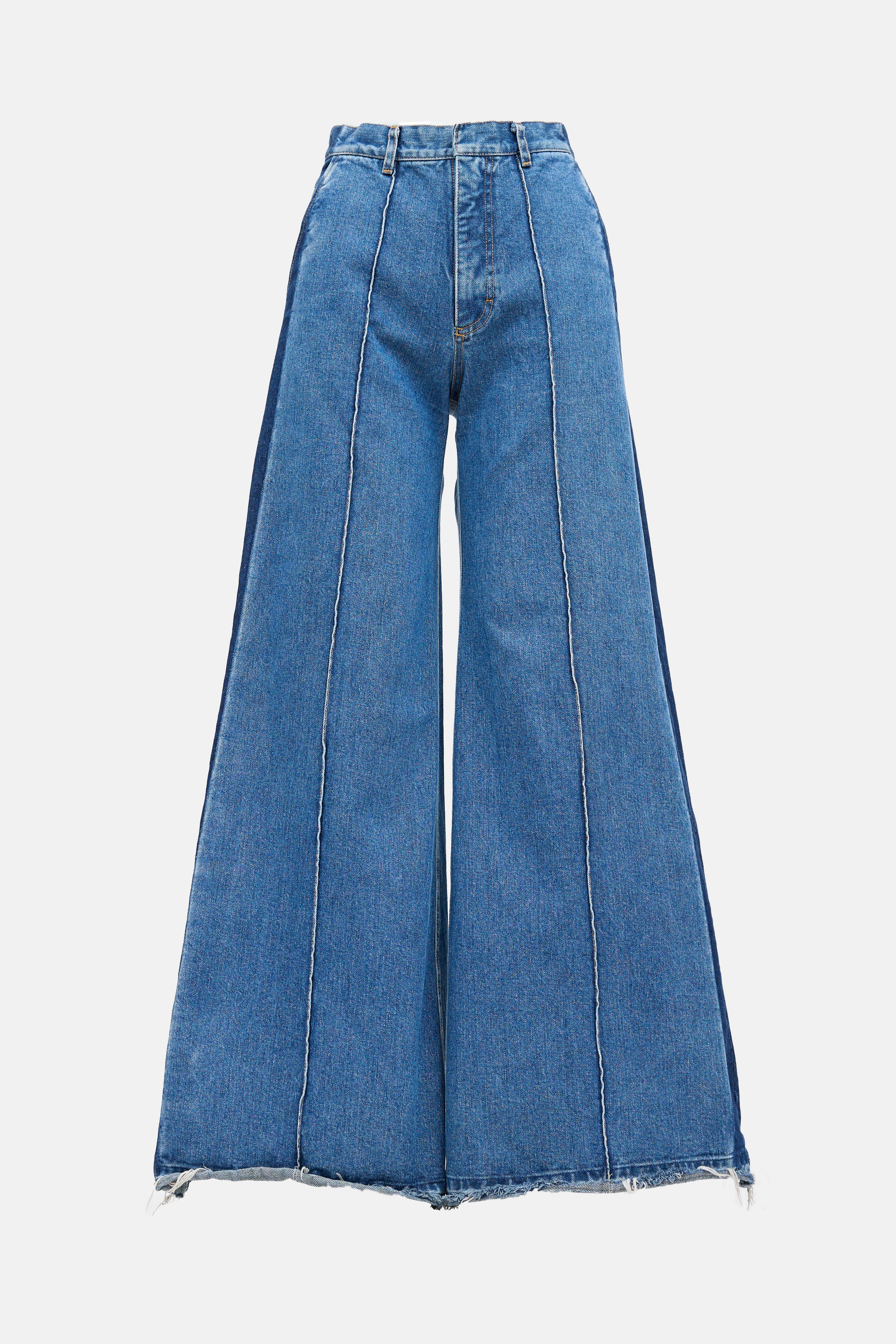 Pre-owned Ksenia Schnaider light wash blue jeans featuring belt loops, zip fly, flare wide leg, slit pockets at hip, dark wash panel at side, singular patch pocket at back, centre seam at front, contrast stitching, and distressed hem.