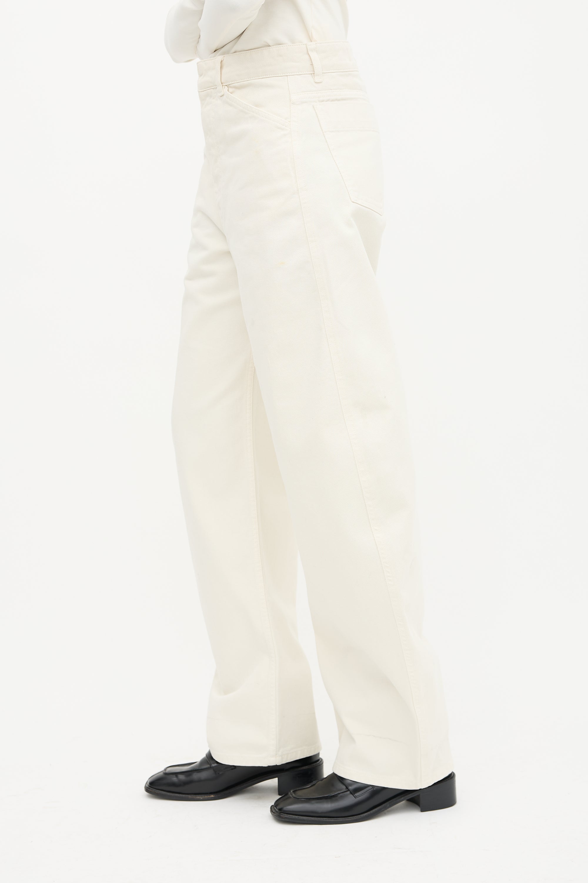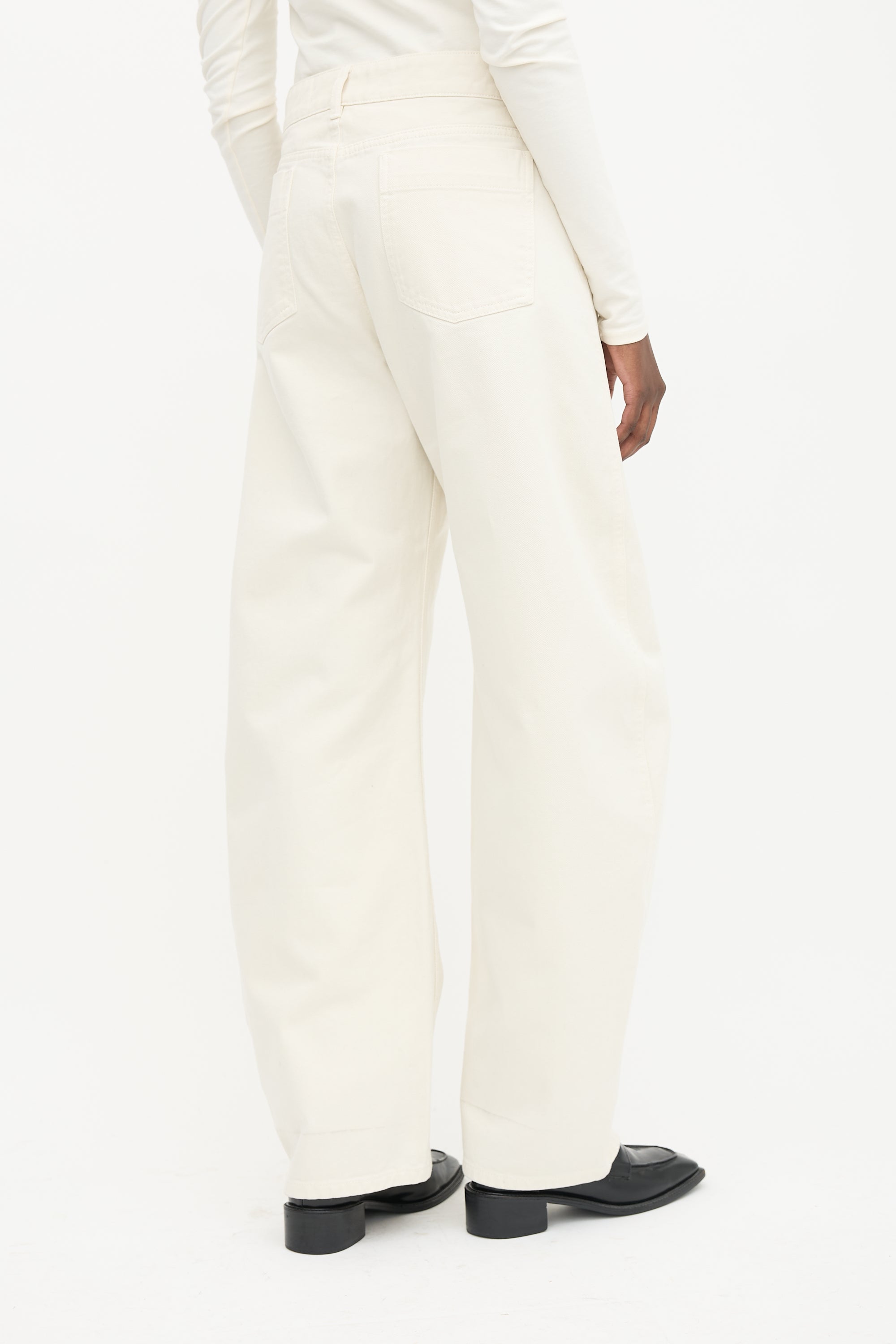 Pre-owned Lemaire cream jeans featuring high waist, barrel leg, four pocket styling, and zip fly.