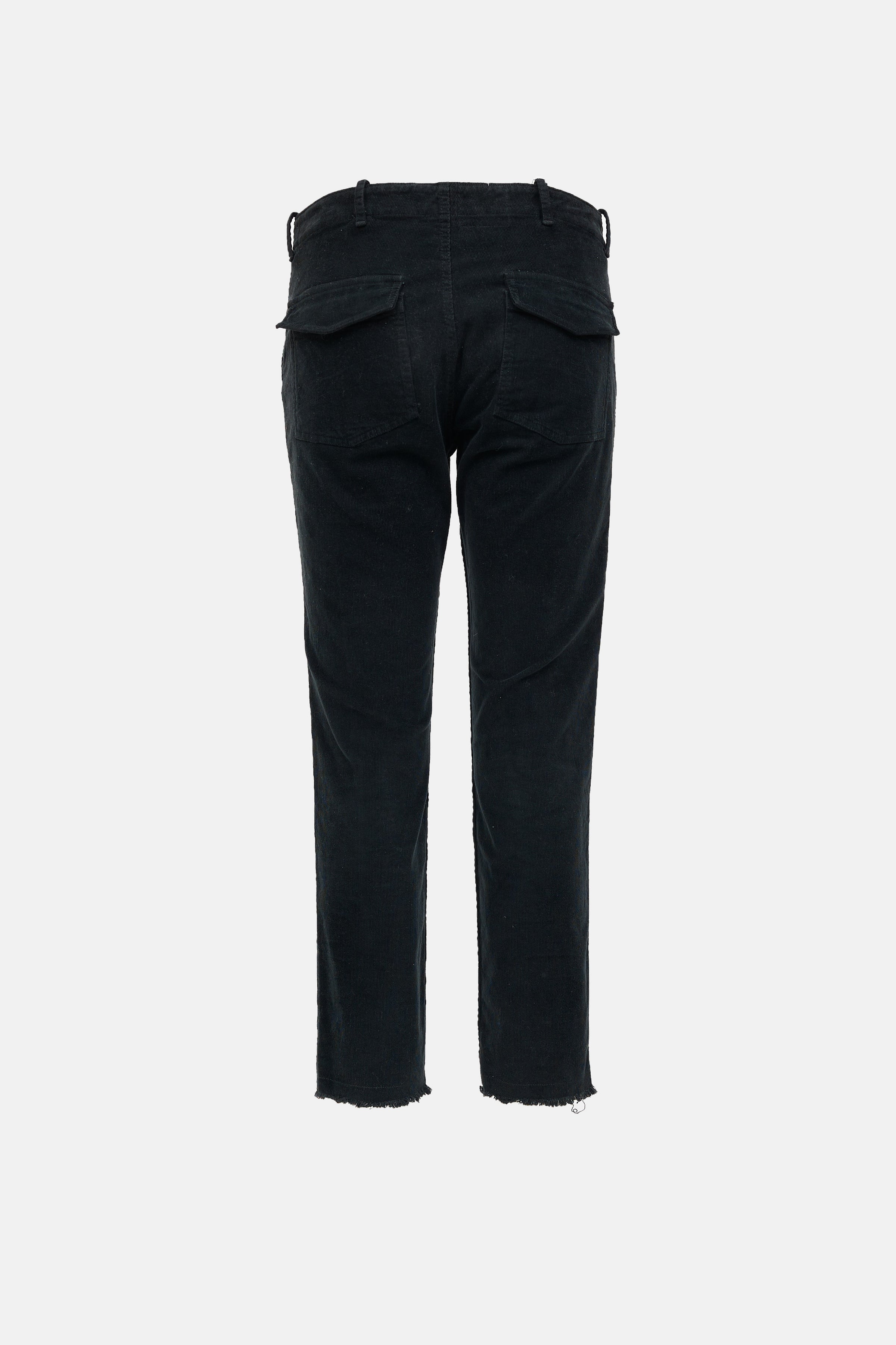 Pre-owned Nili Lotan black corduroy pant featuring belt loops, zip fly, slit pockets at hip, flap pockets at back, and frayed hem.