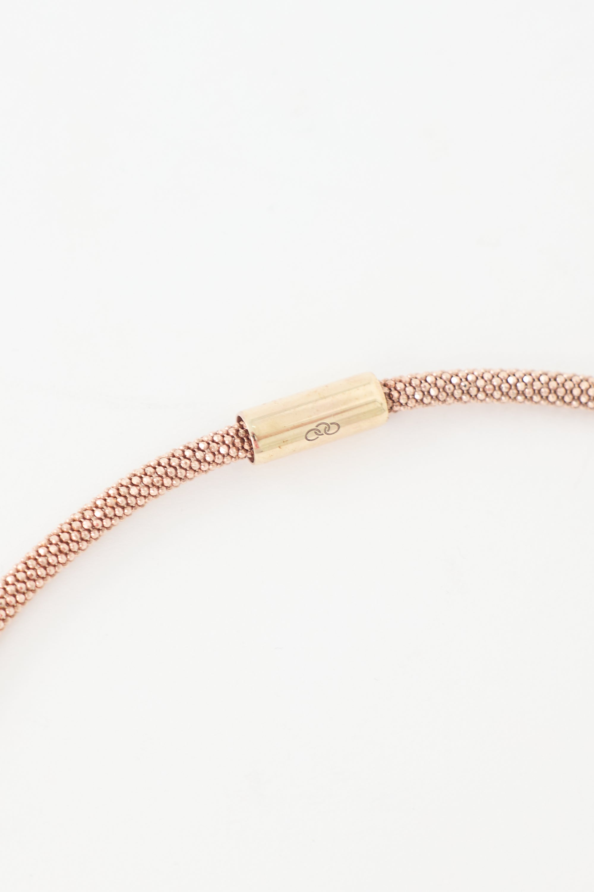 Pre-owned Links of London rose gold choker featuring effervescence band, magnetic closure, and crystal embellished square charm. Includes original dust bag.
