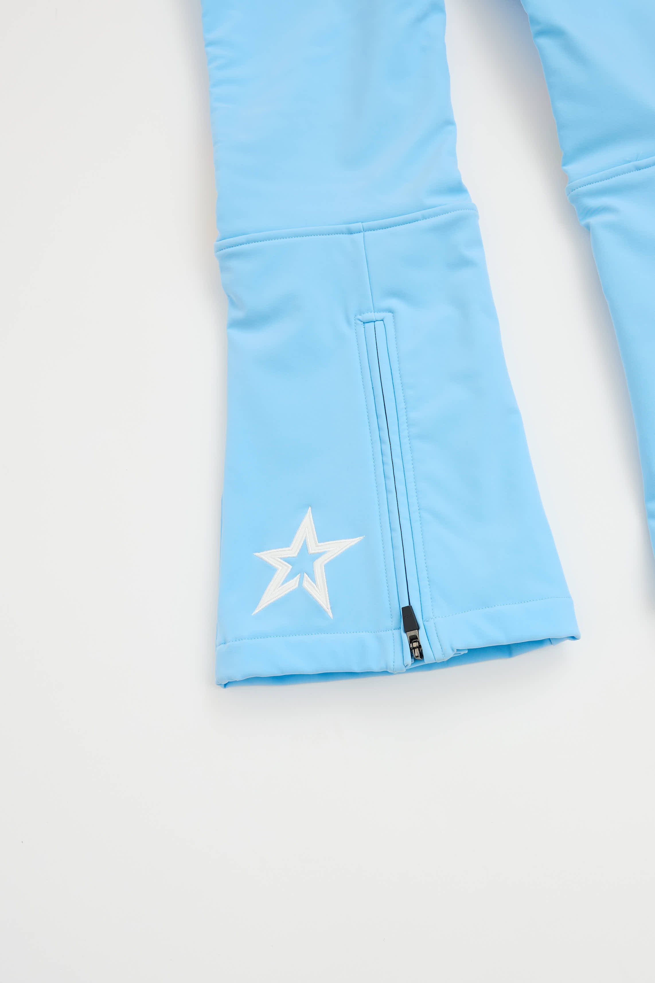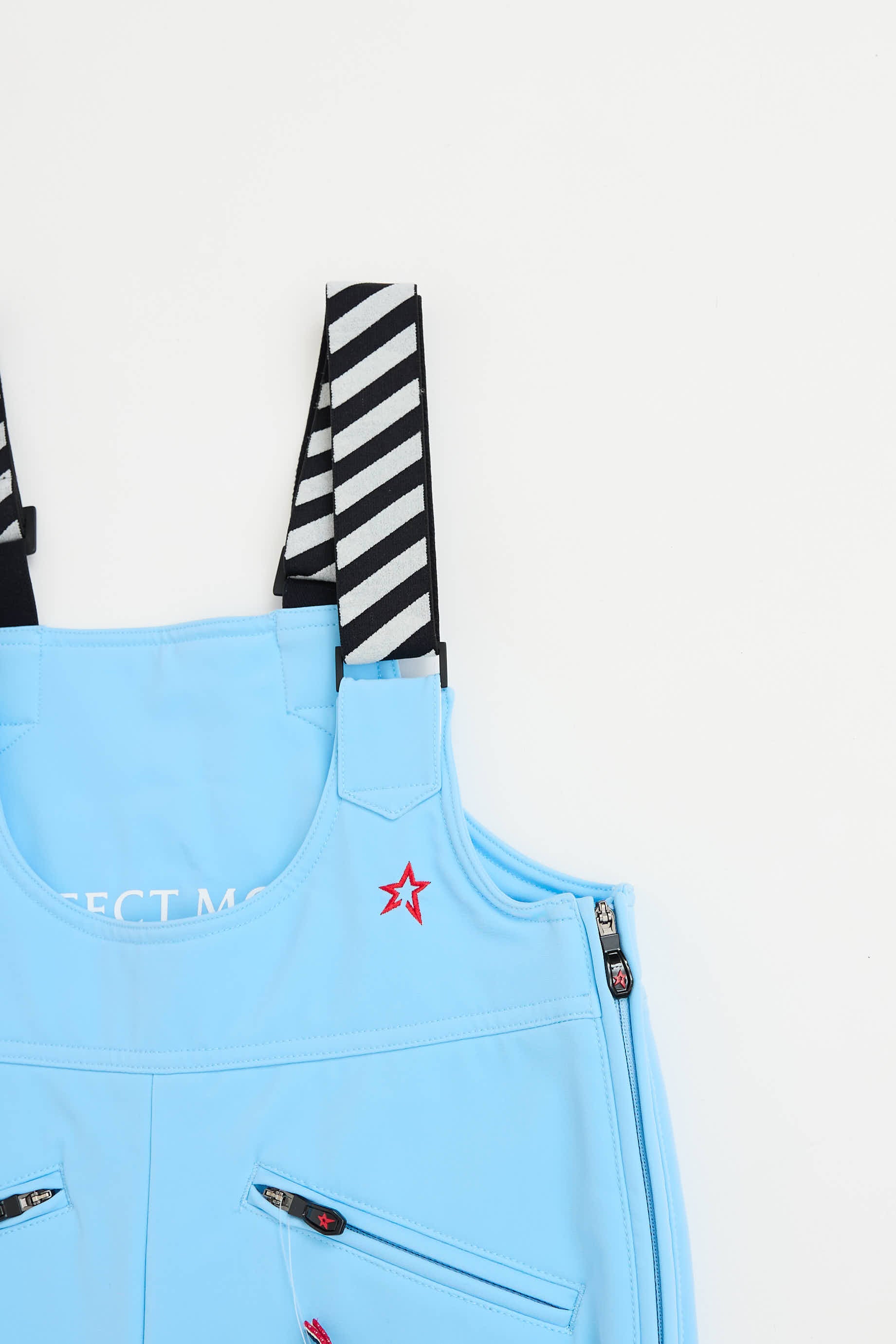 Pre-owned Perfect Moment blue and multicolour Isola racing ski pants featuring dual zip pockets at waist, padded knee with multicolour detailing, adjustable shoulder straps, boot gaiter, flared hem with star embroidery, and front zip closure. Lined.
