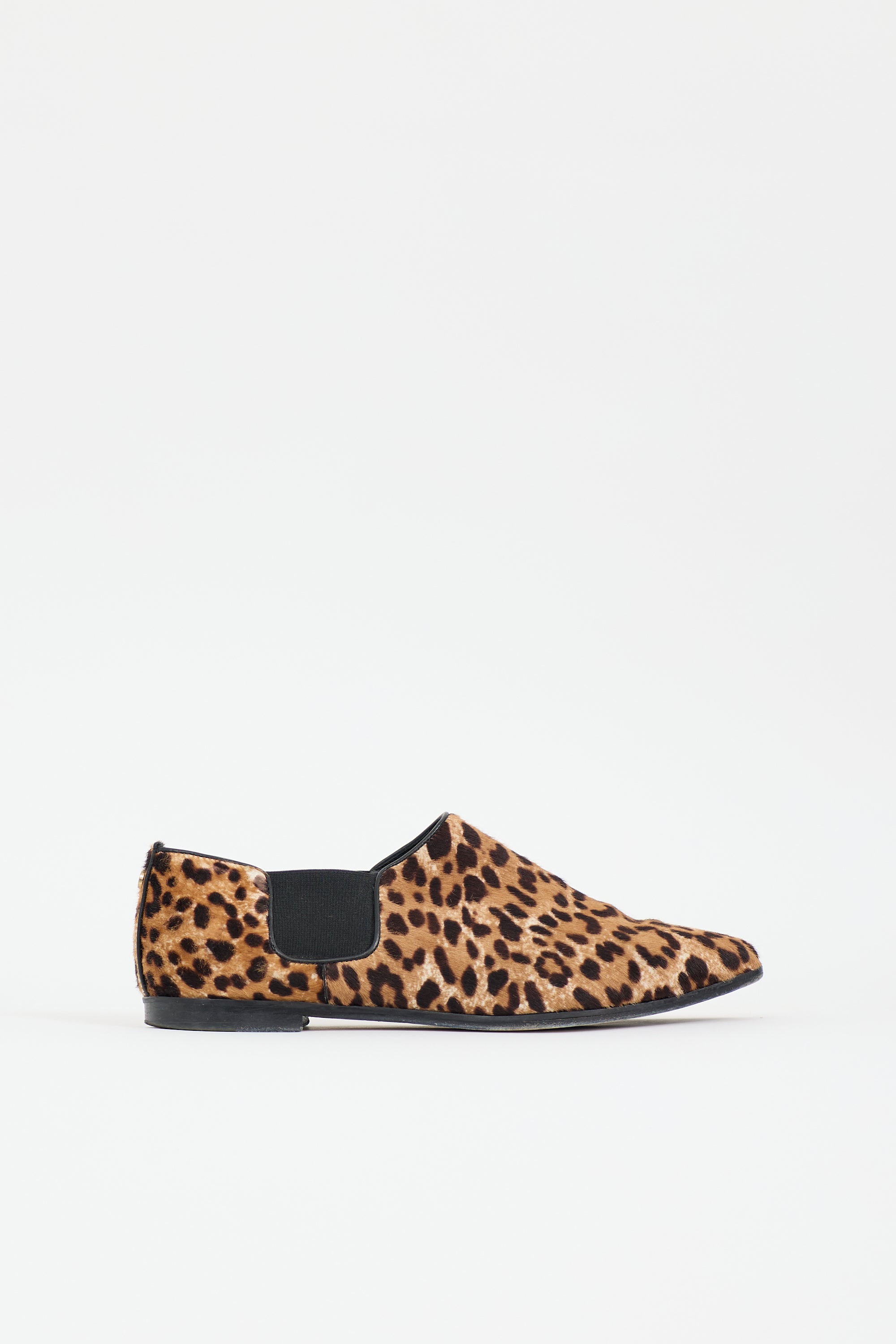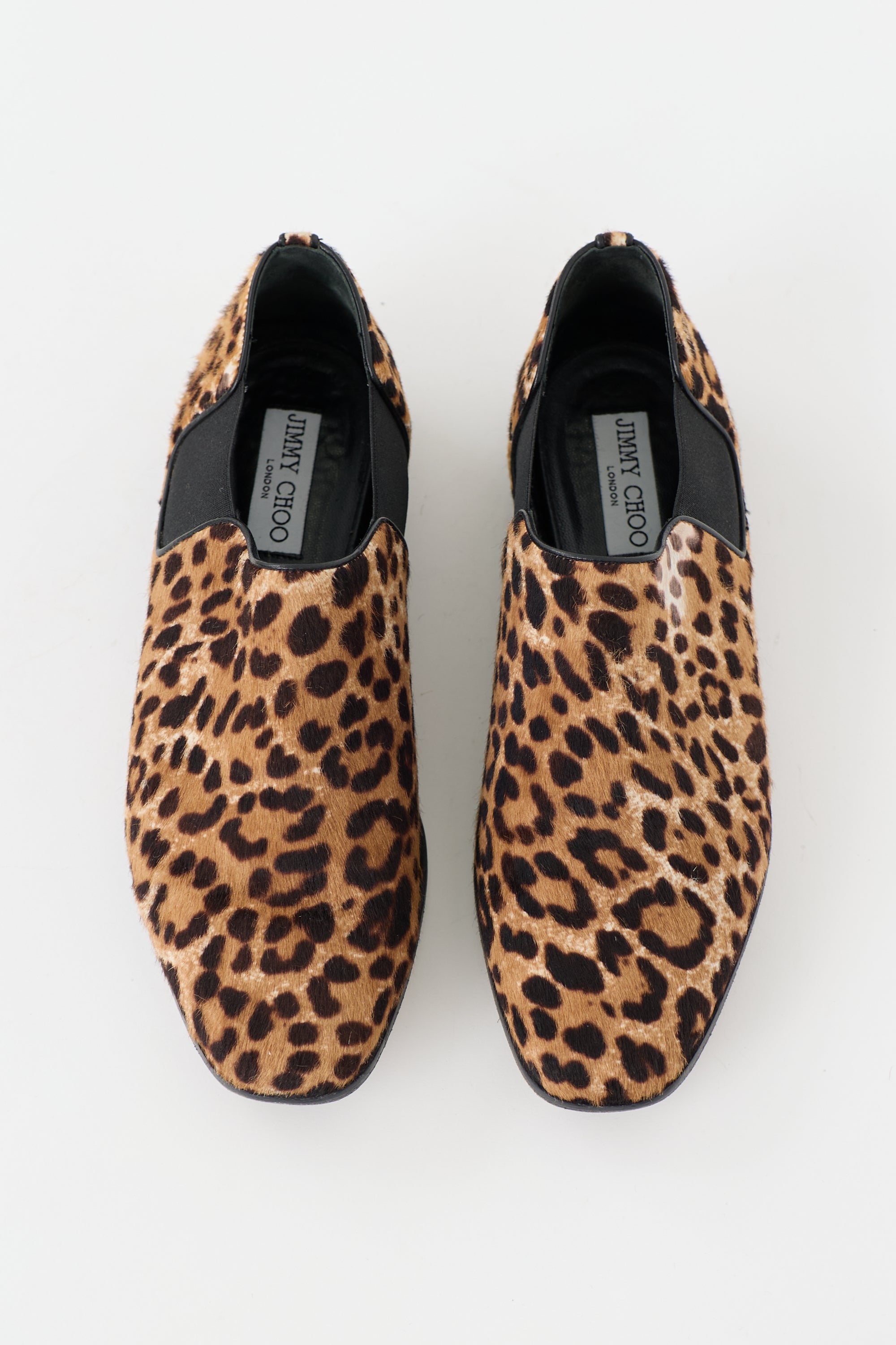 Pre-owned Jimmy Choo brown and black pony hair Glint loafers featuring tapered toe, leopard printed upper, elastic side panels, and gold tone logo embellishment at counter.