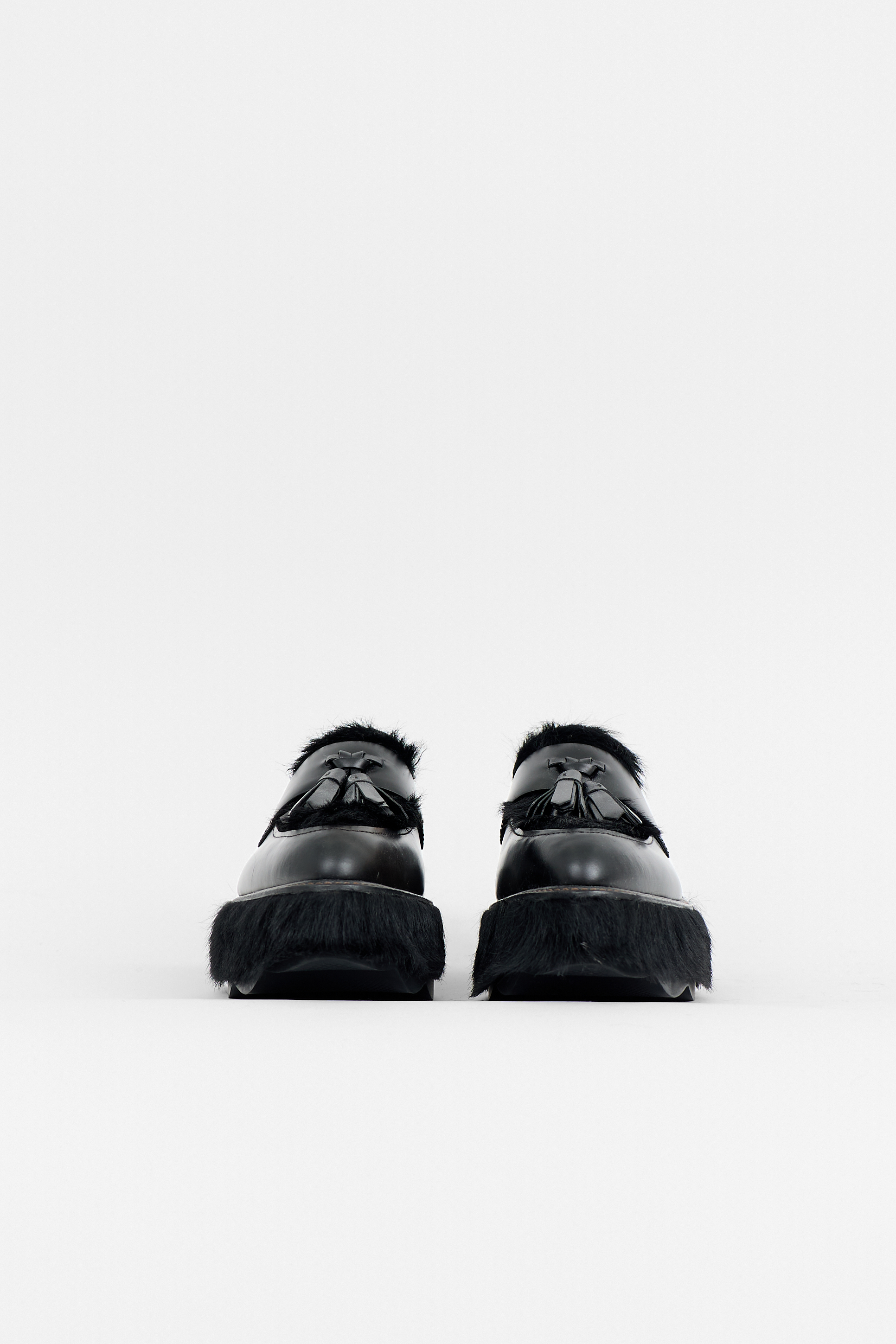 Pre-owned Prada black leather and pony hair loafers featuring pointed toe, leather tassels at vamp, slip on entry, and treaded rubber platform sole.
