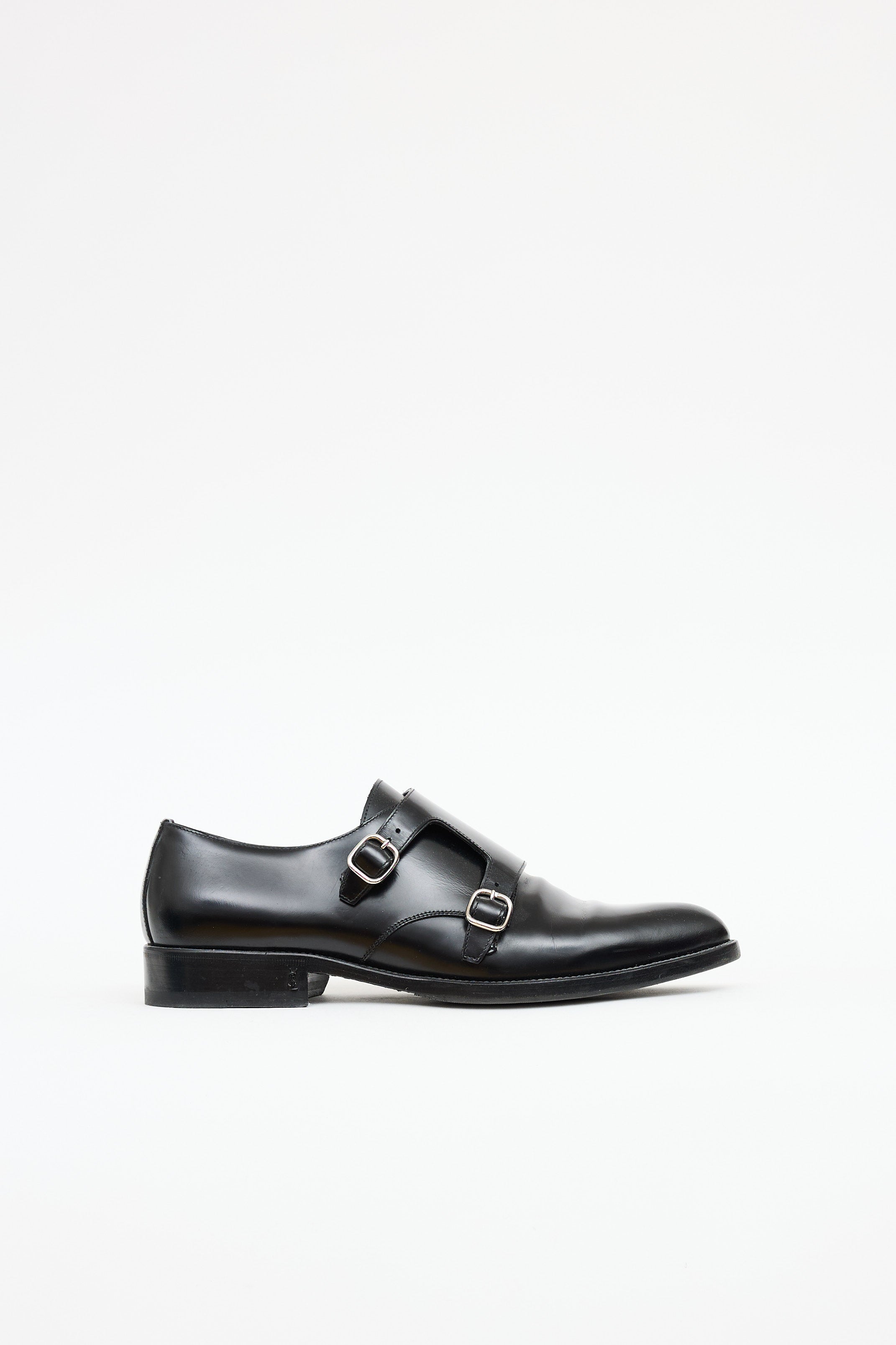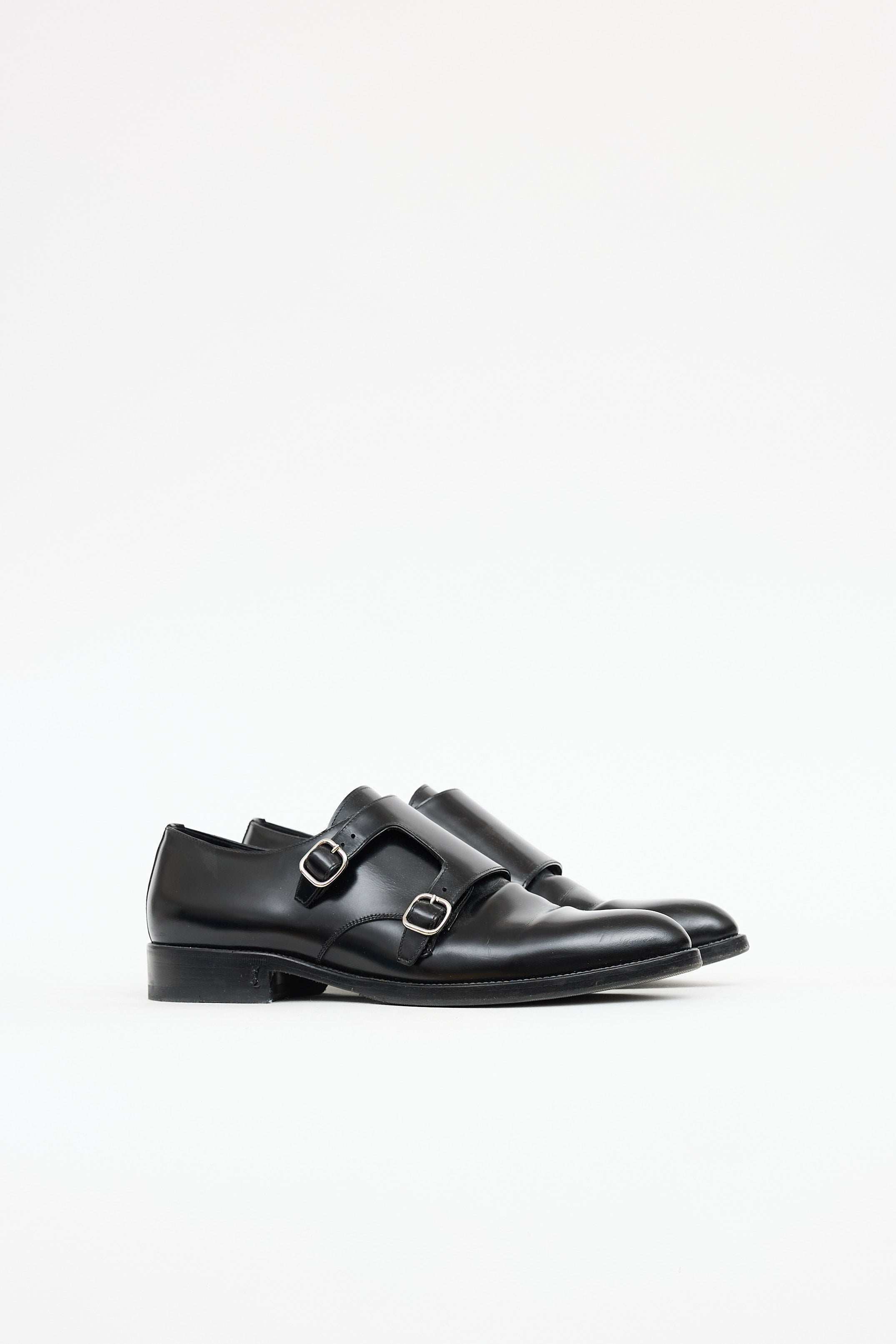 Pre-owned Saint Laurent black leather Double Monk loafer featuring almond toe, adjustable straps at vamp, silver tone hardware, and stacked heel with metal logo plaque.
