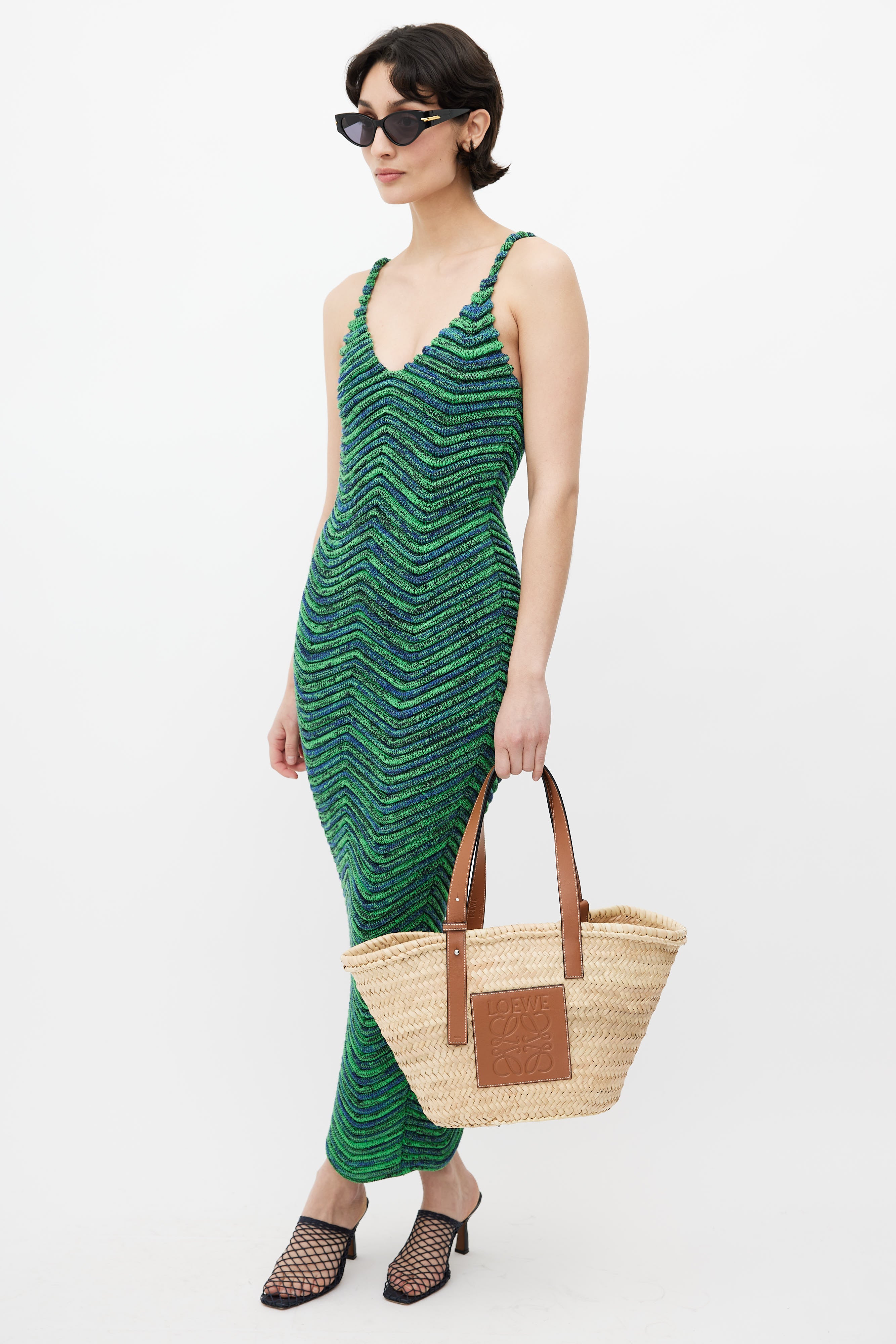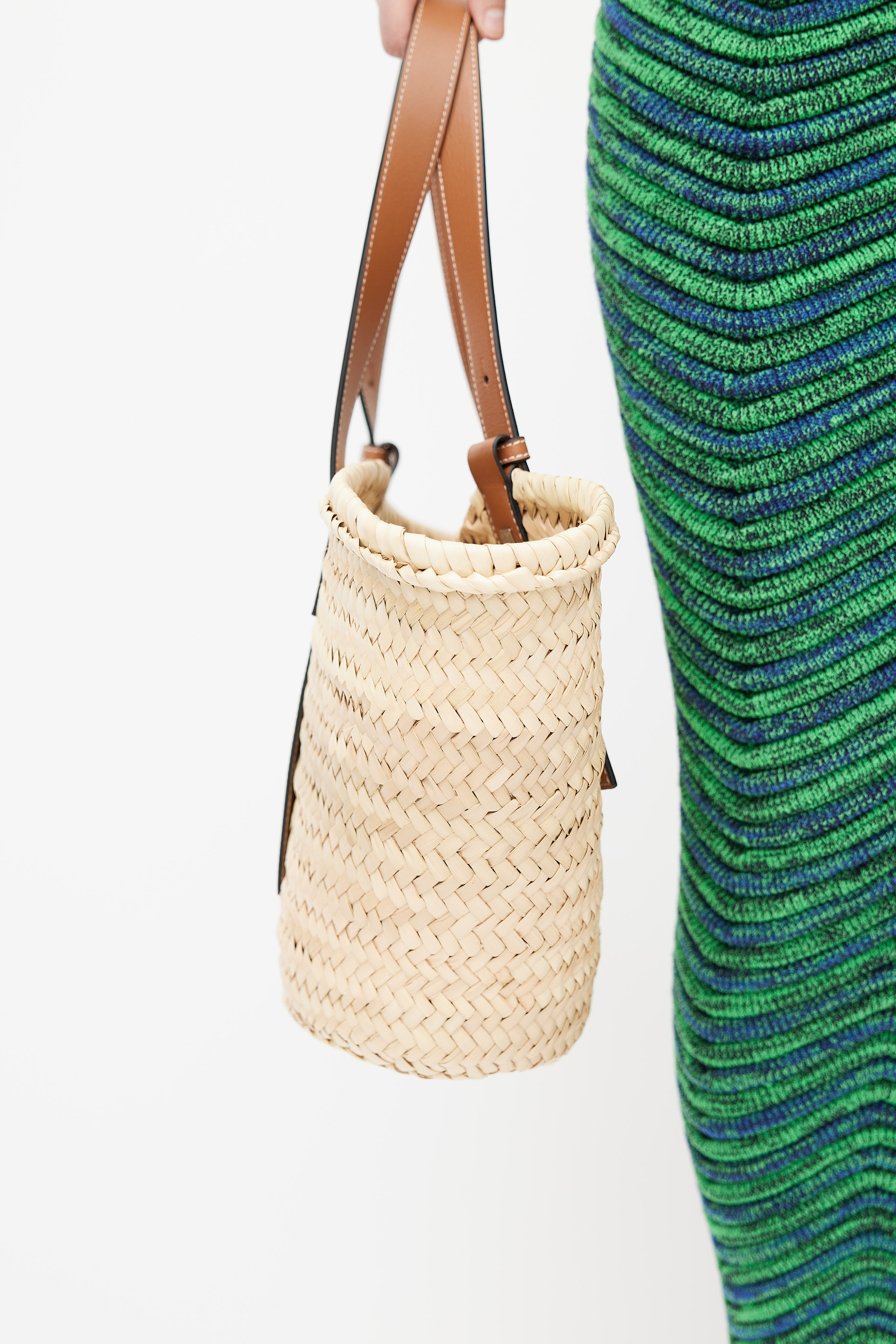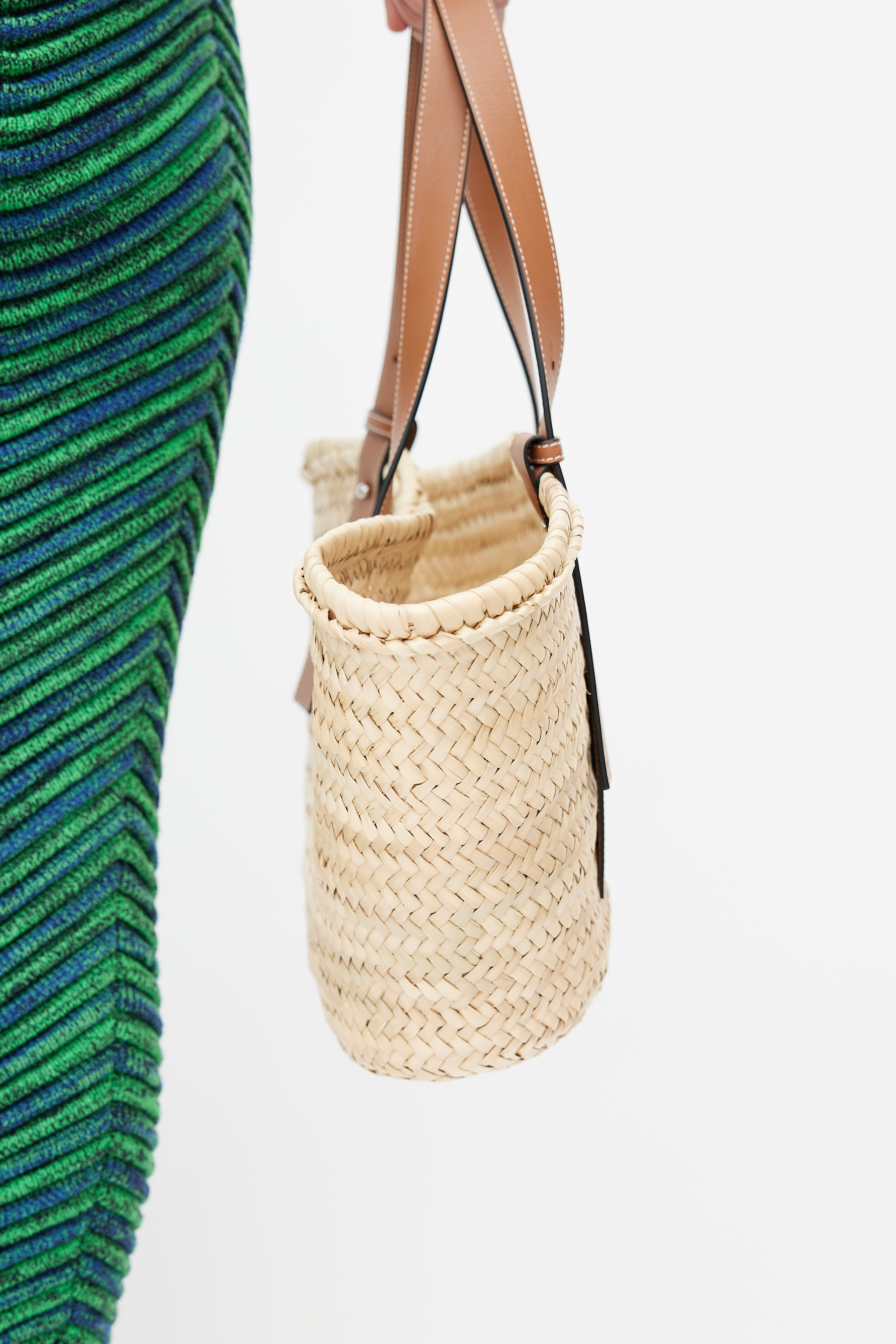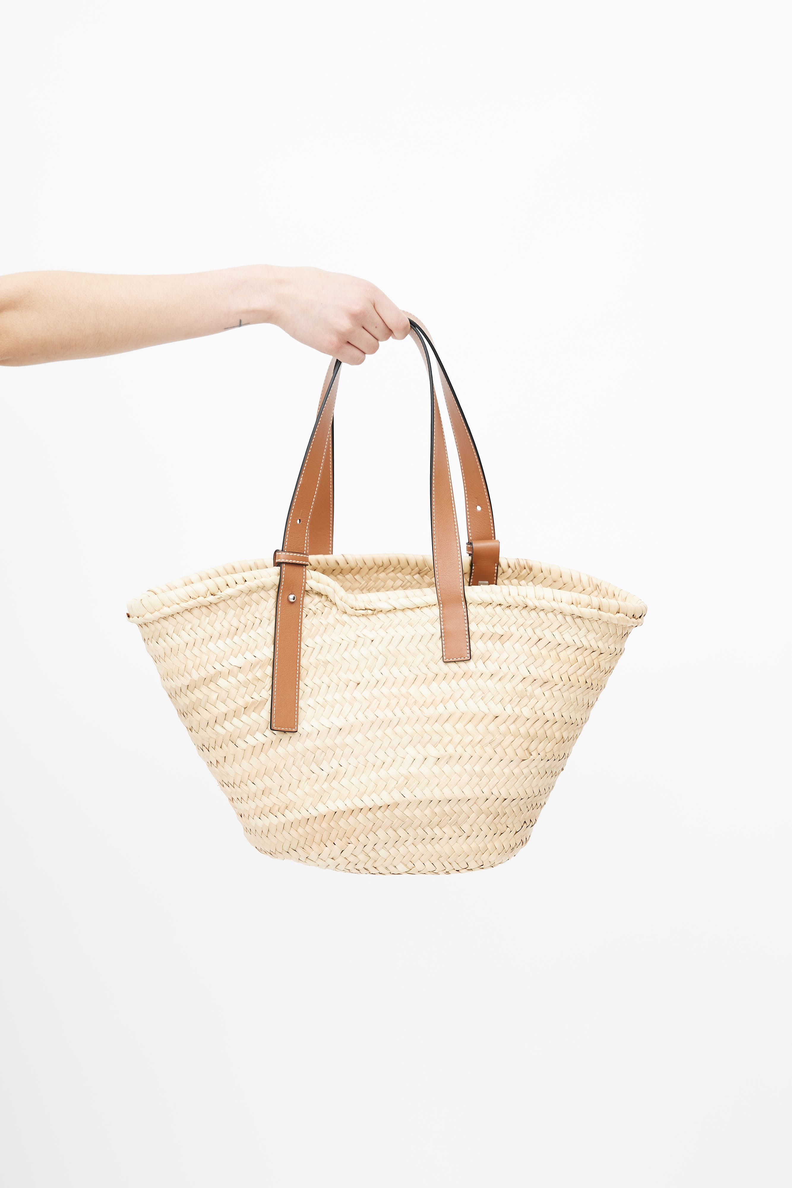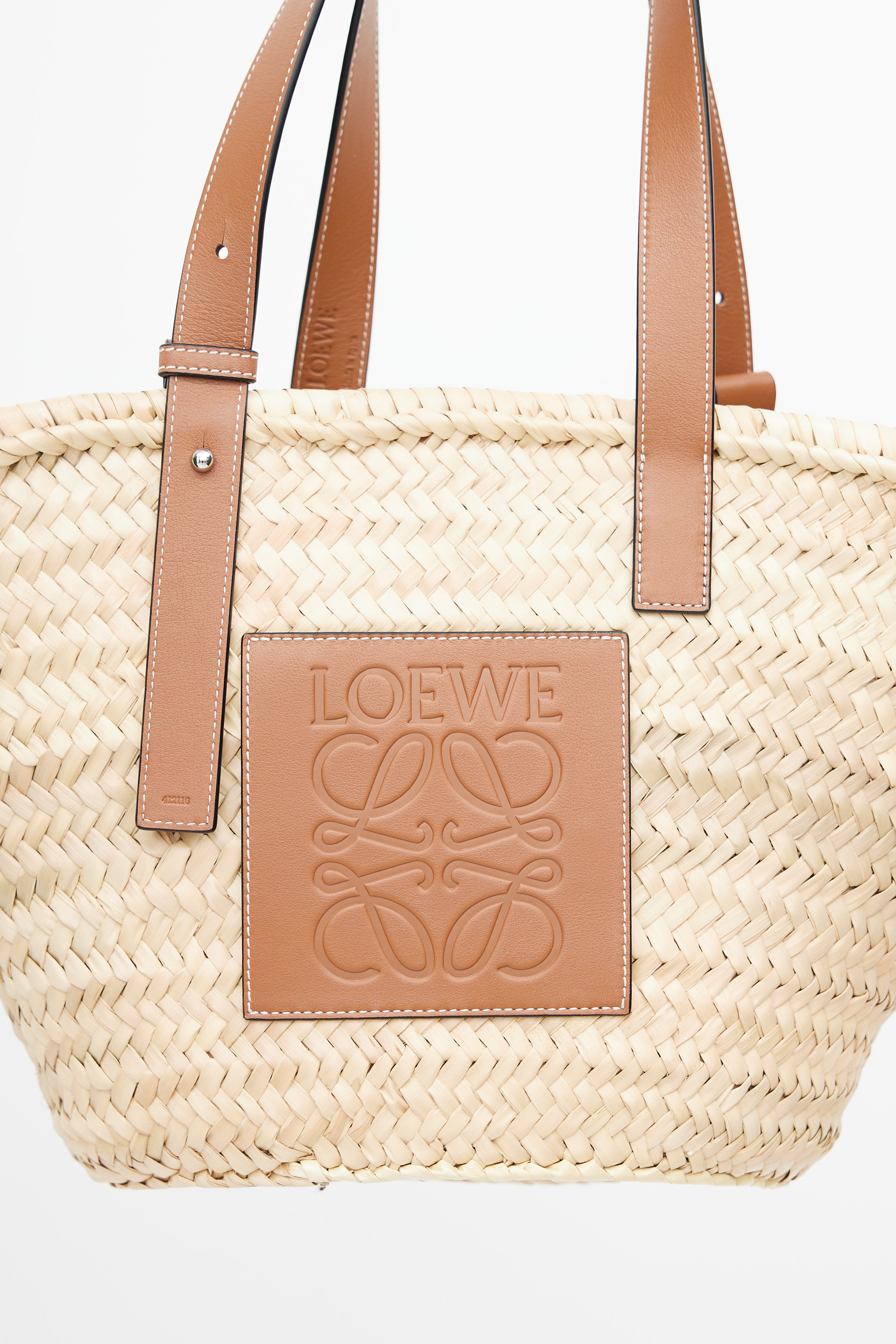 Pre-owned Loewe brown Basket bag featuring woven base, brown leather Anagram patch at front, adjustable flat top handles, warped back, and open compartment. Comes with original dust bag.