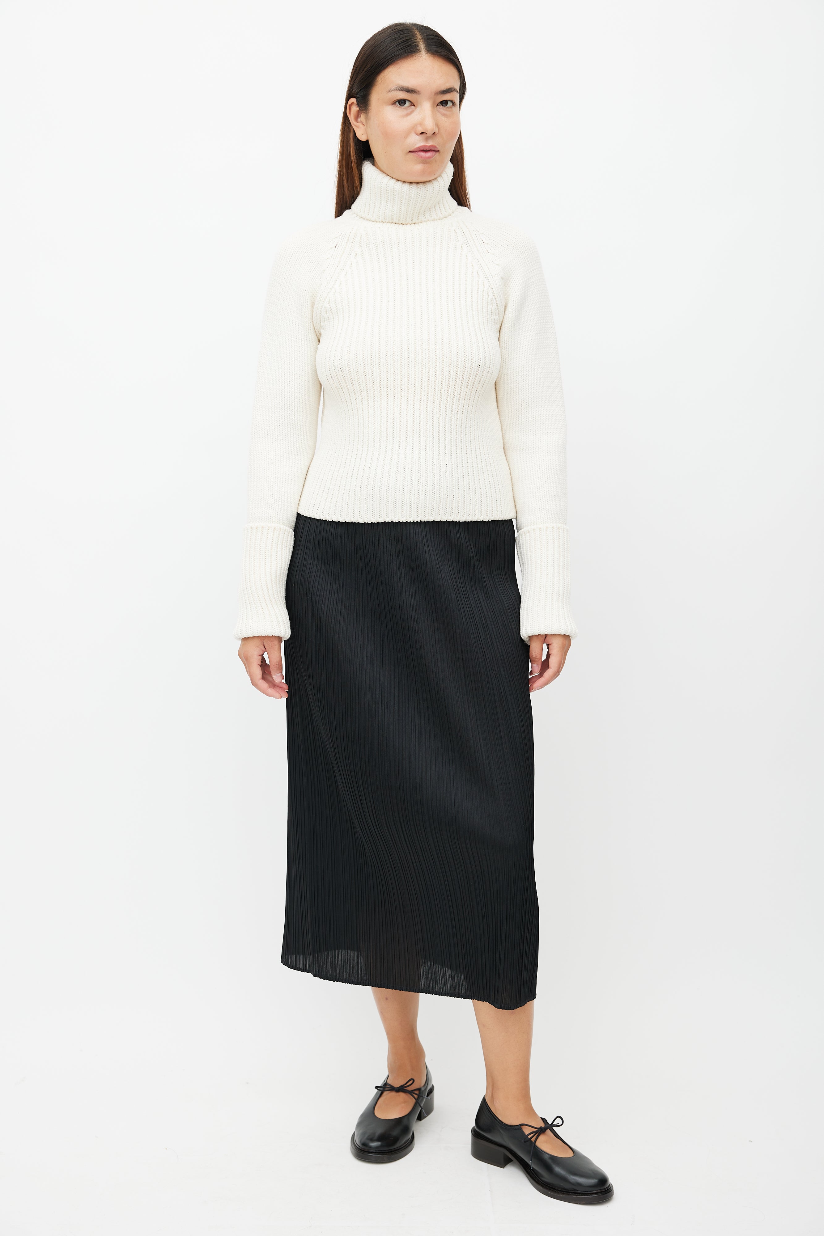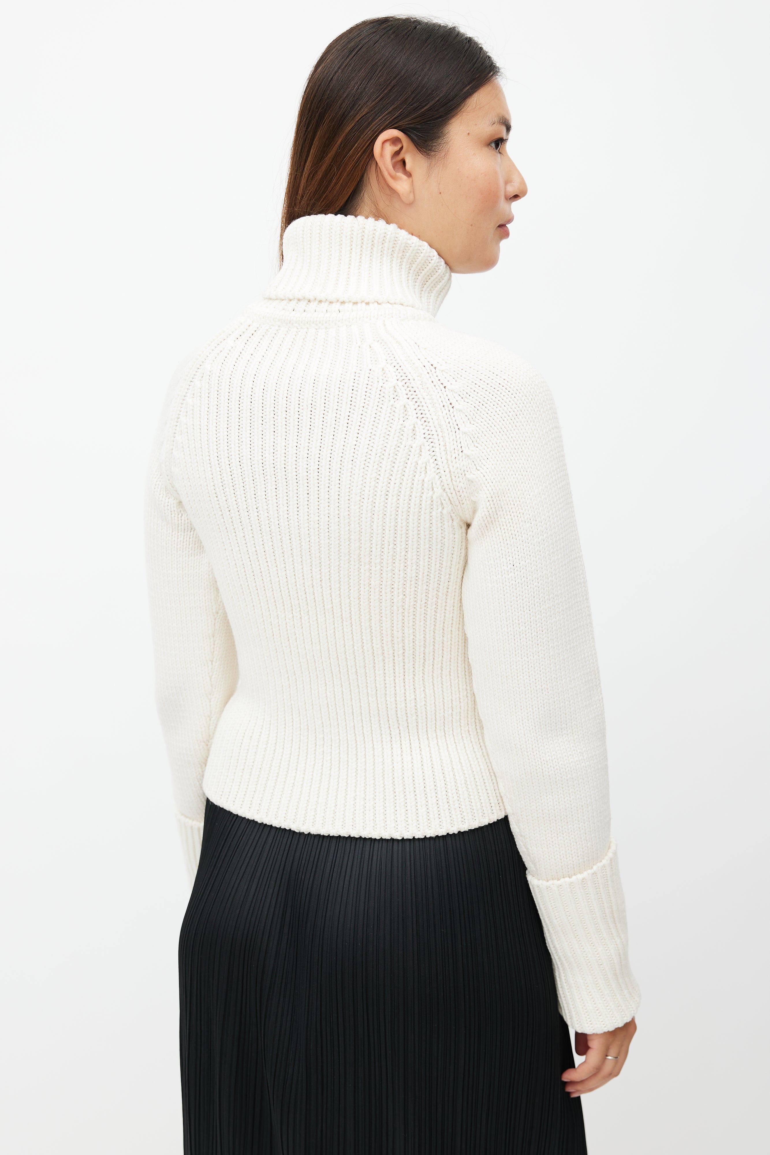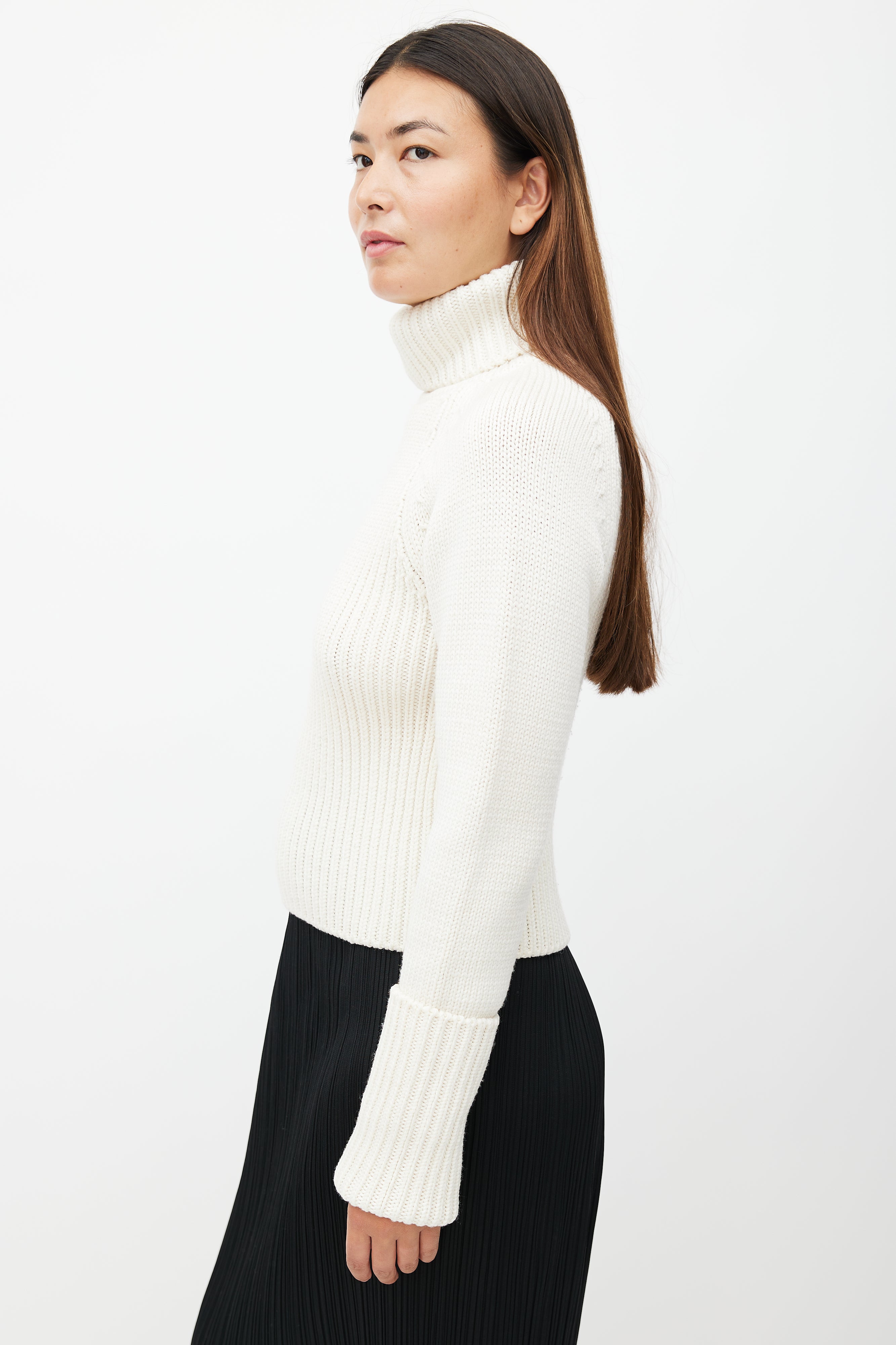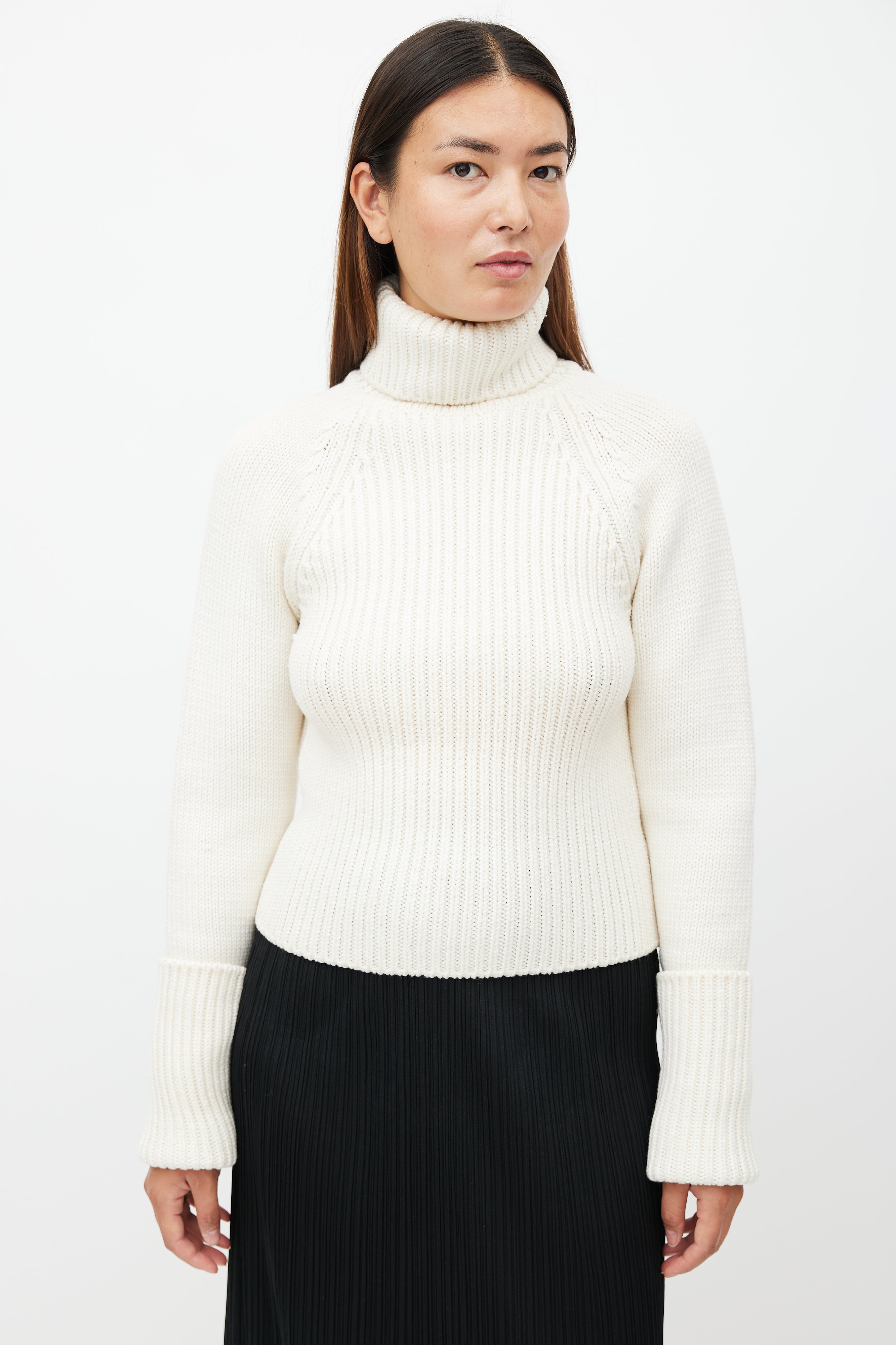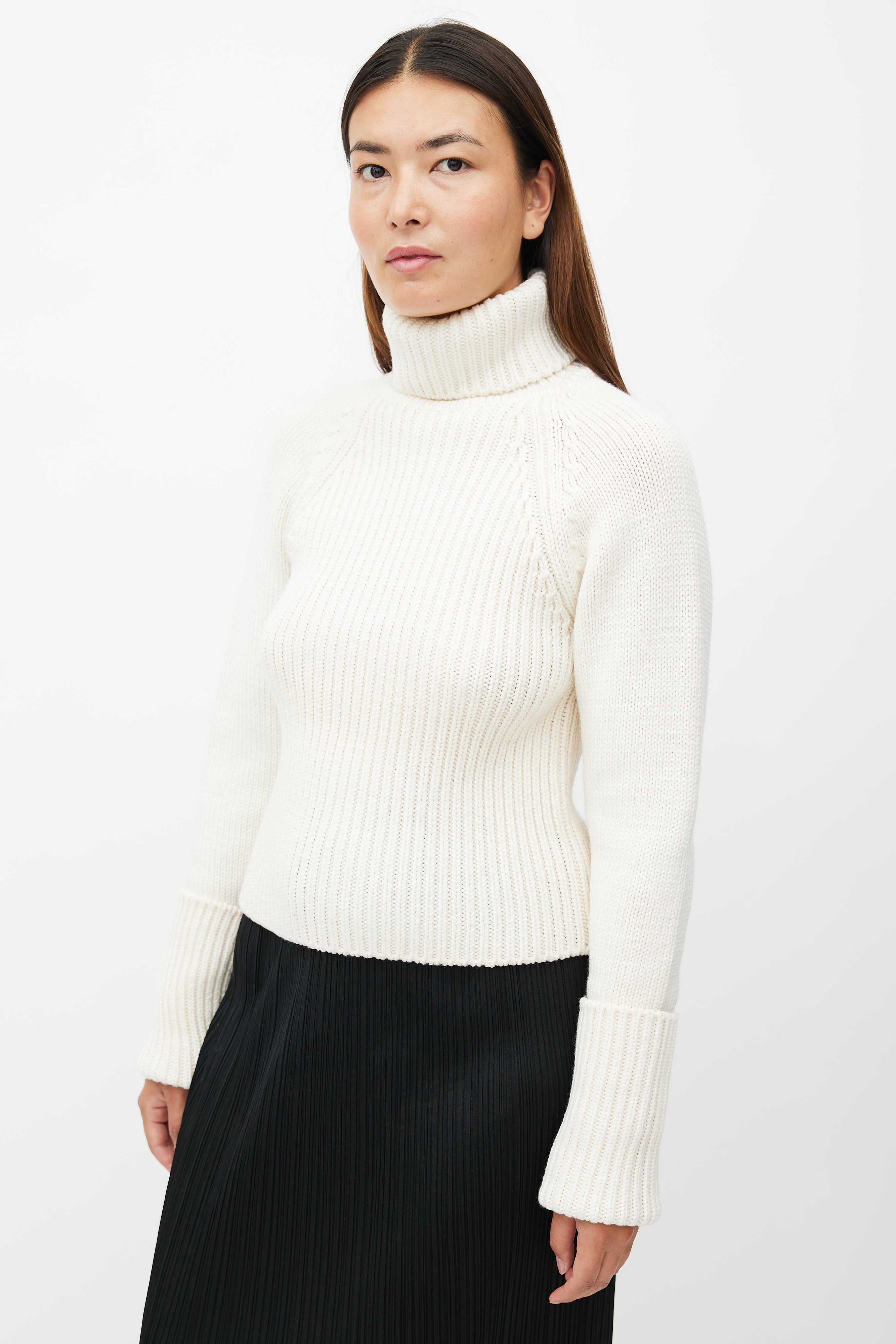 Pre-owned Loewe cream ribbed knit wool sweater featuring a turtleneck, and long raglan cuffed sleeves.