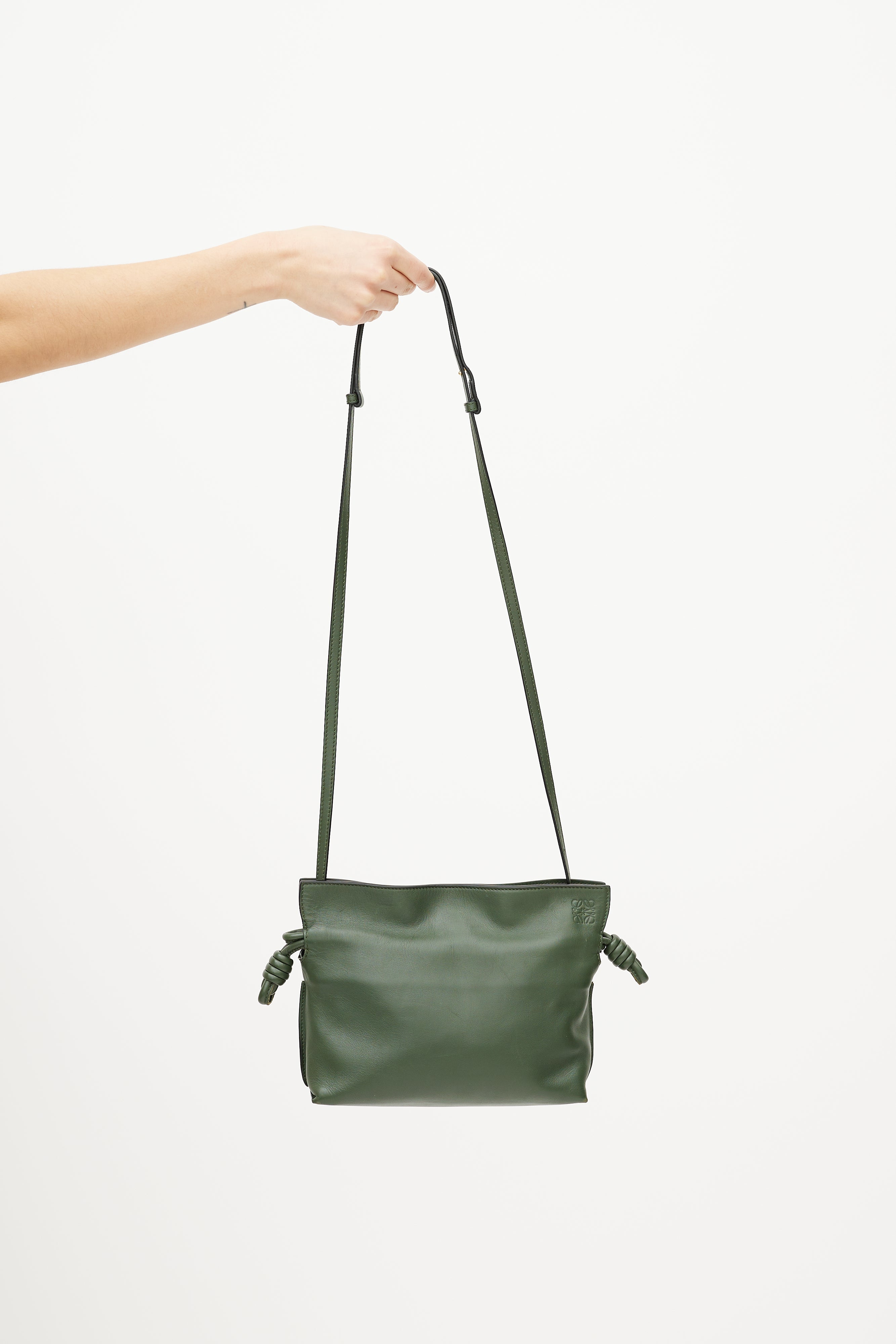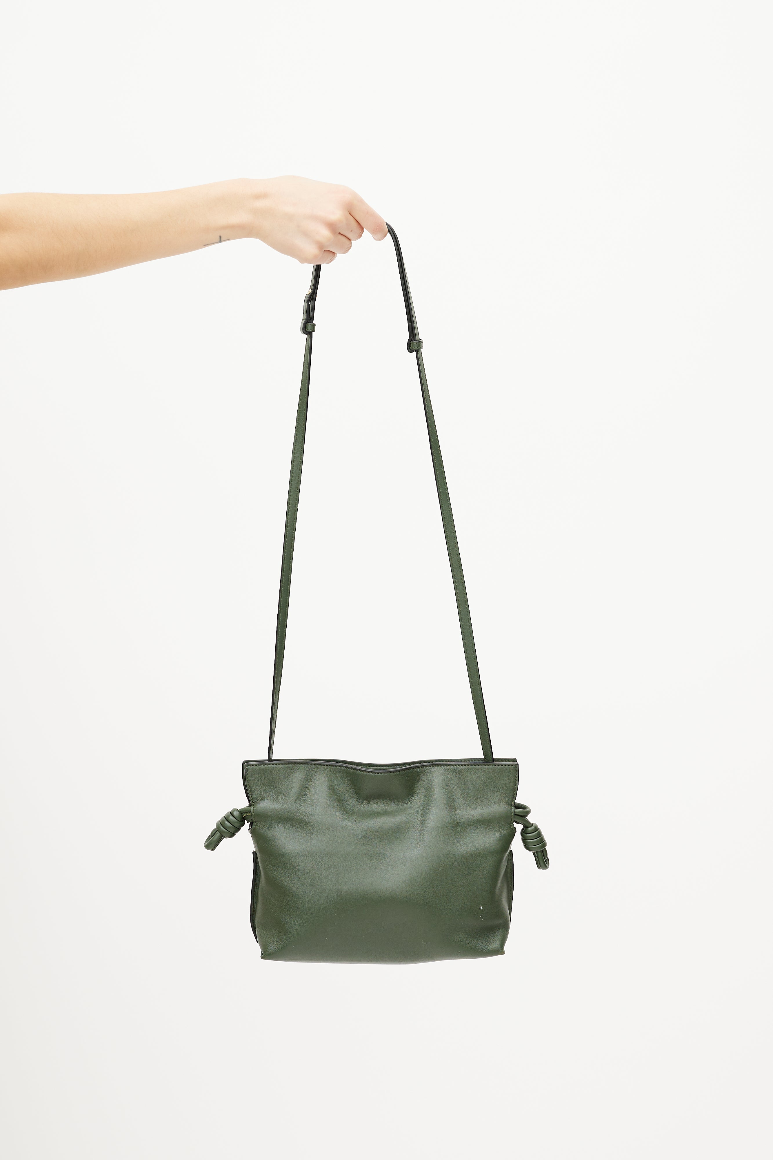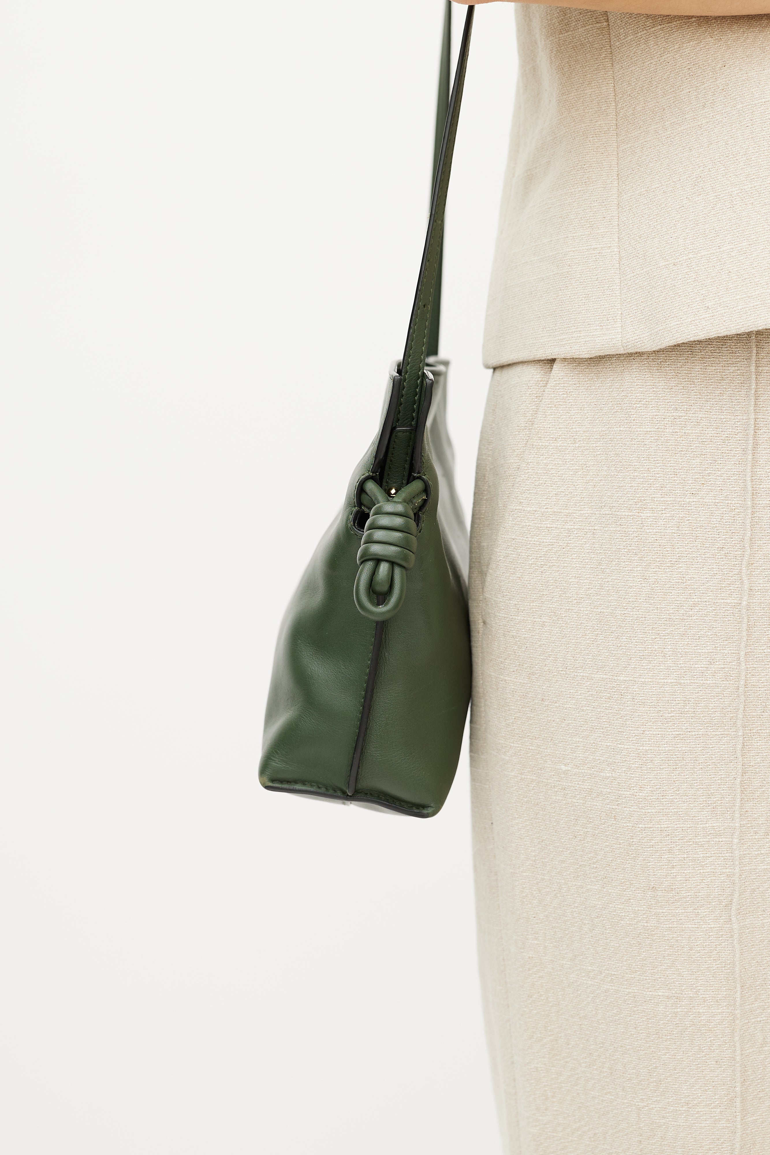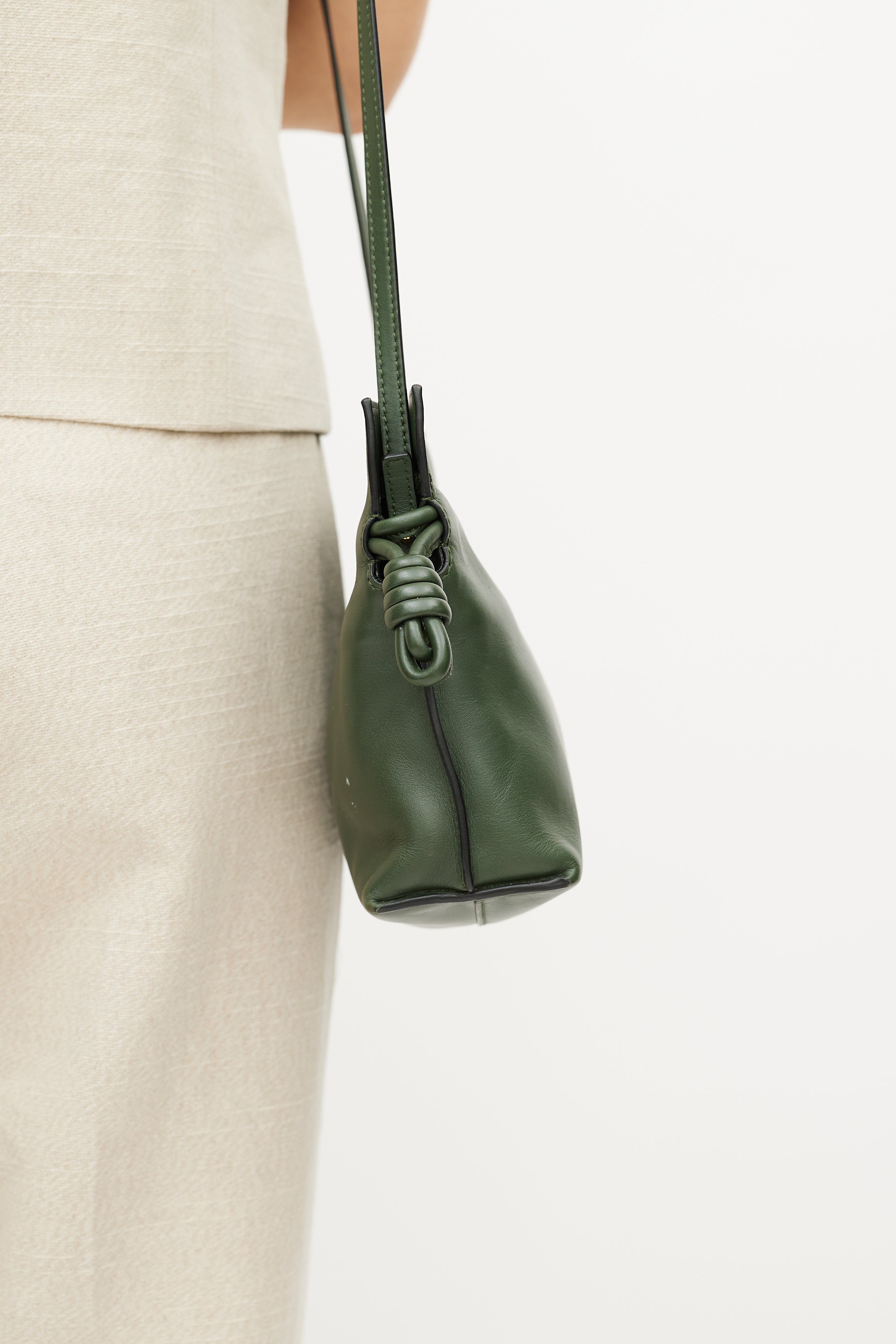Pre-owned Loewe dark green mini Flamenco Clutch shoulder bag featuring embossed Anagram logo at front, drawstring sides with knotted straps, magnetic button closure, detachable and adjustable shoulder strap, and suede lining.