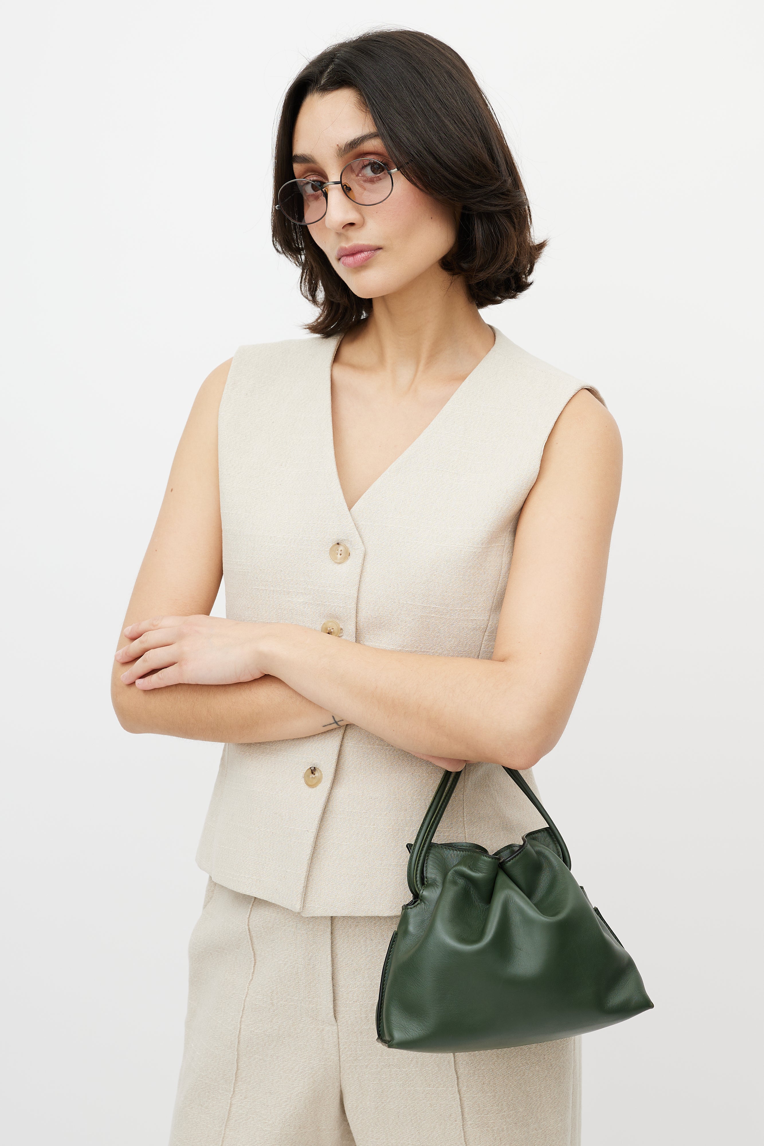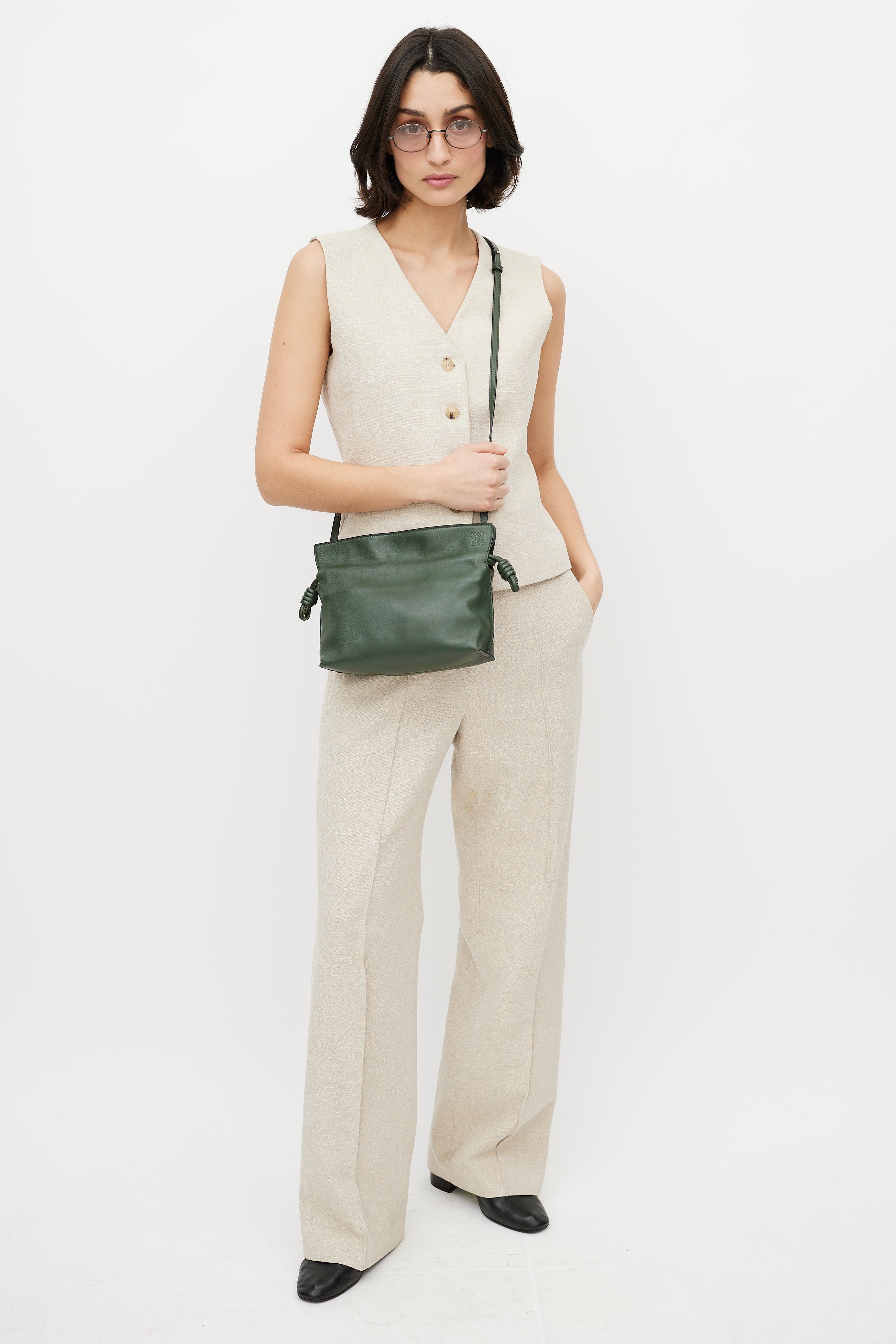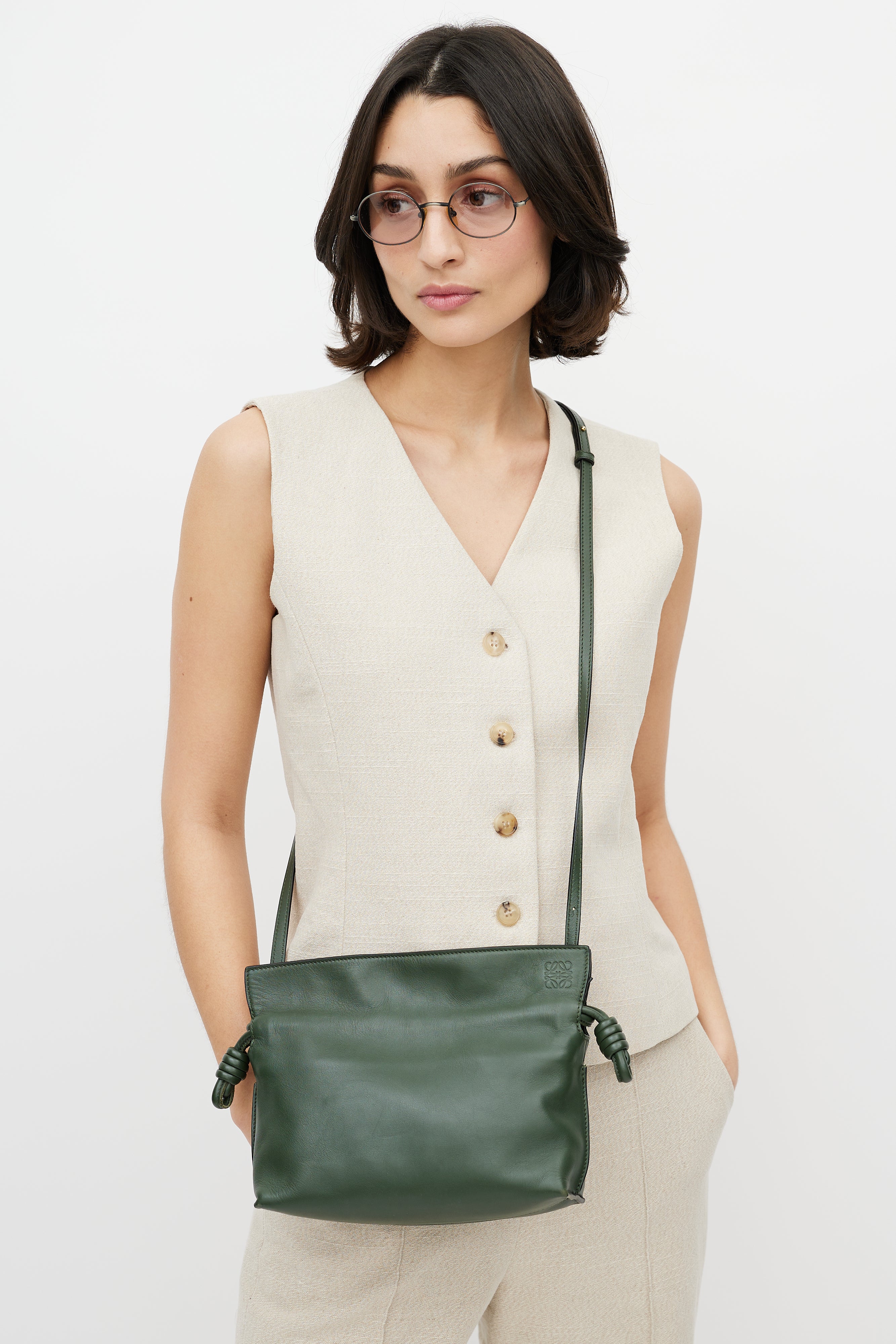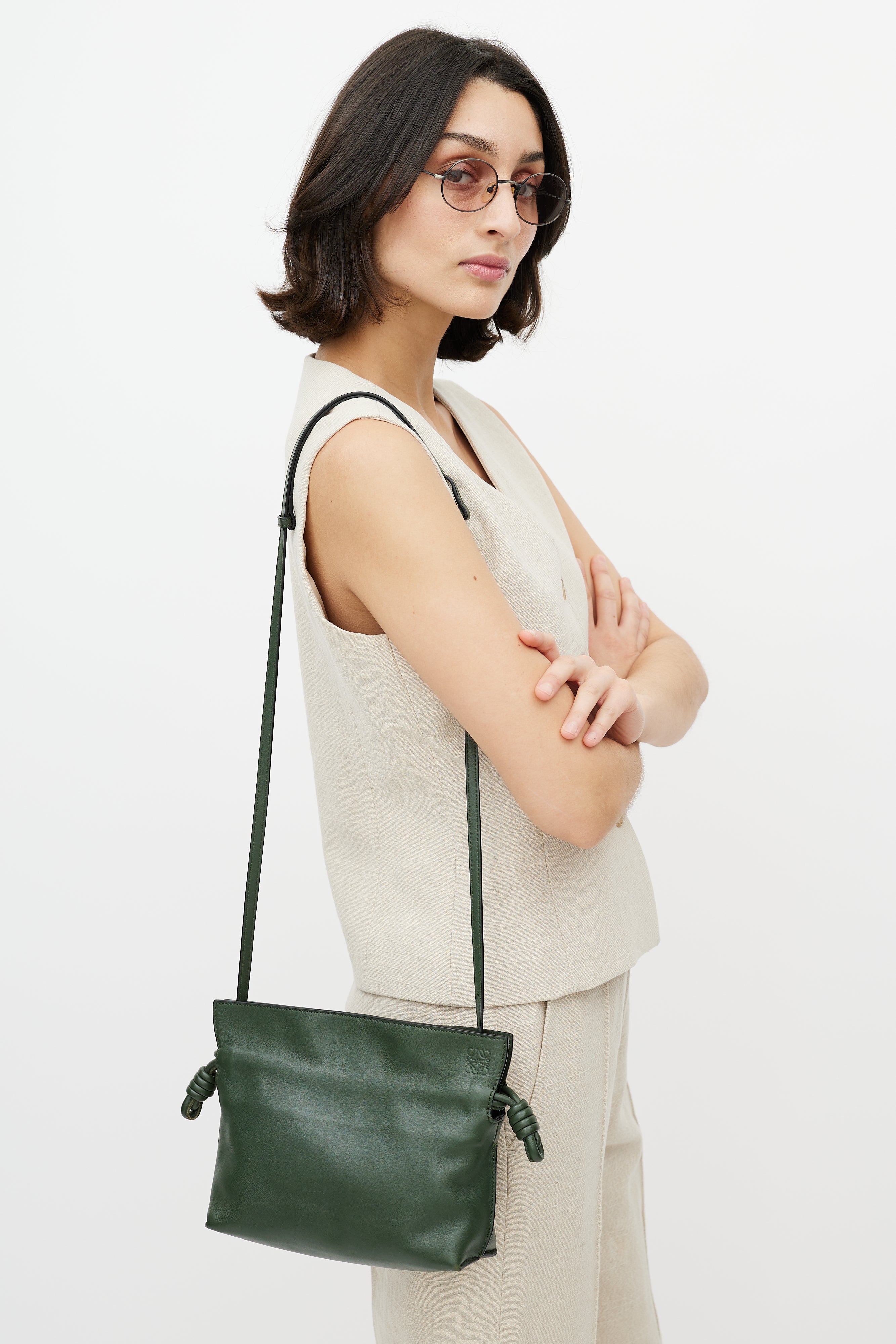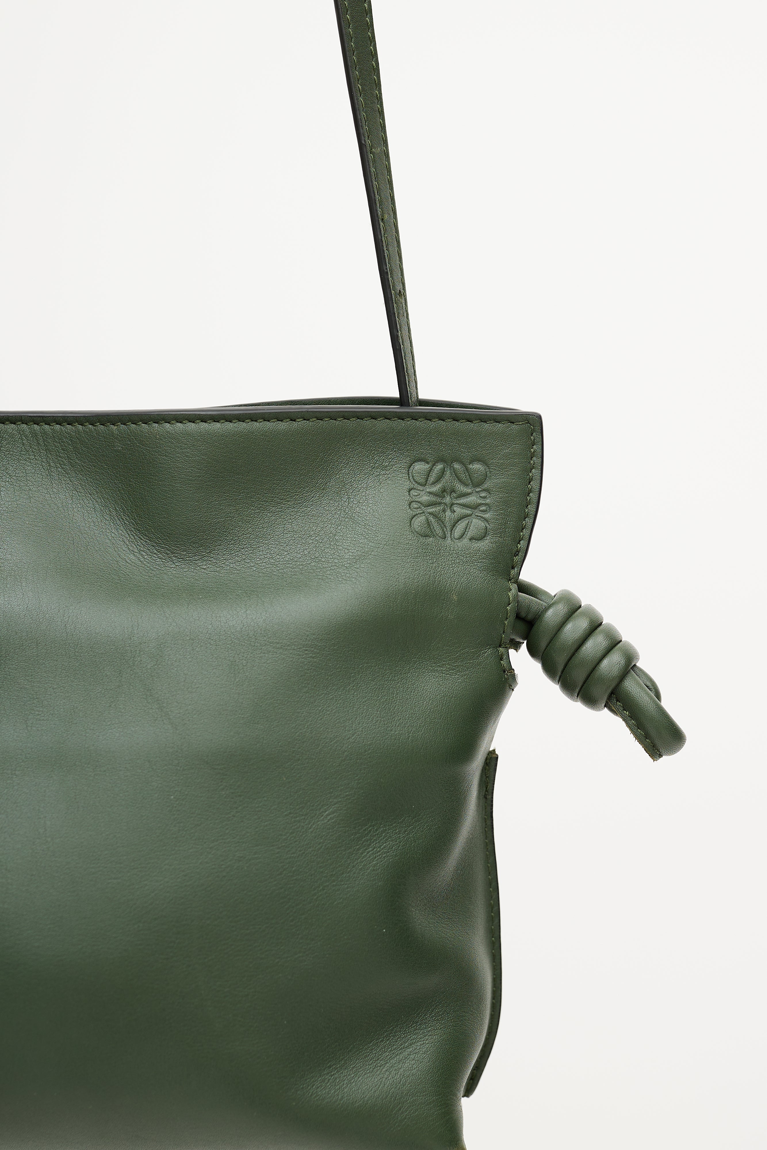 Pre-owned Loewe dark green mini Flamenco Clutch shoulder bag featuring embossed Anagram logo at front, drawstring sides with knotted straps, magnetic button closure, detachable and adjustable shoulder strap, and suede lining.