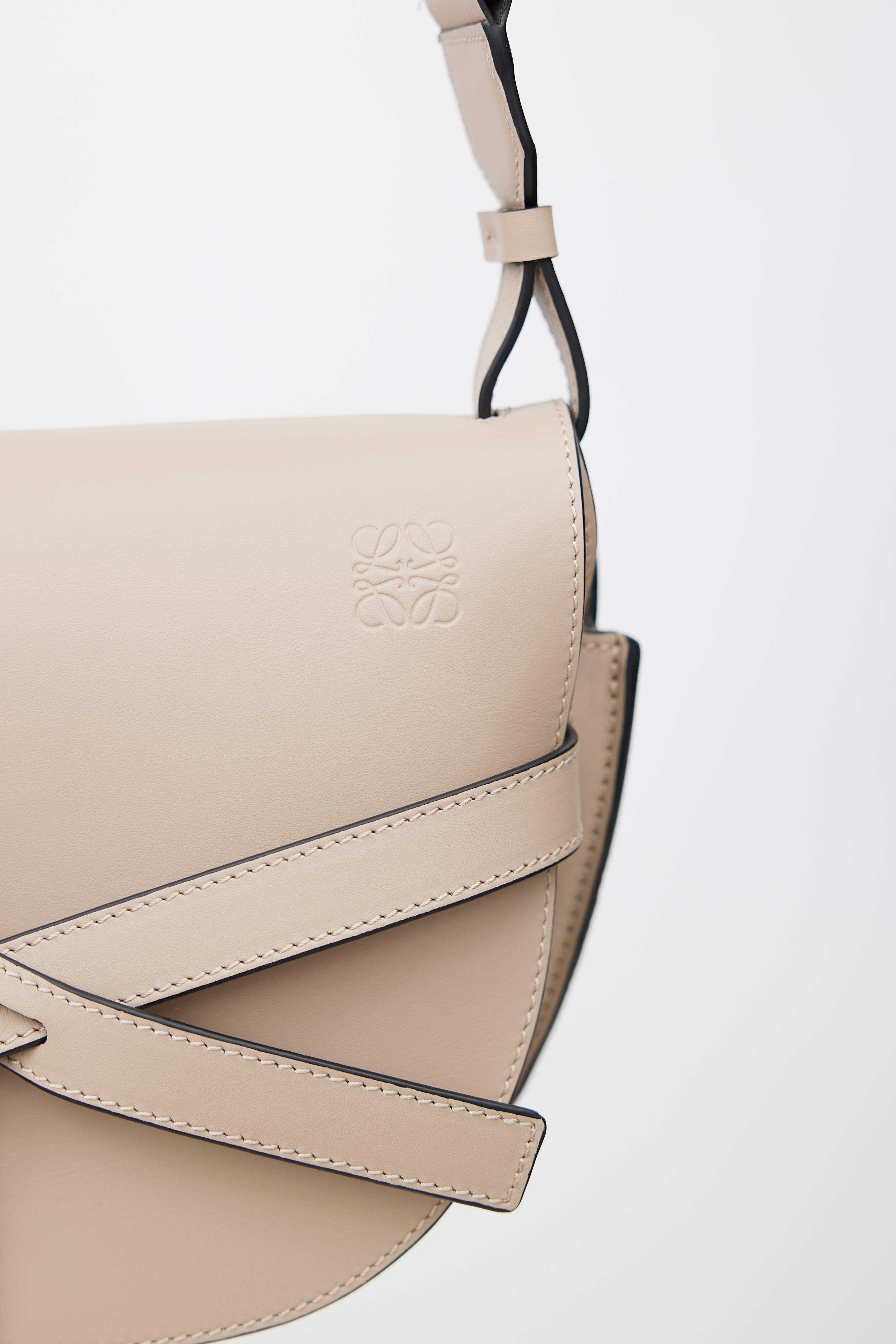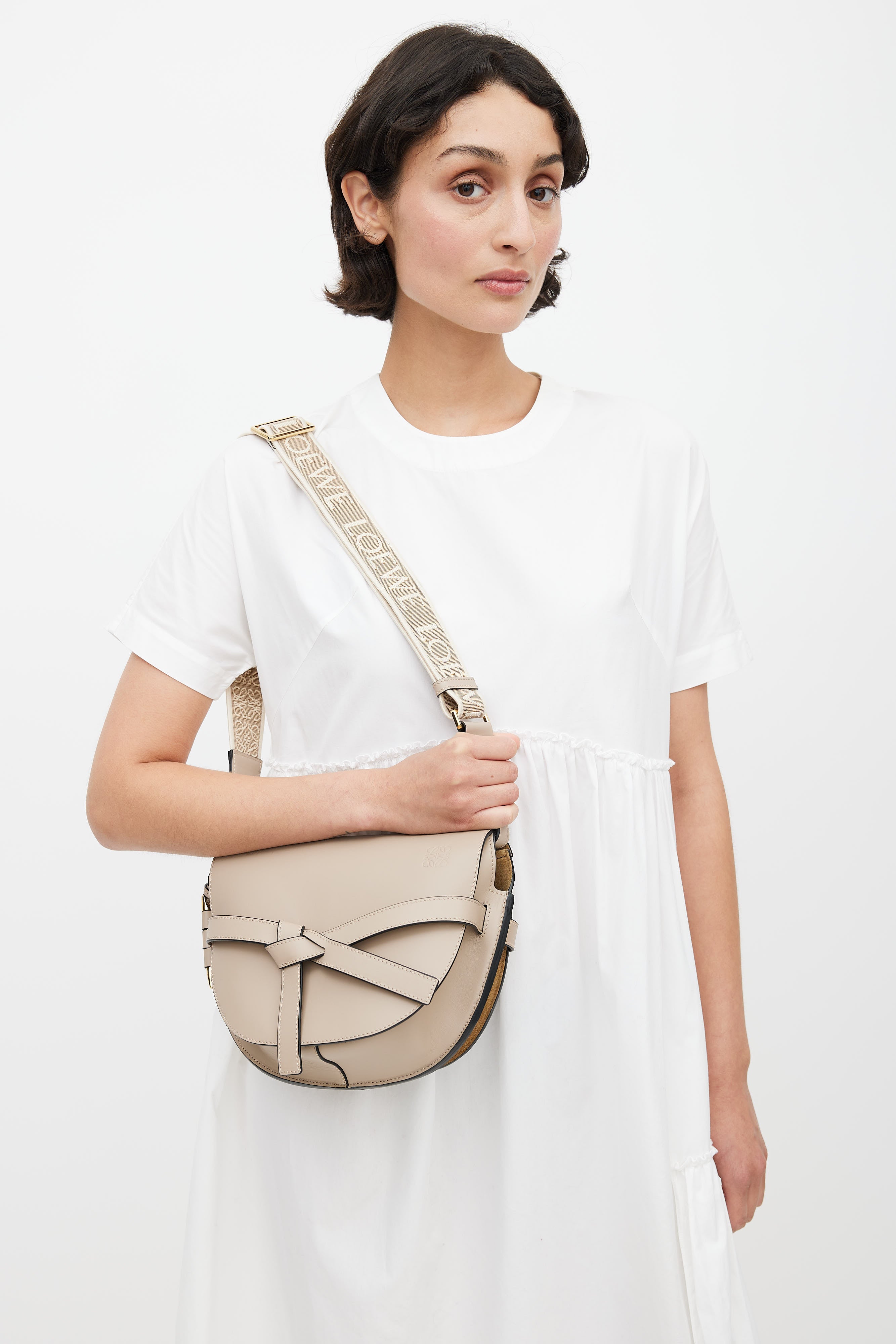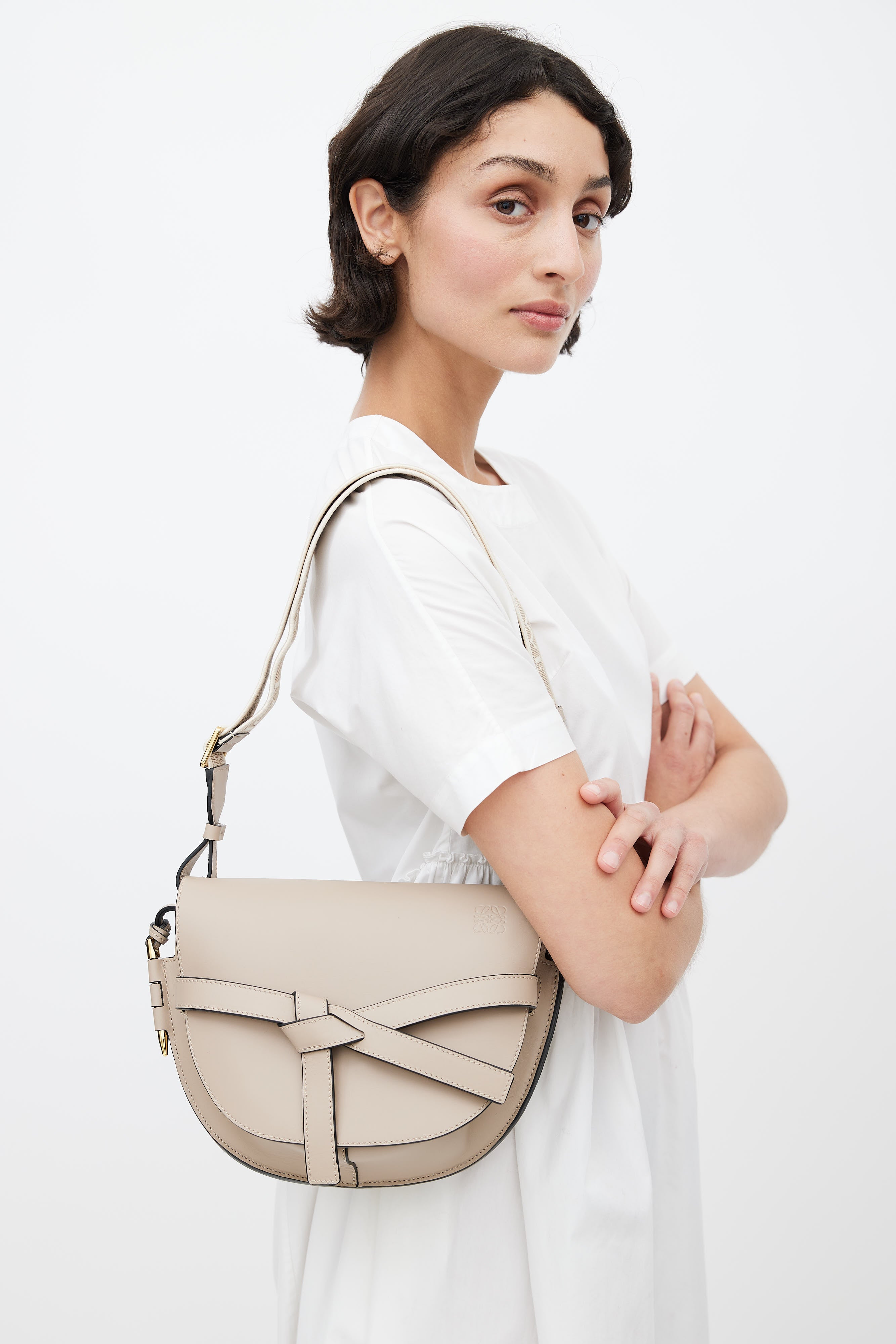Pre-owned Loewe small grey Gate crossbody bag featuring top flap closure with knotted strap detail, embossed logo at front, adjustable jacquard shoulder strap, suede lined main compartment, gold tone hardware, and two interior slip pockets. Comes with original dust bag and box.