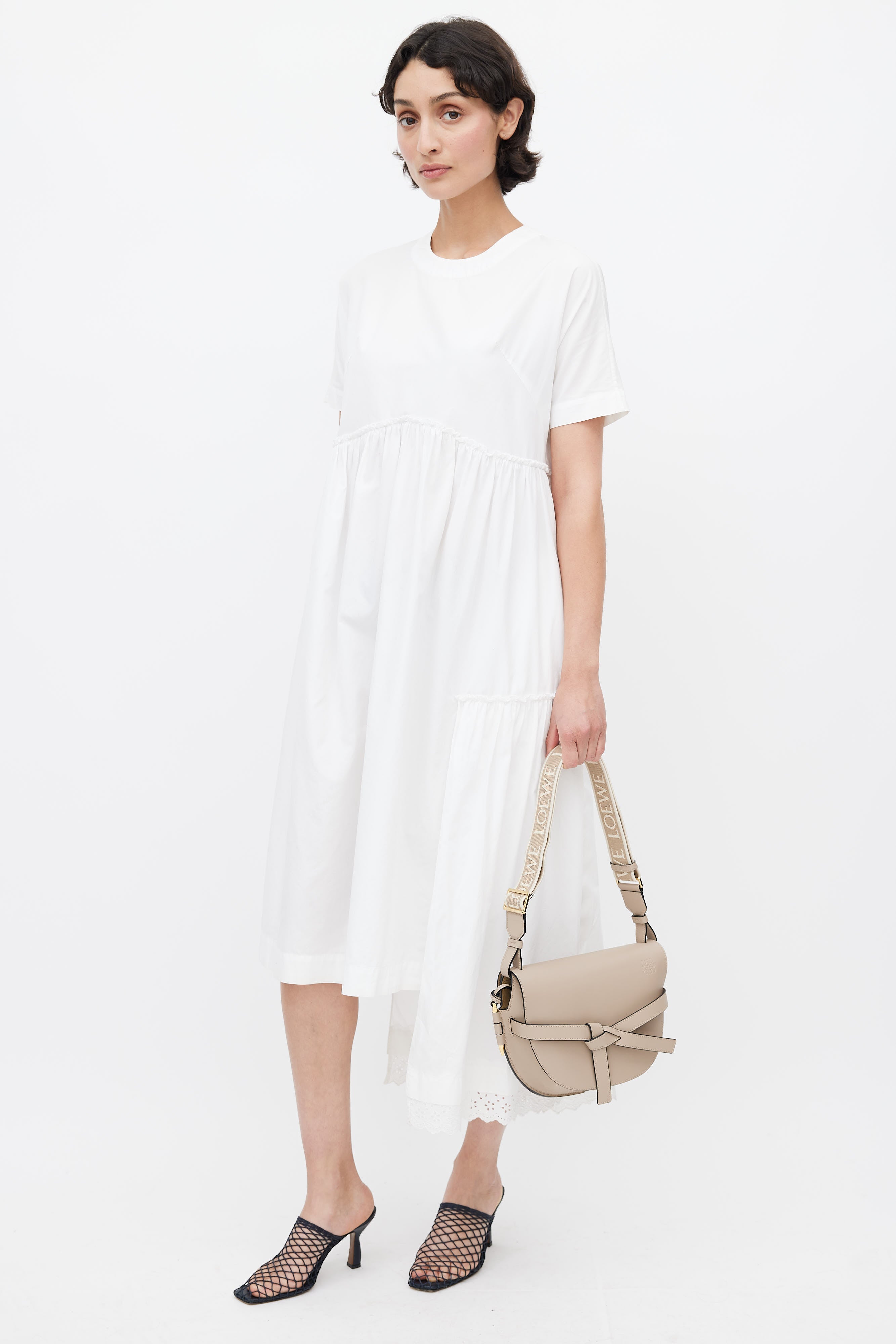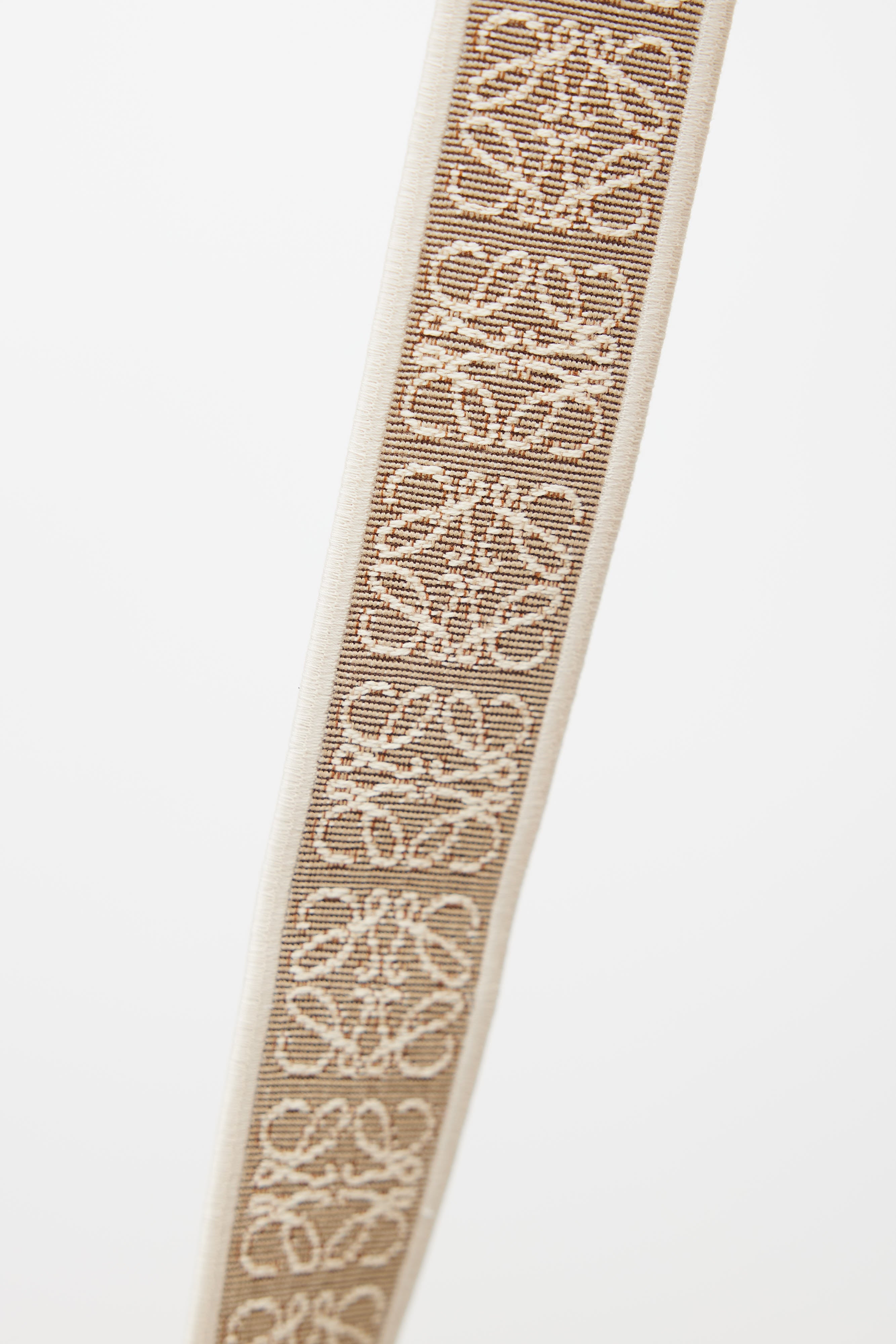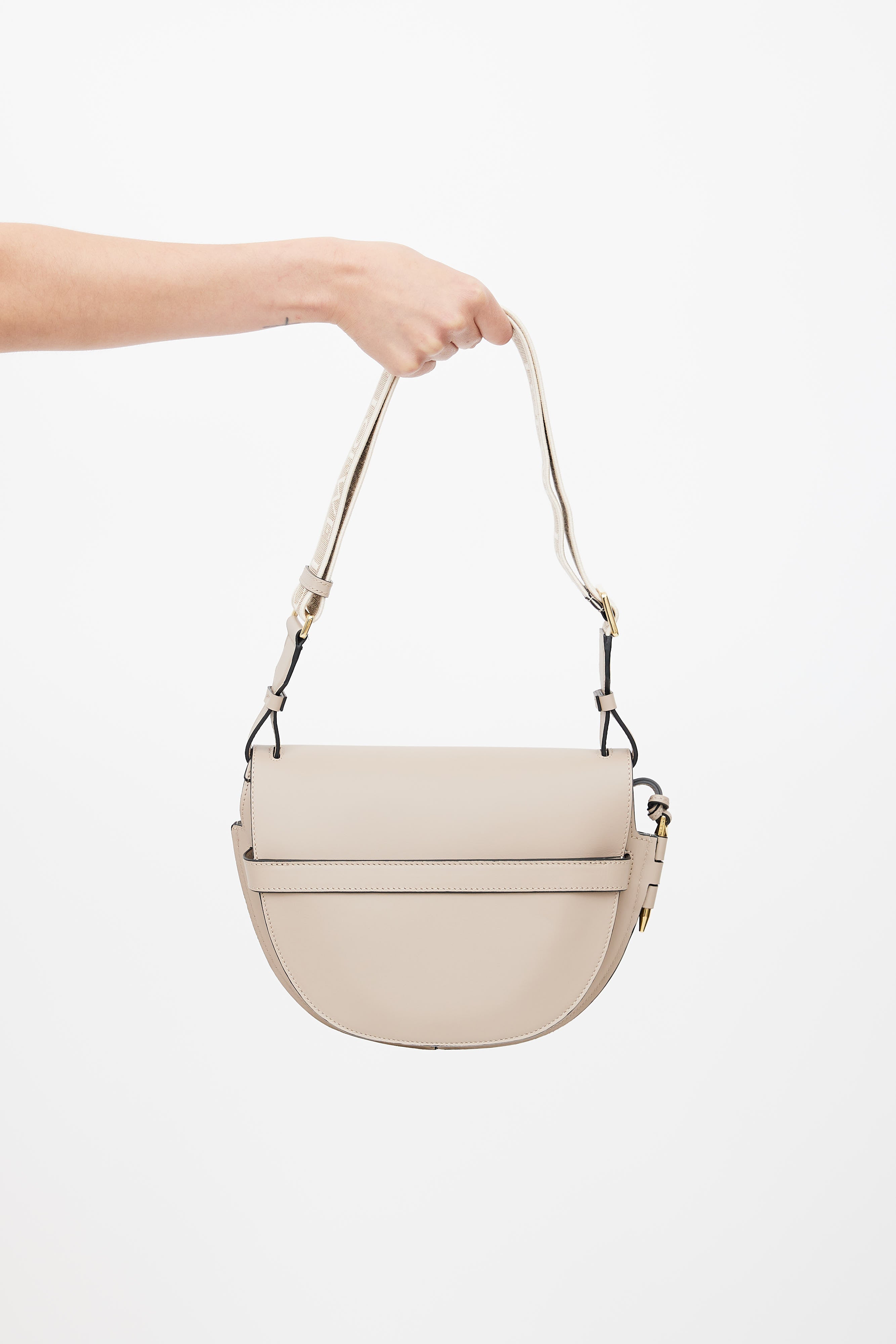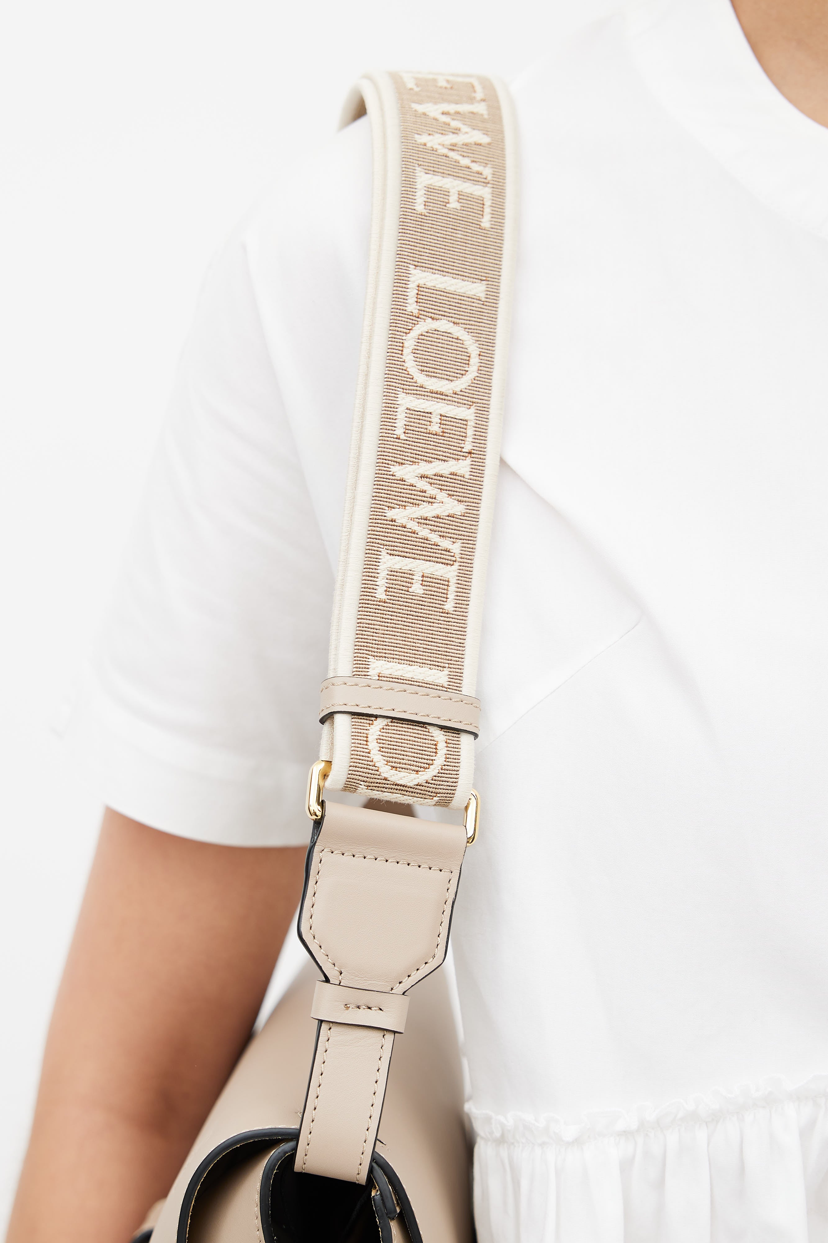 Pre-owned Loewe small grey Gate crossbody bag featuring top flap closure with knotted strap detail, embossed logo at front, adjustable jacquard shoulder strap, suede lined main compartment, gold tone hardware, and two interior slip pockets. Comes with original dust bag and box.