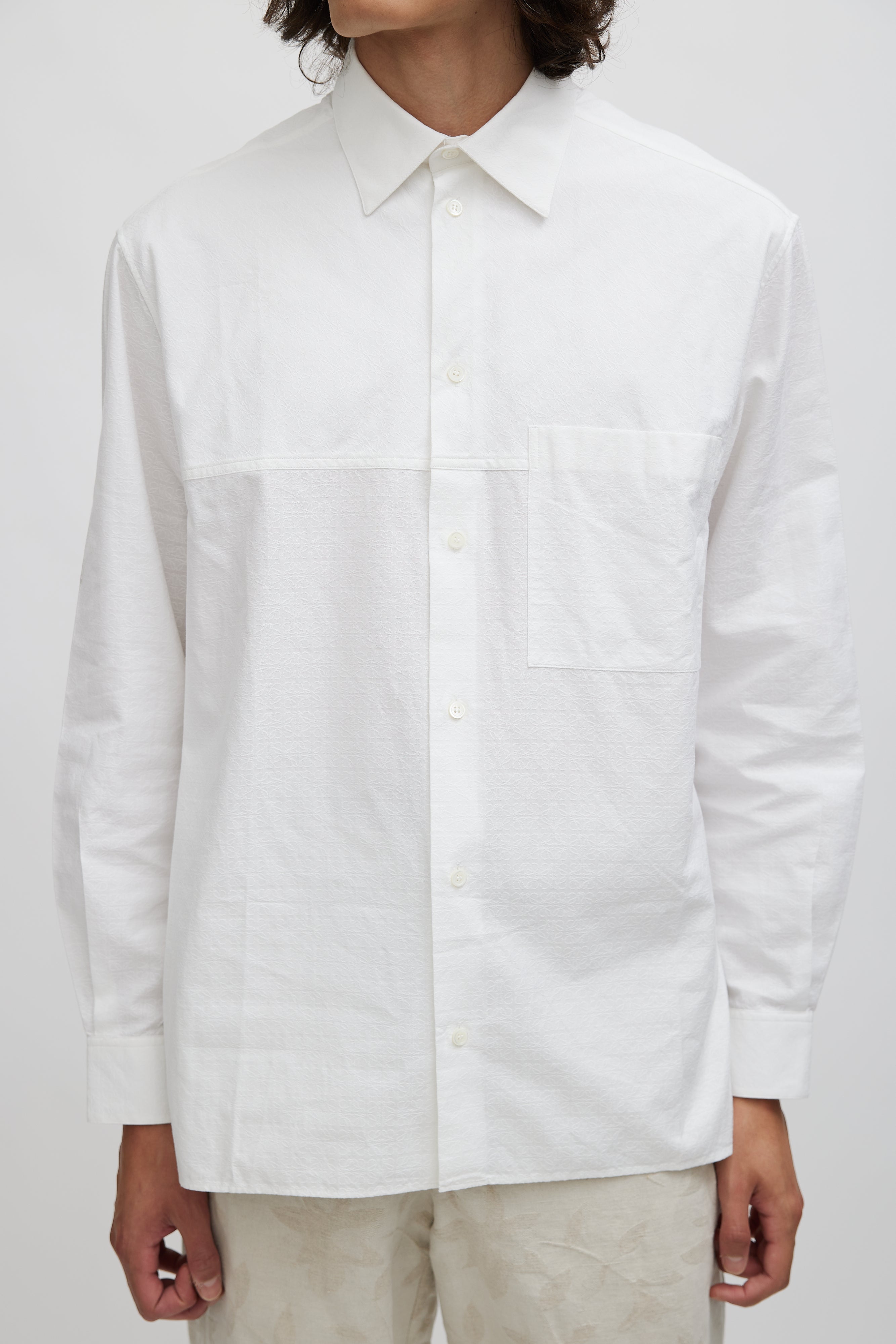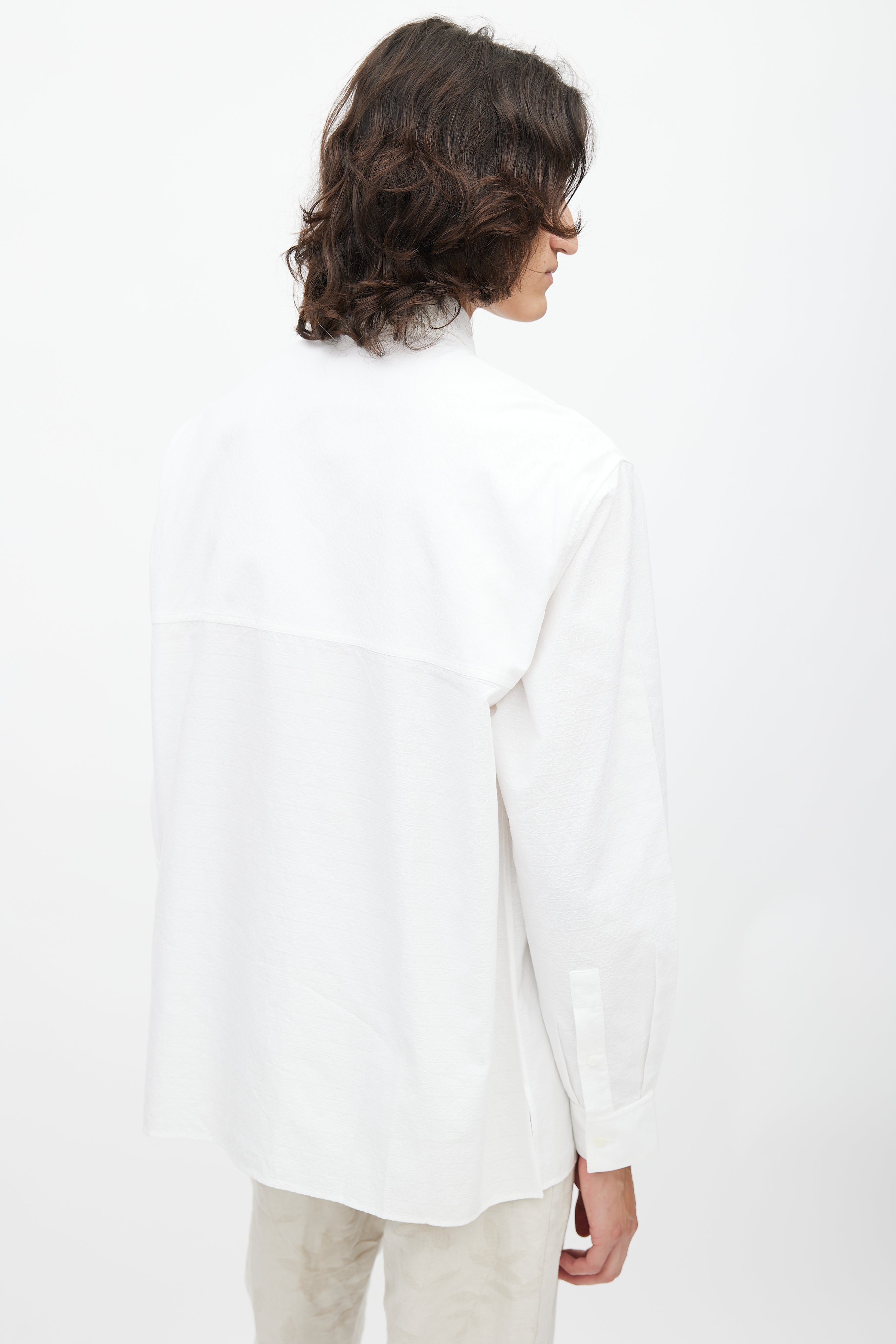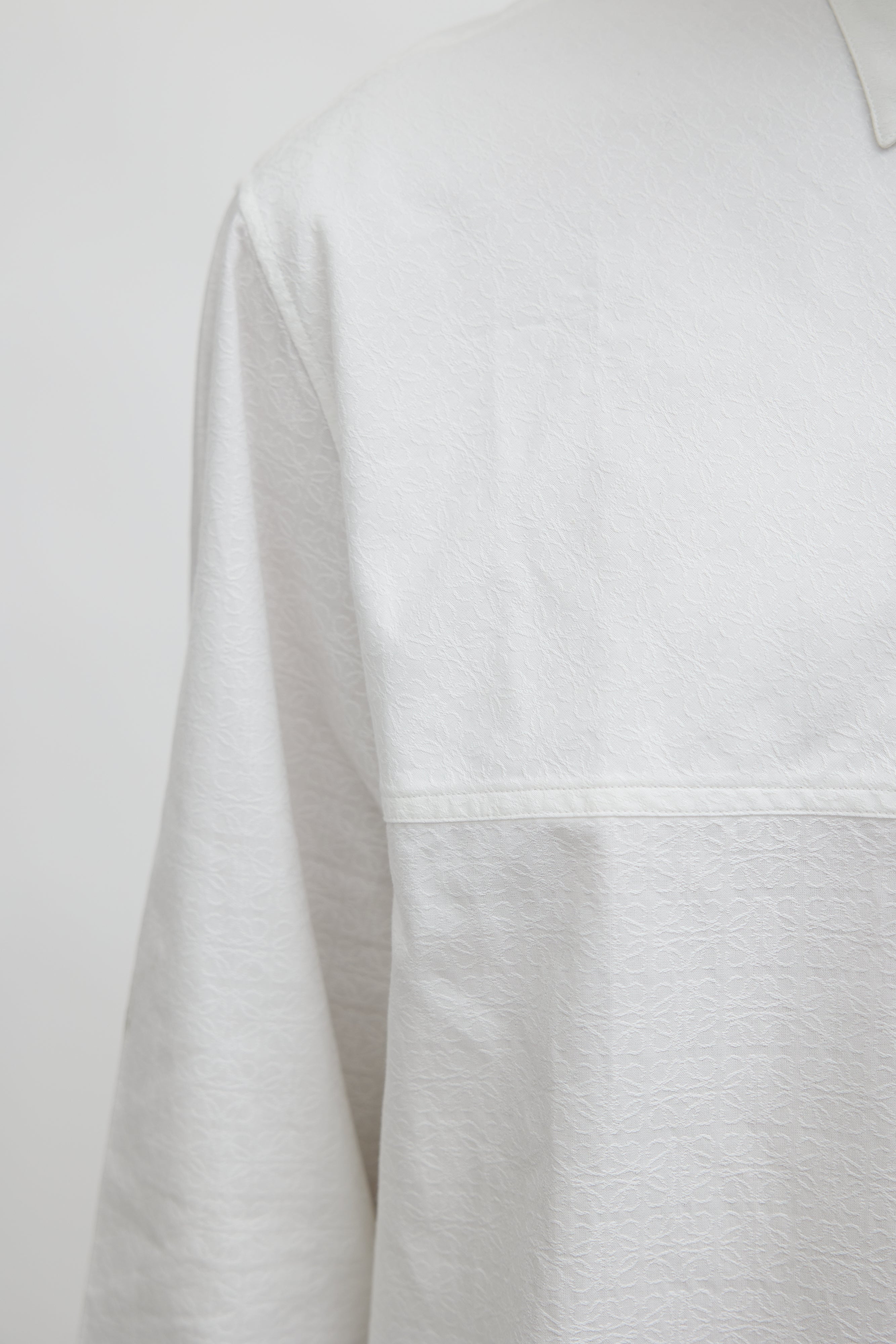 Pre-owned Loewe white shirt featuring a tonal jacquard monogram print throughout, pointed collar, long sleeves with buttoned cuffs, one patch pocket at chest, and button up front.