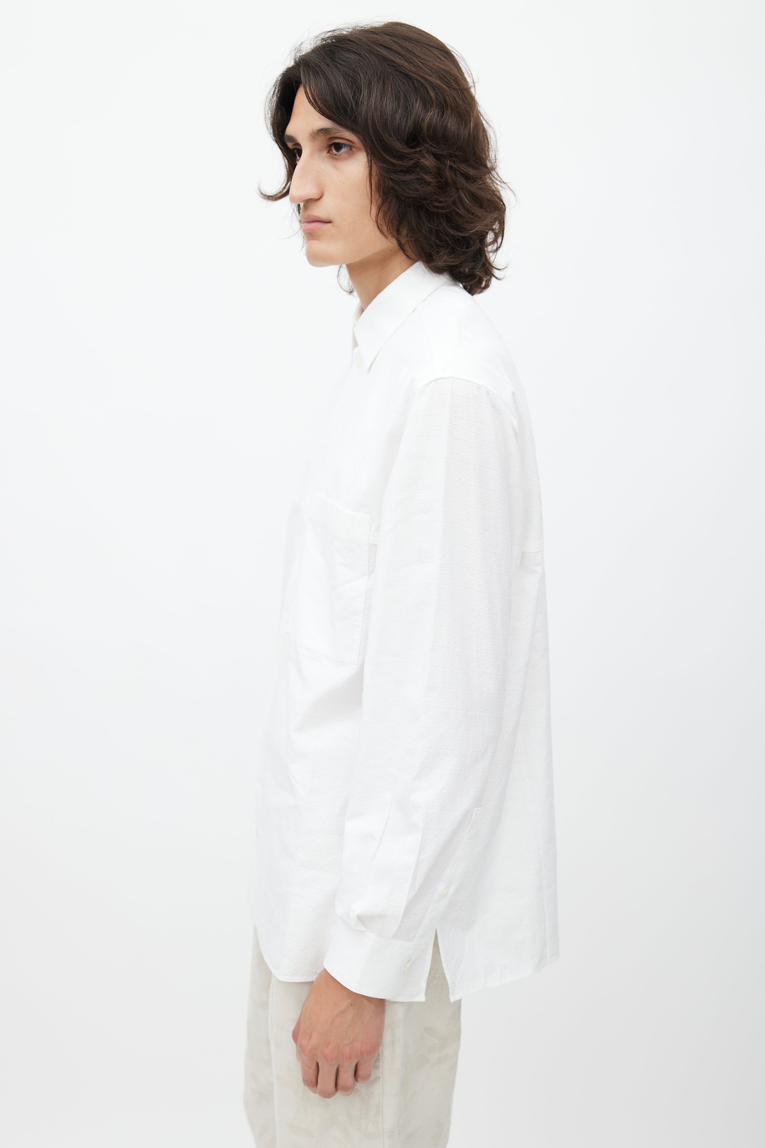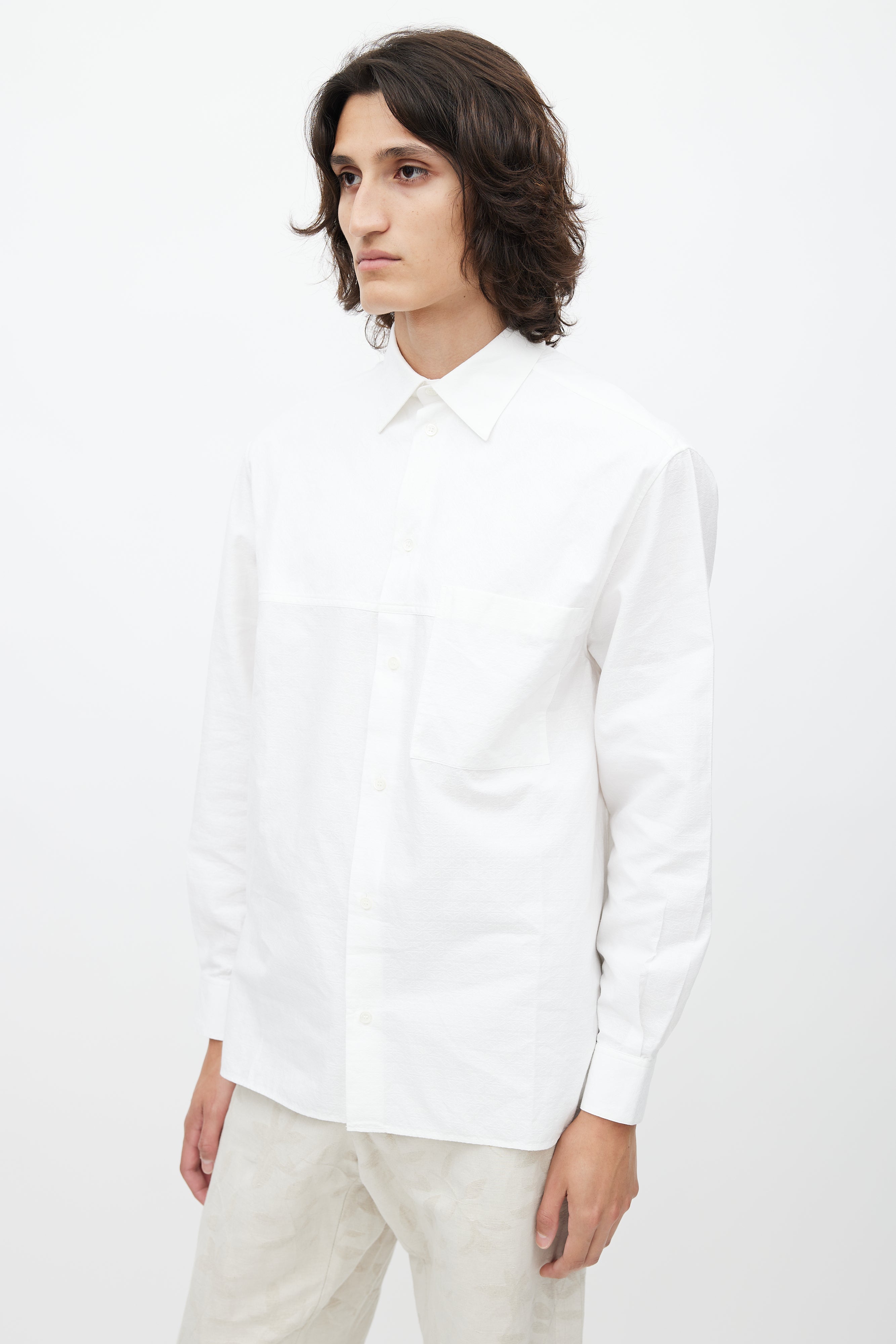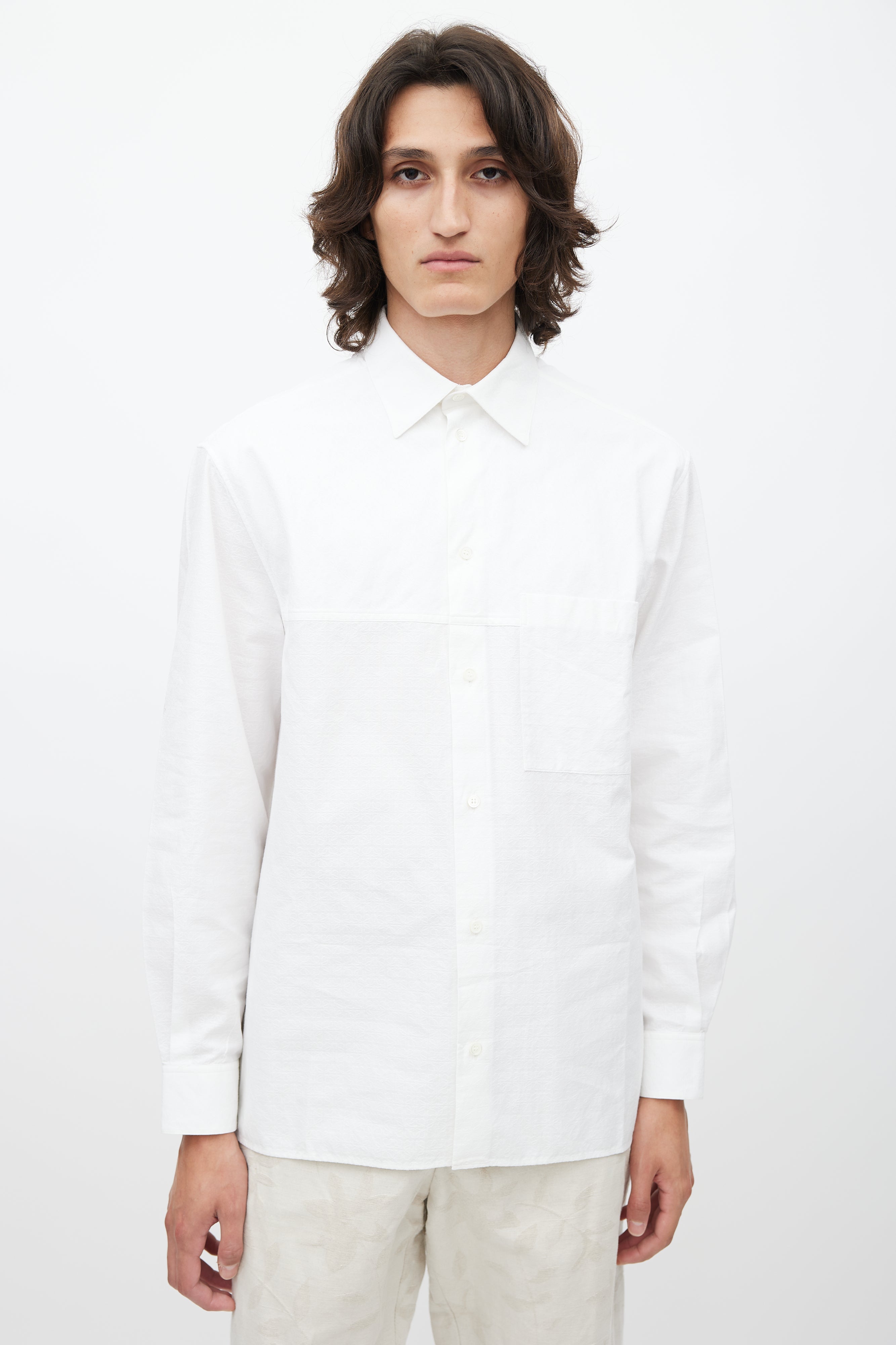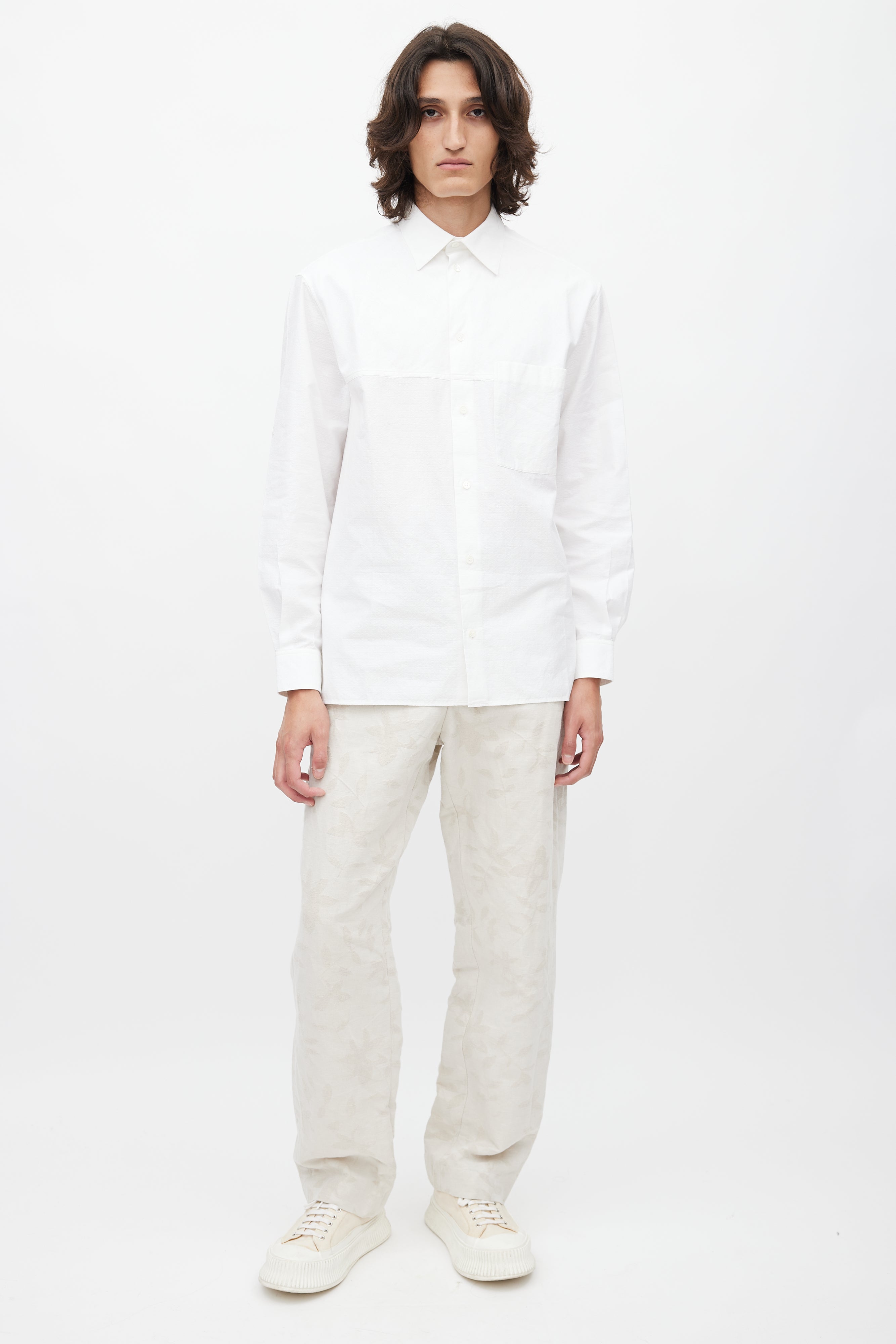 Pre-owned Loewe white shirt featuring a tonal jacquard monogram print throughout, pointed collar, long sleeves with buttoned cuffs, one patch pocket at chest, and button up front.