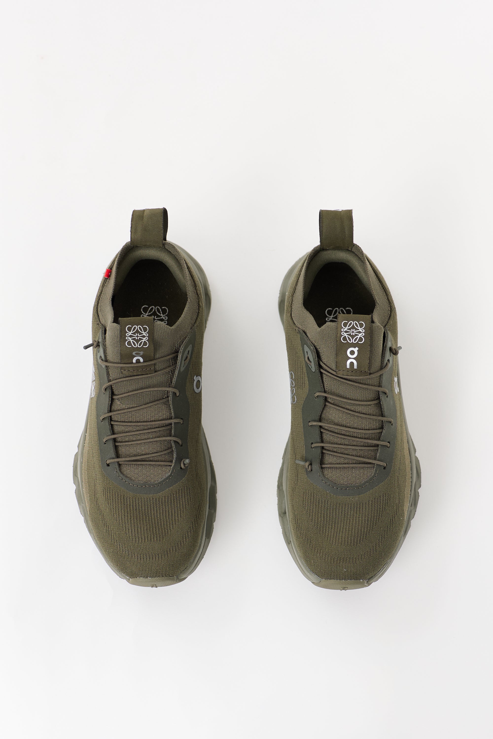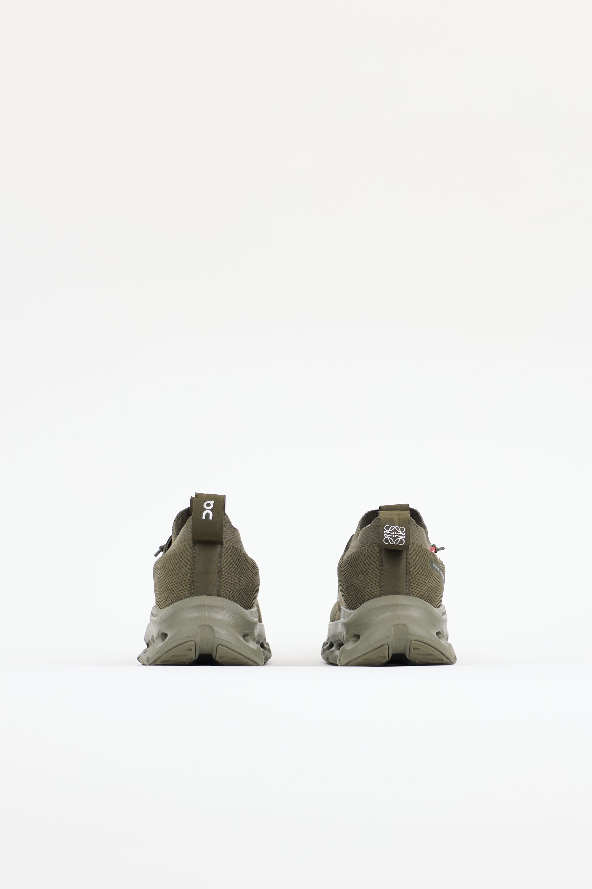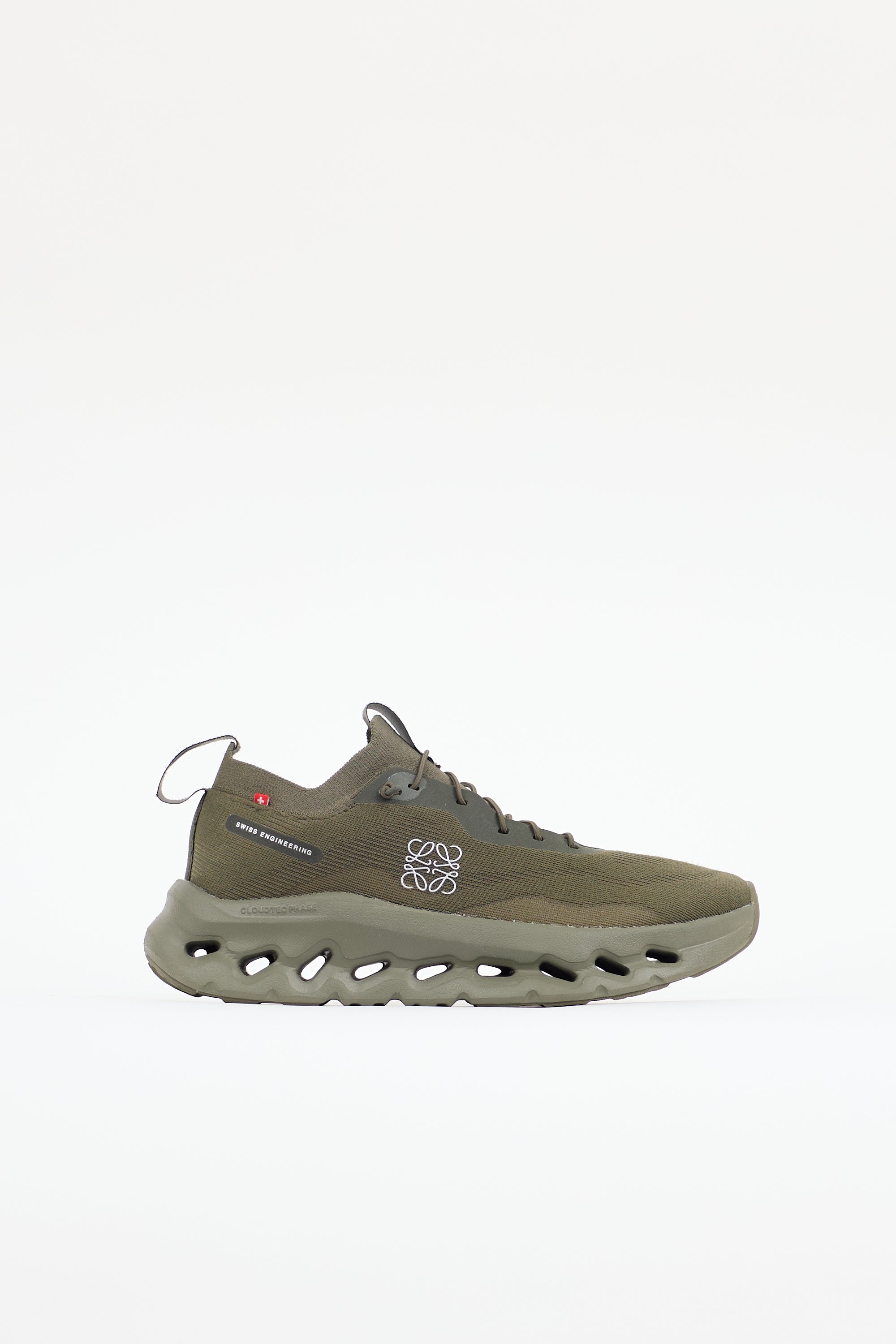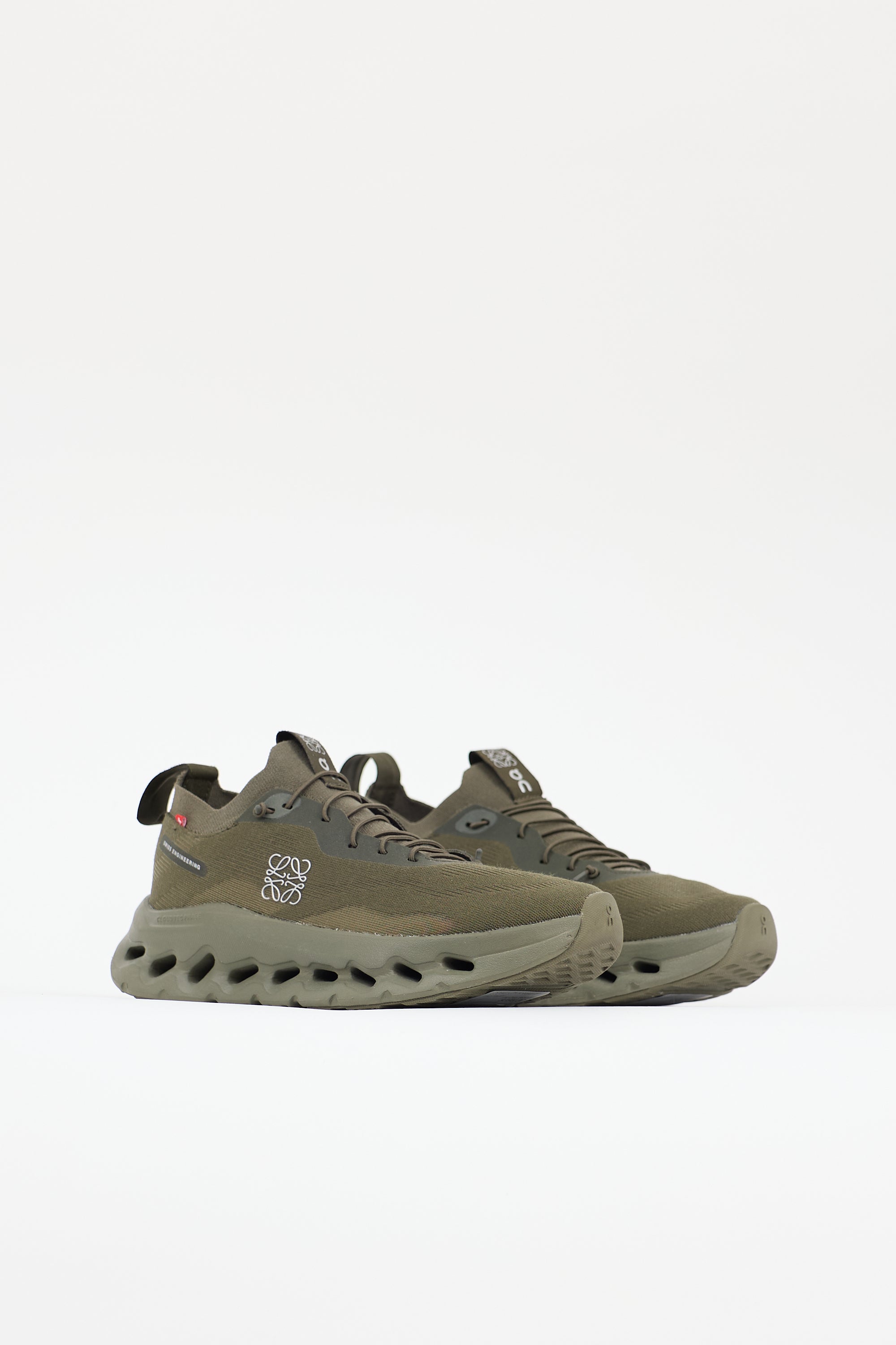 Pre-owned Loewe x ON green Cloudtilt sneaker featuring a rounded toe, elasticized lace front, Anagram logo at sides, logo tag at tongue and counter, sock collar, and sculptural rubber sole.