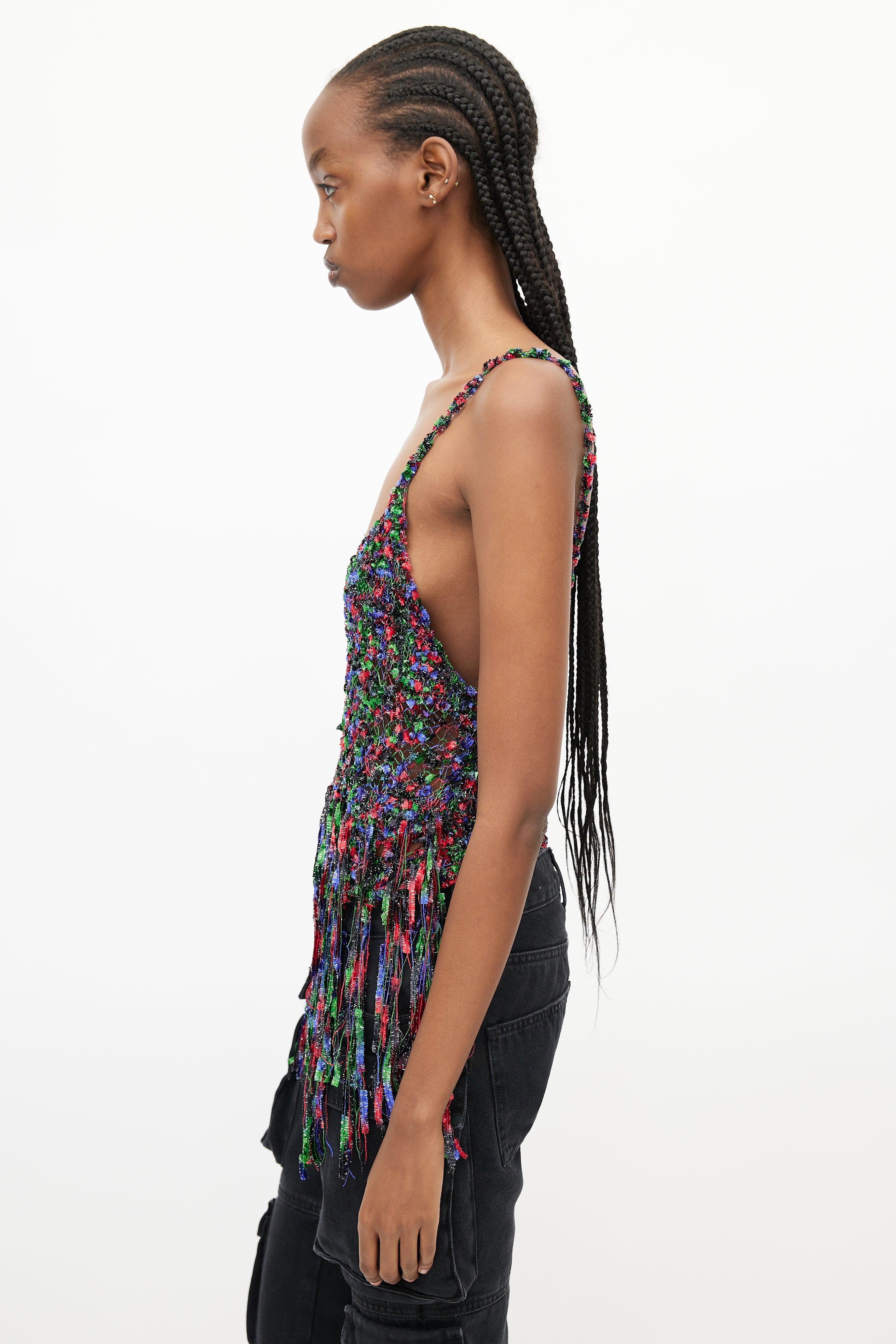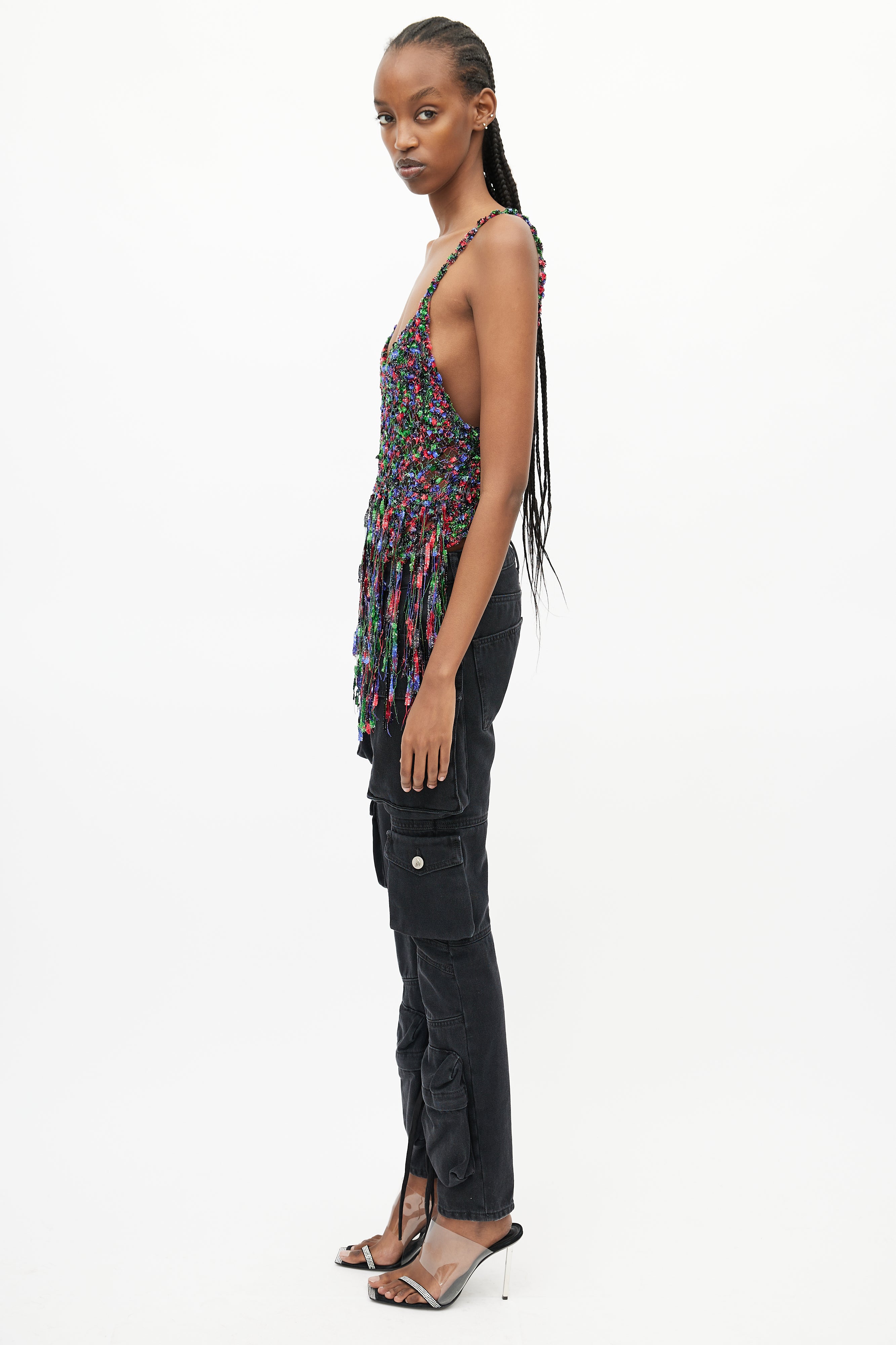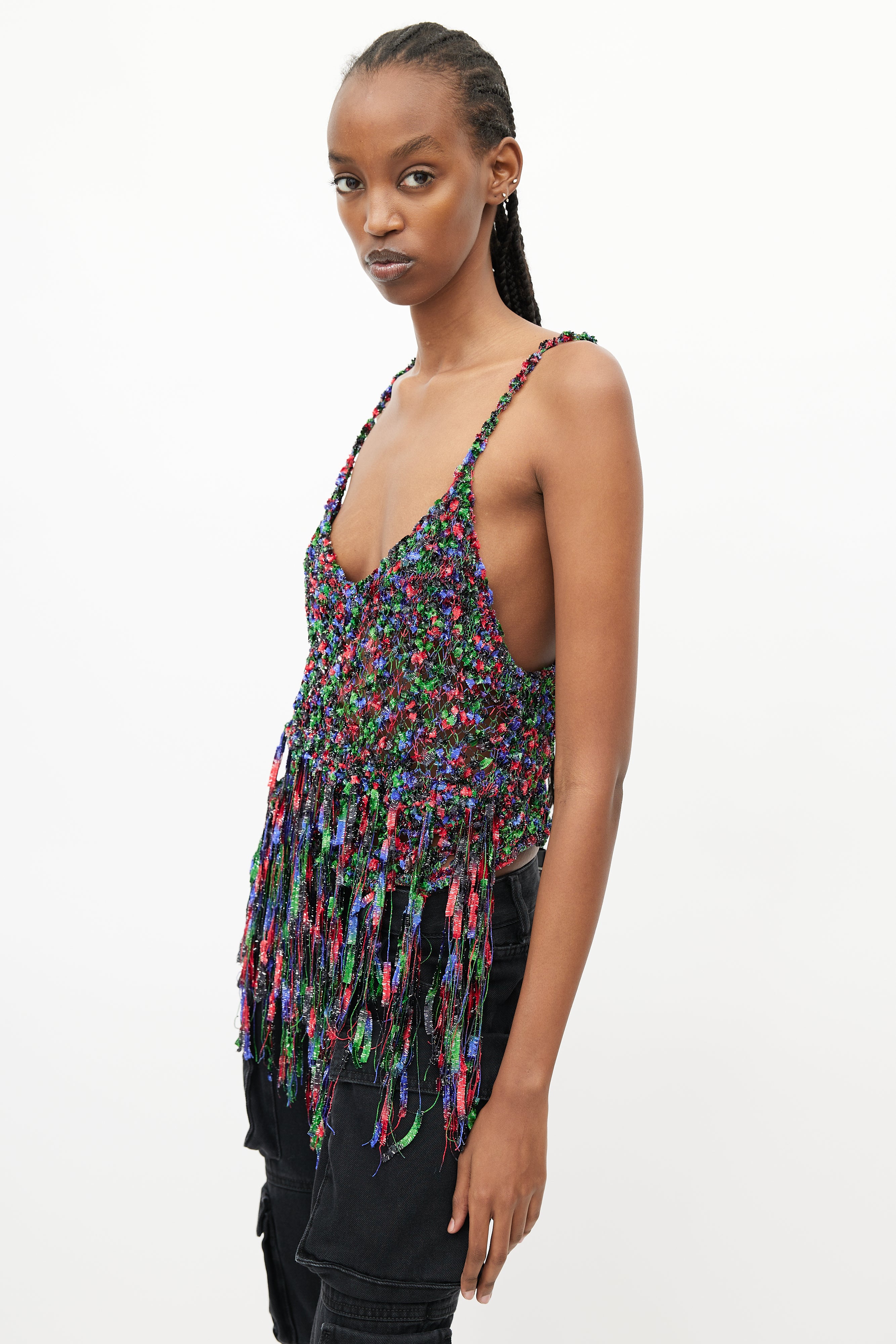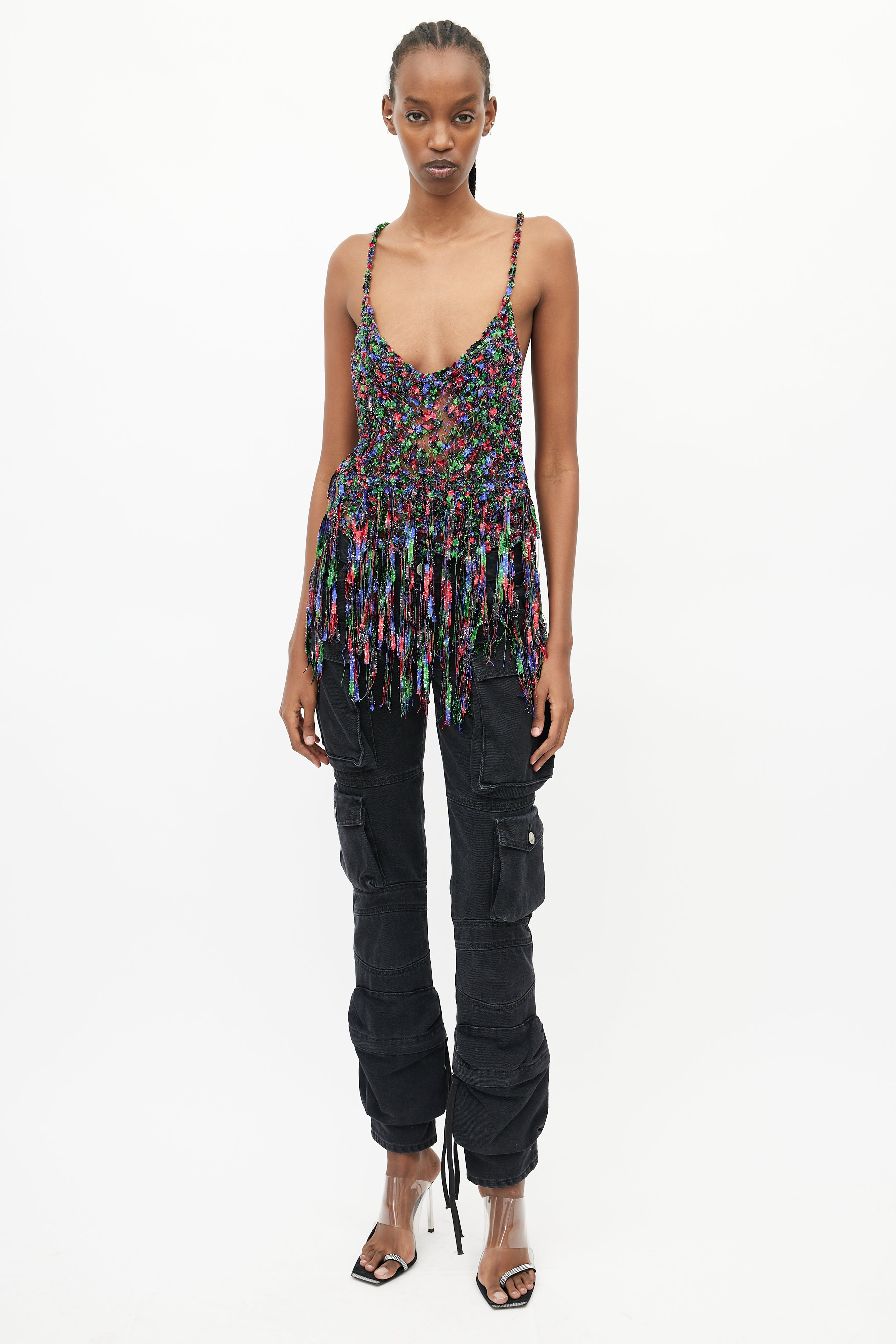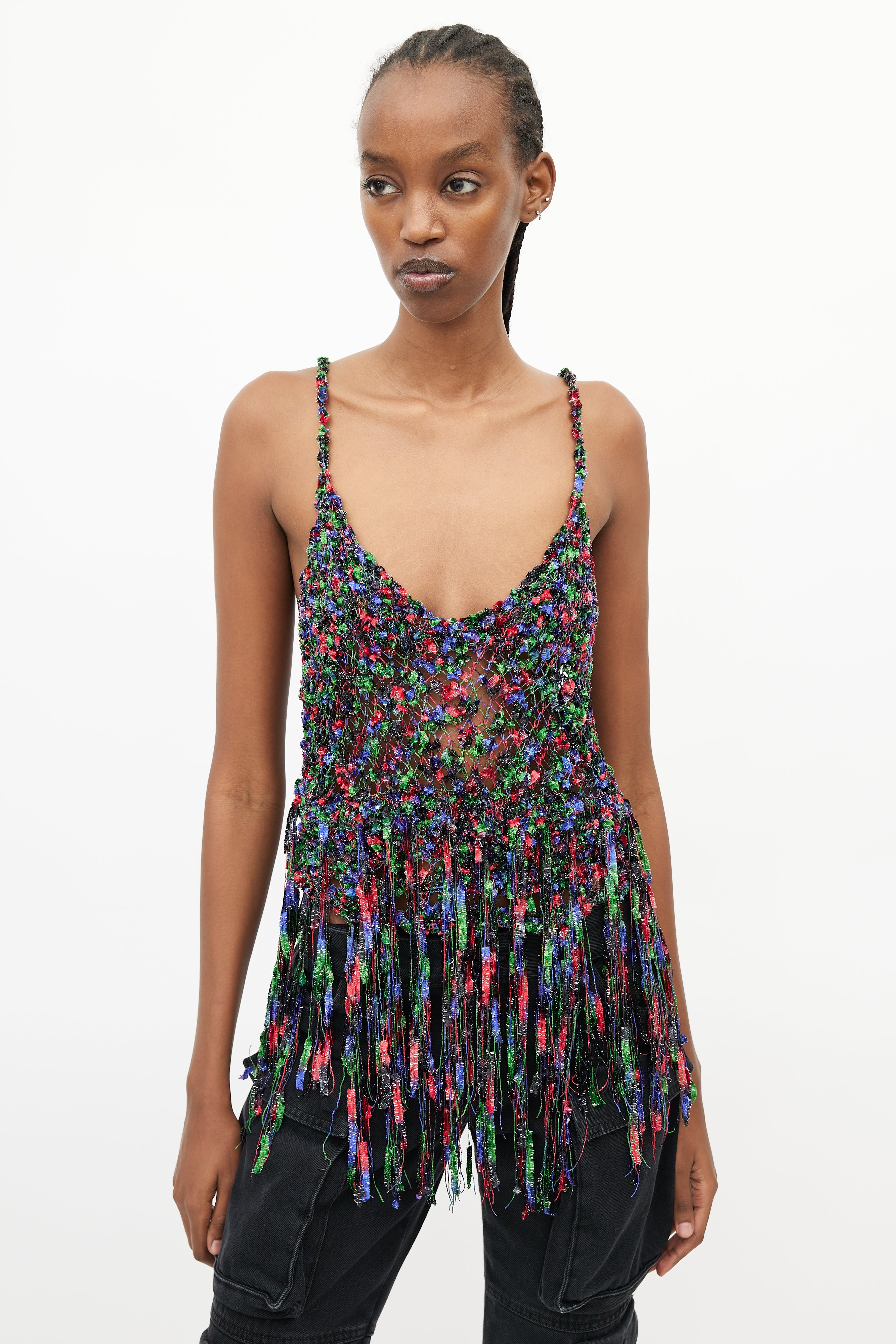 Pre-owned Loewe x Paula's Ibiza multicolour top featuring spaghetti straps, plunge neckline, mesh knit, and metallic fringe hem.