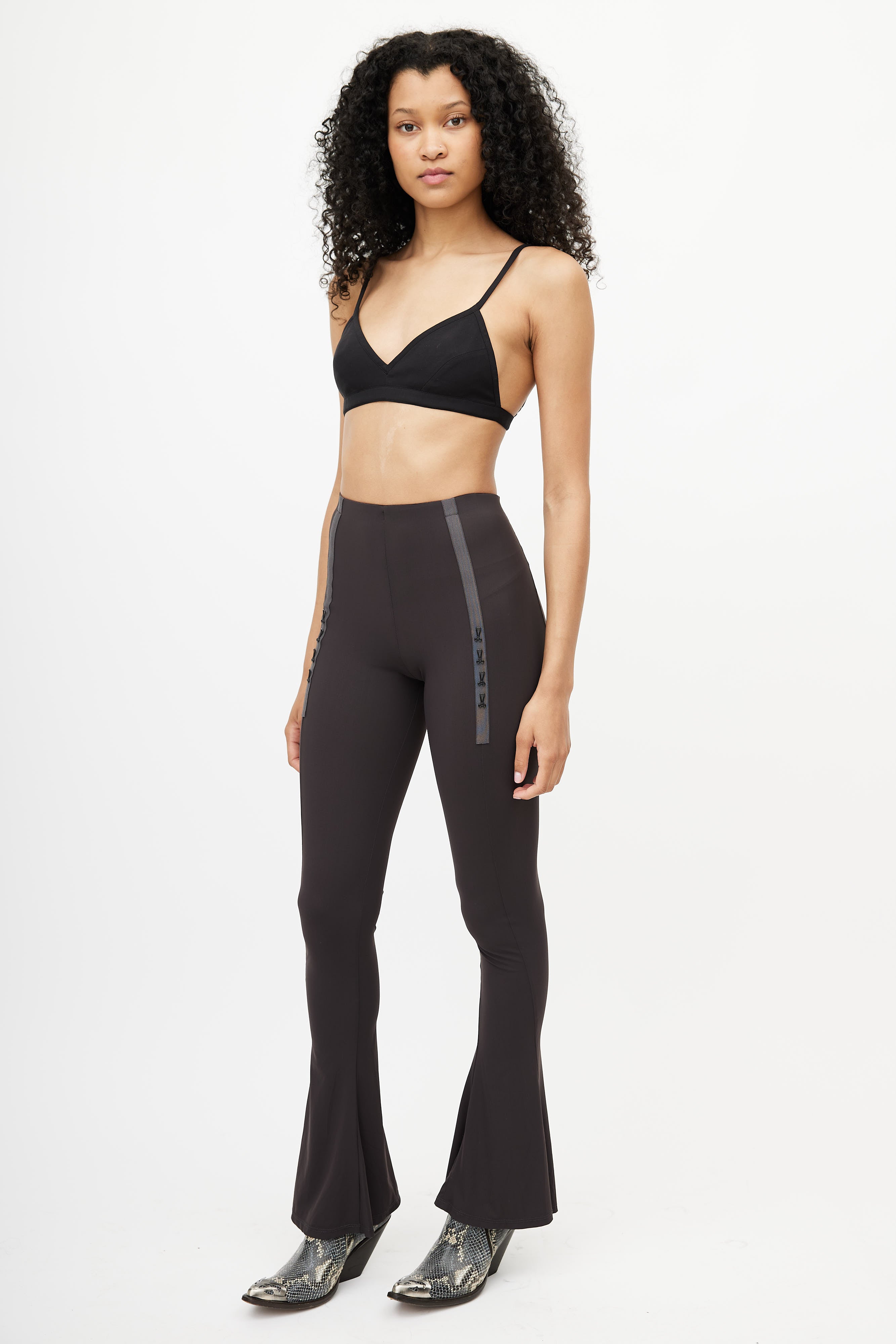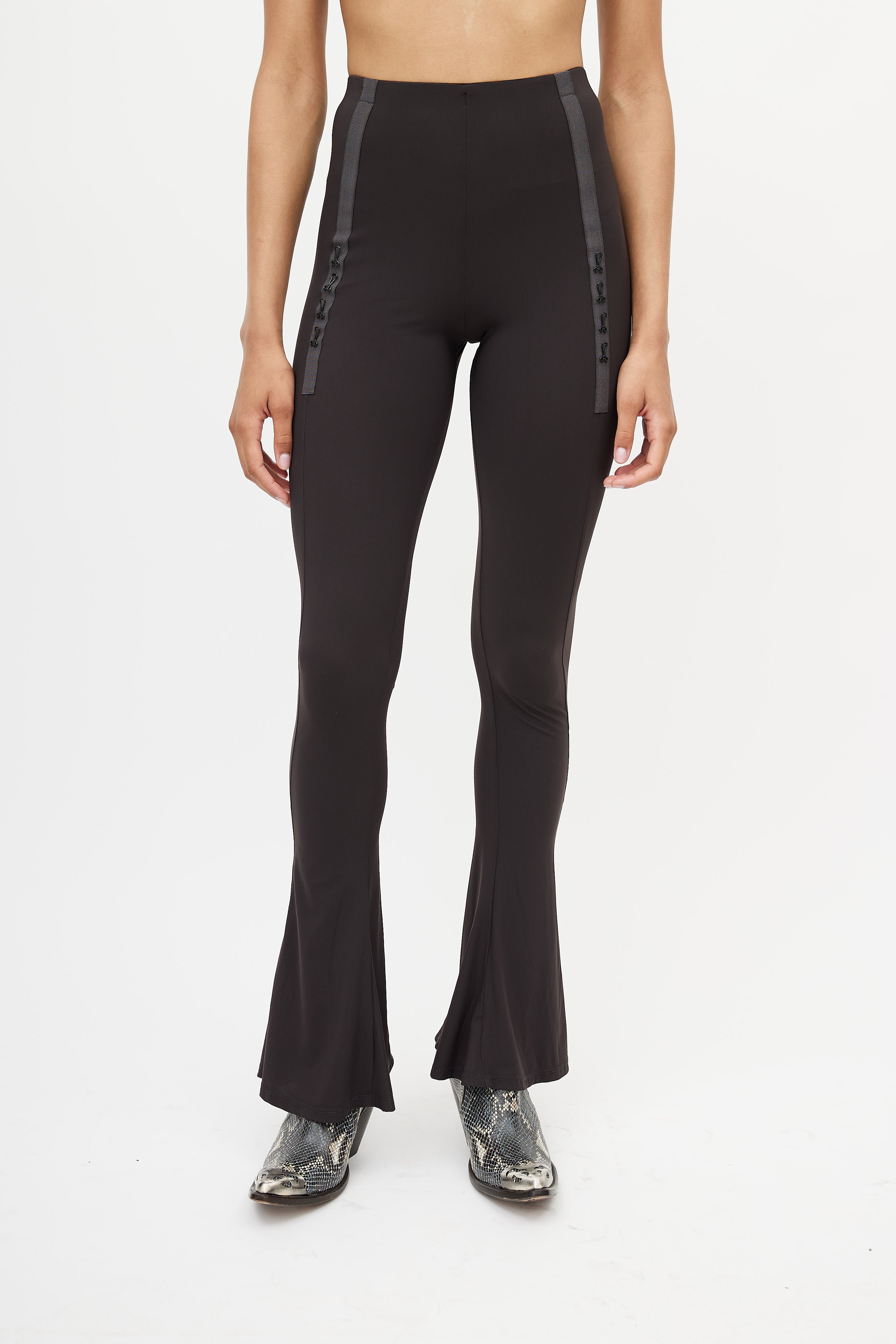 Pre-owned KNWLS brown leggings featuring an elasticized waistband, webbed panel at front with hook detail, and flared leg.