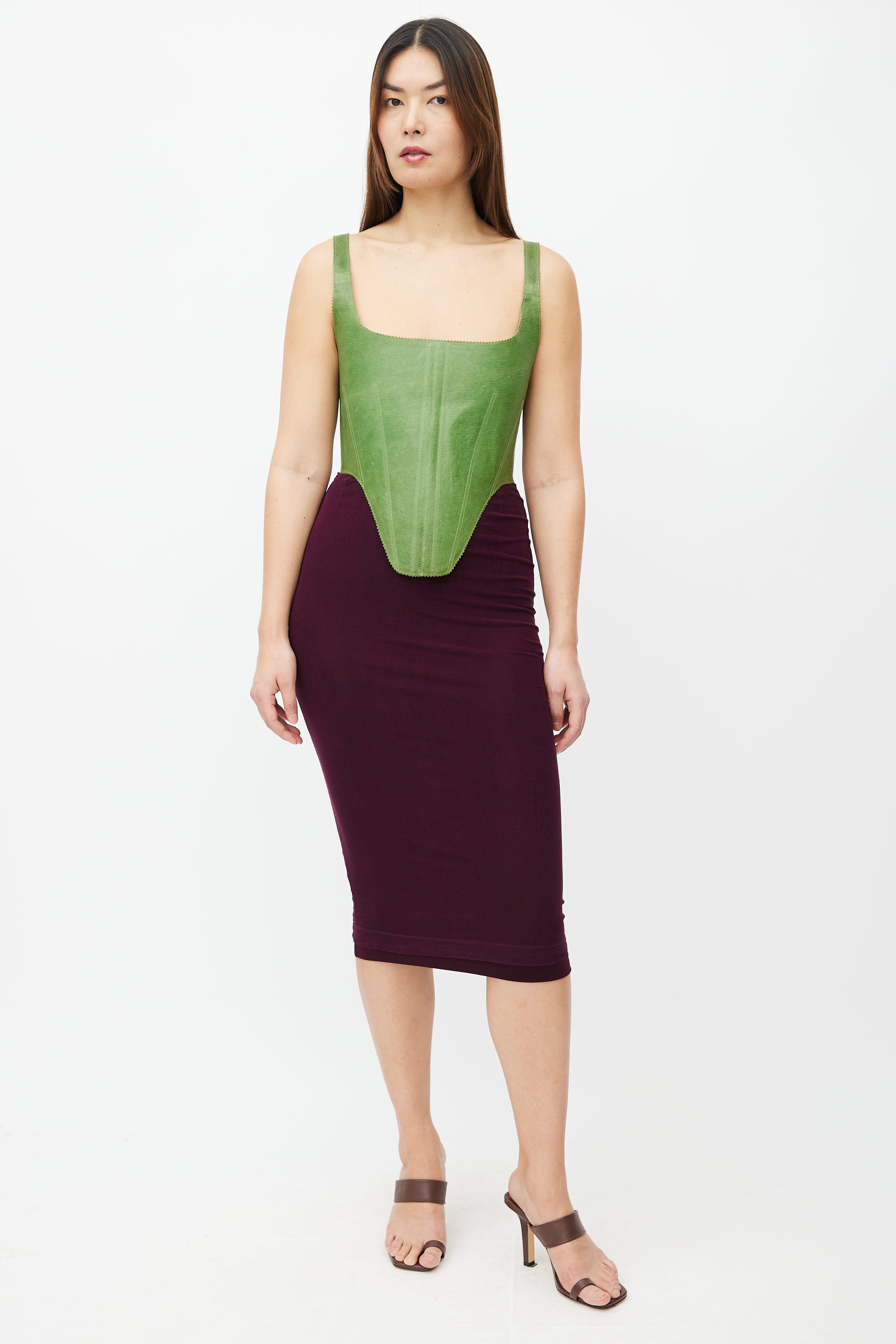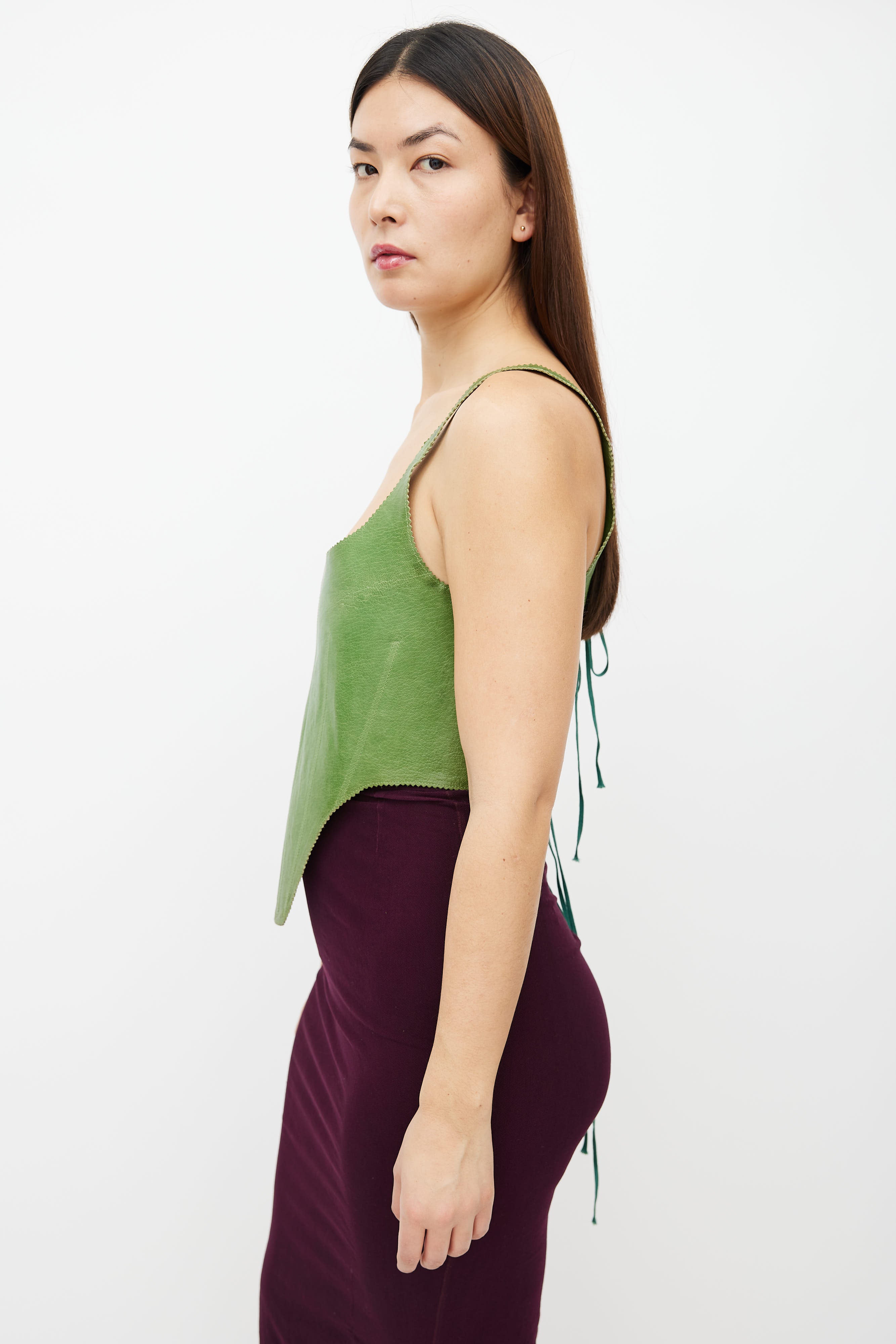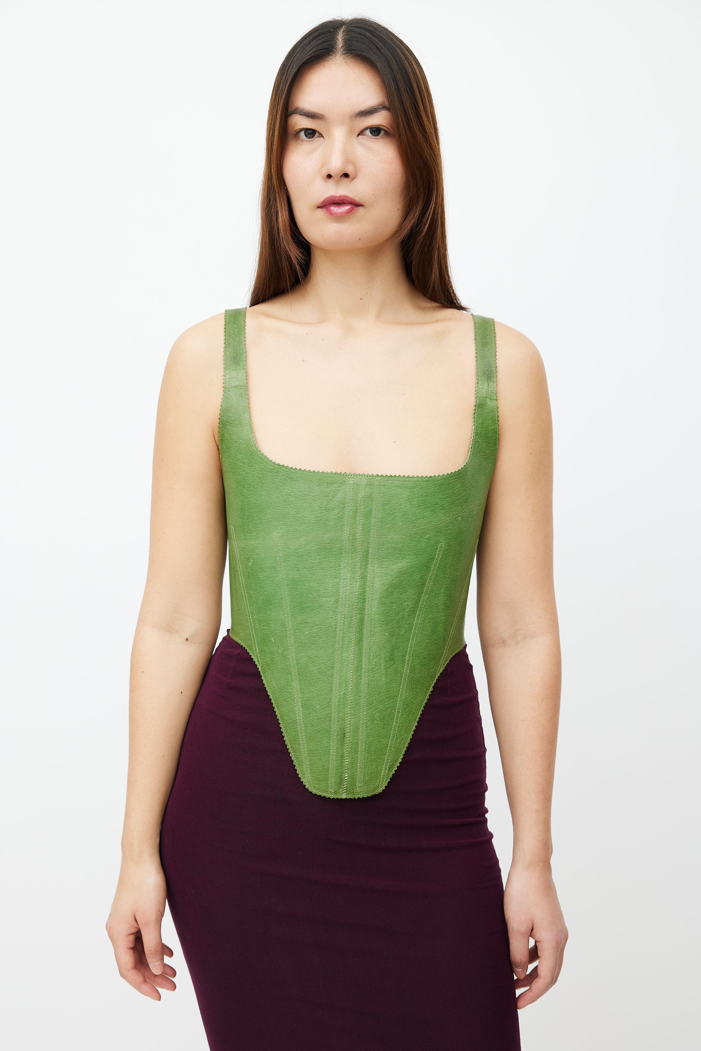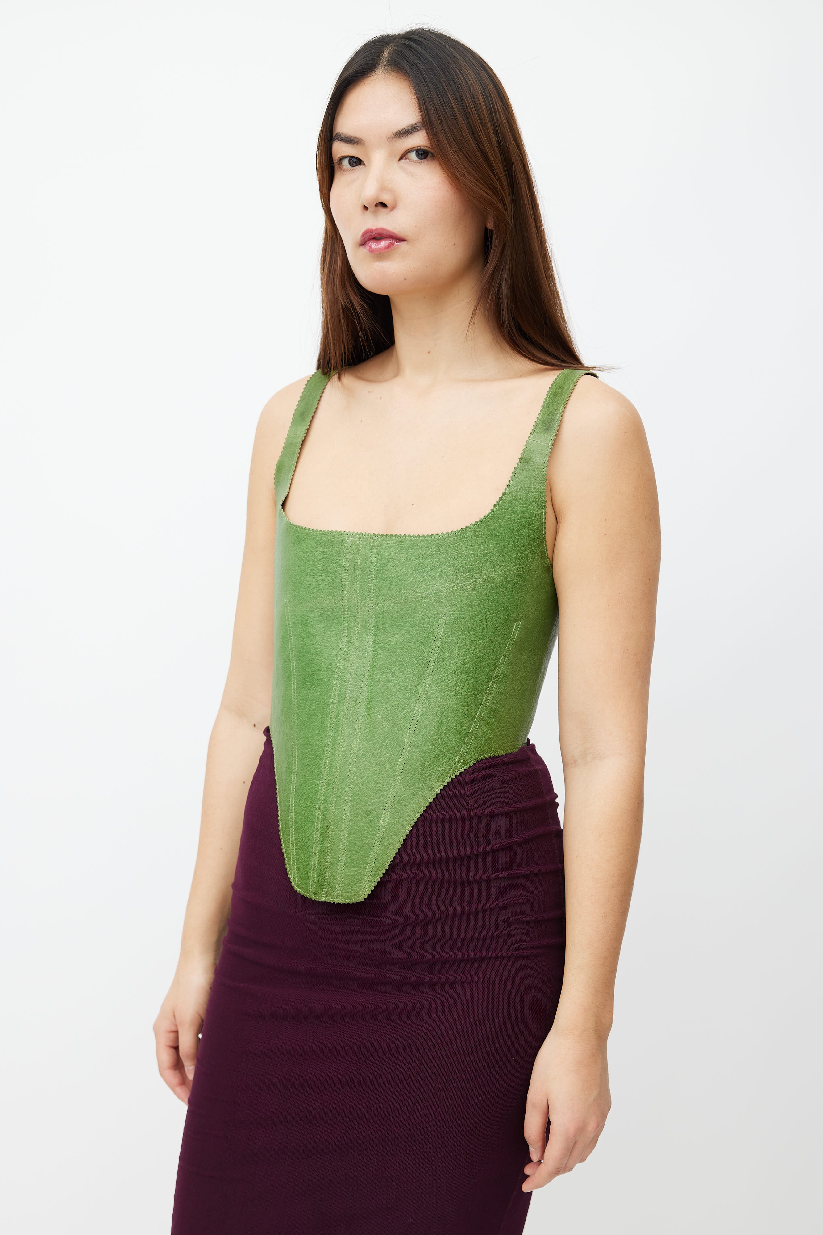 Pre-owned KNWLS Bullet Corset in green featuring flat straps, jagged raw hem, tonal stitching throughout, silver-tone grommets at back and teal drawstring lace-up closure. Clipped to fit model.