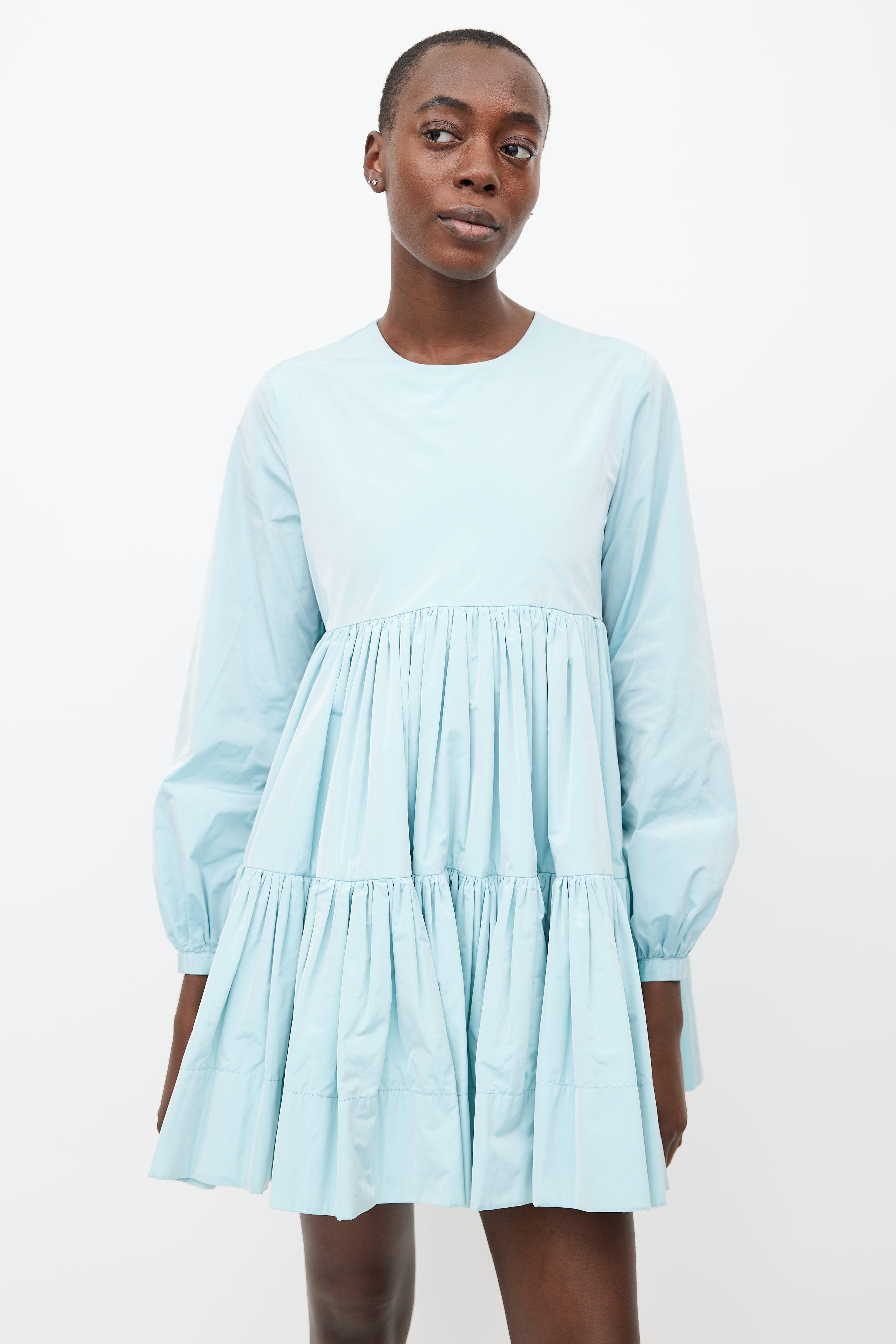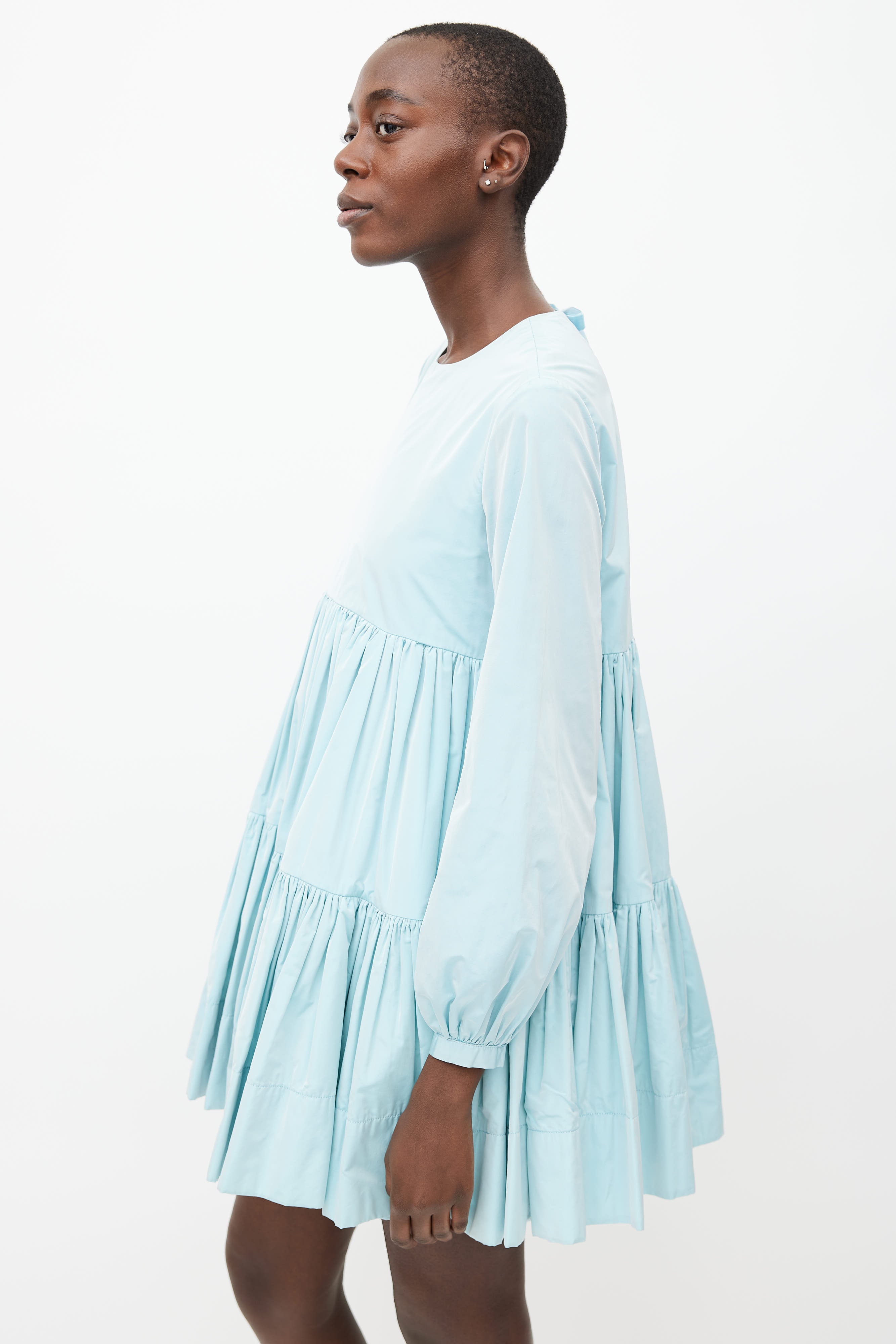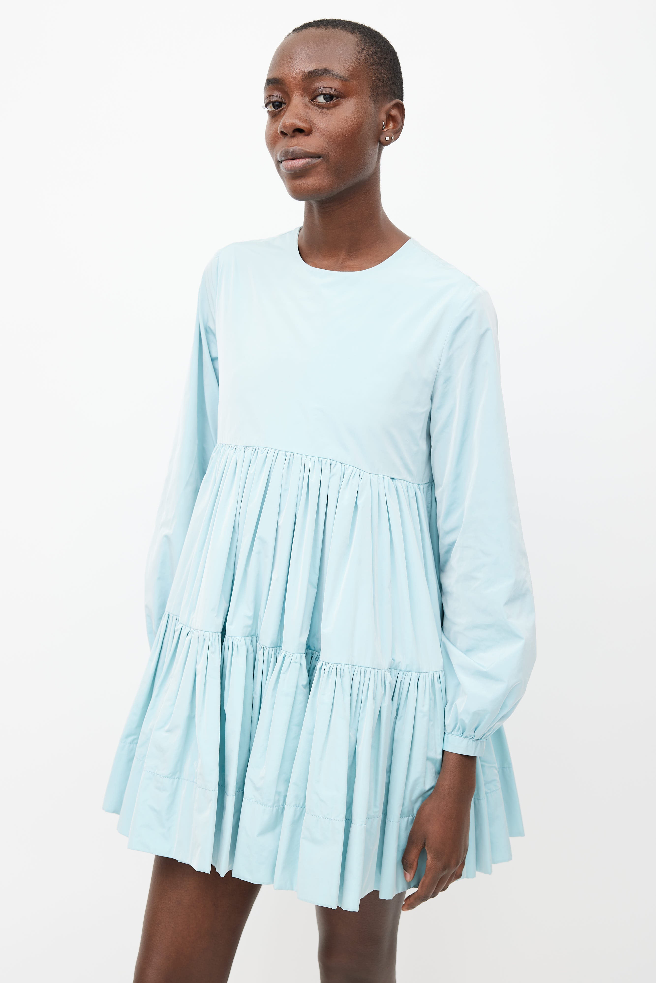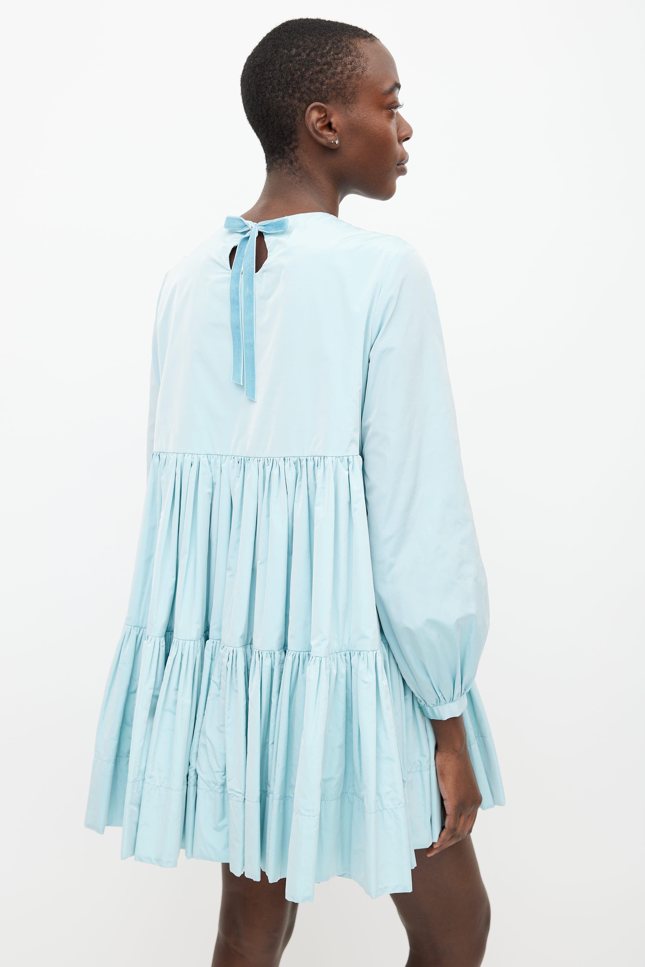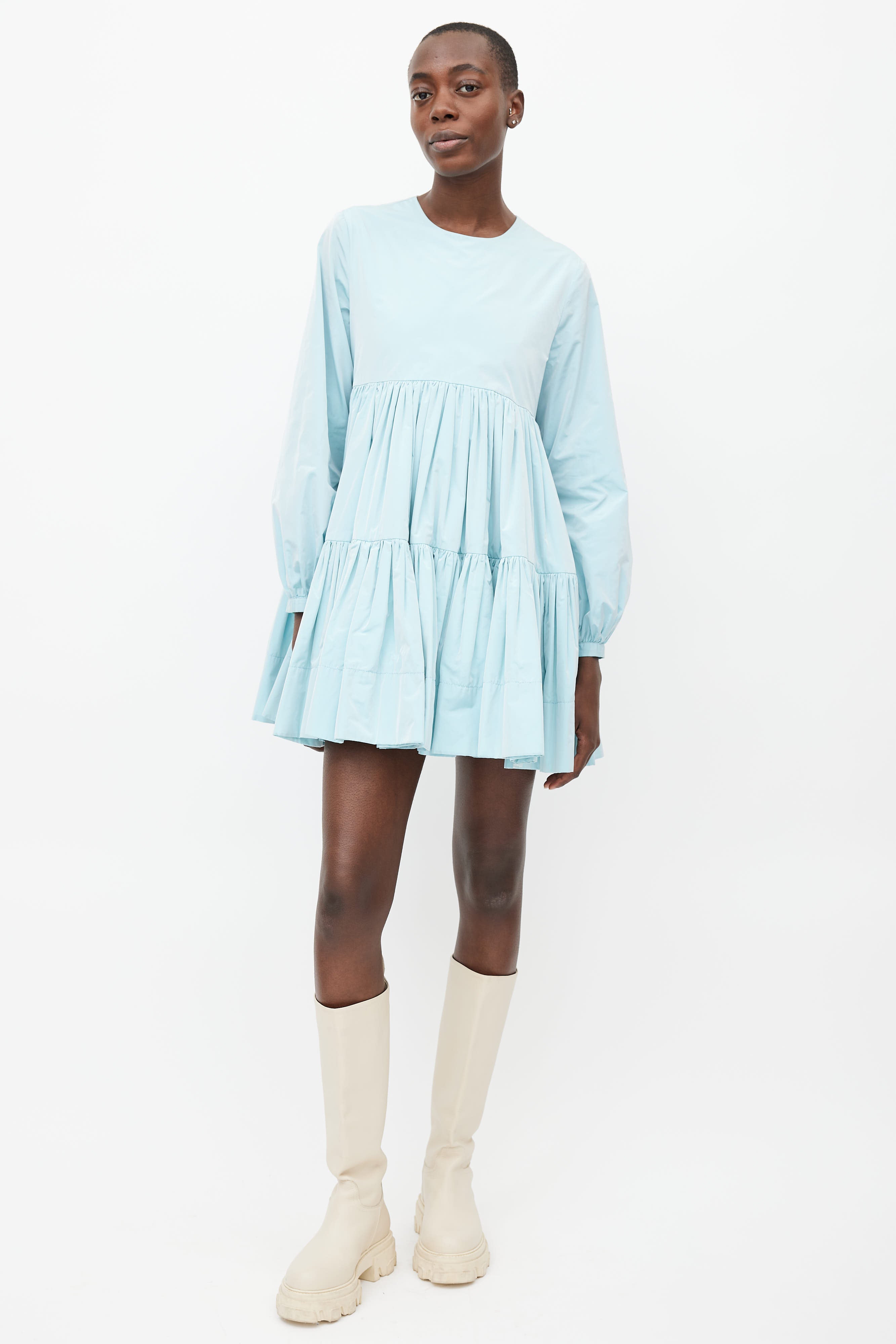 Pre-owned Molly Goddard blue baby doll dress featuring a crew neckline, tiered skirt, empire waistline, long sleeves with a gathered button closure cuff, and tie closure at back. Lined.