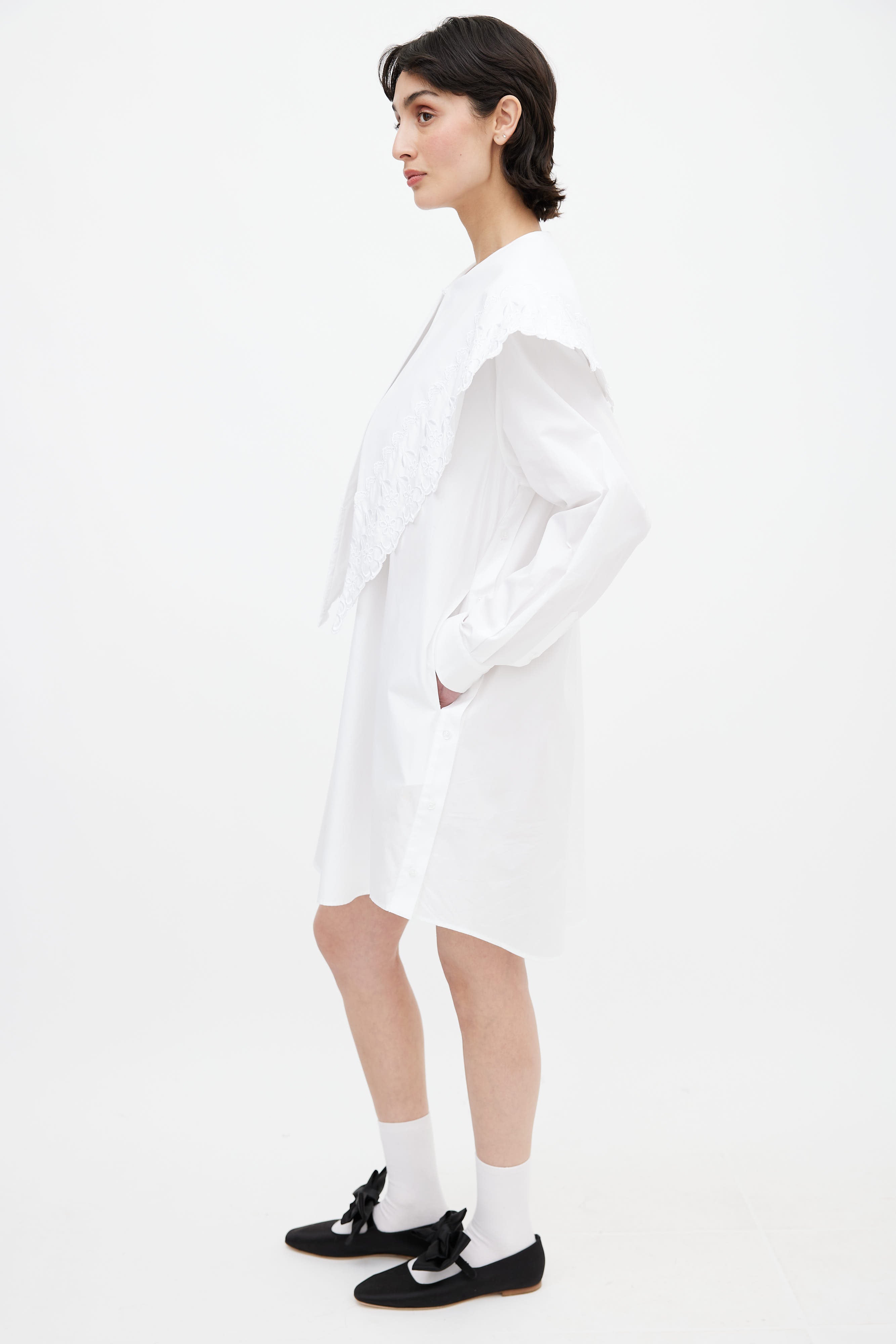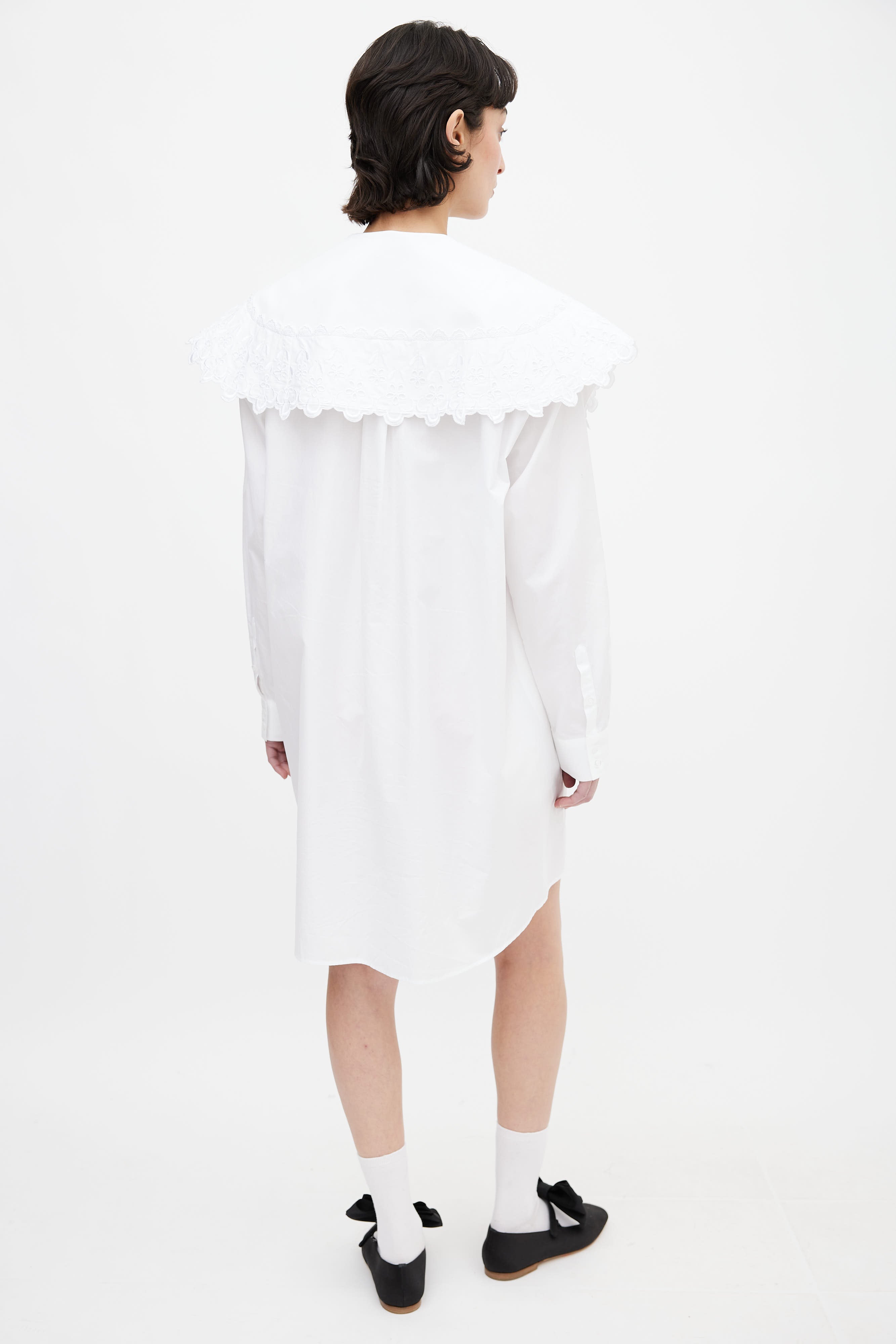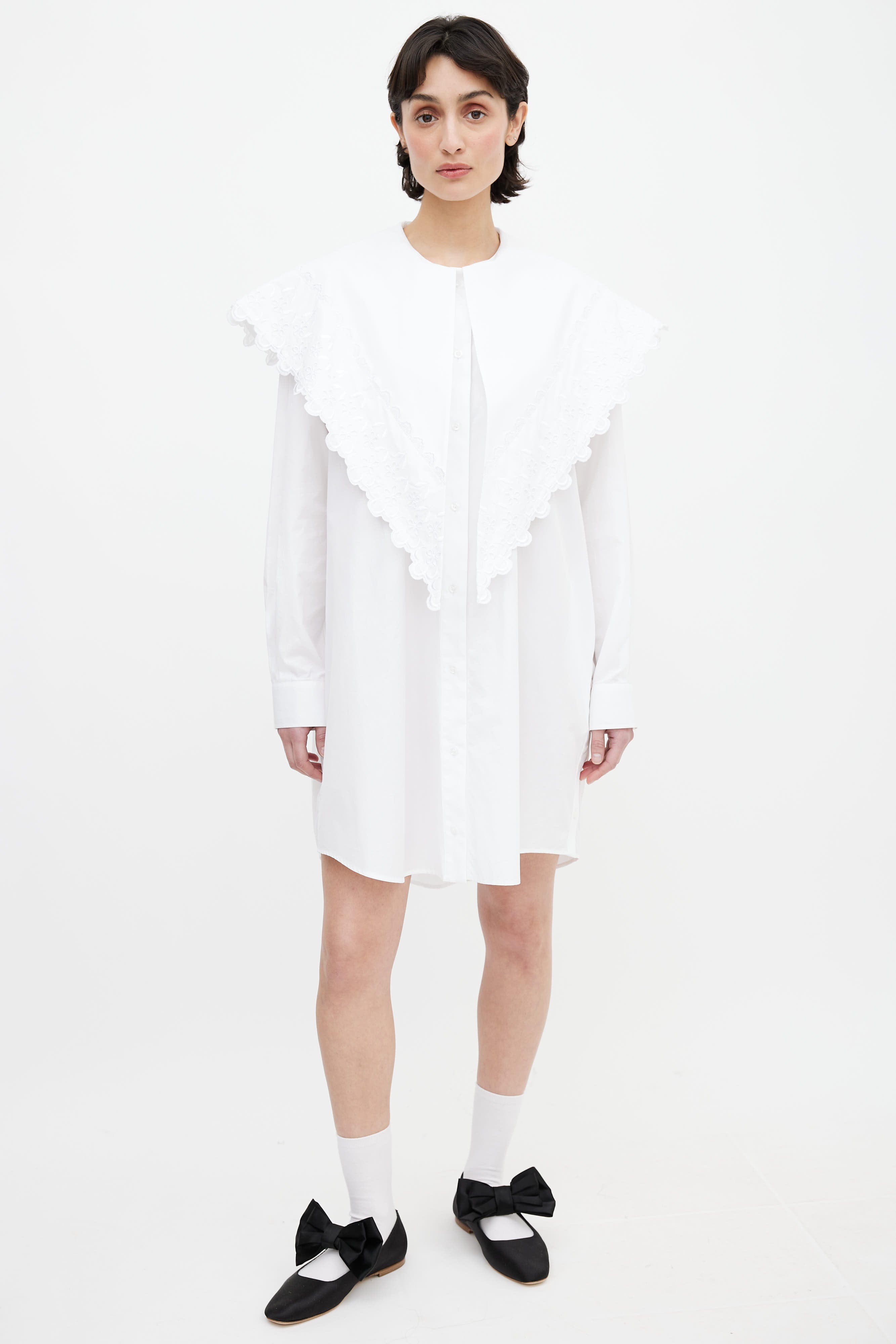 Pre-owned Simone Rocha white long sleeve dress featuring oversized point collar with embroidered eyelet trim, button up front, button placket at left side seam, buttoned cuffs and two side seam pockets.