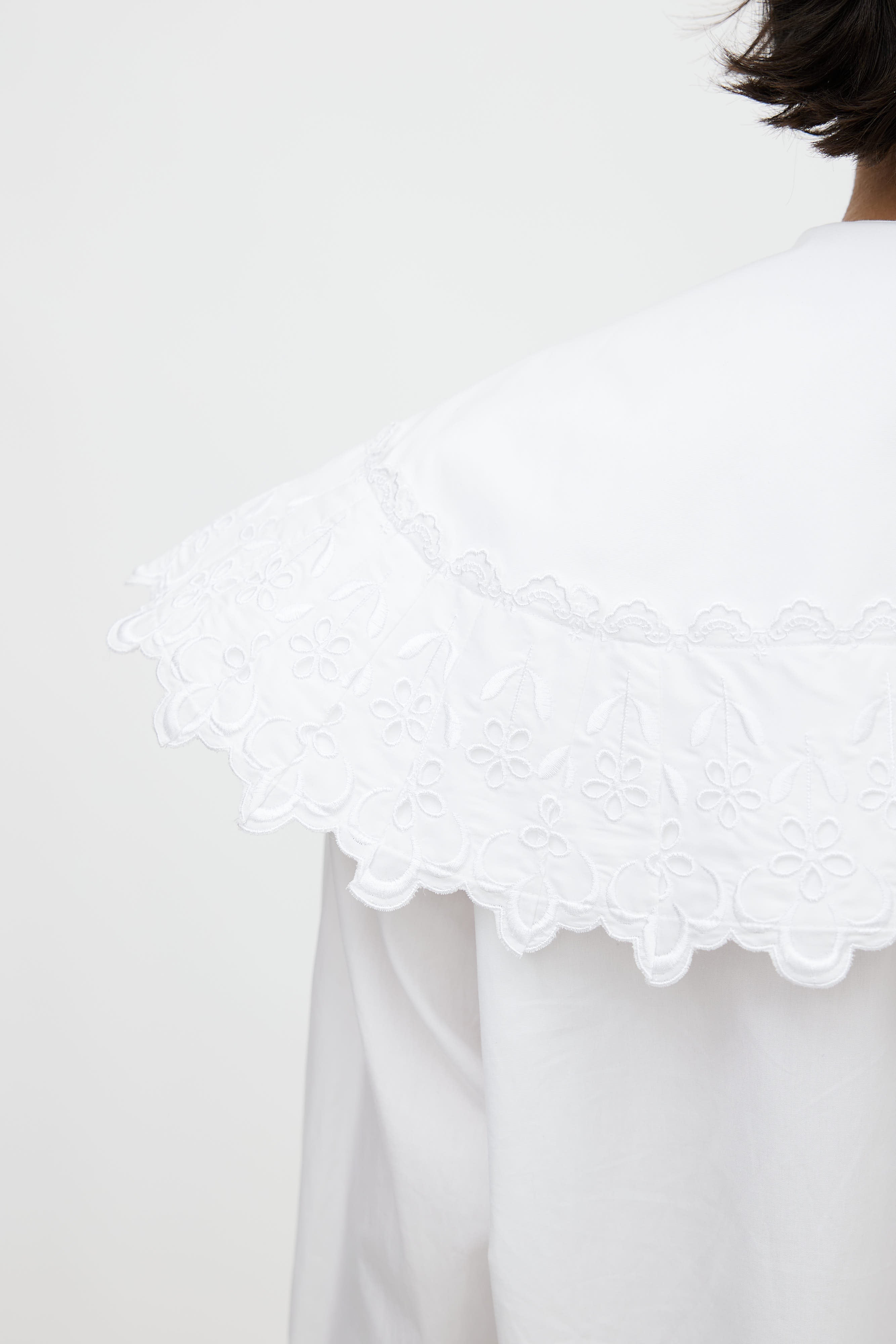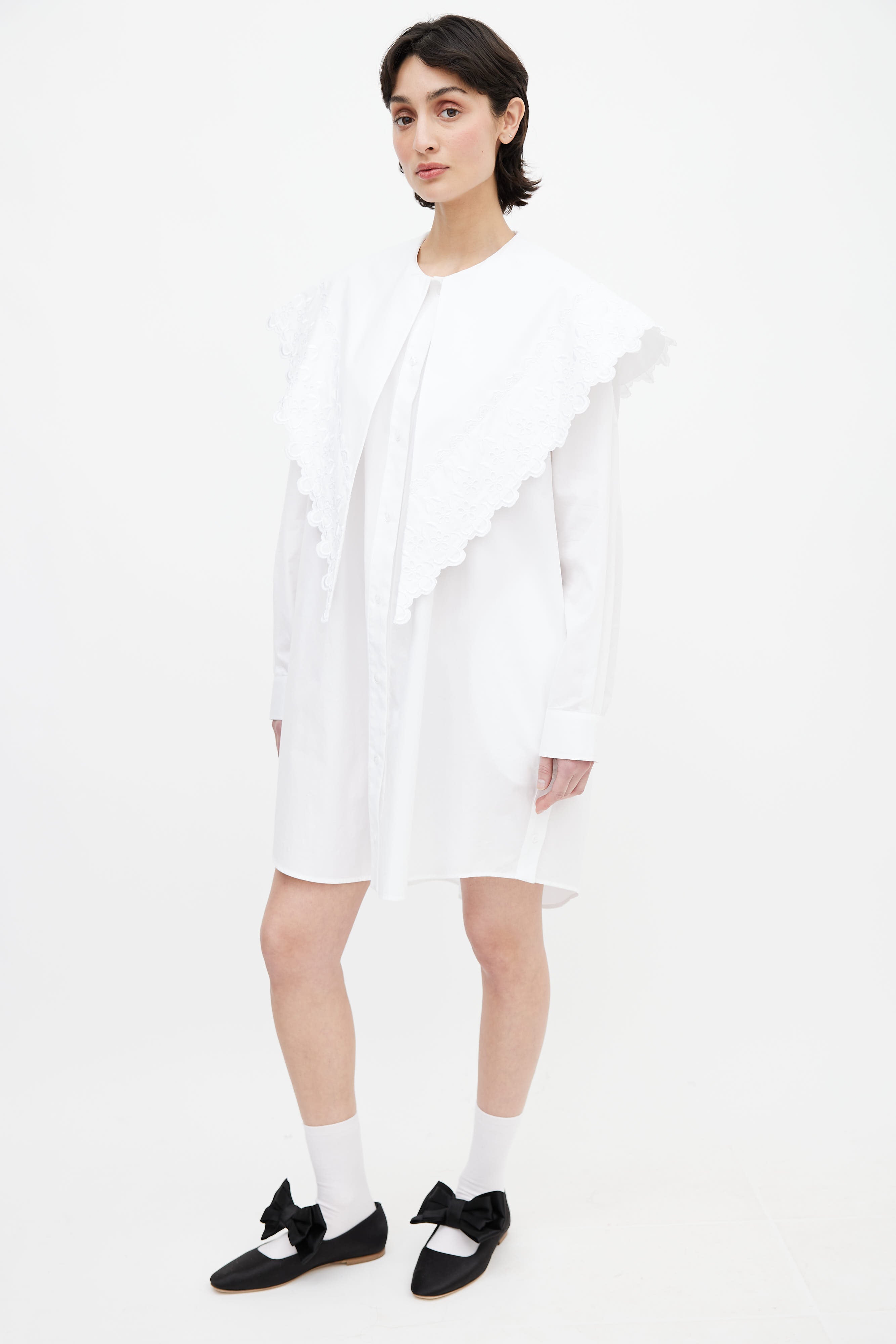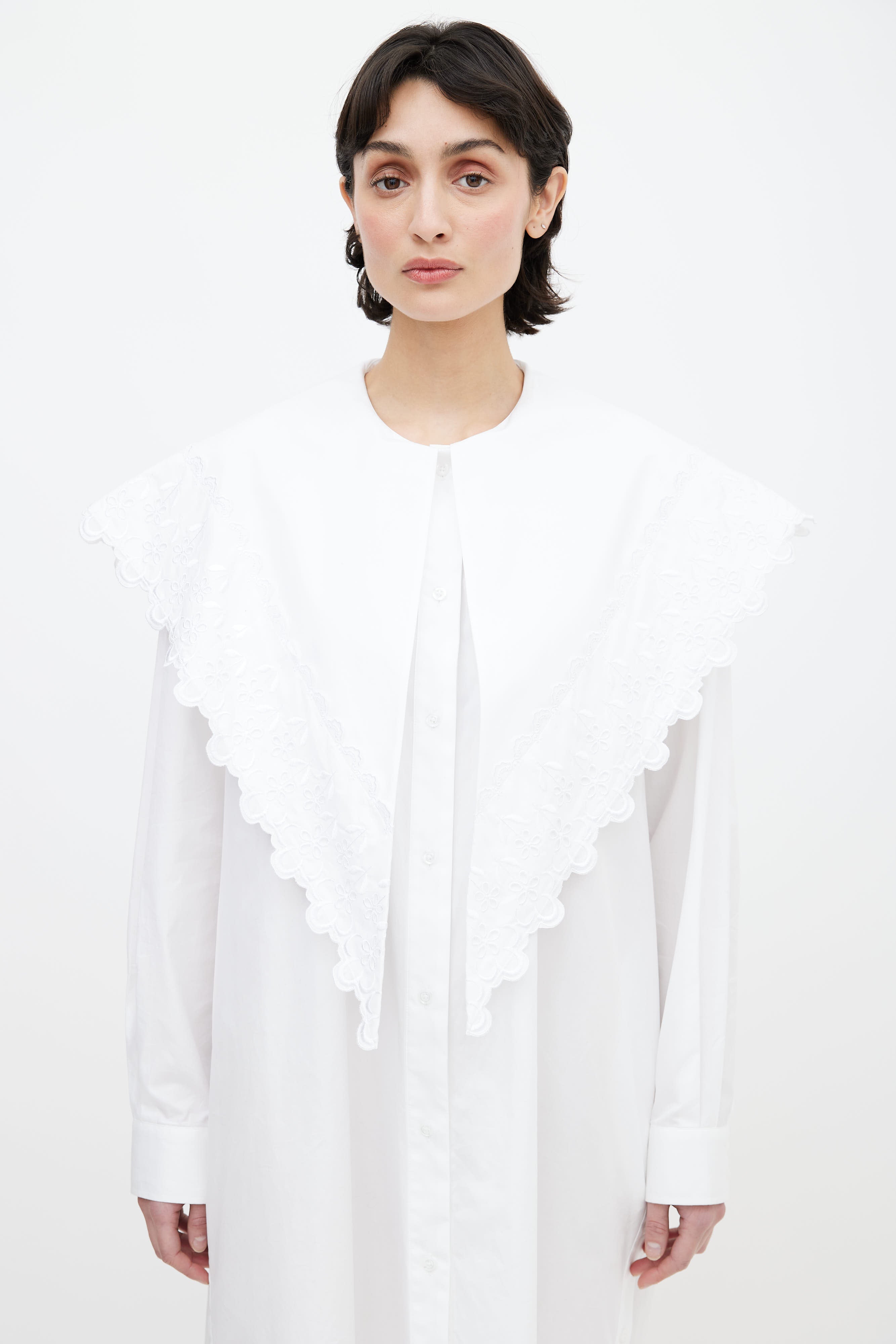 Pre-owned Simone Rocha white long sleeve dress featuring oversized point collar with embroidered eyelet trim, button up front, button placket at left side seam, buttoned cuffs and two side seam pockets.
