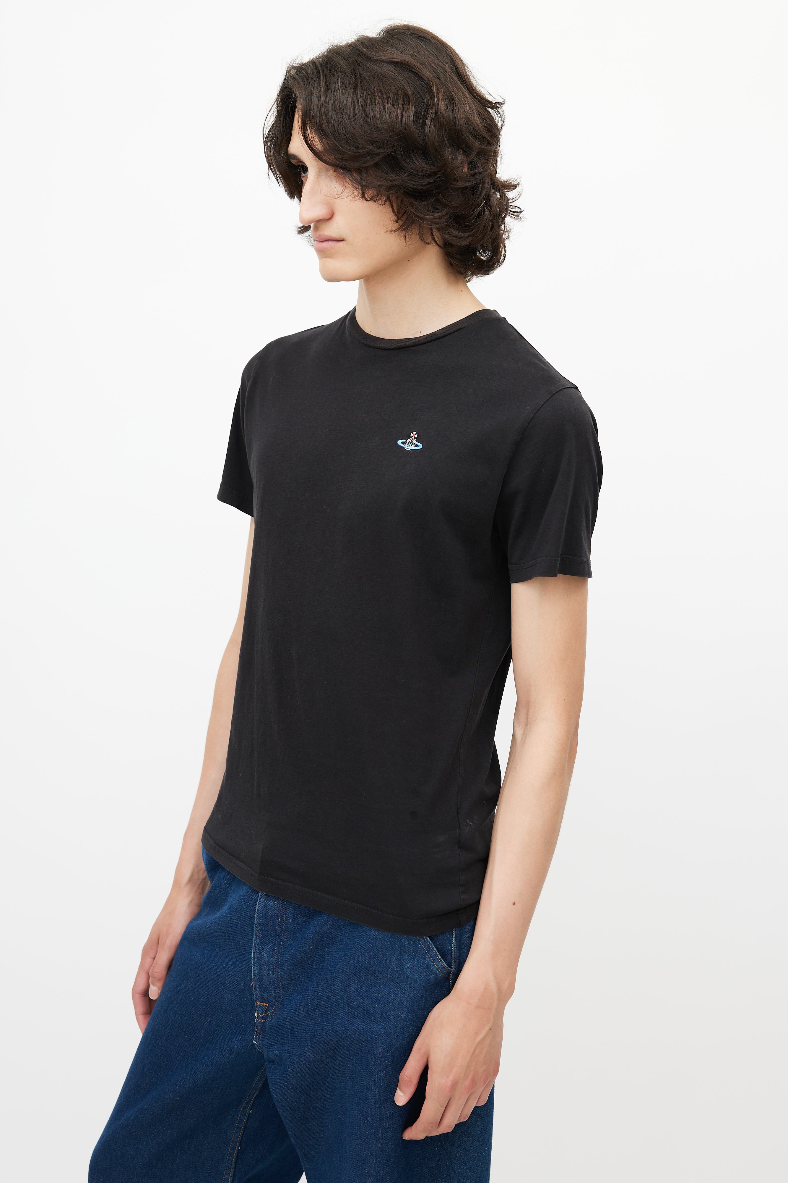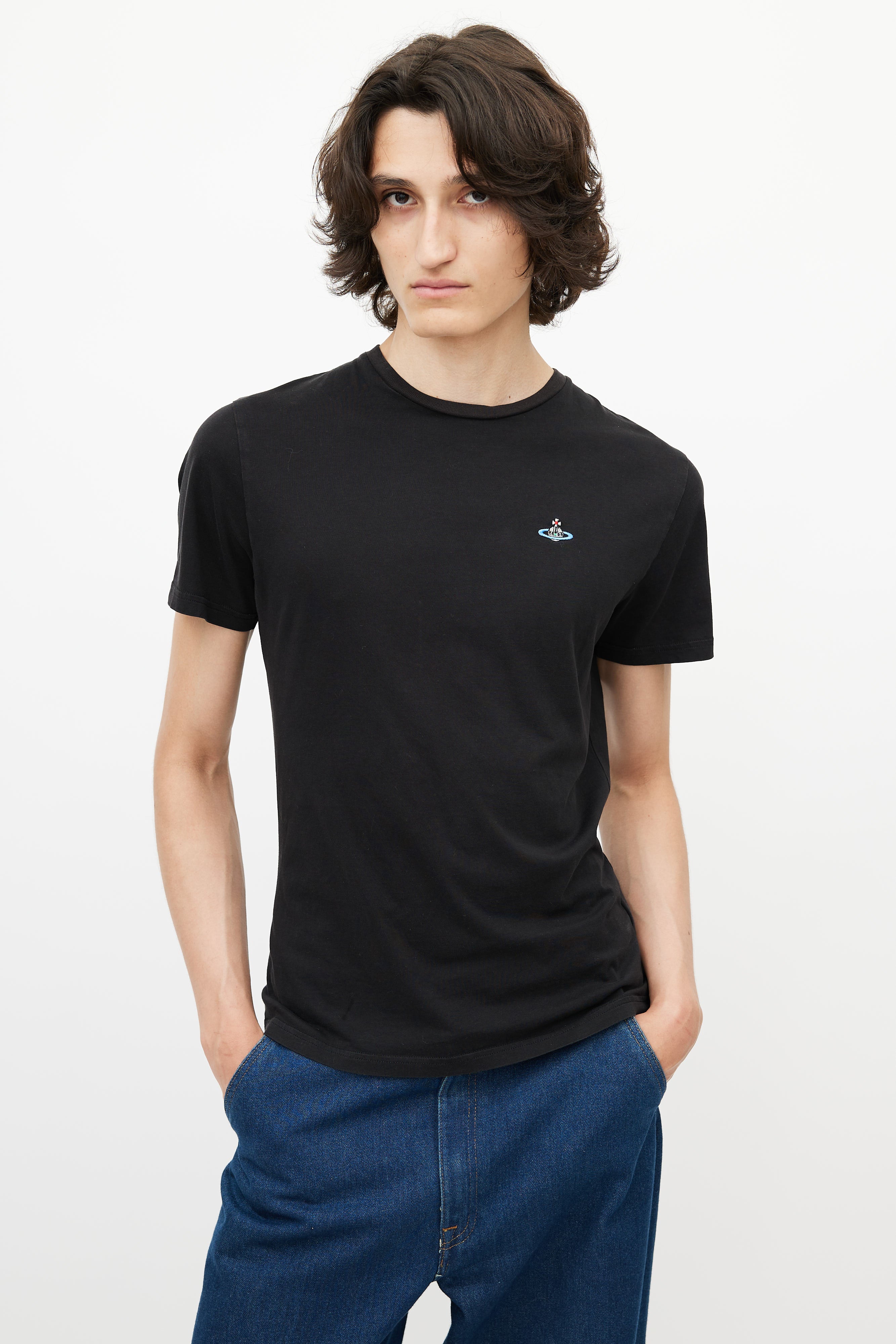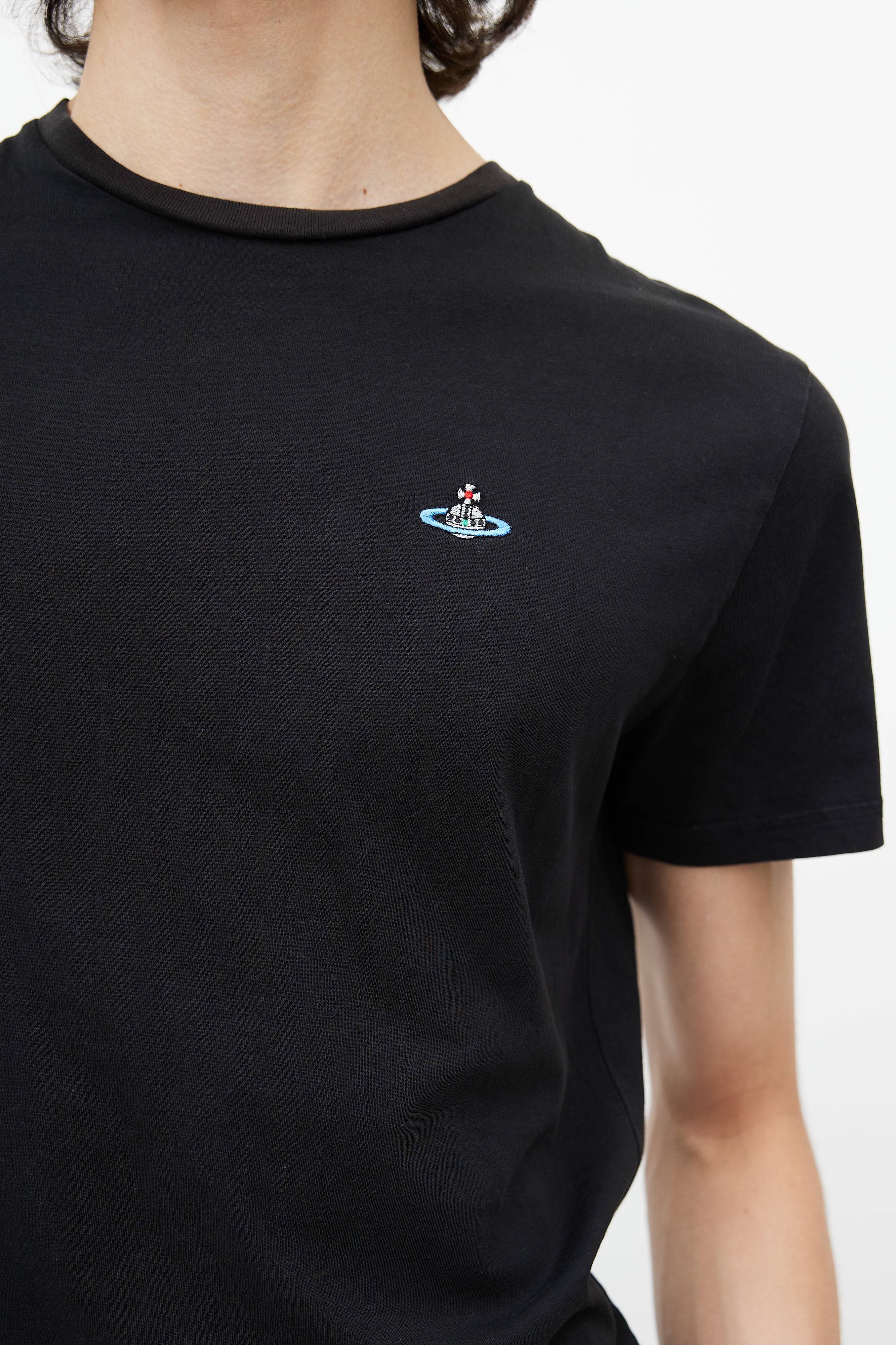 Pre-owned Vivienne Westwood Man black T-shirt featuring multicolour embroidered orb logo at chest, crew neckline, and short sleeves.
