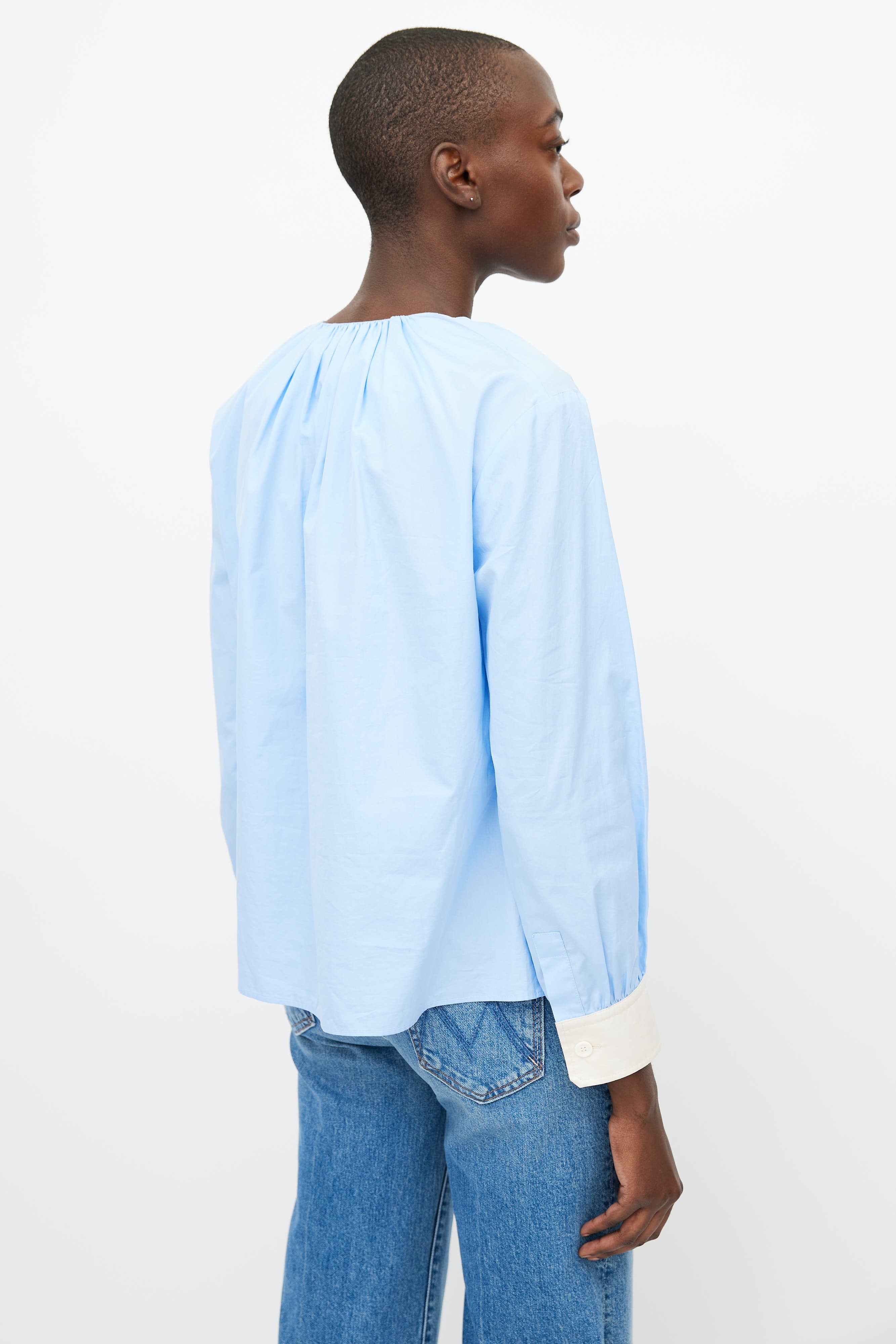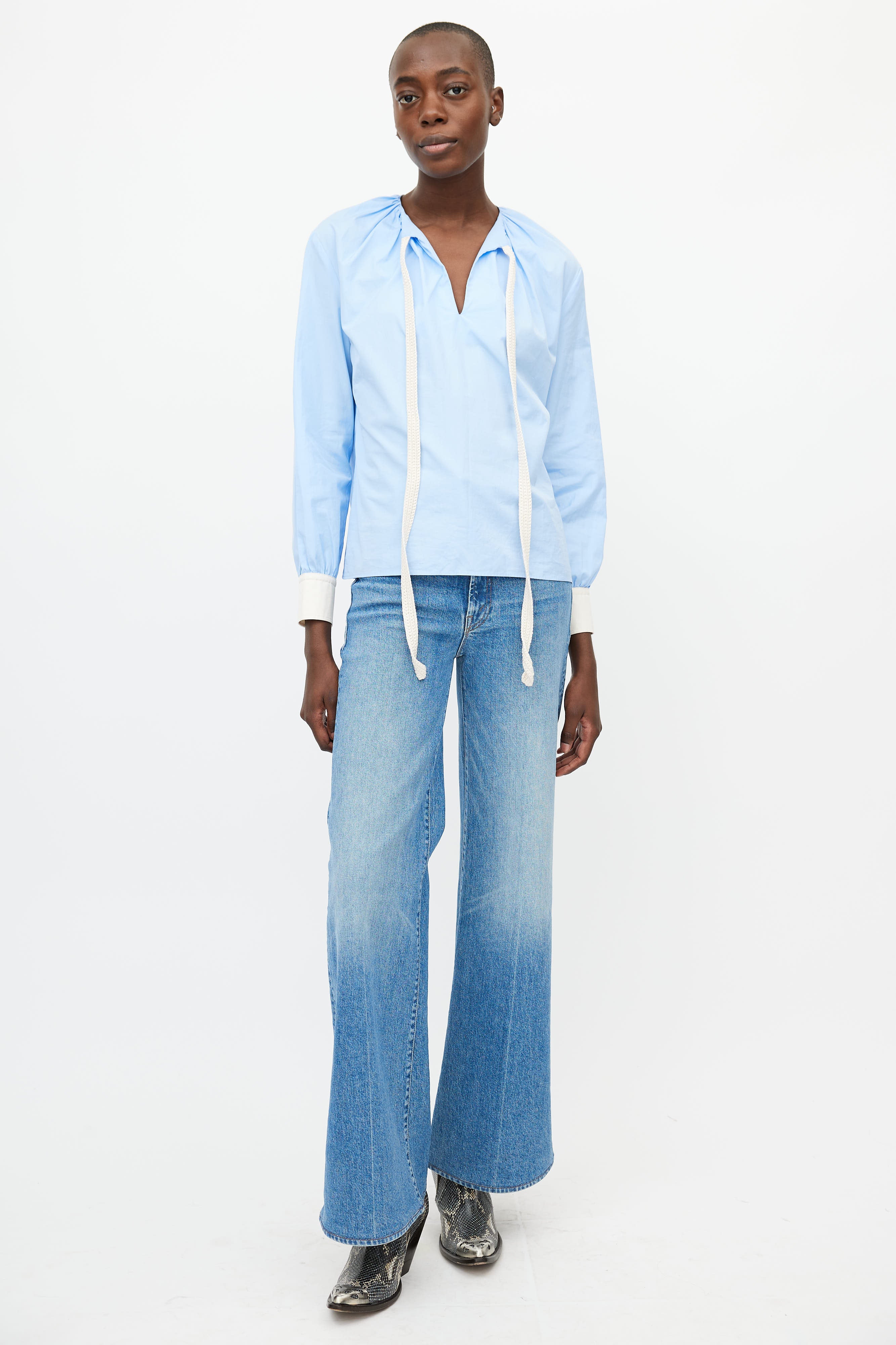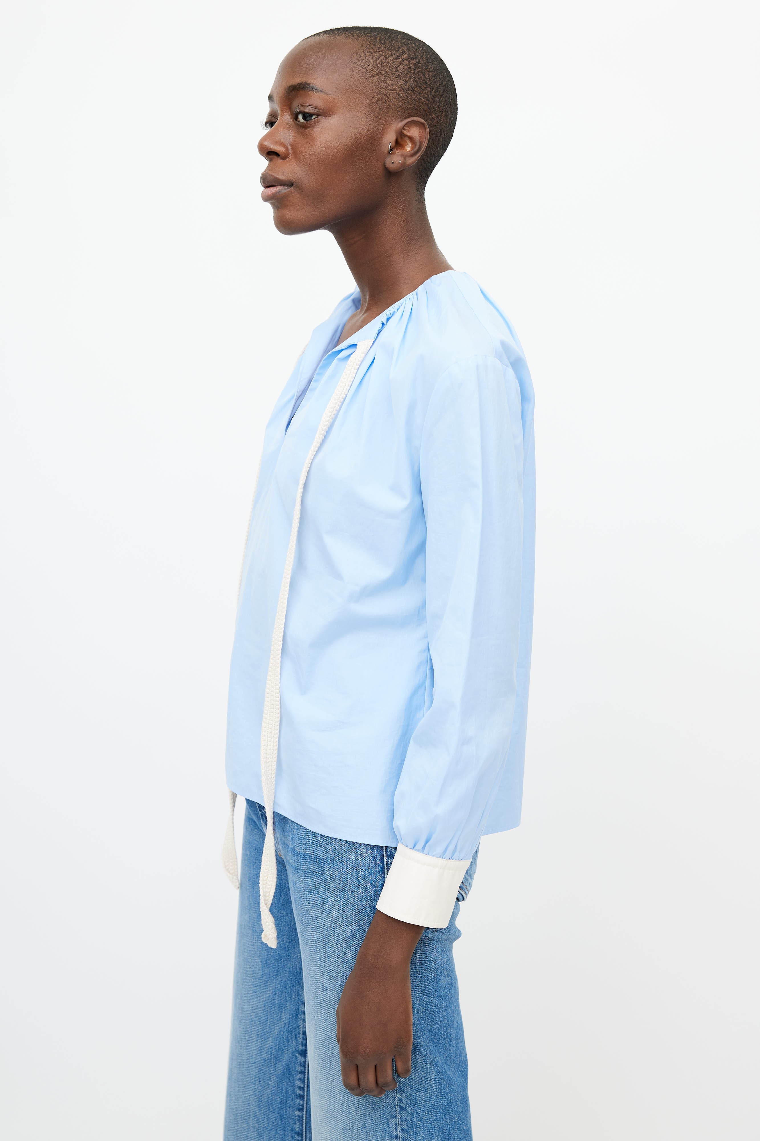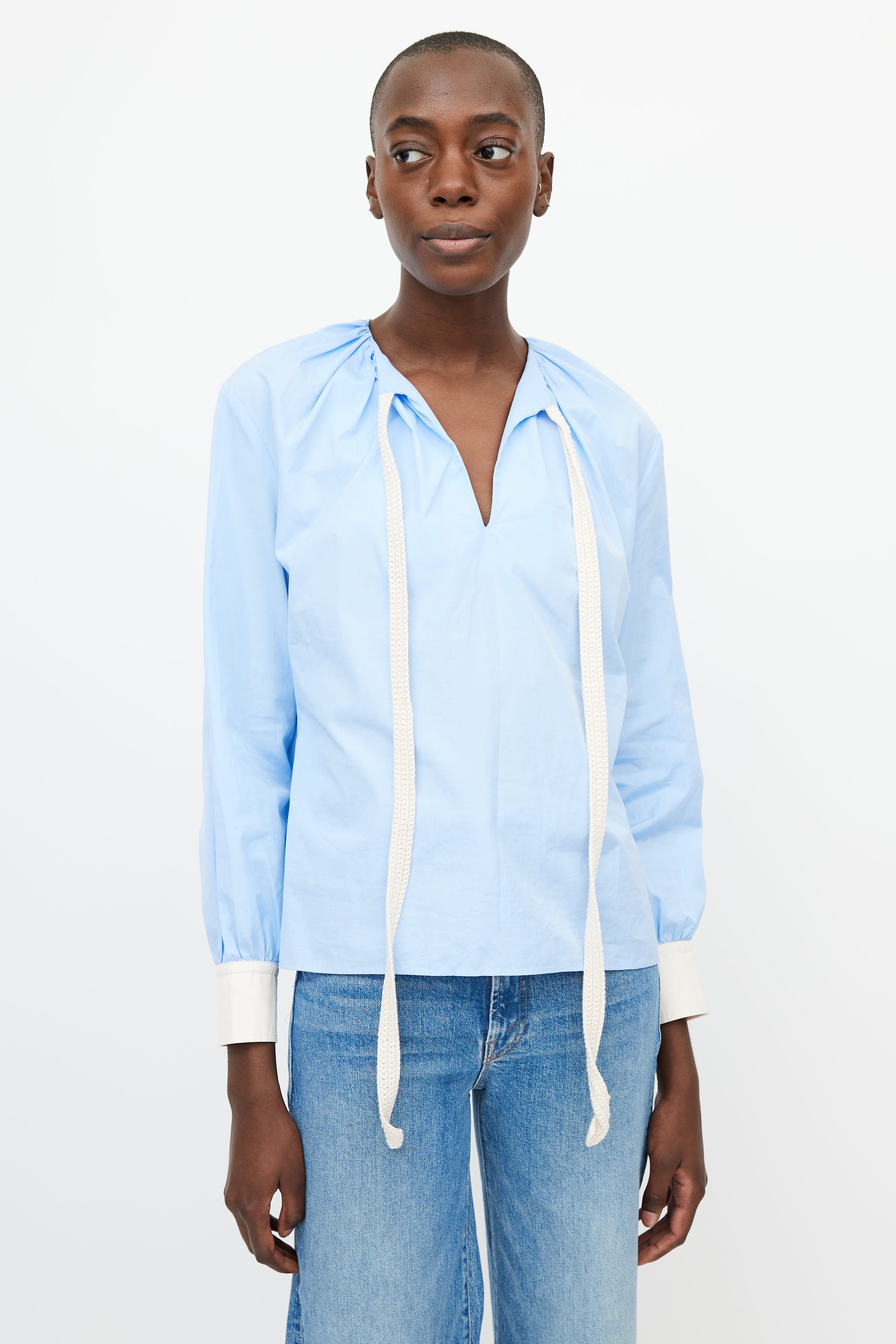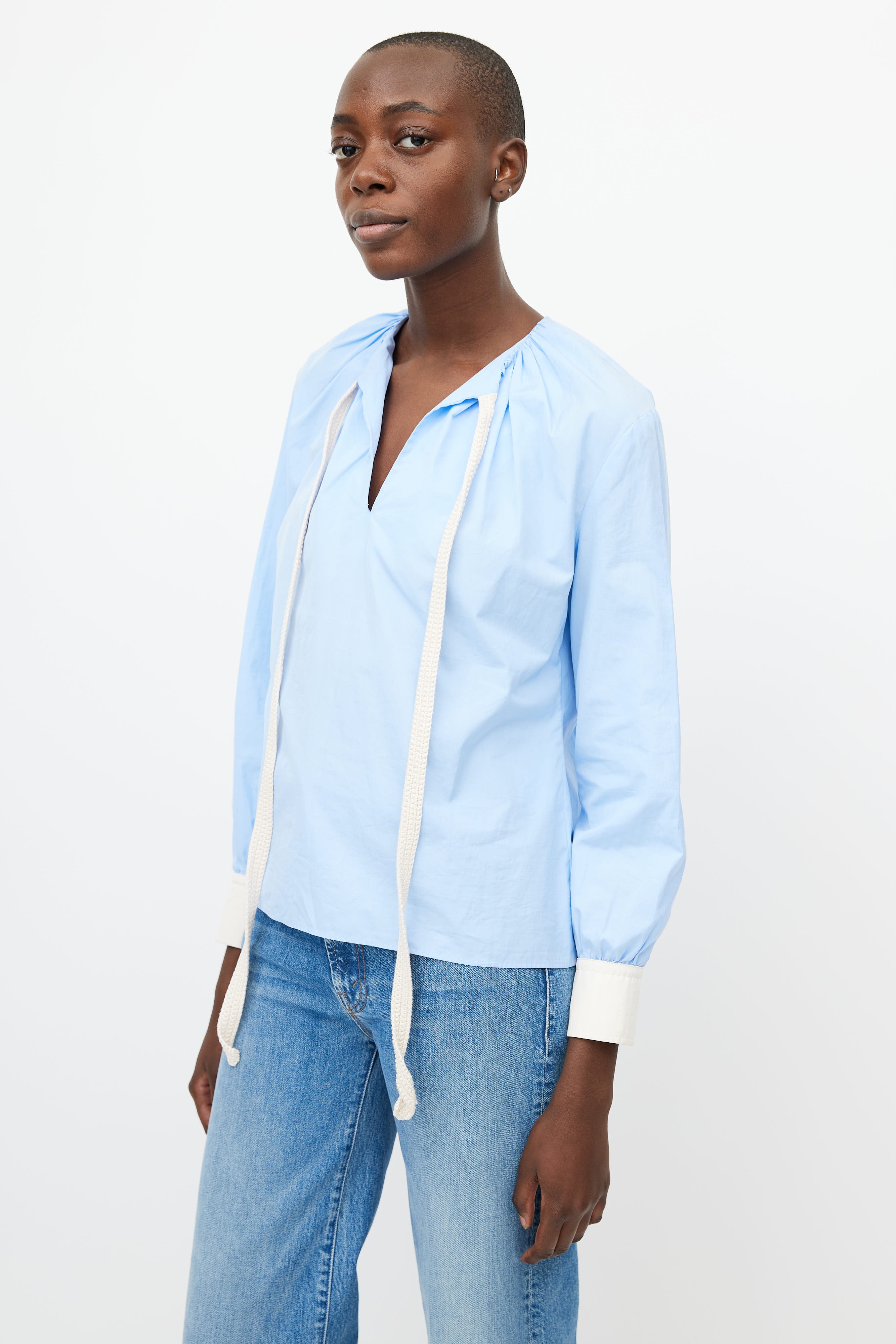 Wales Bonner blue Gabriel blouse featuring V-neckline, cream buttoned cuffs, and cream knit long straps at collar.