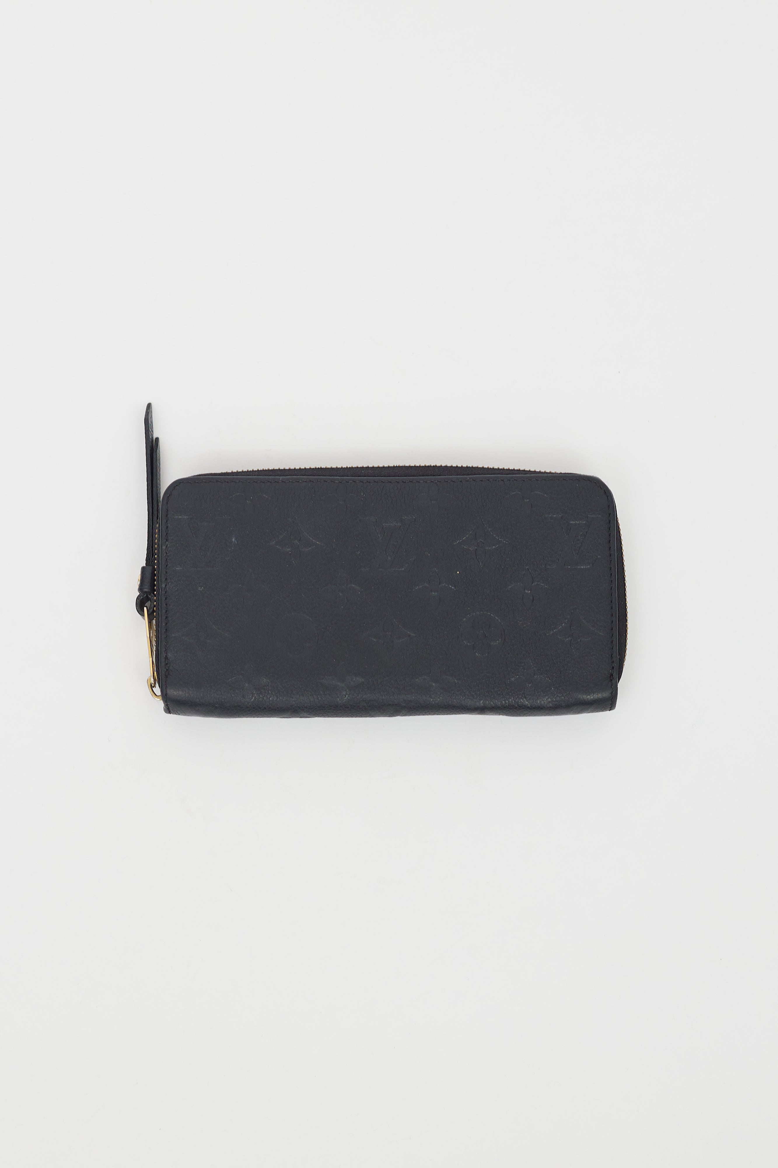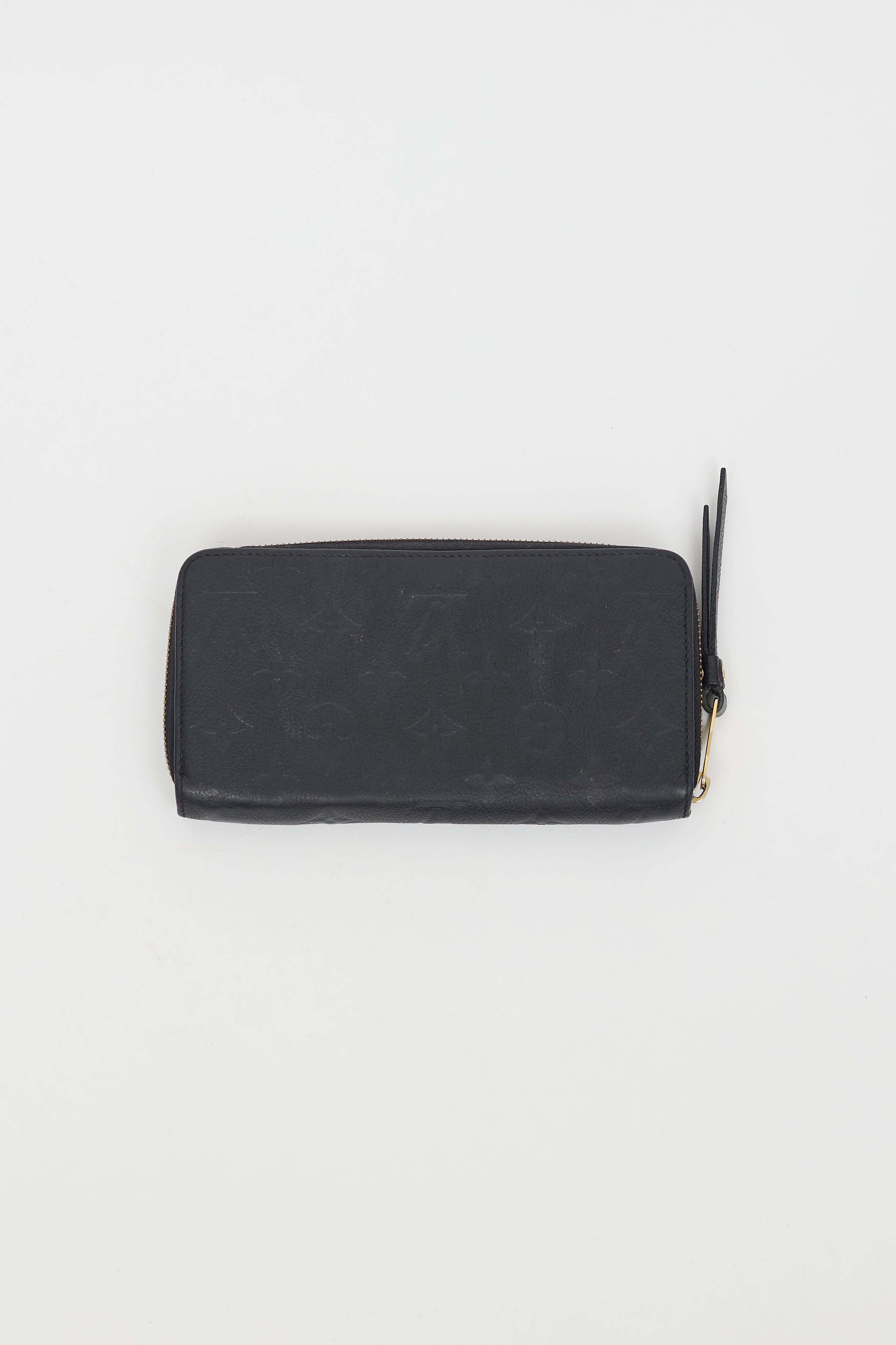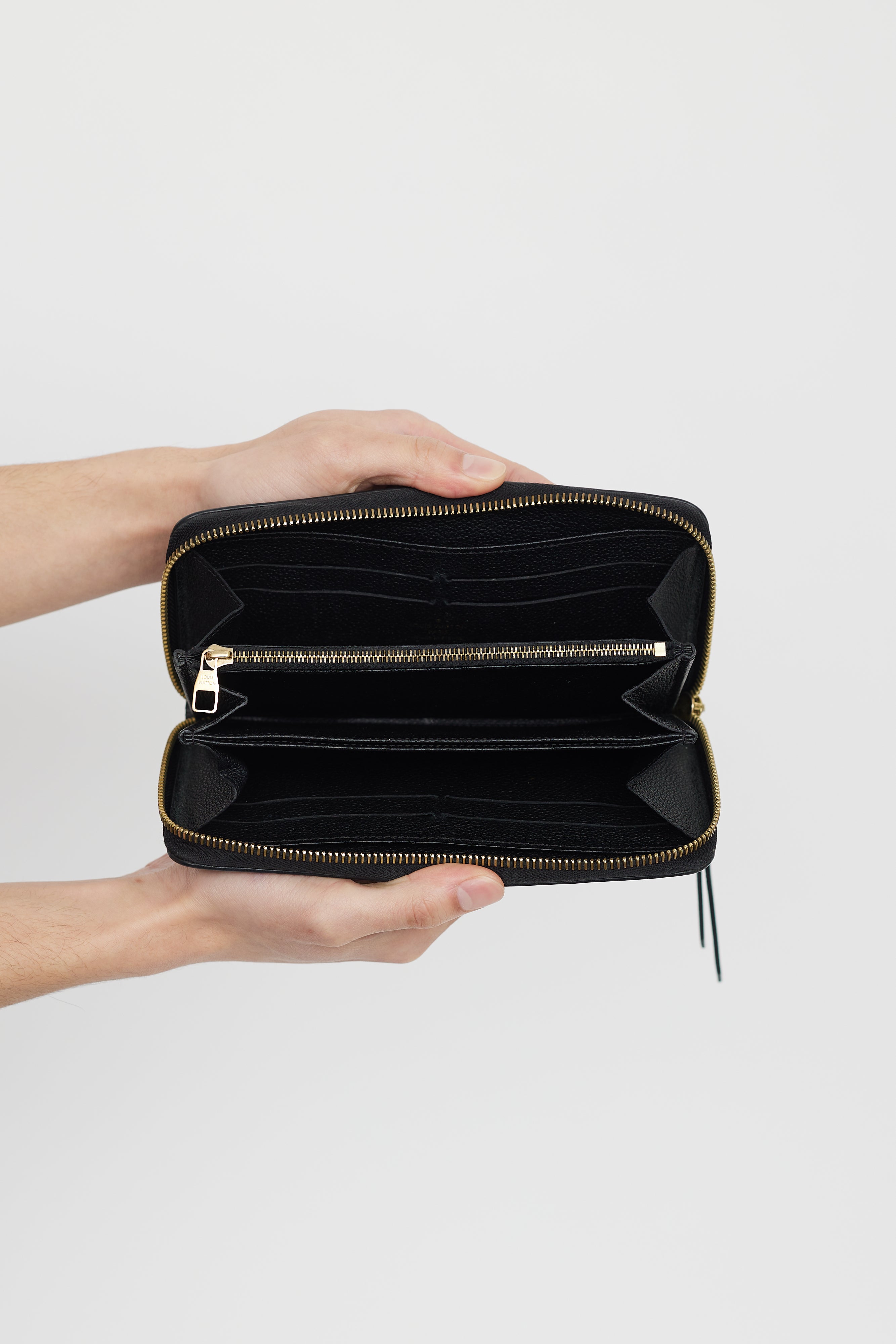 Pre-owned Louis Vuitton black Zippy wallet featuring Monogram Empreinte leather, gold tone hardware, all around zip closure, three main compartment, one middle zip pocket, three slip pockets, and eight card slots.