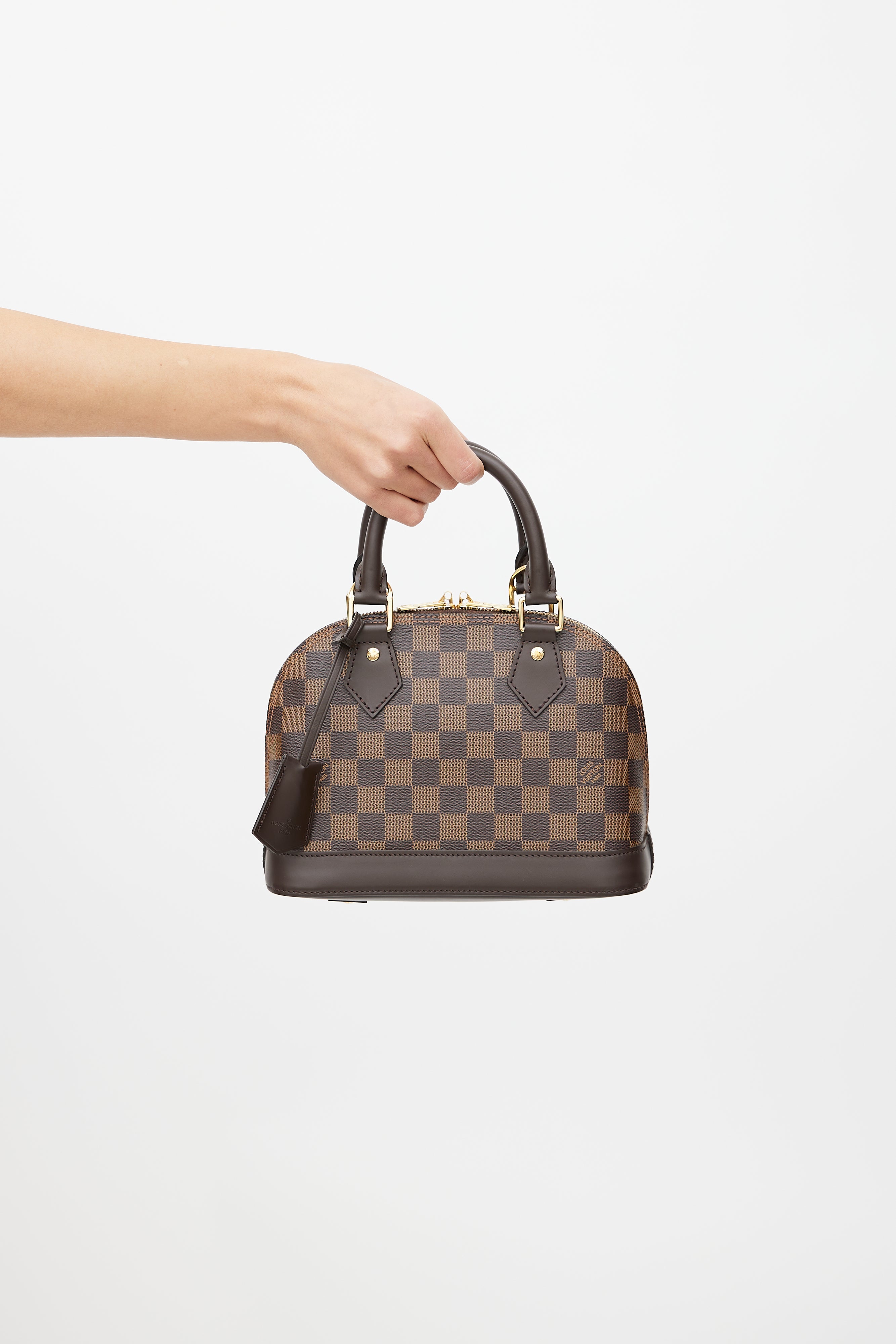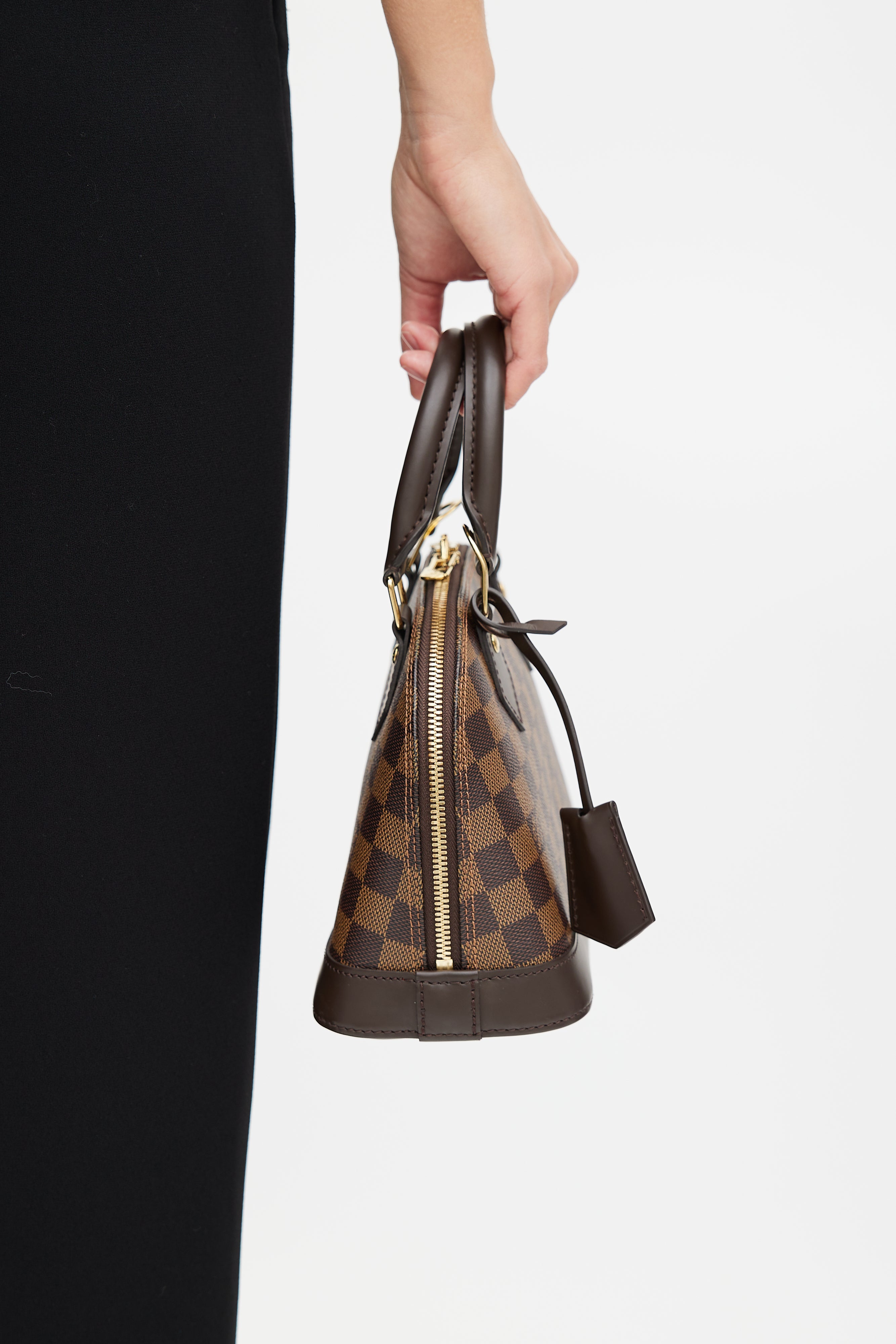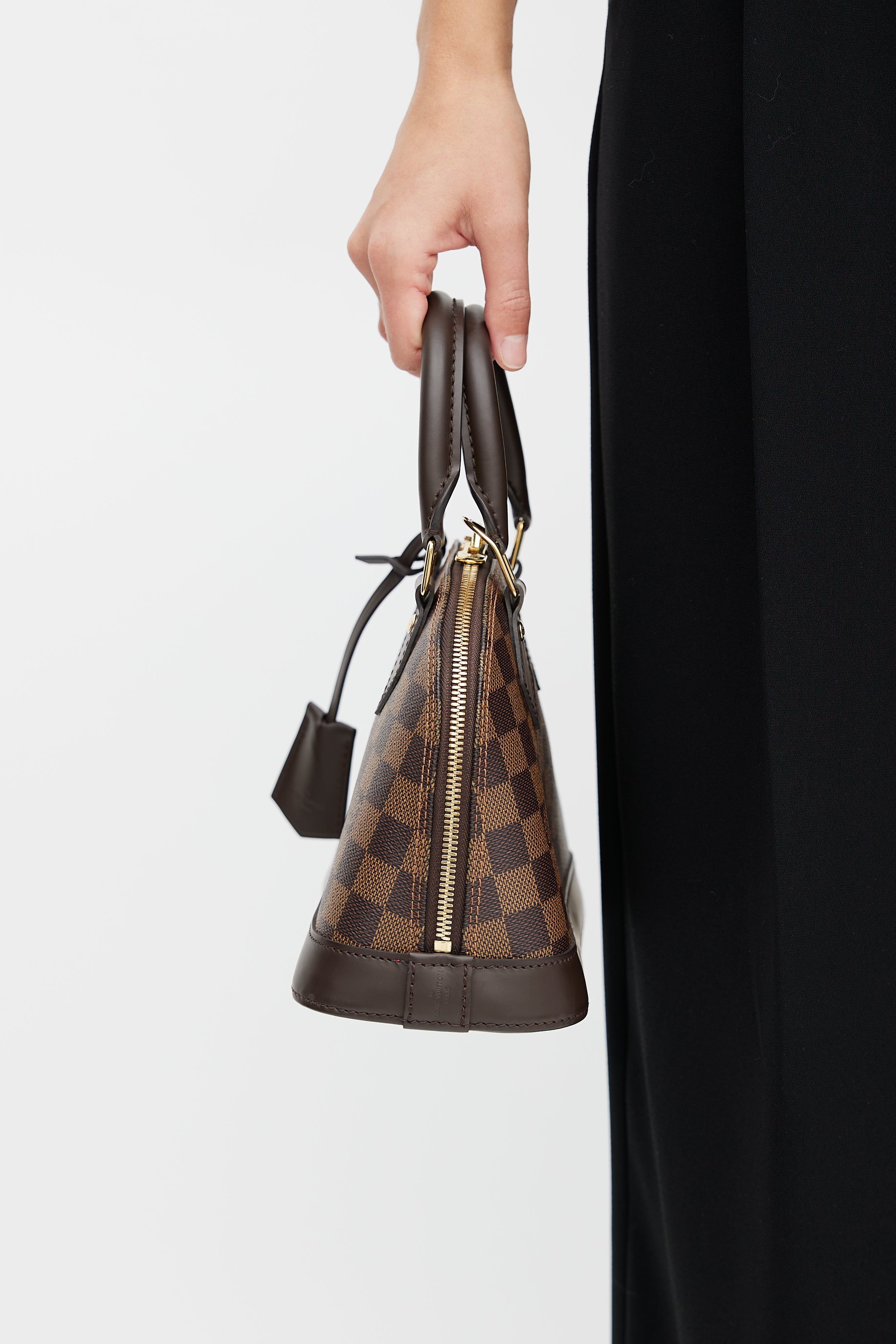 Pre-owned Louis Vuitton brown Alma BB crossbody bag featuring Damier Ebene coated canvas, brown smooth leather trim, two rolled top handles, detachable key and clochette, gold tone hardware, metal protective feet, zip closure at top, detachable fixed shoulder strap, red microfibre lining, and one slip pocket inside. Comes with original dust bag and box.